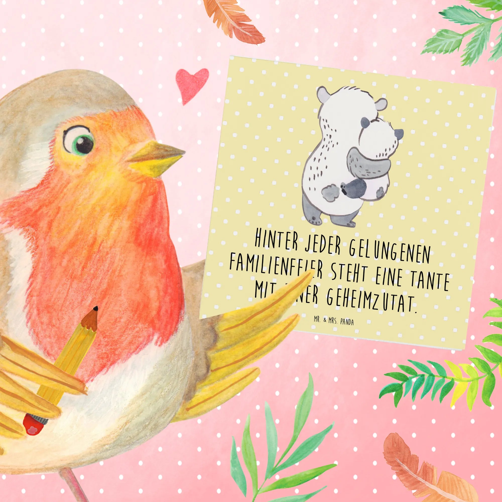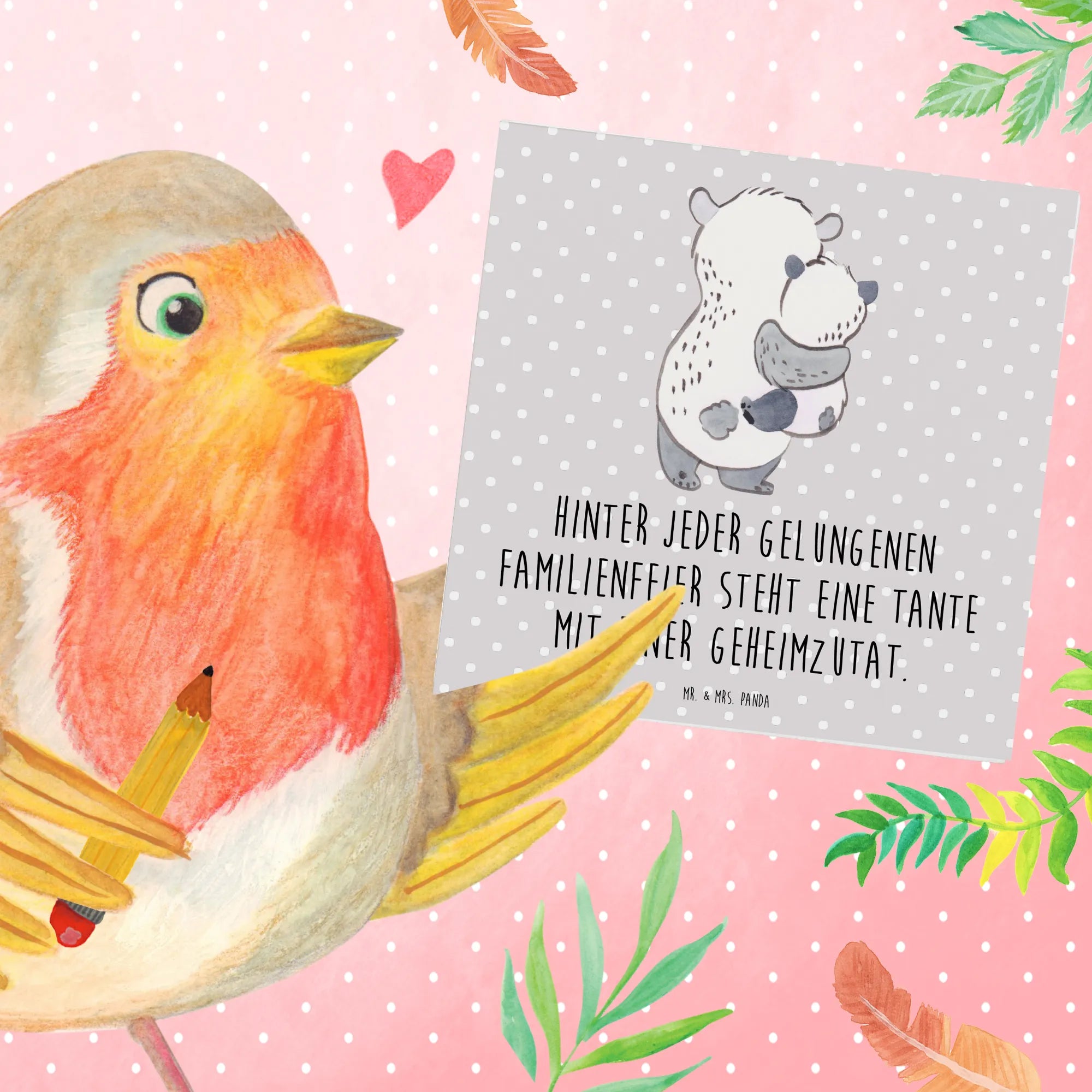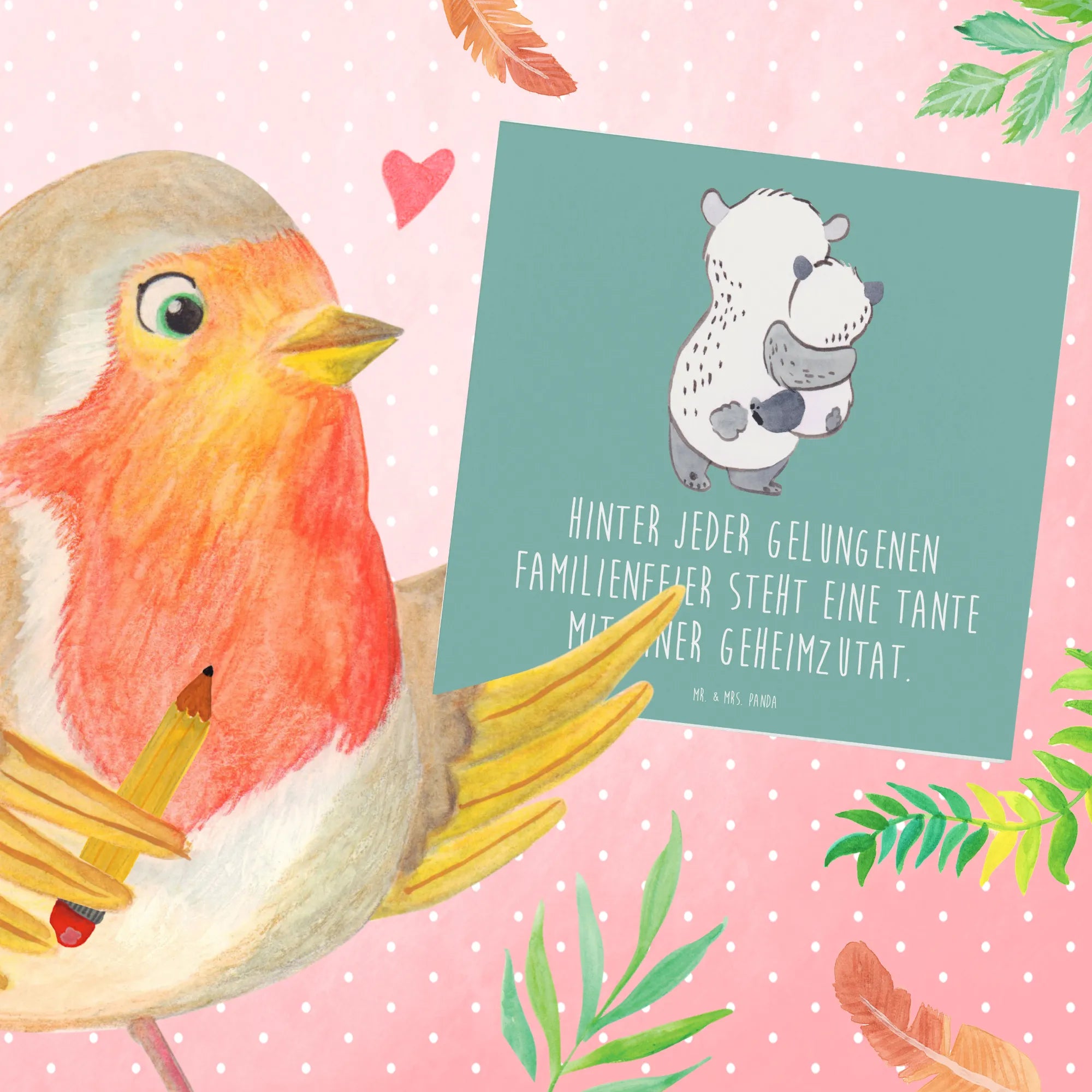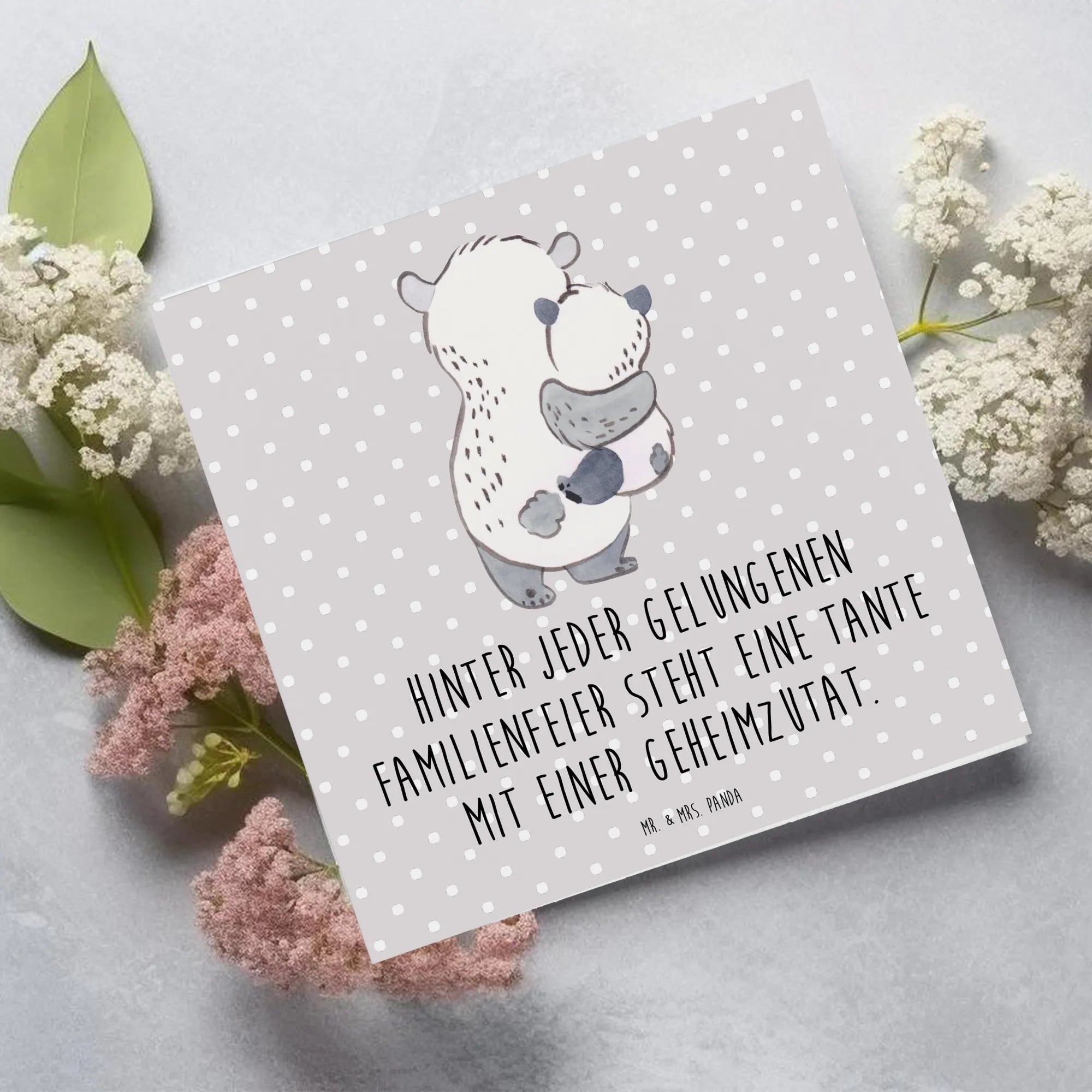 Die Deluxe Karte mit dem liebevollen Motiv "Tante" aus der Kollektion "Familie & Verwandte" von Mr. & Mrs. Panda ist das perfekte Geschenk für jeden Anlass. Ob Geburtstag, Hochzeit oder einfach so, diese wunderschöne und besonders hochwertige quadratische Karte ist ideal, um besondere Grüße oder Glückwünsche an deine Tante zu senden. Mit einem liebevoll gestalteten Spruch auf der Vorderseite, der lauten soll: 'Hinter jeder gelungenen Familienfeier steht eine Tante mit einer Geheimzutat.' wird jeder Anlass zu etwas Besonderem.