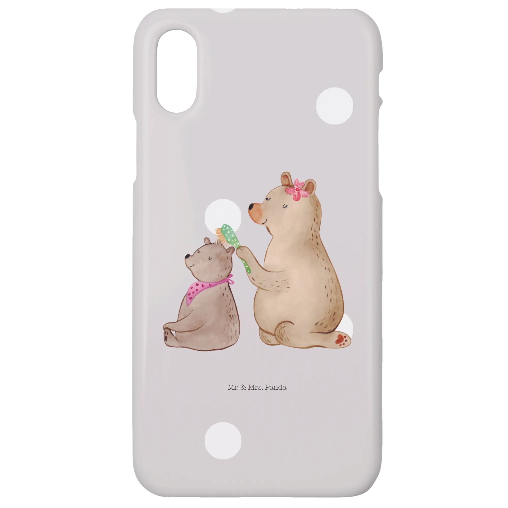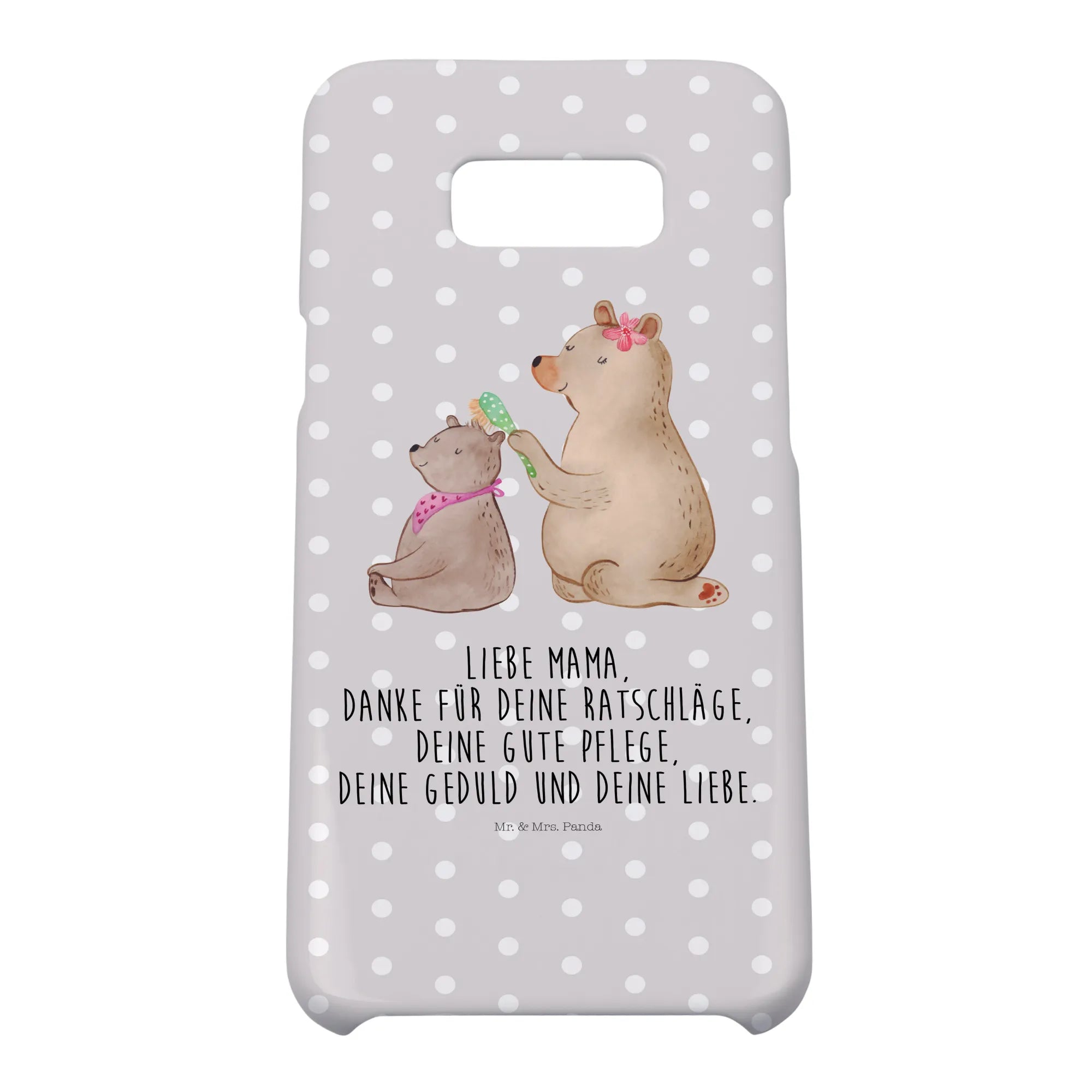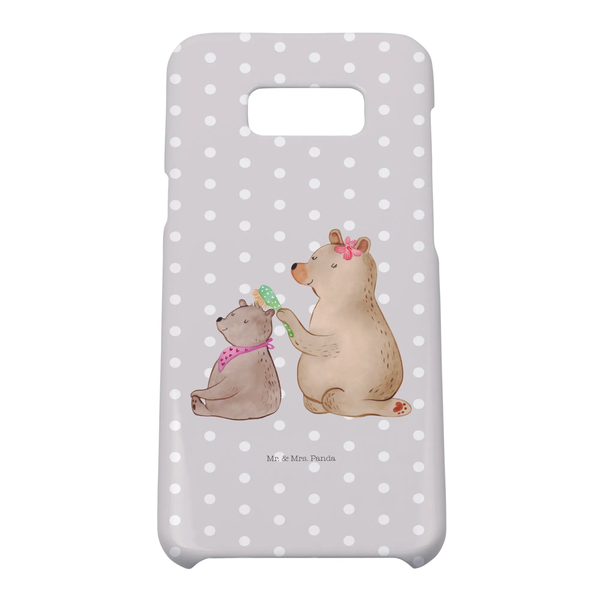 Ein Motiv voller Wärme: Das Motiv „Bär mit Kind“ zeigt einen großen, fürsorglichen Bären mit einer blumengeschmückten Haarspange, der liebevoll das Fell eines kleineren Bären bürstet. Der kleine Bär schließt zufrieden die Augen; beide verströmen Geborgenheit und familiäre Nähe. Die Aquarell-Illustration von Mrs. Panda wirkt wie eine kleine Umarmung für unterwegs. Der sanfte Grau-Pastell-Hintergrund lässt das Motiv besonders zart und edel erscheinen – ideal für Mamas, die es liebevoll und dezent mögen.