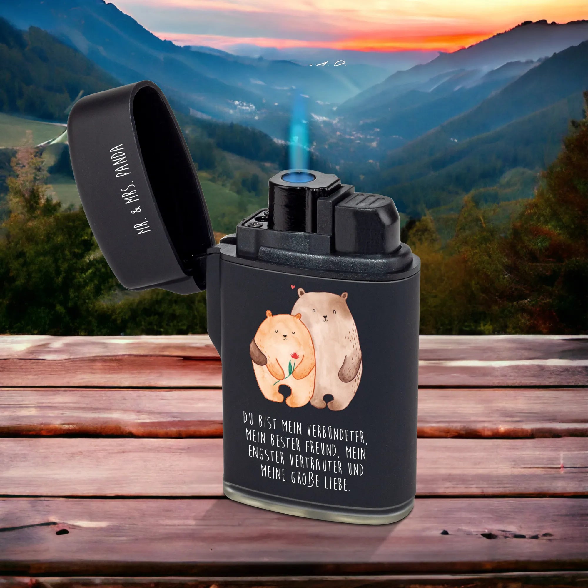 Dieses süße Feuerzeug mit dem Motiv Bären Liebe bringt Wärme in den Alltag. Zwei verliebte Bären formen gemeinsam ein Herz, eine zärtliche Blume und ein kleines schwebendes Herz erzählen von Verbundenheit und Nähe. Der gedruckte Spruch „Du bist mein Verbündeter, Mein bester Freund, mein engster Vertrauter und meine große Liebe.“ macht das Feuerzeug zum perfekten Liebesgeschenk.