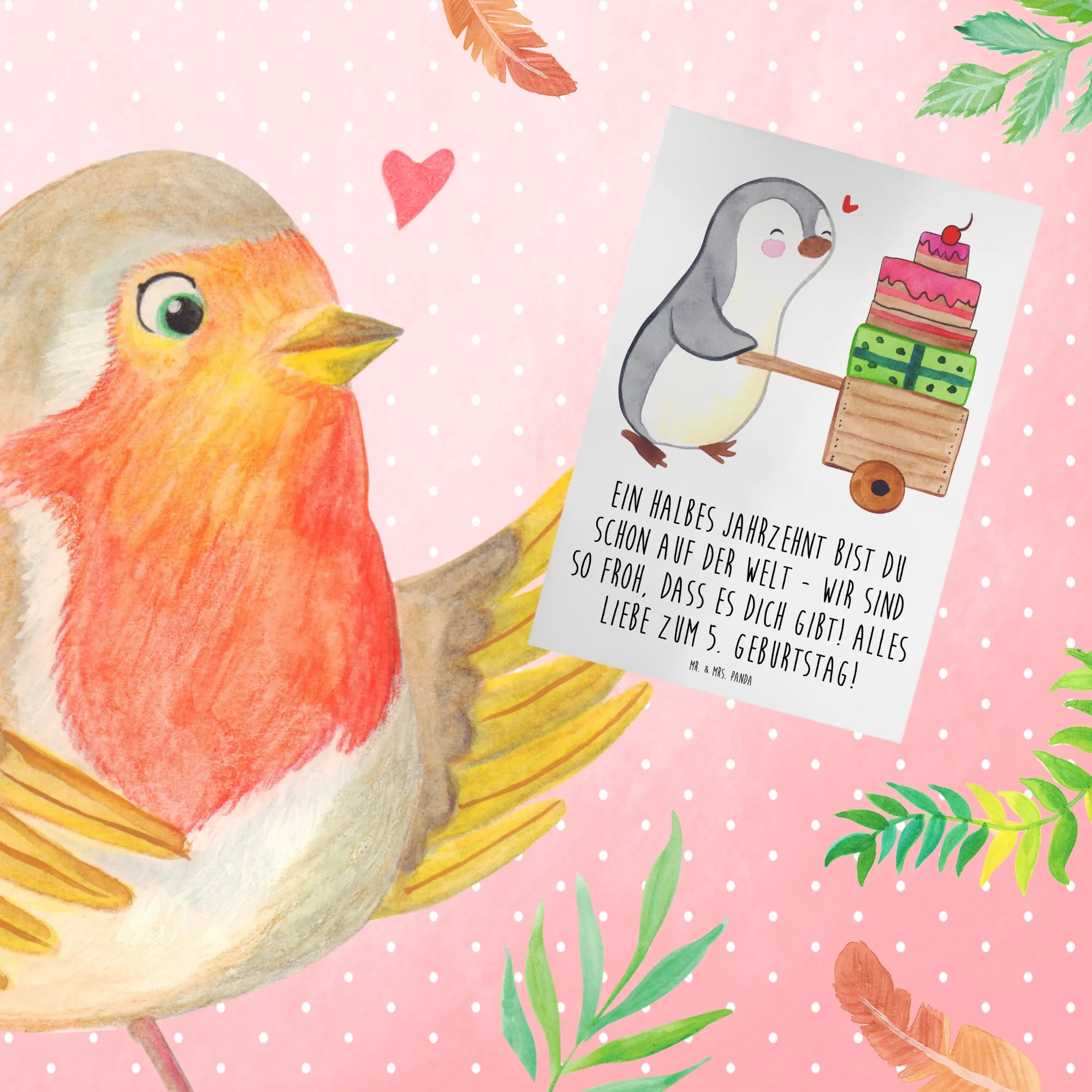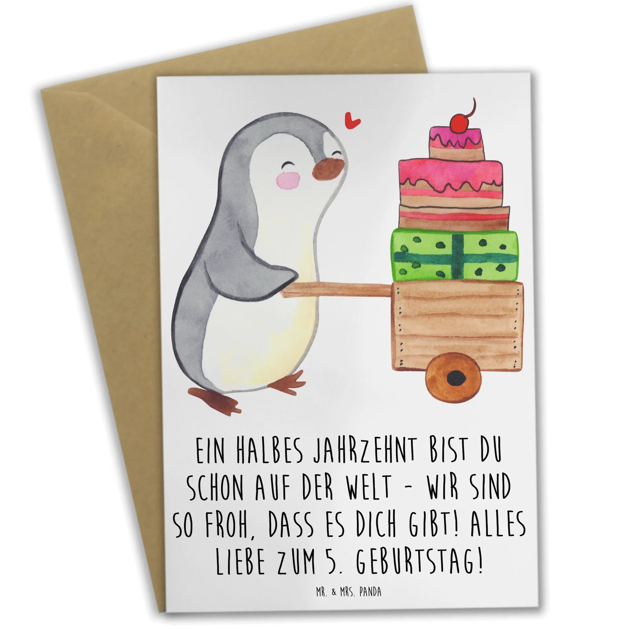 Die Grußkarte zum 5. Geburtstag von Mr. & Mrs. Panda ist das perfekte Geschenk, um diesen besonderen Tag gebührend zu feiern. Mit liebevollen und fröhlichen Motiven begeistert sie Kinder und Erwachsene gleichermaßen. Der Spruch "Ein halbes Jahrzehnt bist du schon auf der Welt - wir sind so froh, dass es dich gibt! Alles Liebe zum 5. Geburtstag!" bringt jedem Geburtstagskind ein Lächeln ins Gesicht.