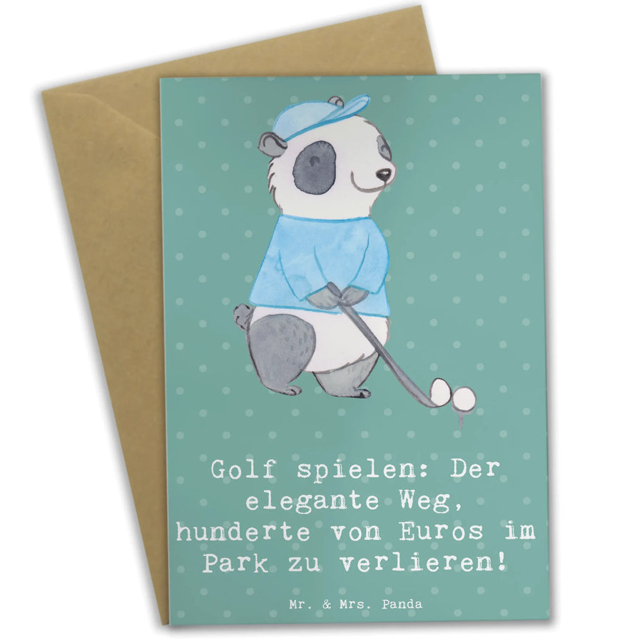 Die wunderschöne Grußkarte zum Thema Golf von Mr. & Mrs. Panda ist das ideale Geschenk für jeden Sportfan und Golfliebhaber. Du bist auf der Suche nach einem lieben Gruß, einem besonderen Glückwunsch oder einer witzigen Einladung zu einem Golf-Turnier? Dann ist diese Karte genau das Richtige für dich!