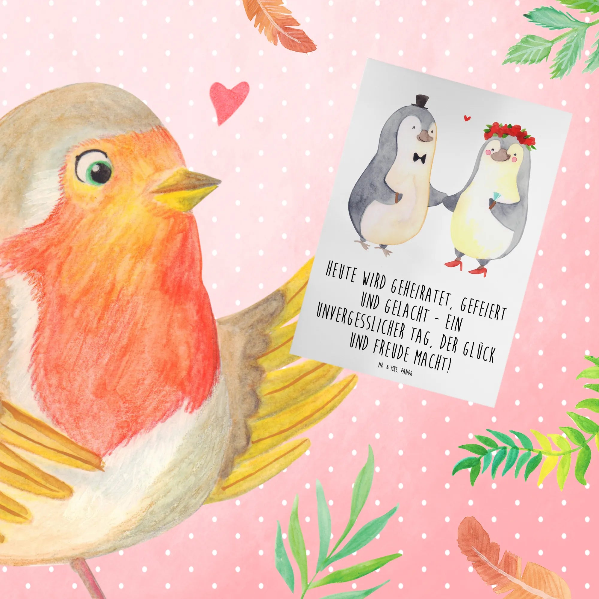 Die Grußkarte "Hochzeitsfeier" aus der zauberhaften Hochzeitskollektion von Mr. & Mrs. Panda ist das perfekte Geschenk für alle, die eine Hochzeit feiern oder die Liebenden beschenken möchten. Diese liebevoll gestaltete Karte ist eine wunderschöne Möglichkeit, um individuelle Grüße oder Glückwünsche zum schönsten Tag im Leben des Brautpaares zu übermitteln. Mit dem fröhlichen Spruch „Heute wird geheiratet, gefeiert und gelacht - ein unvergesslicher Tag, der Glück und Freude macht!“ zauberst Du sicher ein Lächeln auf die Gesichter des Paares und ihrer Gäste.
