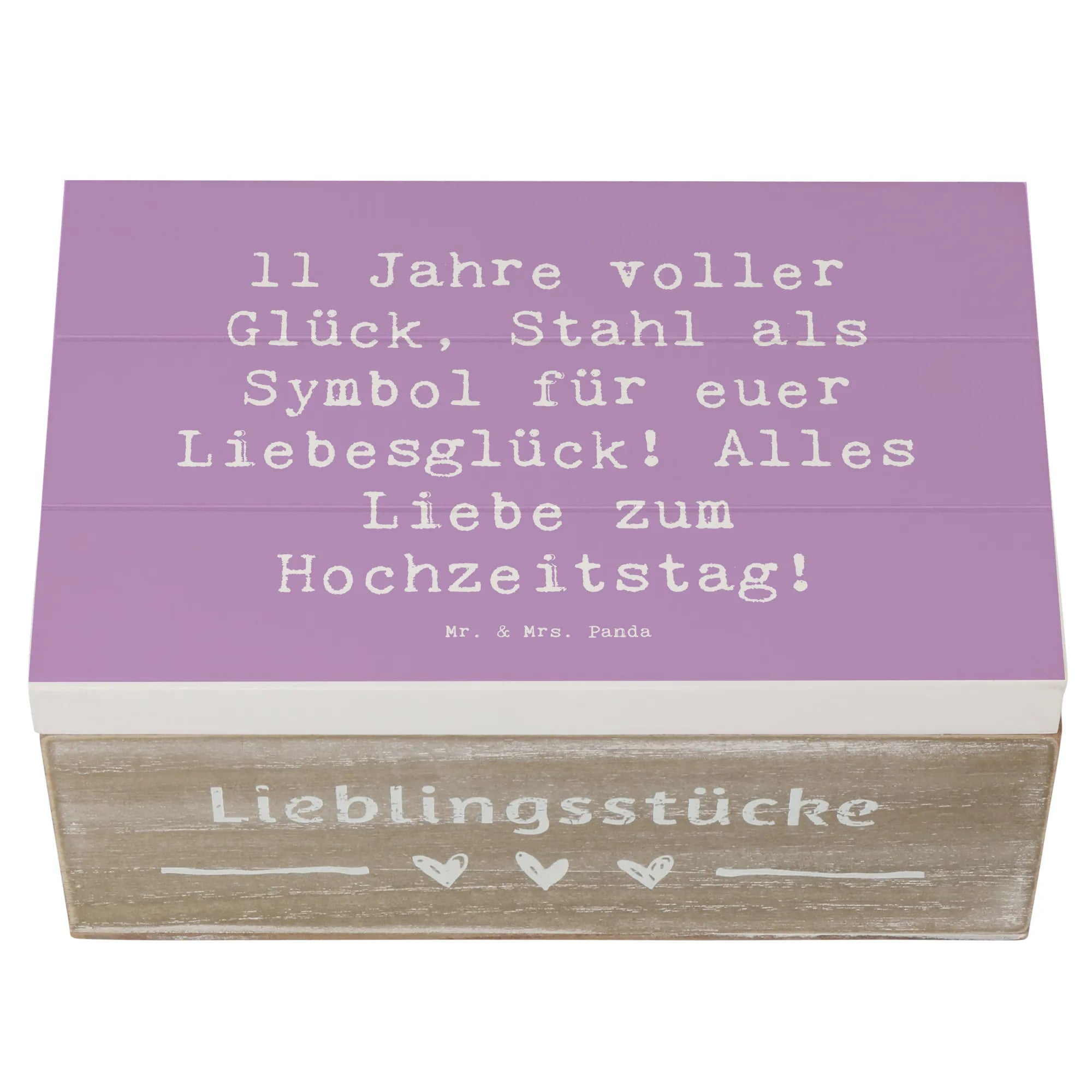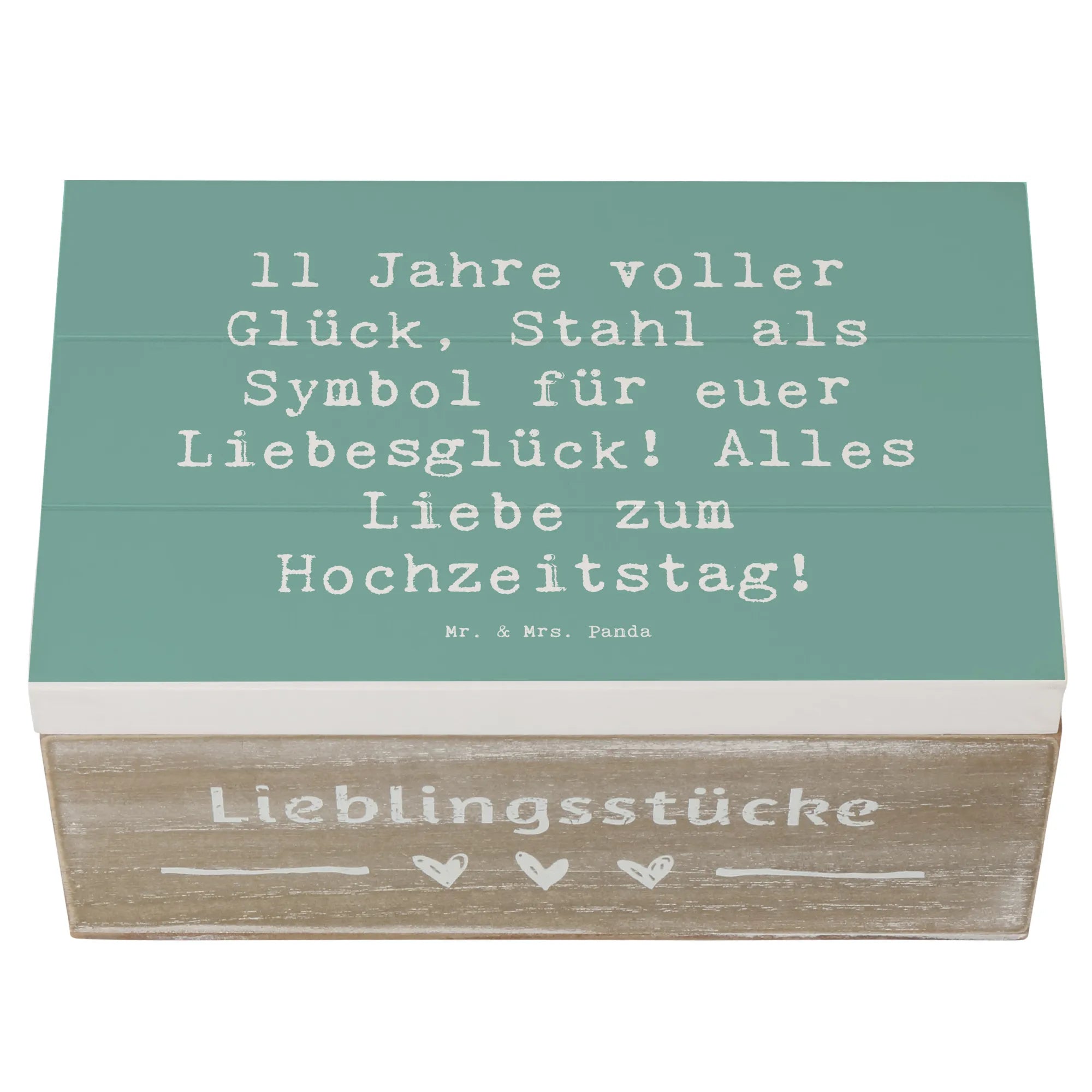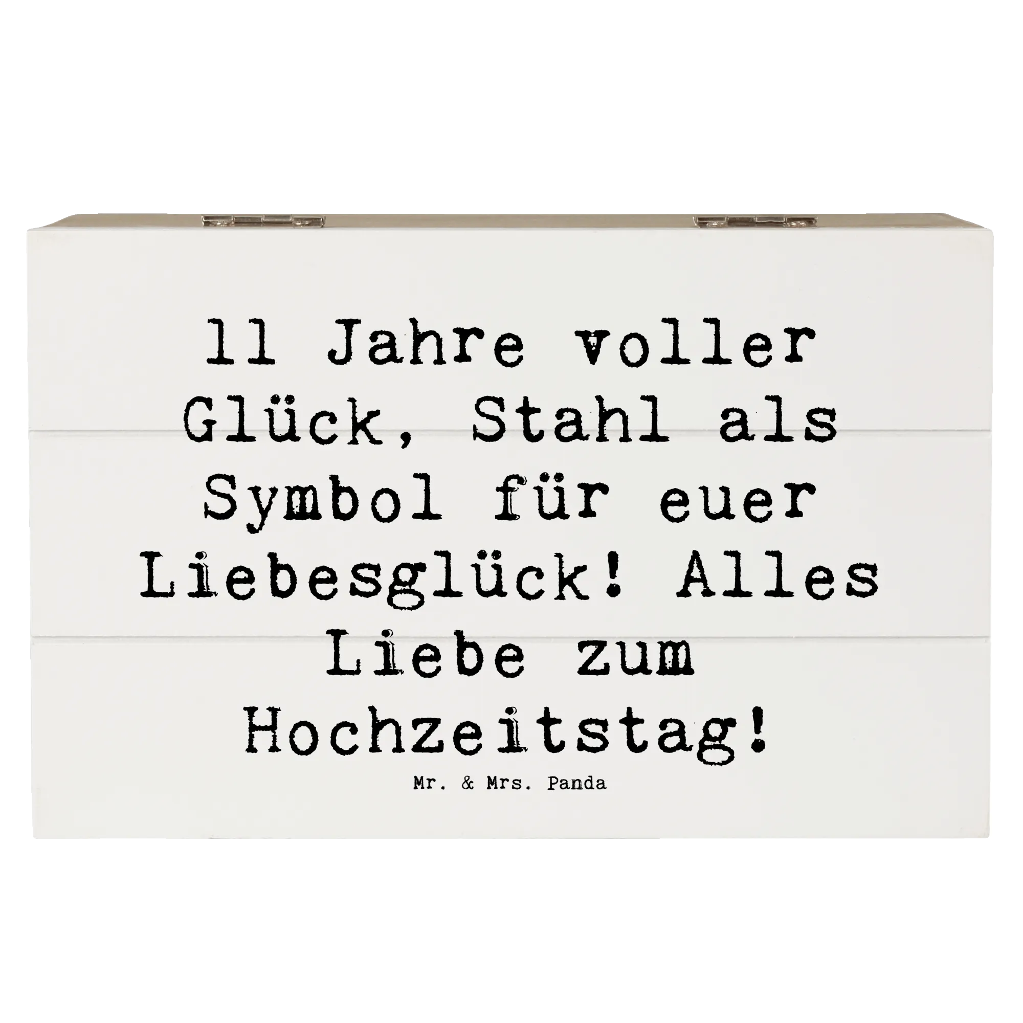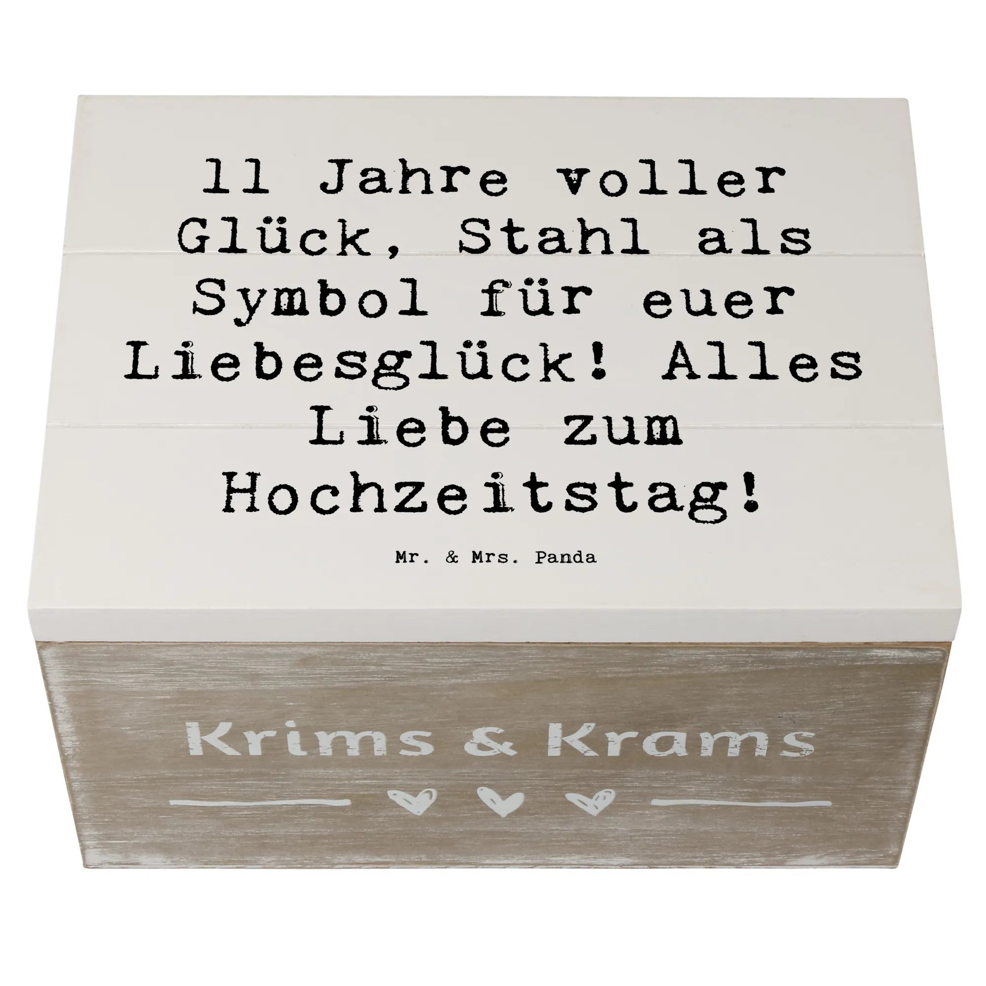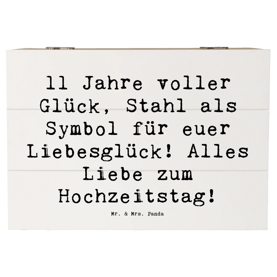 Entdecke die zauberhafte Holzkiste von Mr. & Mrs. Panda, die speziell für den 11. Hochzeitstag, auch bekannt als Stahlhochzeit, entworfen wurde. Dieses wunderschöne Stück ist nicht nur eine Erinnerungskiste, sondern auch ein echter Schatz für all eure besonderen Momente! Mit dem liebevollen Spruch "11 Jahre voller Glück, Stahl als Symbol für euer Liebesglück! Alles Liebe zum Hochzeitstag!" wird sie zum perfekten Hochzeitsgeschenk, das von Herzen kommt.