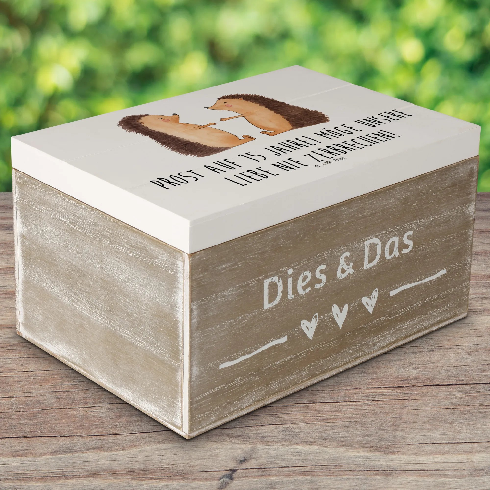 Entdecke die wunderschöne Holzkiste von Mr. & Mrs. Panda, die das perfekte Geschenk zum 15. Hochzeitstag oder zur gläsernen Hochzeit ist! Mit dem liebevollen Spruch 'Prost auf 15 Jahre! Möge unsere Liebe nie zerbrechen!' wird diese Erinnerungskiste zum ganz besonderen Aufbewahrungsort für eure wertvollsten Schätze.
