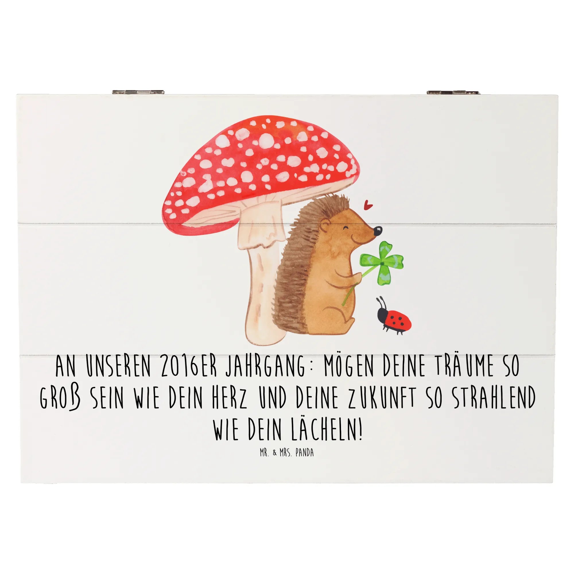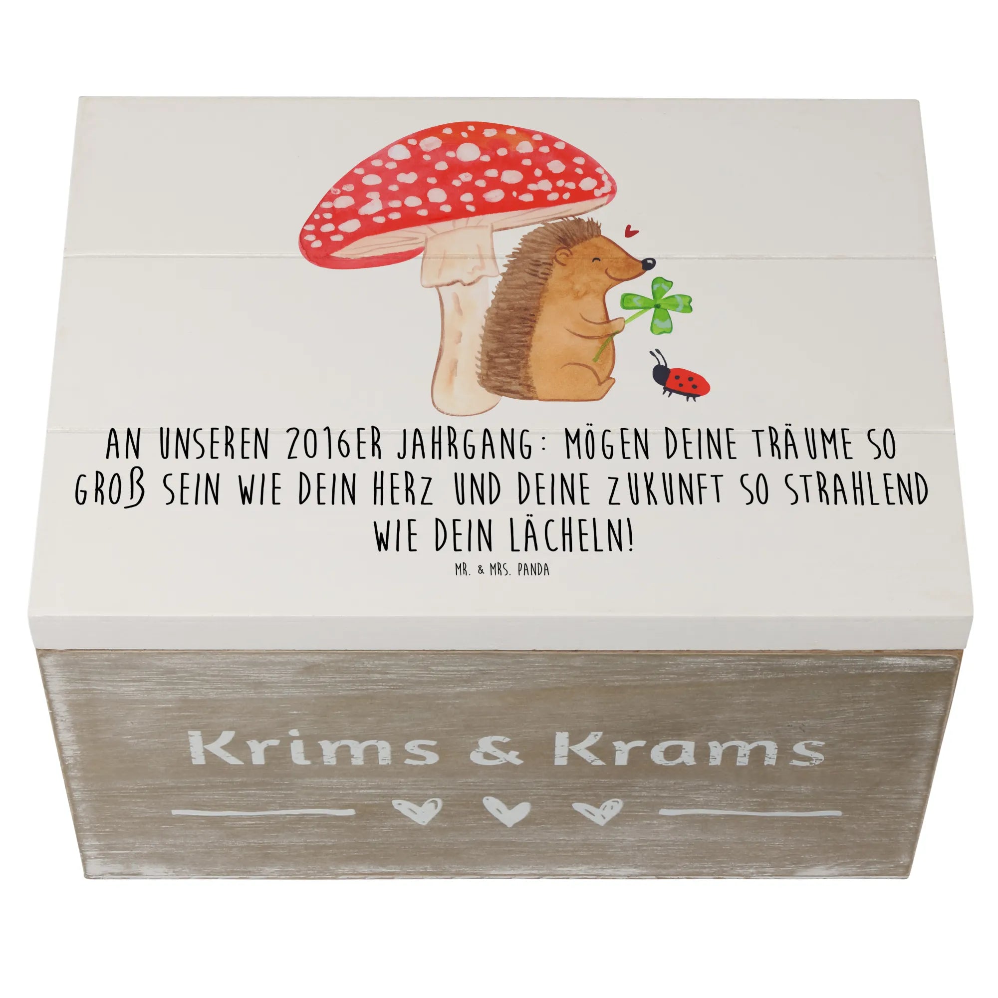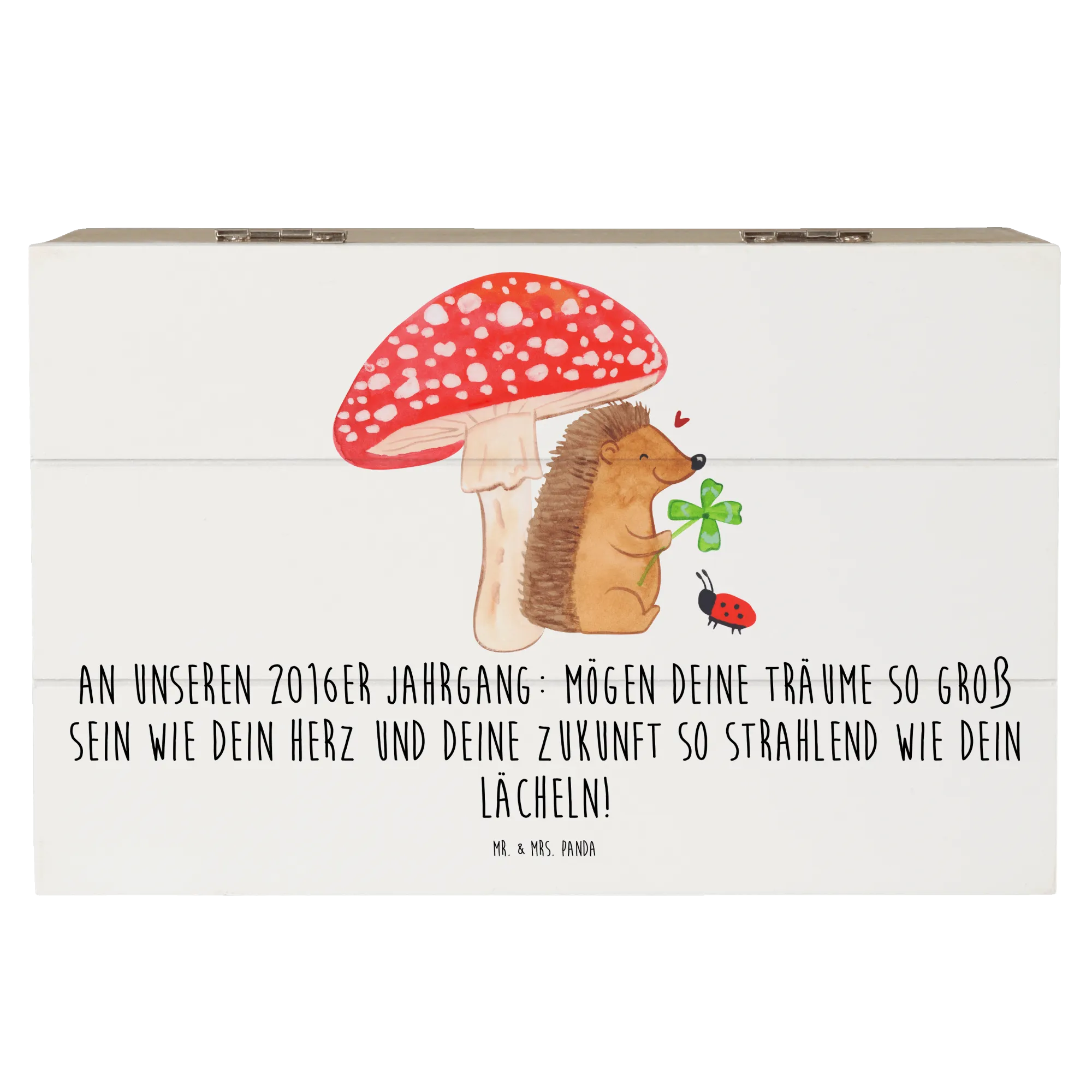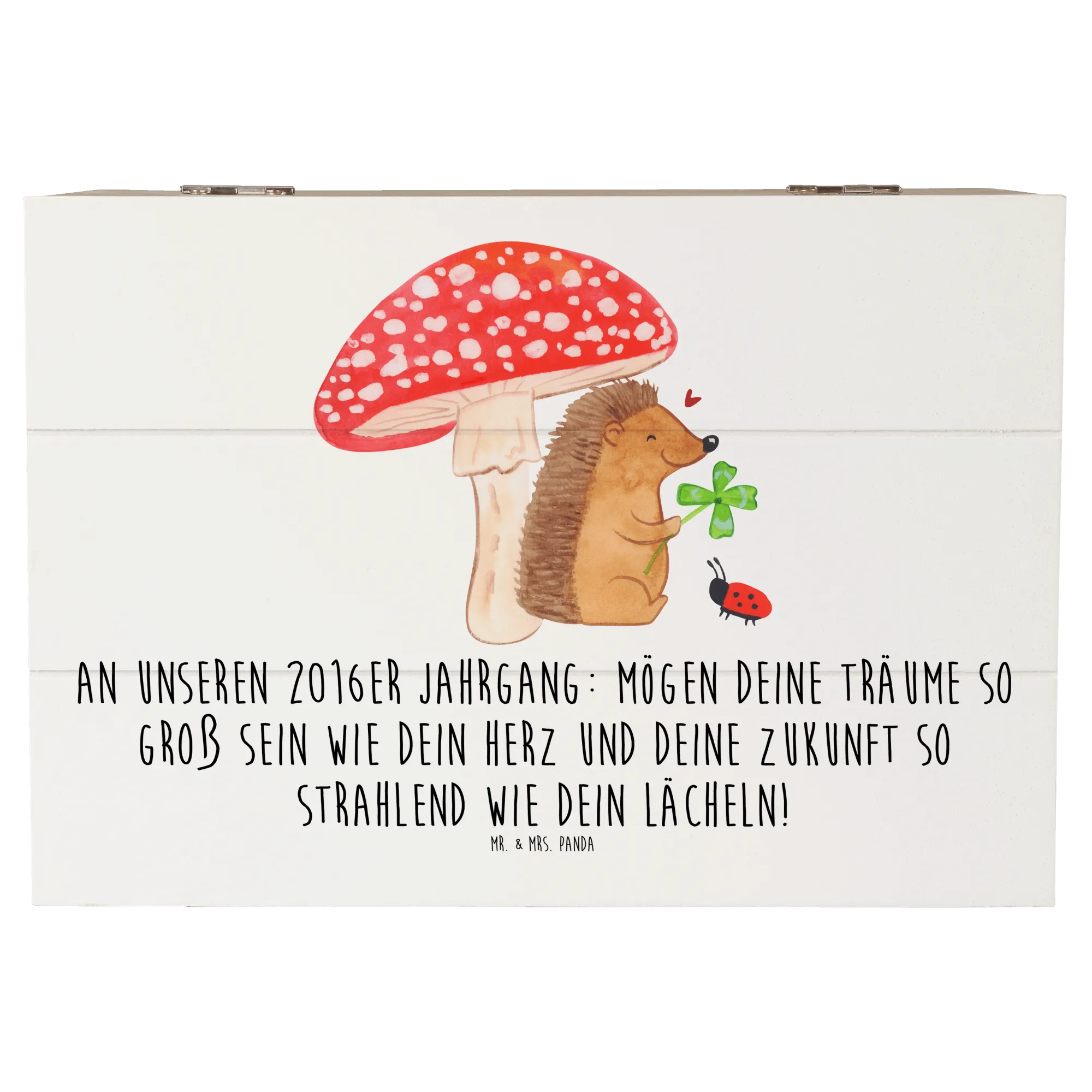 Die wunderschöne Holzkiste von Mr. & Mrs. Panda ist das perfekte Geschenk für alle, die 2016 das Licht der Welt erblickt haben! Mit dem liebevollen Slogan: 'An unseren 2016er Jahrgang: Mögen deine Träume so groß sein wie dein Herz und deine Zukunft so strahlend wie dein Lächeln!' versehen, wird diese Erinnerungskiste zu einem ganz besonderen Aufbewahrungsort für all die wertvollen Schätze aus der Kindheit, die ersten Zeichnungen oder die tollsten Erinnerungen vom Geburtstag.