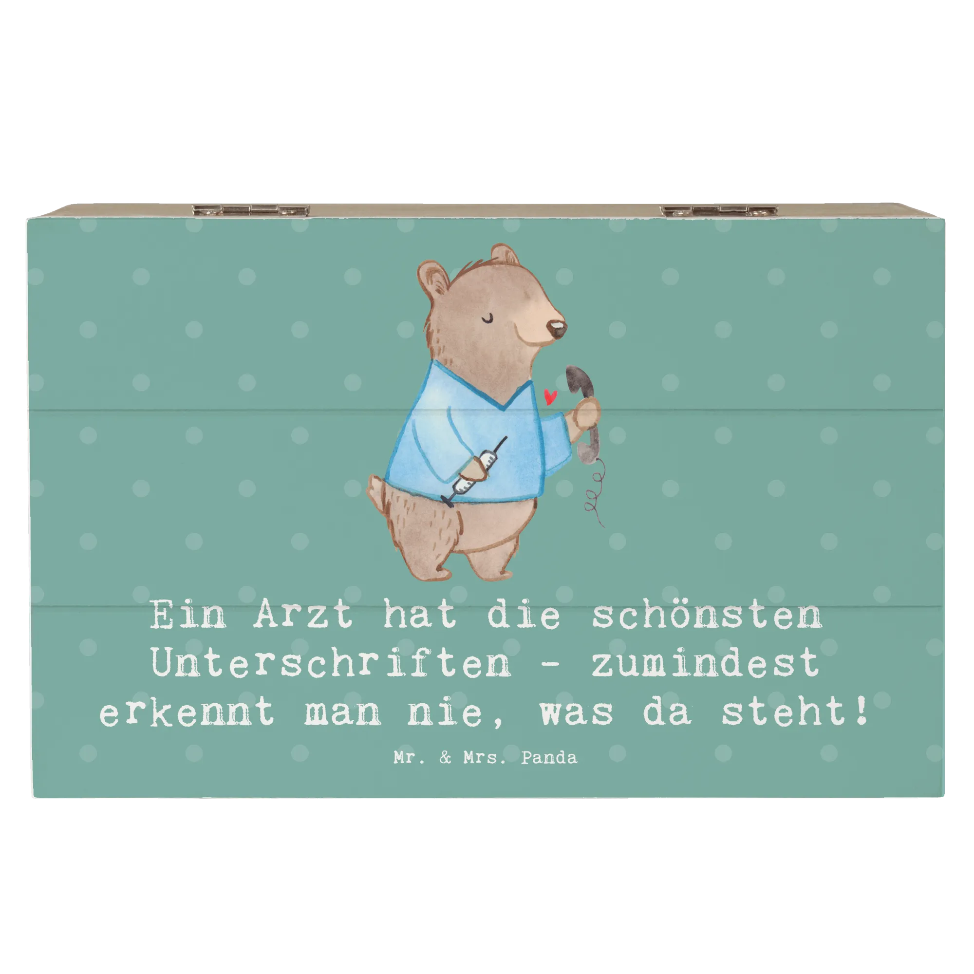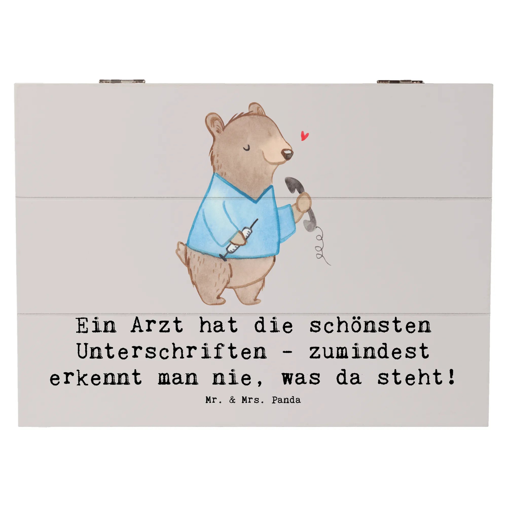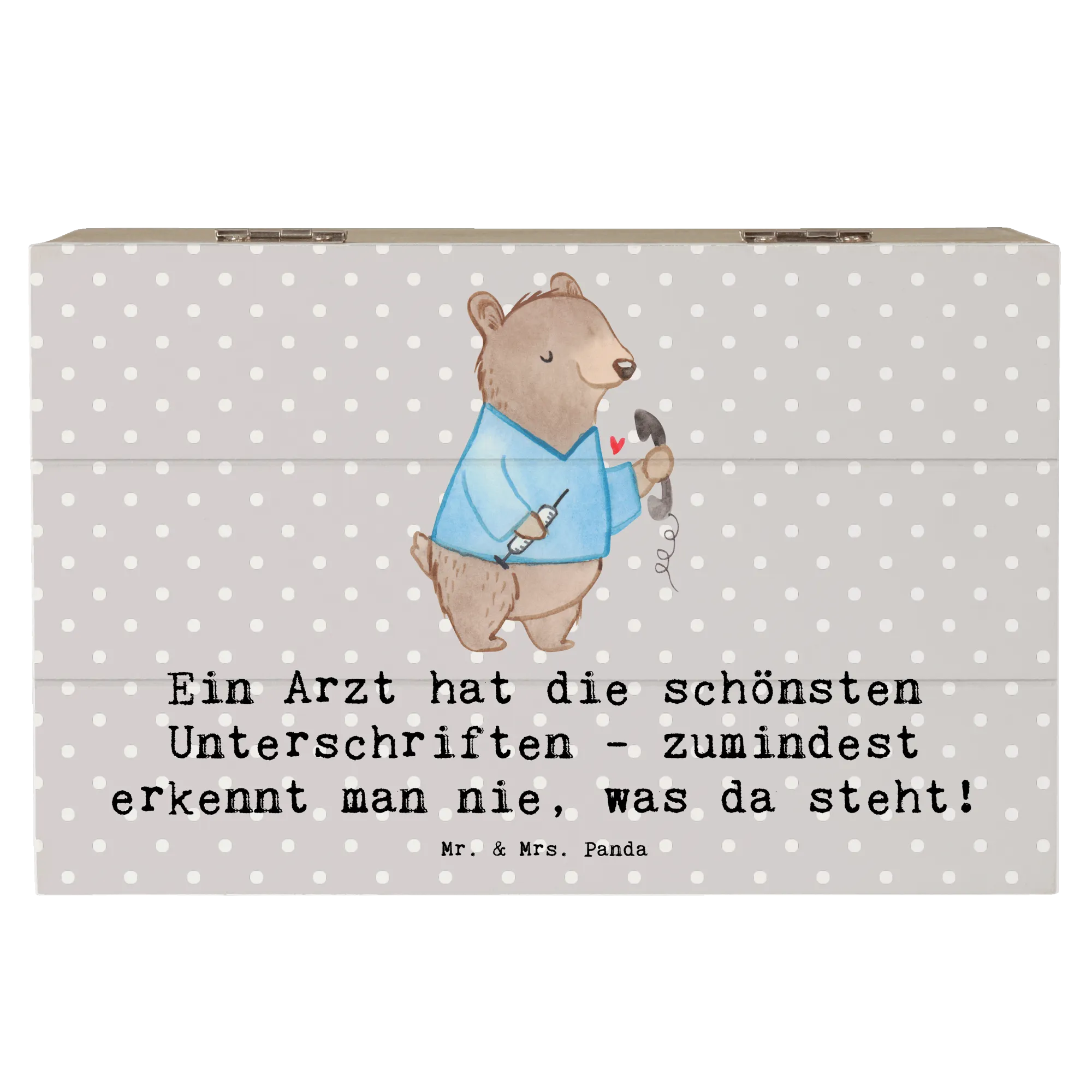 Drucke mit dem liebevollen Spruch "Ein Arzt hat die schönsten Unterschriften - zumindest erkennt man nie, was da steht!" machen diese Kiste einzigartig und bringen ein Lächeln in den Alltag.