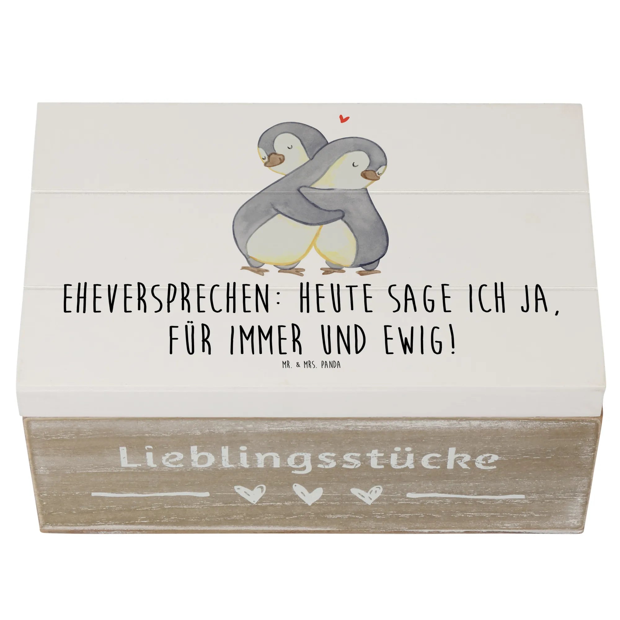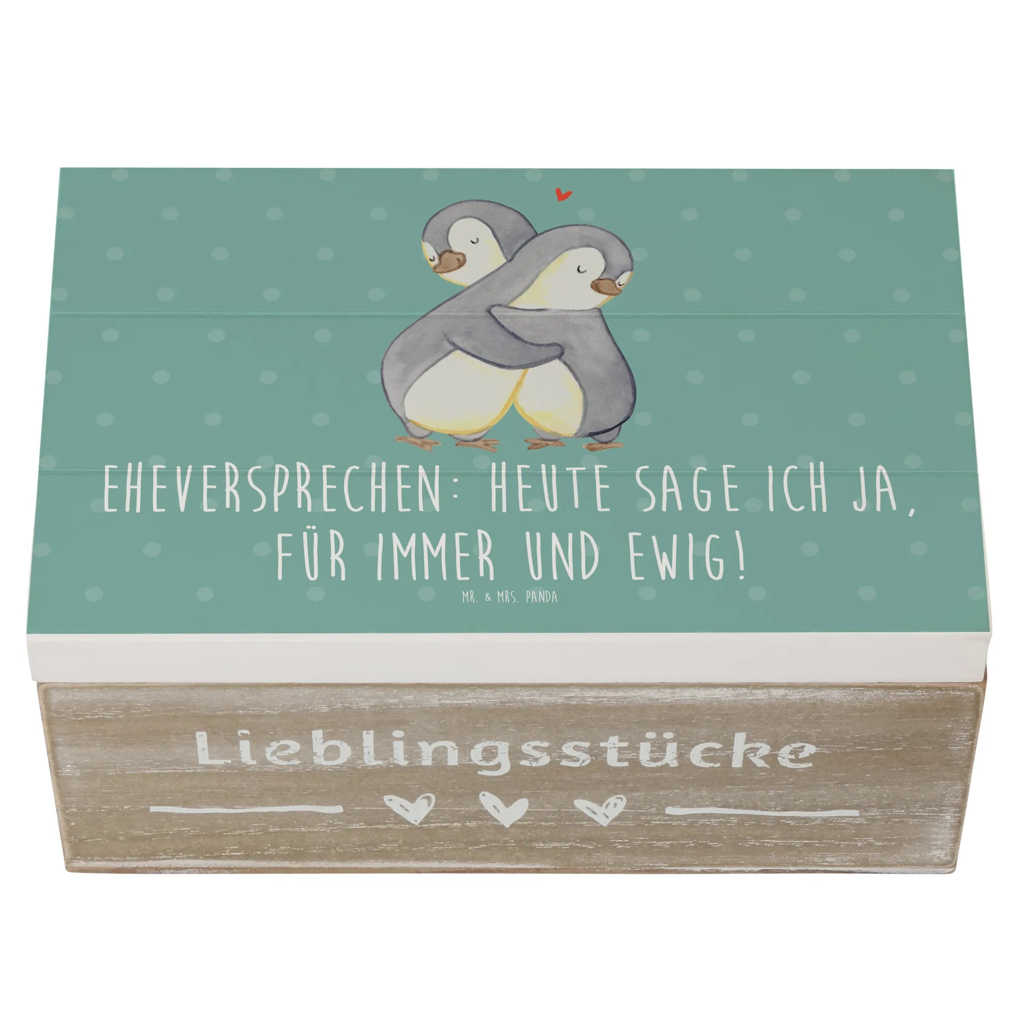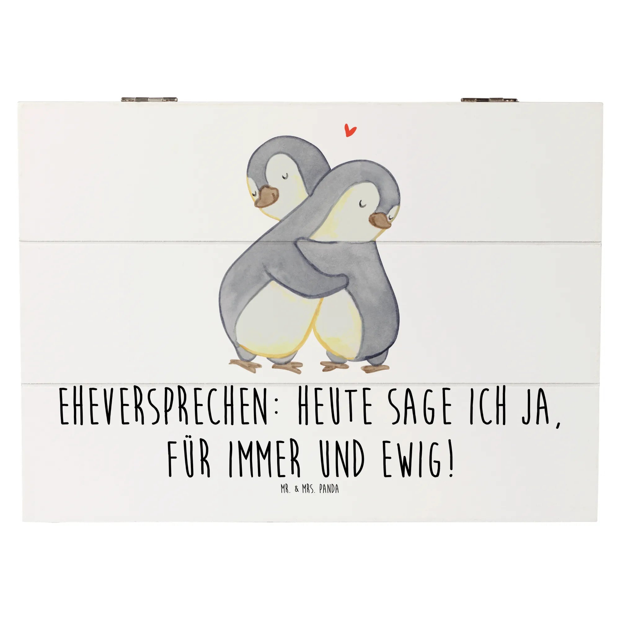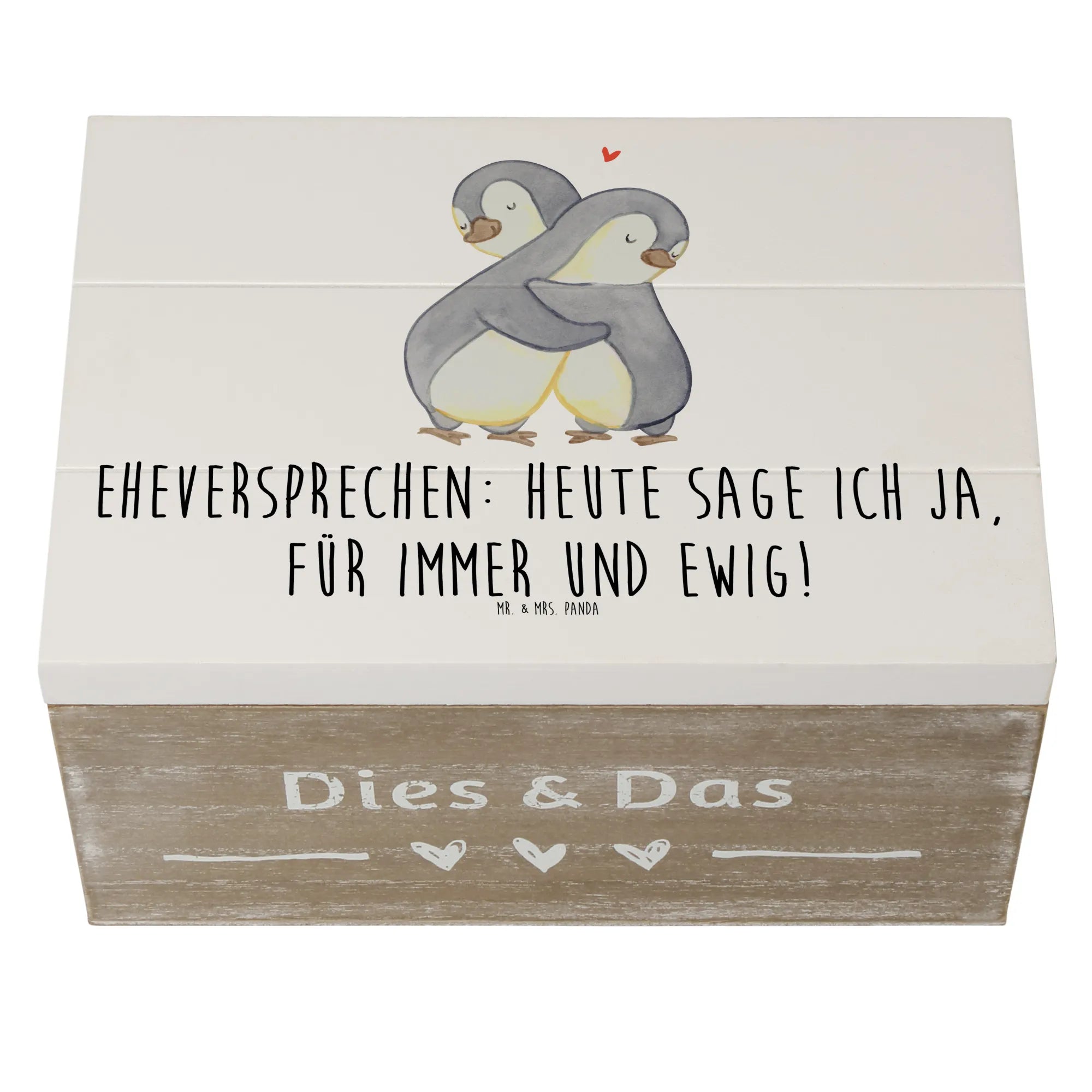 Die wunderschöne Holzkiste von Mr. & Mrs. Panda ist das perfekte Geschenkkästchen für alle frisch Verheirateten und verliebten Paare! Mit ihrem liebevollen Motiv und dem romantischen Spruch "Eheversprechen: Heute sage ich Ja, für immer und ewig!" ist diese Erinnerungskiste ideal, um die schönsten Augenblicke eurer gemeinsamen Reise aufzubewahren.