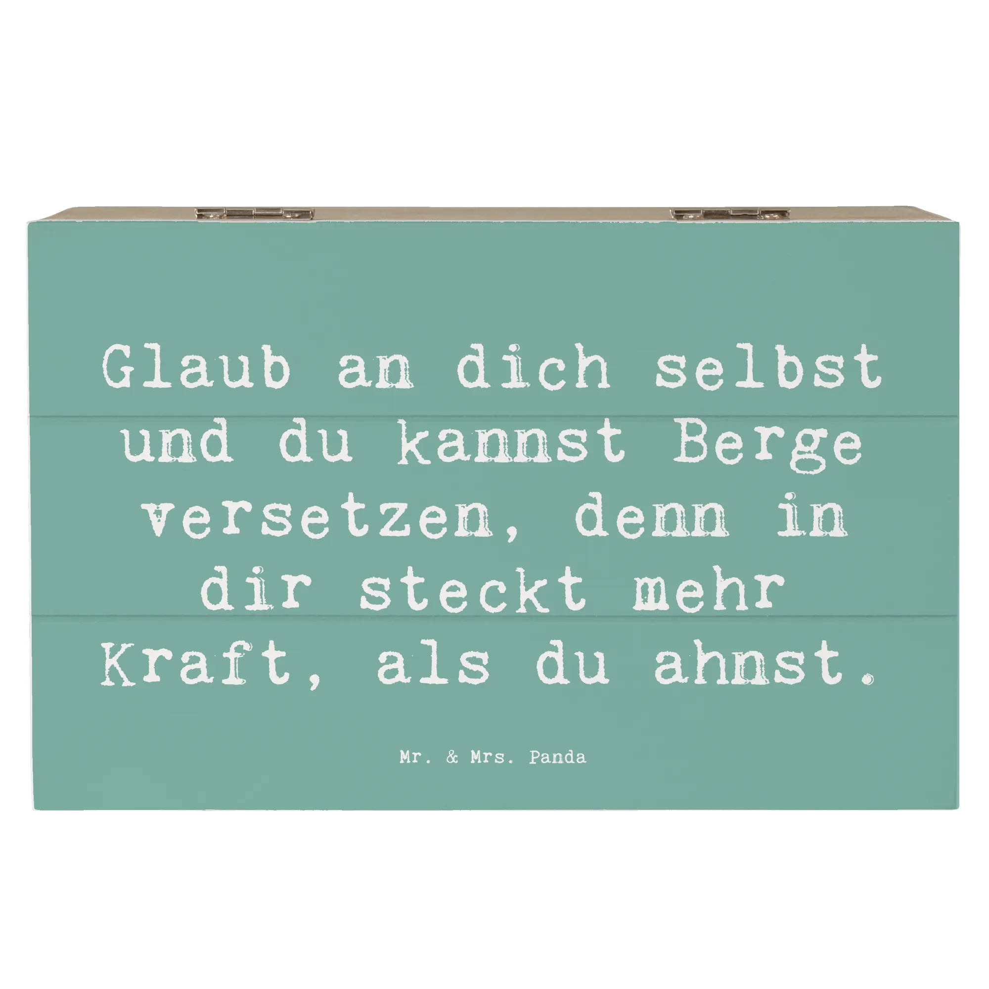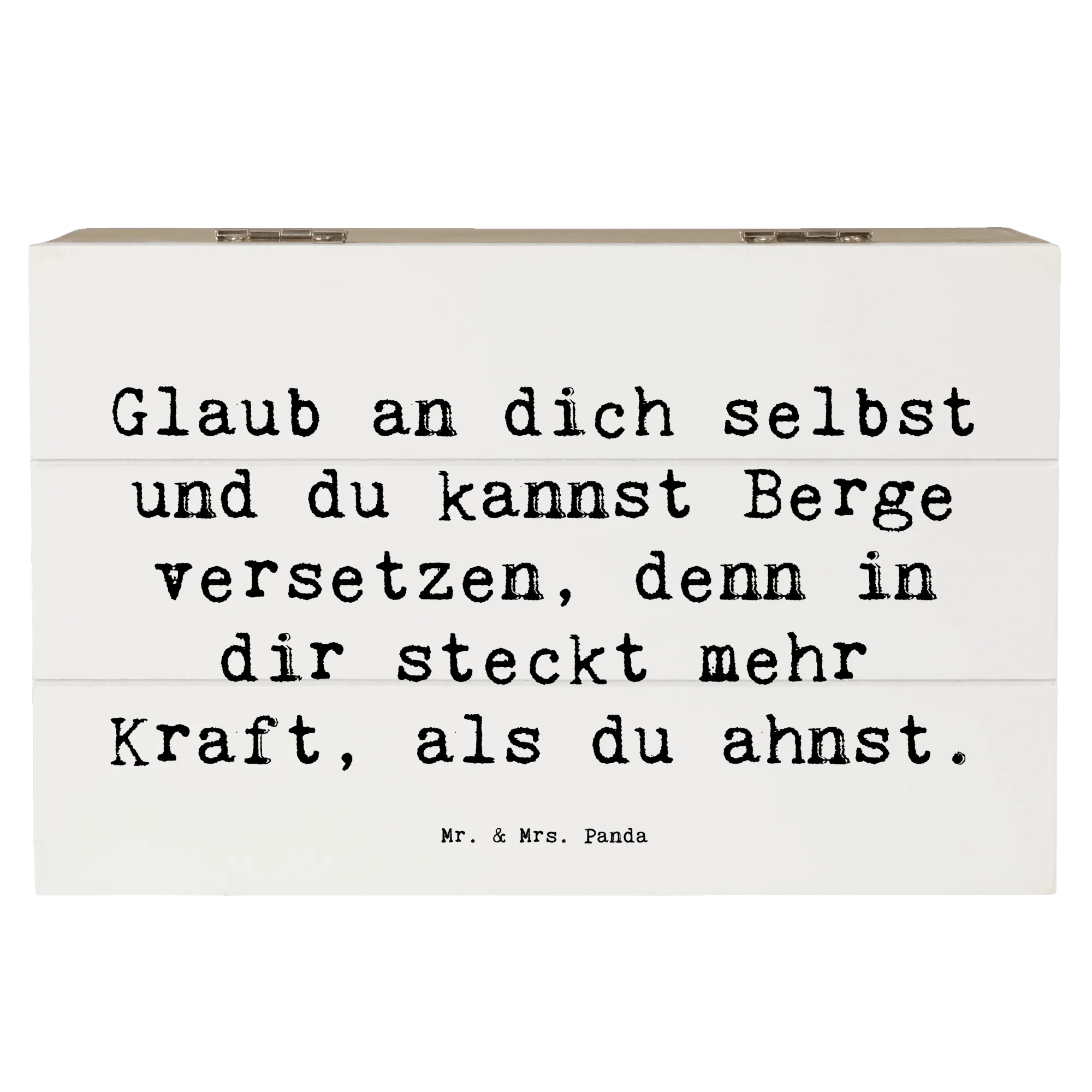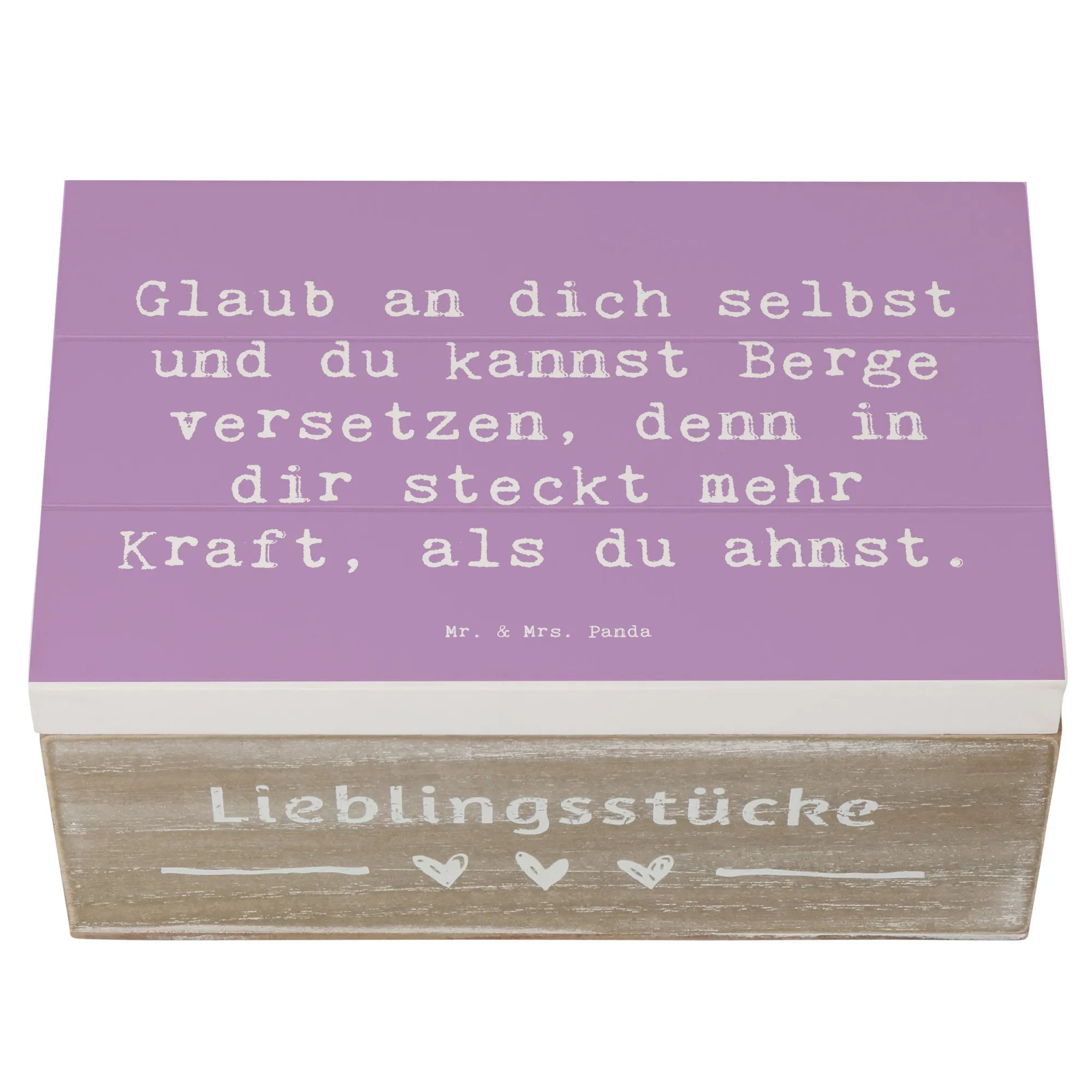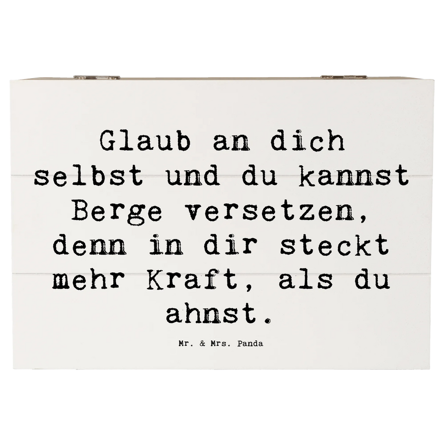 Diese wunderschöne Holzkiste von Mr. & Mrs. Panda ist nicht nur ein praktischer Aufbewahrungsort für all deine Schätze, sondern auch ein Quell der Inspiration und Ermutigung. Der liebevoll gestaltete Spruch, "Glaub an dich selbst und du kannst Berge versetzen, denn in dir steckt mehr Kraft, als du ahnst!", ist perfekt, um die Kleinen oder auch die Großen zu motivieren und sie daran zu erinnern, was in ihnen steckt.