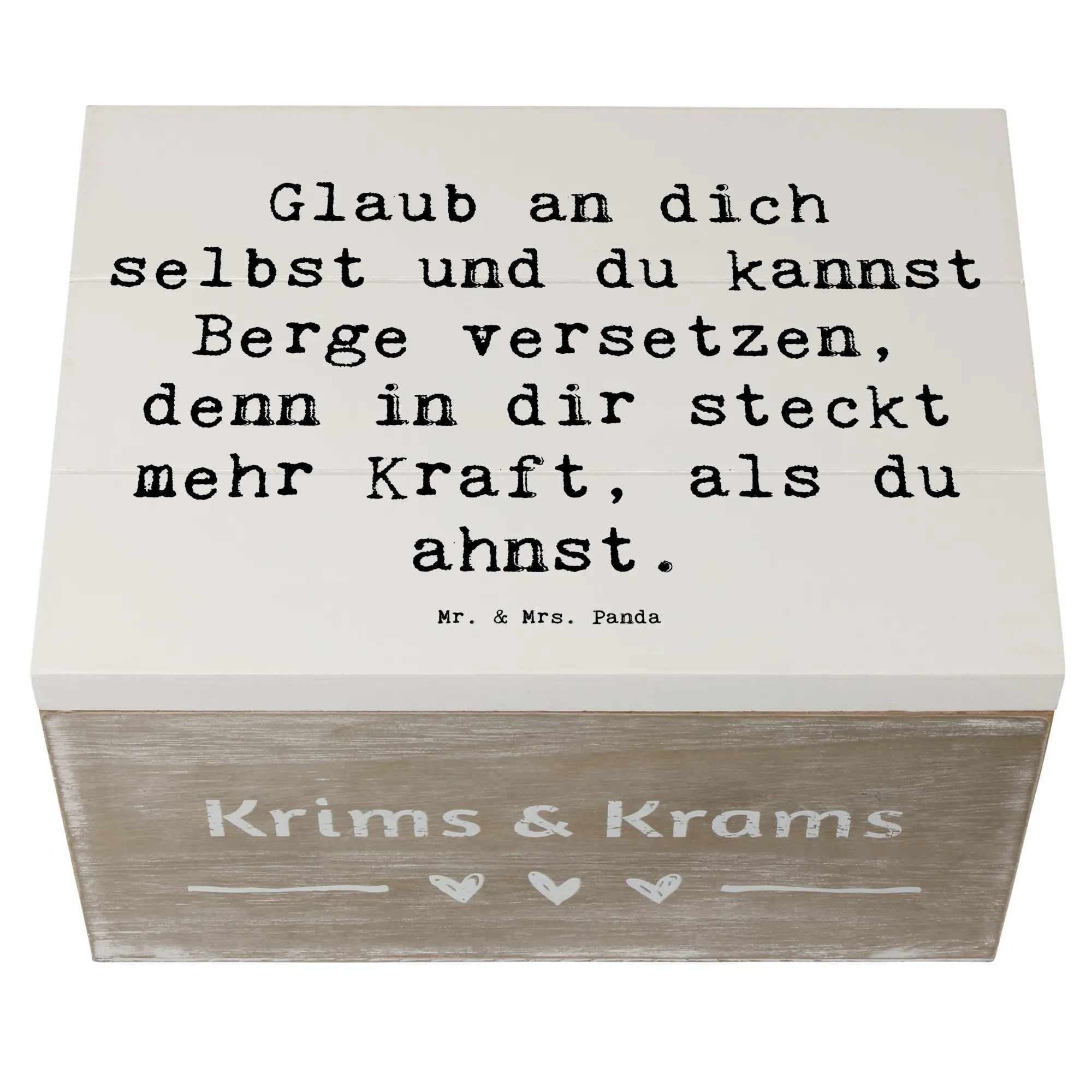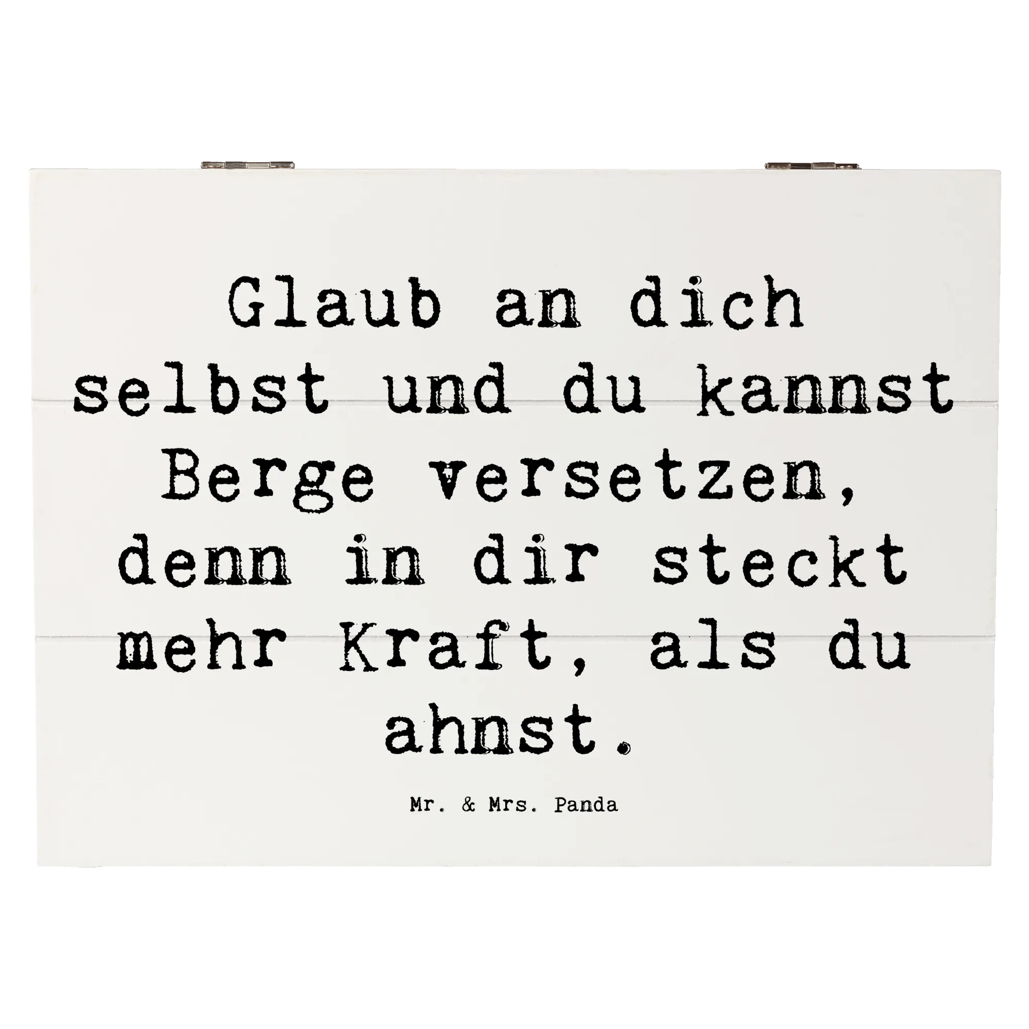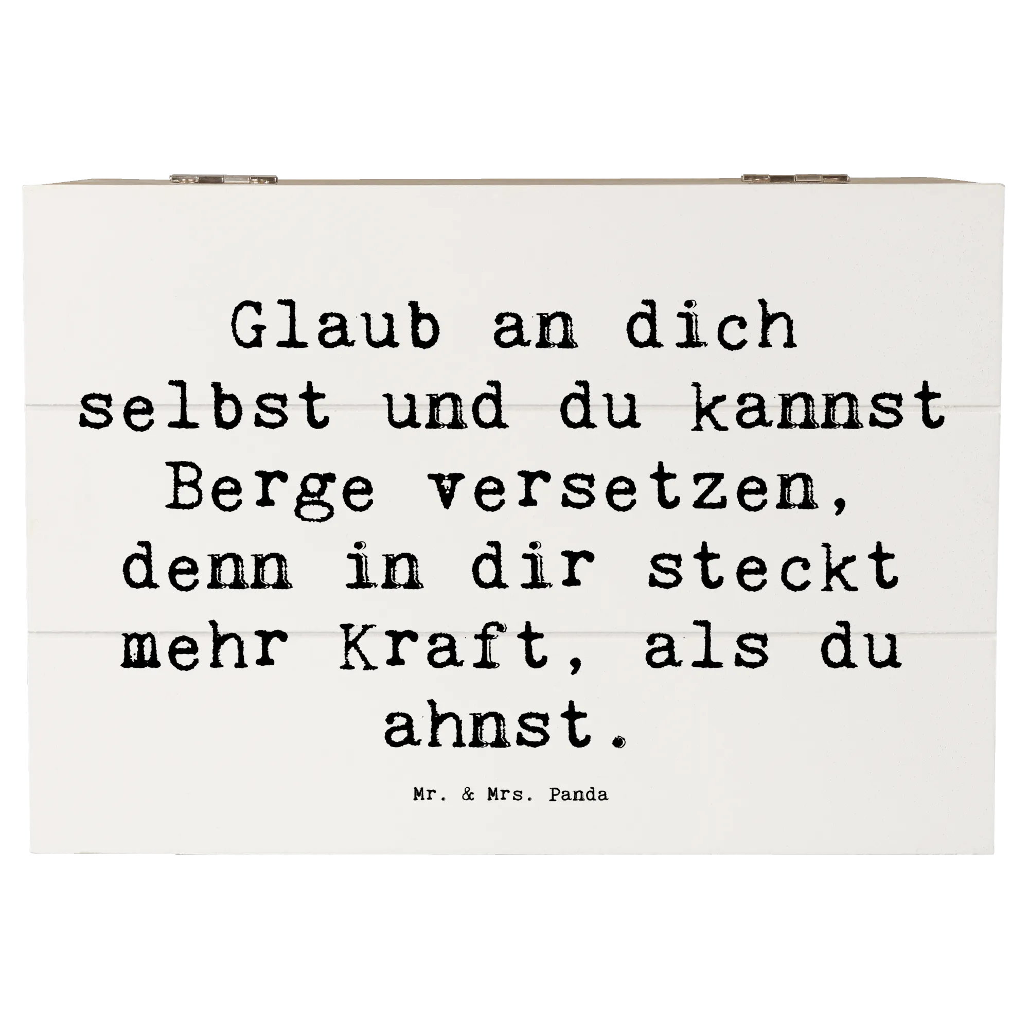 Diese wunderschöne Holzkiste von Mr. & Mrs. Panda ist nicht nur ein praktischer Aufbewahrungsort für all deine Schätze, sondern auch ein Quell der Inspiration und Ermutigung. Der liebevoll gestaltete Spruch, "Glaub an dich selbst und du kannst Berge versetzen, denn in dir steckt mehr Kraft, als du ahnst!", ist perfekt, um die Kleinen oder auch die Großen zu motivieren und sie daran zu erinnern, was in ihnen steckt.