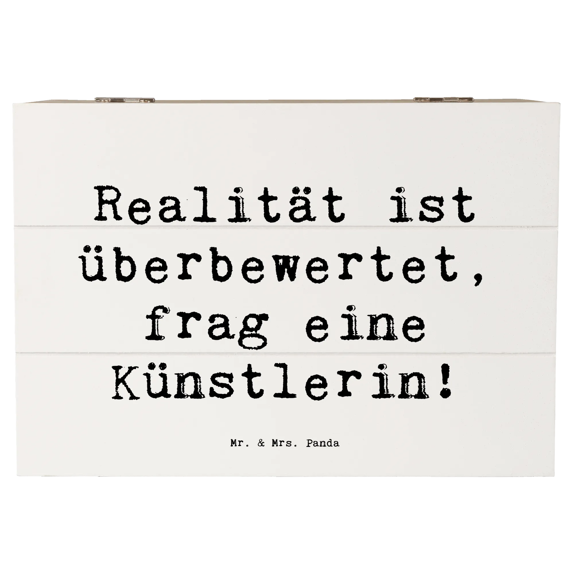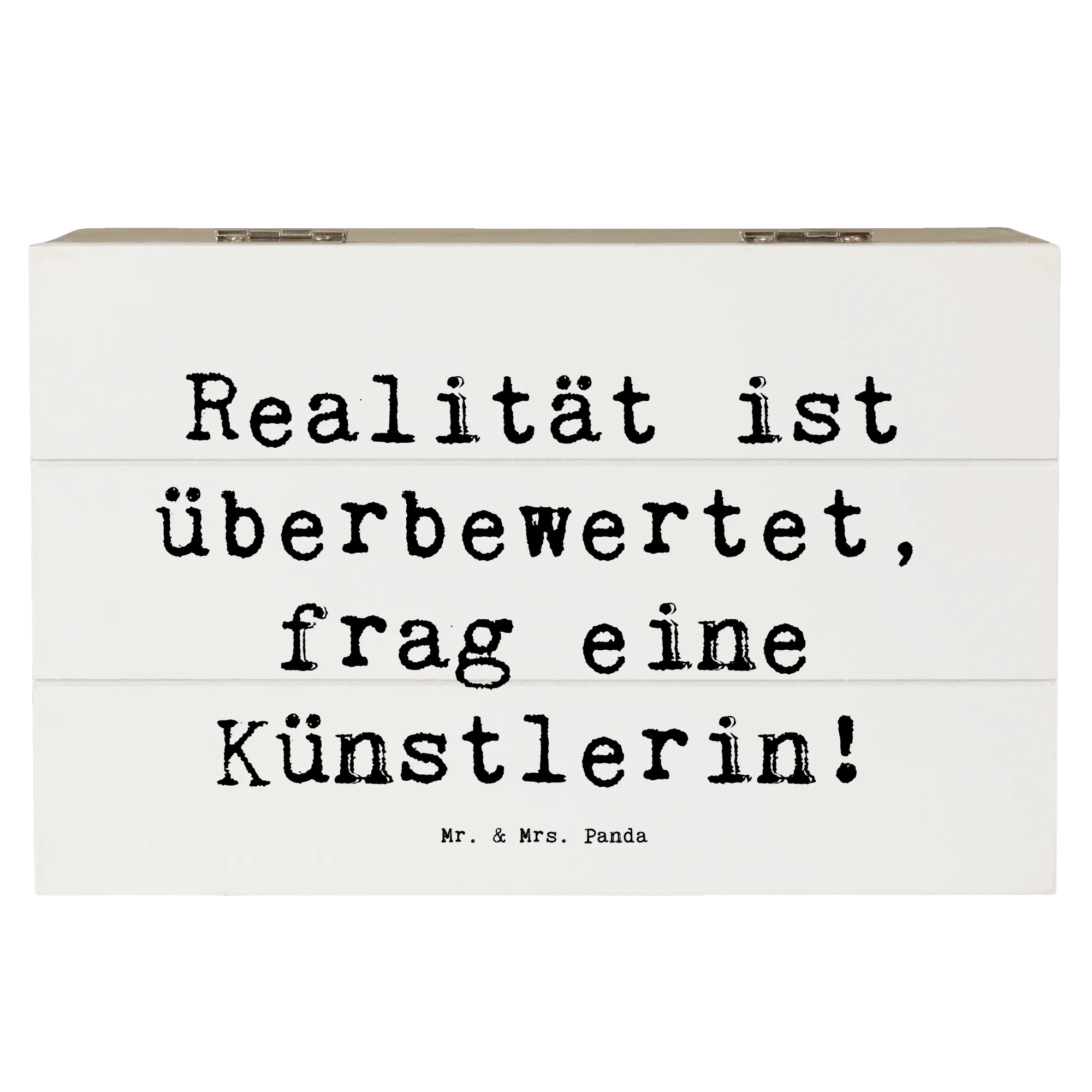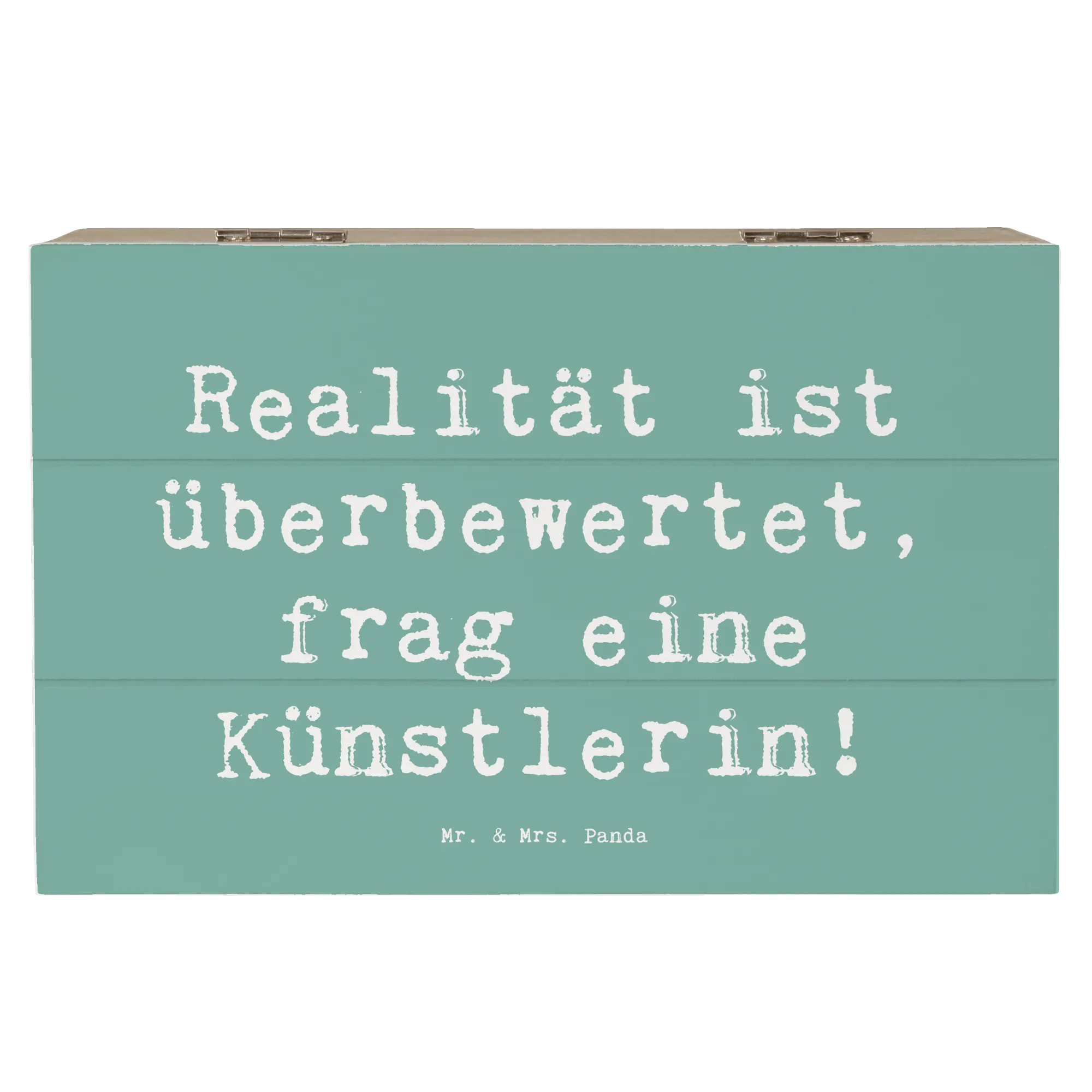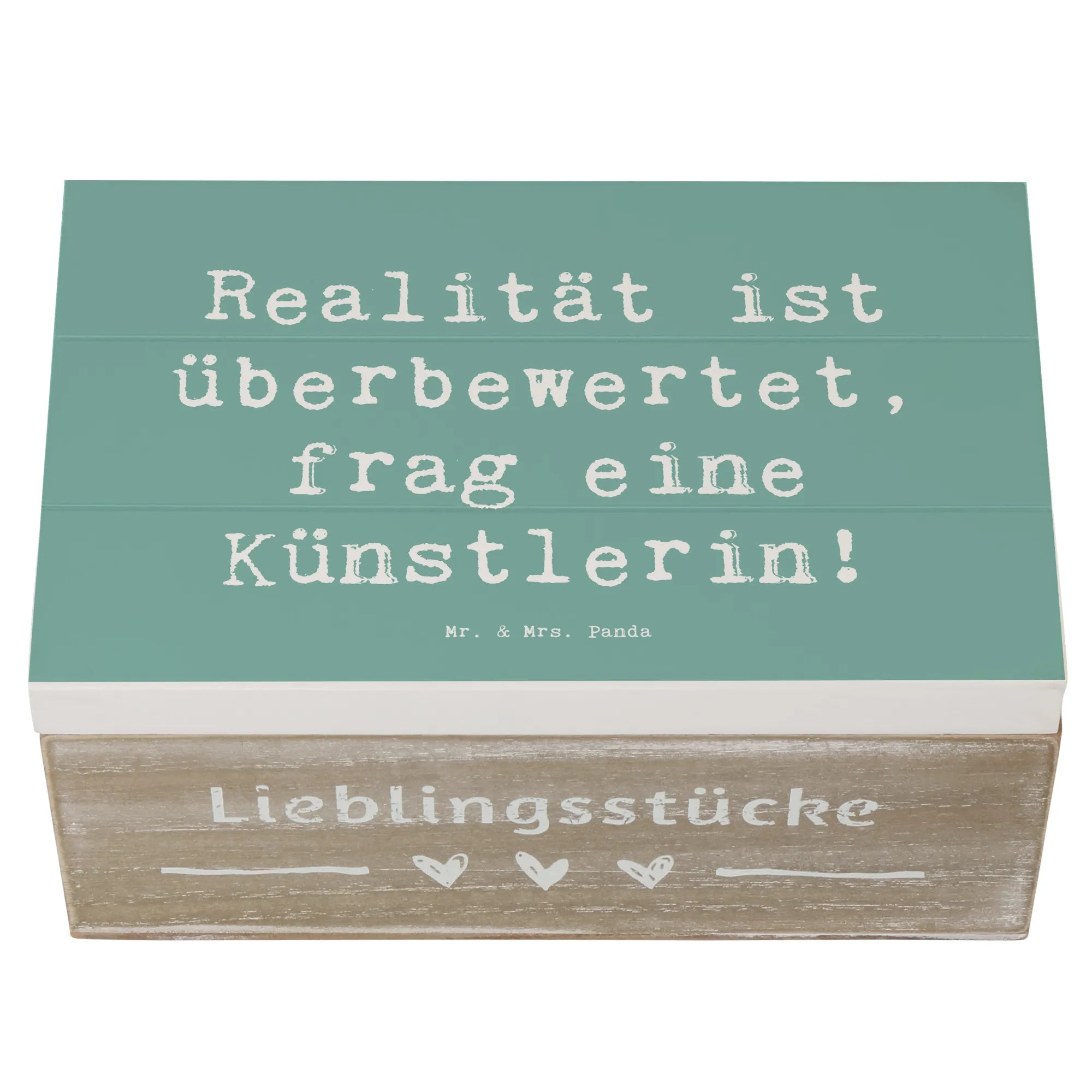 Die wunderschöne Holzkiste von Mr. & Mrs. Panda ist das perfekte Geschenk für kreative Seelen und Kunstliebhaber, besonders für all jene, die den kreativen Beruf der Künstlerin ausüben oder schätzen. Mit einem liebevoll gestaltetem Motiv, das die Aussage 'Realität ist überbewertet, frag eine Künstlerin!' zeigt, wird diese Kiste zu einem wunderbaren Accessoire in jedem Atelier oder Wohnraum.