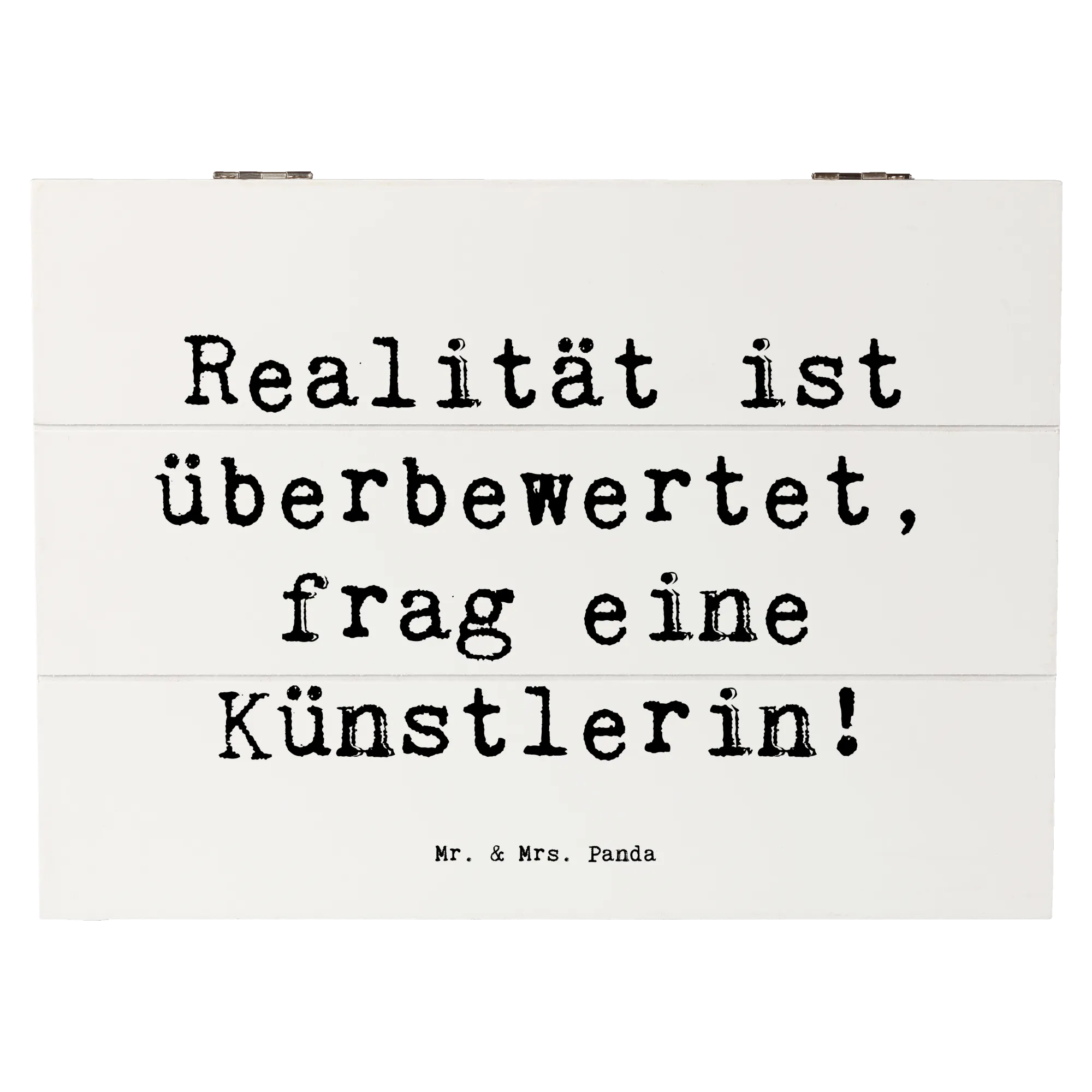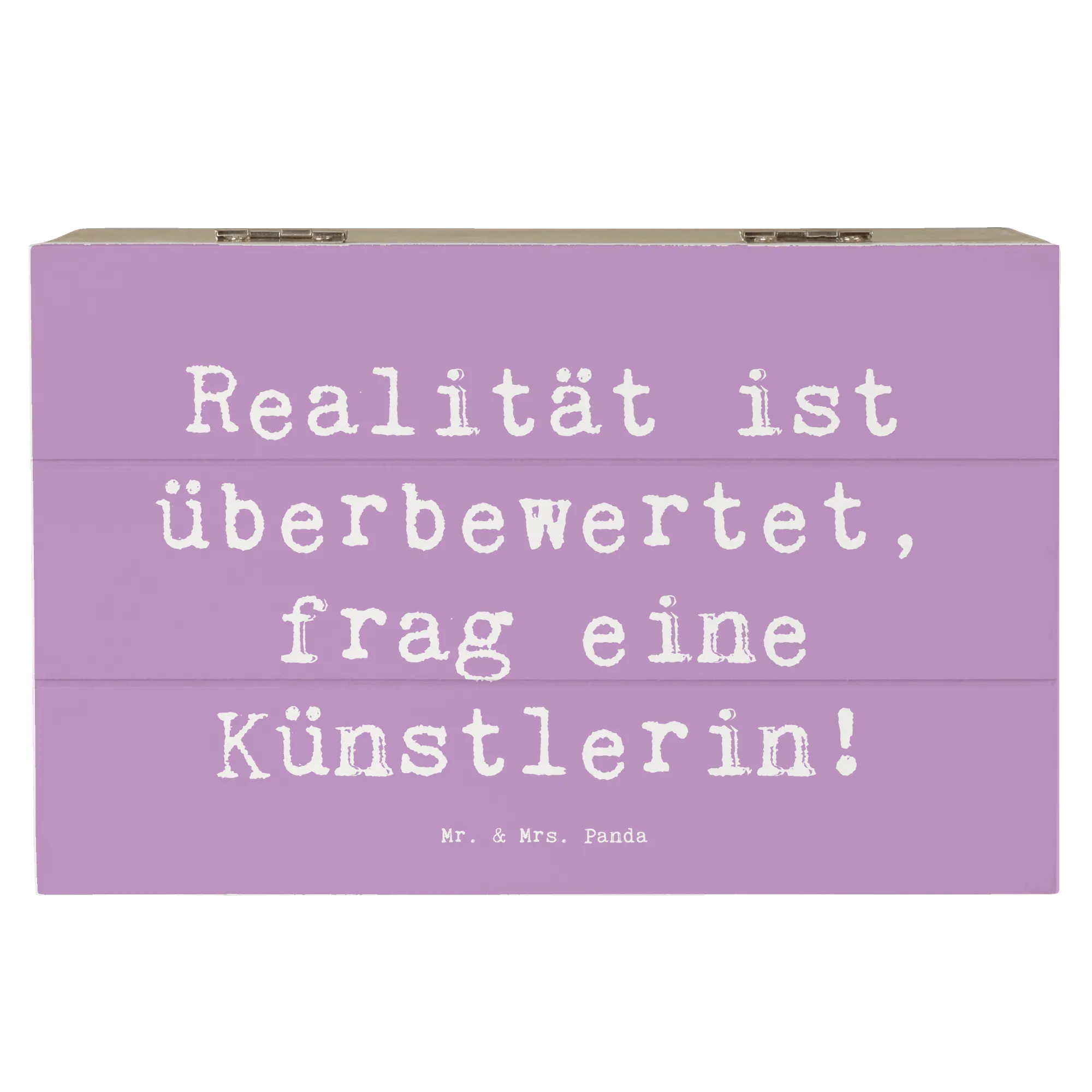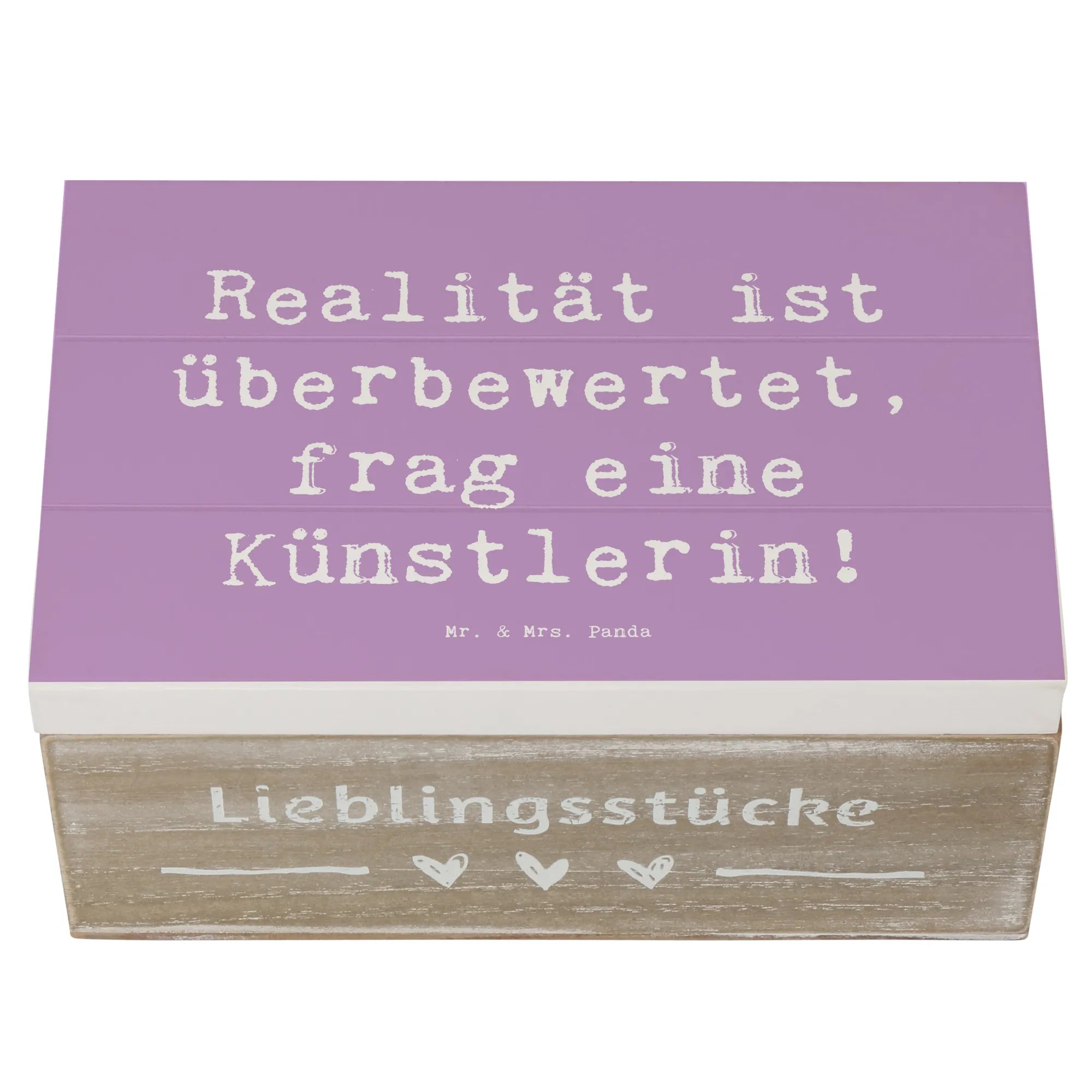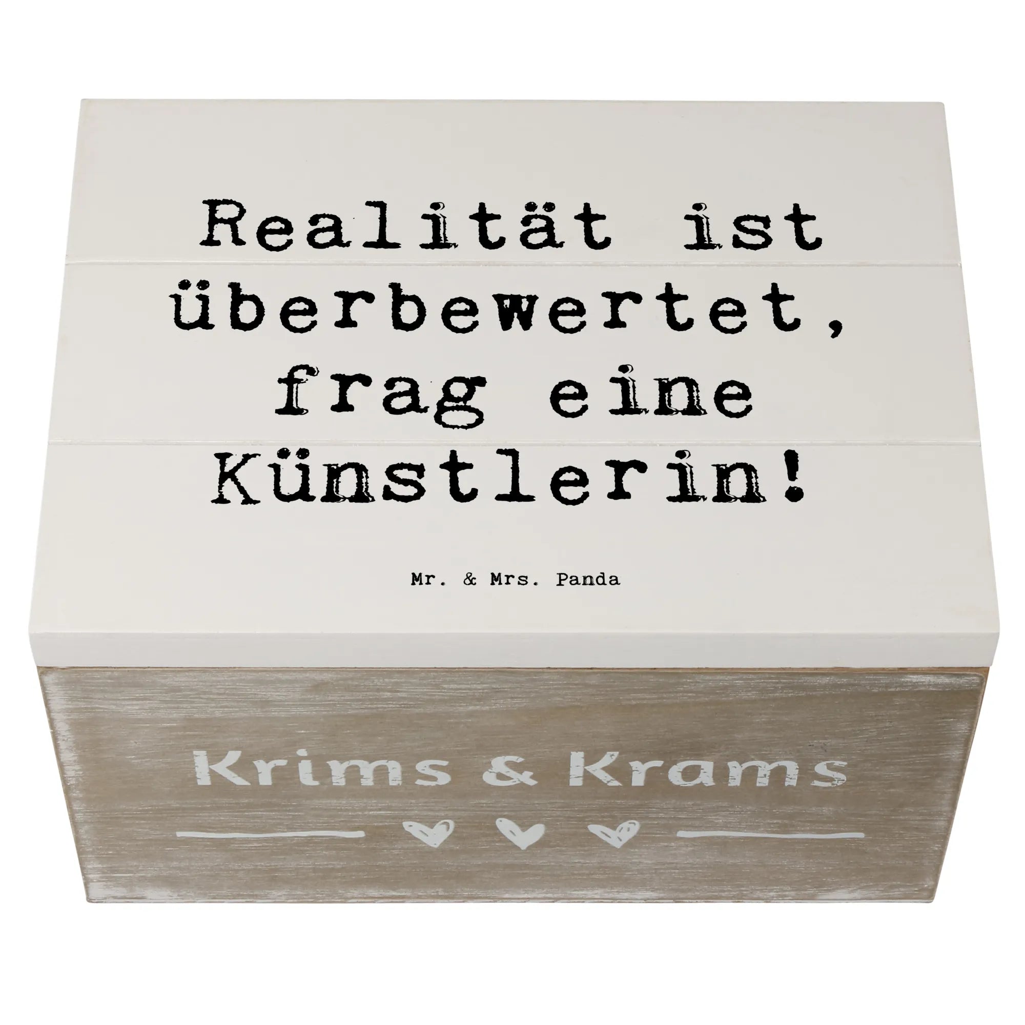 Die wunderschöne Holzkiste von Mr. & Mrs. Panda ist das perfekte Geschenk für kreative Seelen und Kunstliebhaber, besonders für all jene, die den kreativen Beruf der Künstlerin ausüben oder schätzen. Mit einem liebevoll gestaltetem Motiv, das die Aussage 'Realität ist überbewertet, frag eine Künstlerin!' zeigt, wird diese Kiste zu einem wunderbaren Accessoire in jedem Atelier oder Wohnraum.