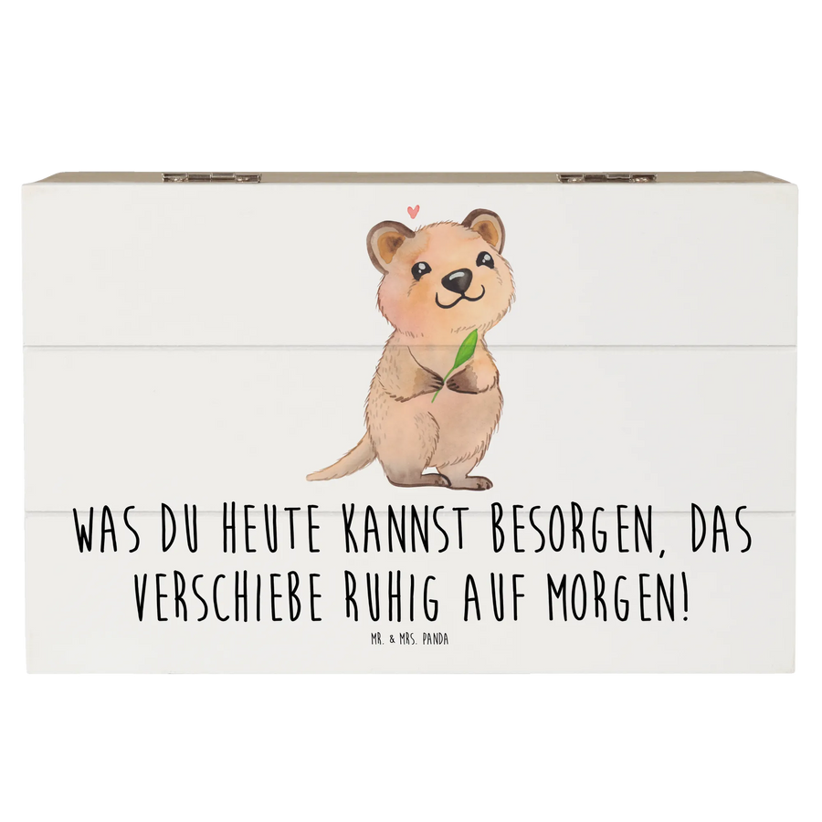 Die Holzkiste Quokka Happy ist das ideale Geschenk für alle, die ein Lächeln auf den Lippen haben und Lebensfreude ausstrahlen! Sie ist nicht nur ein optisches Highlight, sondern auch ein praktischer Aufbewahrungsort für all Deine wertvollen Erinnerungen. Diese wunderschöne Holzschatulle von Mr. & Mrs. Panda mit liebevoll handgezeichnetem Quokka-Motiv und dem Spruch "Was du heute kannst besorgen, das verschiebe ruhig auf morgen!" ist perfekt für Anlässe wie Kommunion, Konfirmation oder sogar als kreativer Aufbewahrungsort für Fotos und kleine Schätze aus der Kindheit.
