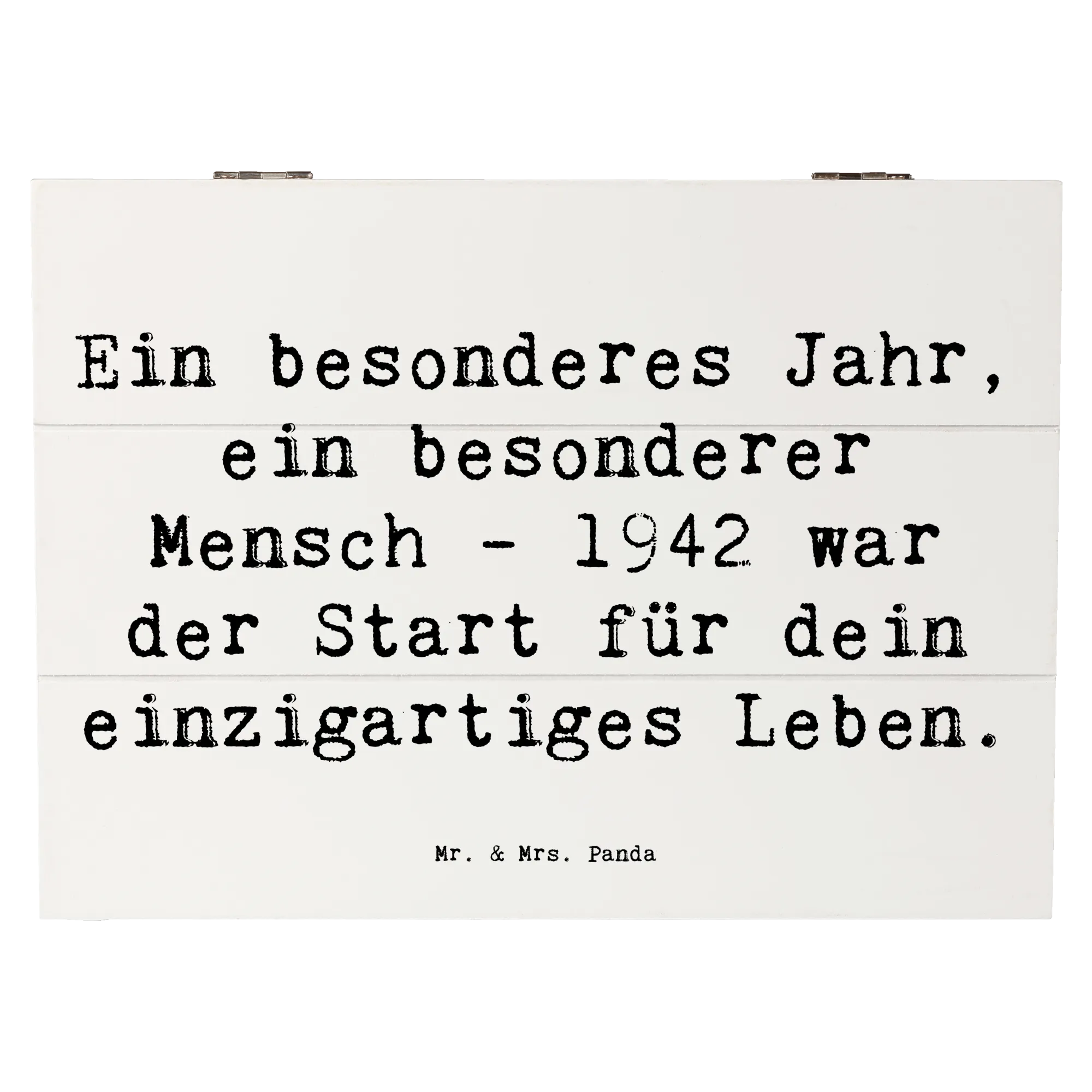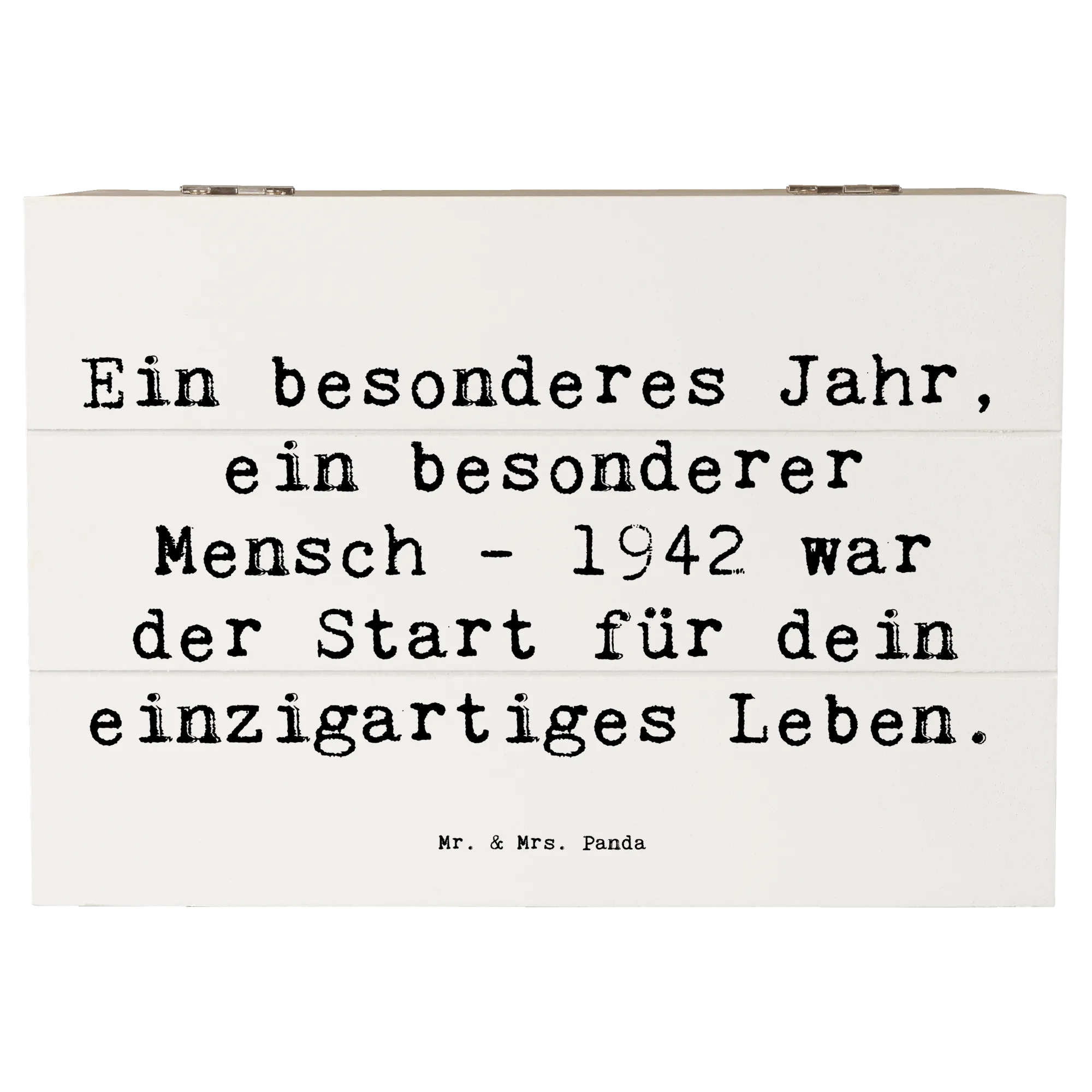 Entdecke die wunderschöne Holzkiste von Mr. & Mrs. Panda, die das perfekte Geschenk für alle, die 1942 geboren wurden, ist! Diese einzigartige Erinnerungskiste mit dem liebevollen Slogan "Ein besonderes Jahr, ein besonderer Mensch - 1942 war der Start für dein einzigartiges Leben." bietet nicht nur ausreichend Platz für all deine wertvollen Schätze, sondern sorgt auch für eine nostalgische Rückreise in die Vergangenheit.