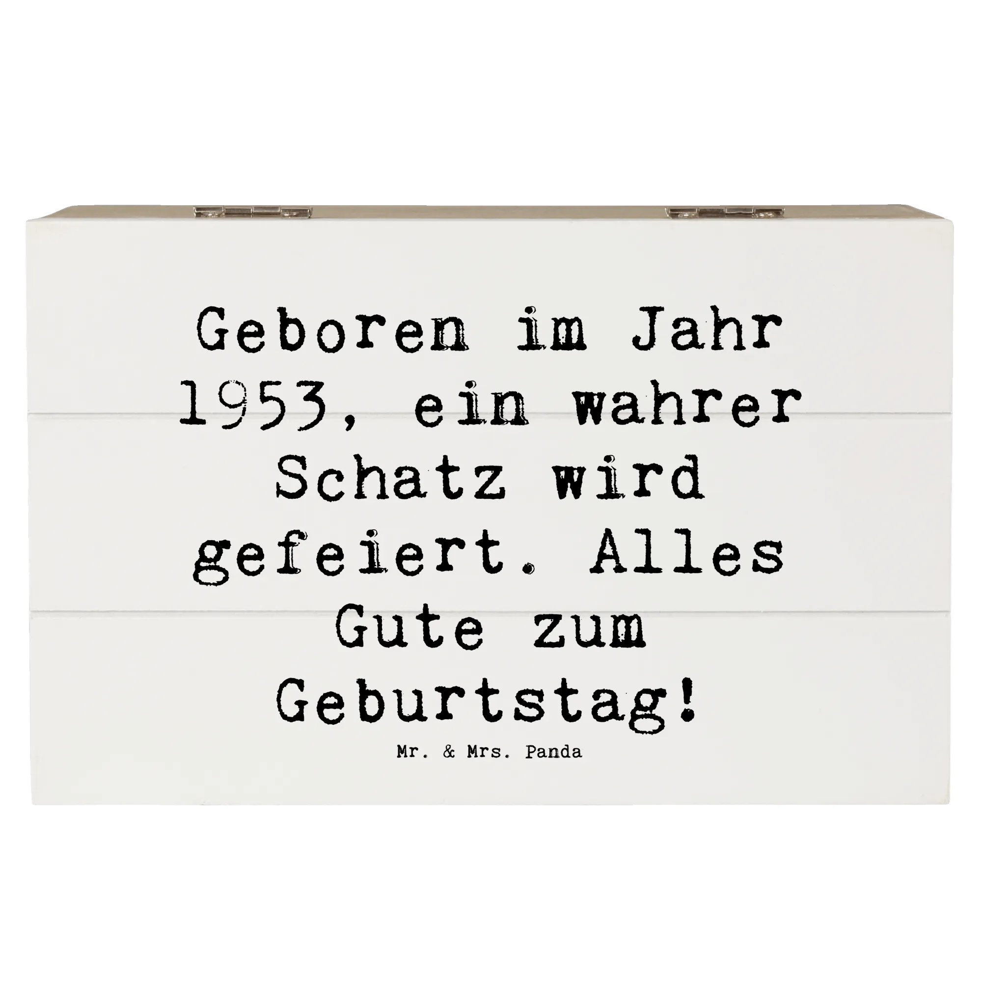 Die wunderschöne Holzkiste aus der Kollektion "Geburtstag Geburtsjahr" von Mr. & Mrs. Panda ist das perfekte Geschenk für jeden, der 1953 geboren wurde. Mit dem motivierenden Slogan "Geboren im Jahr 1953, ein wahrer Schatz wird gefeiert. Alles Gute zum Geburtstag!" macht diese Erinnerungskiste jeden Geburtstag zu einem besonderen Anlass.