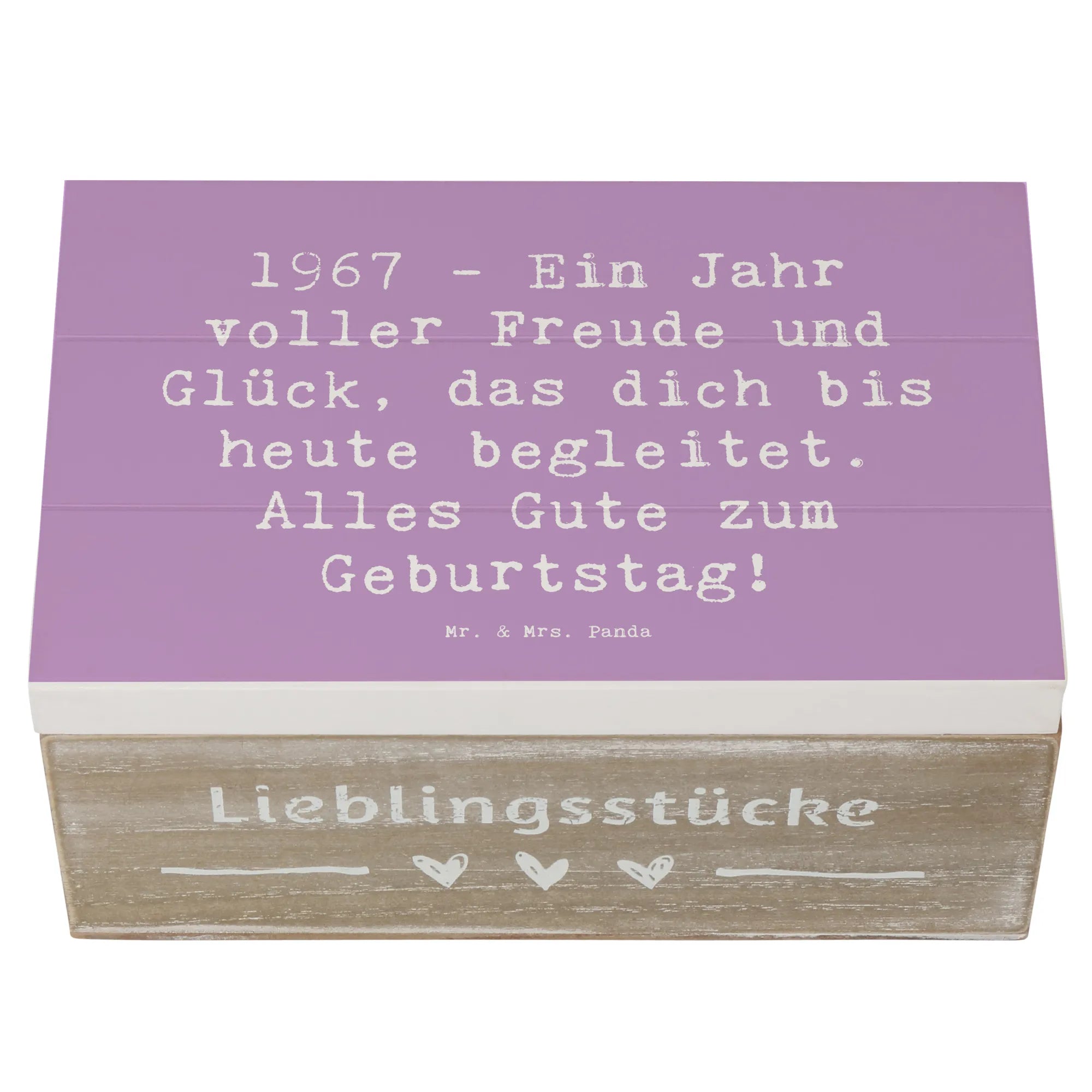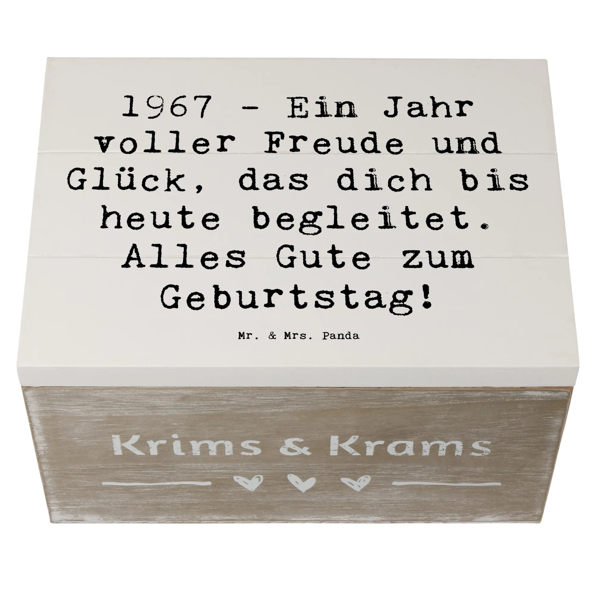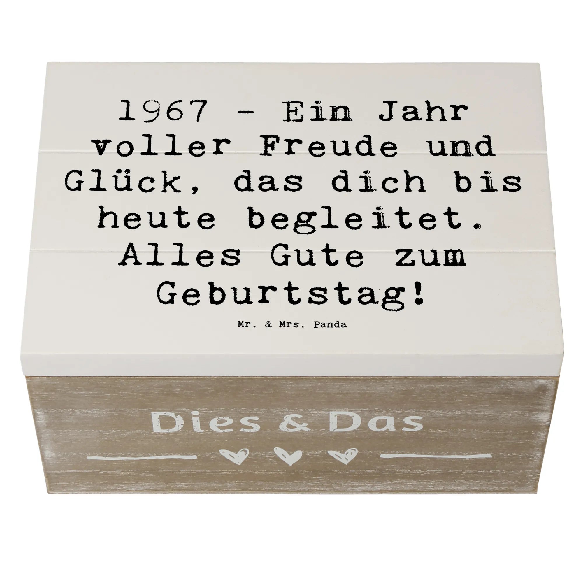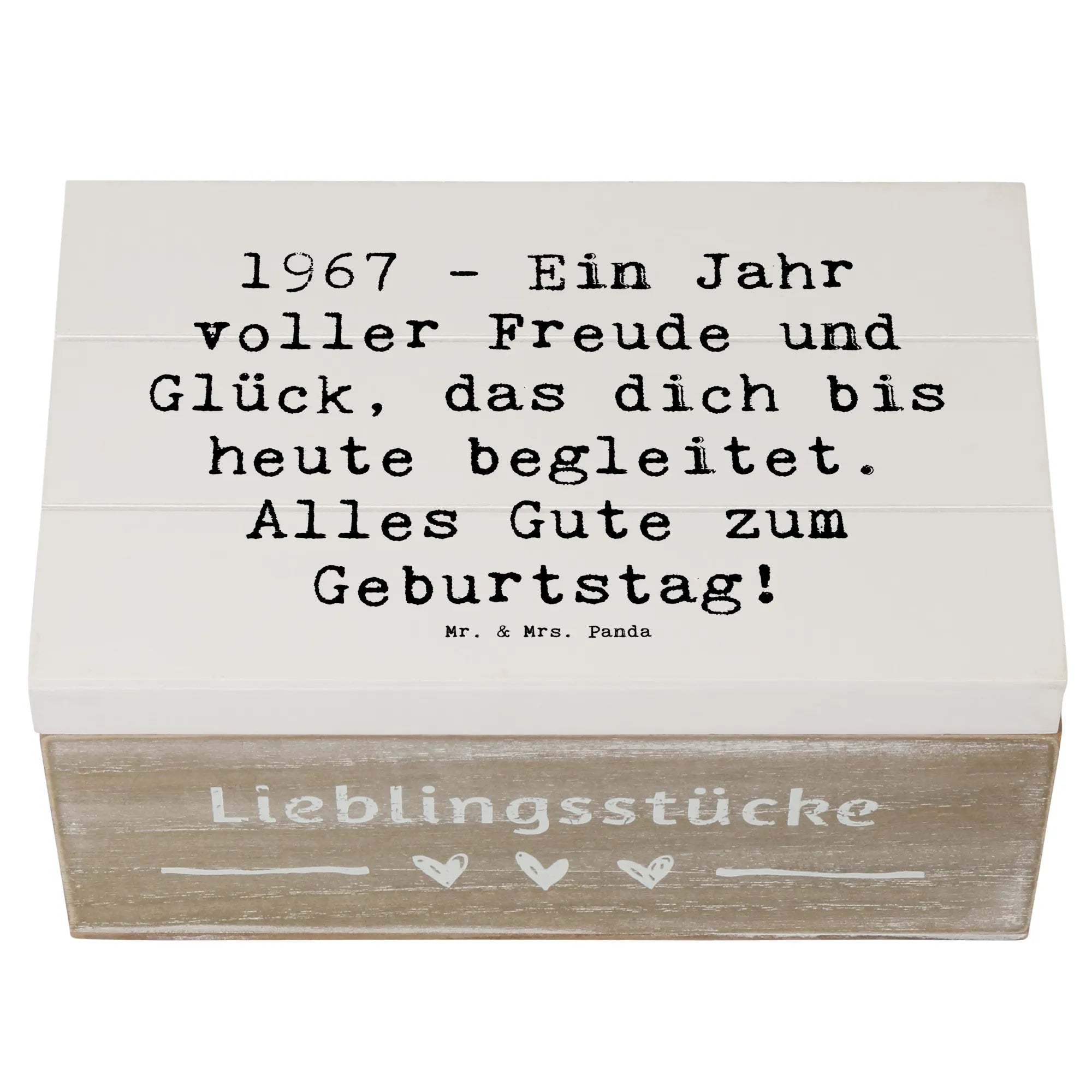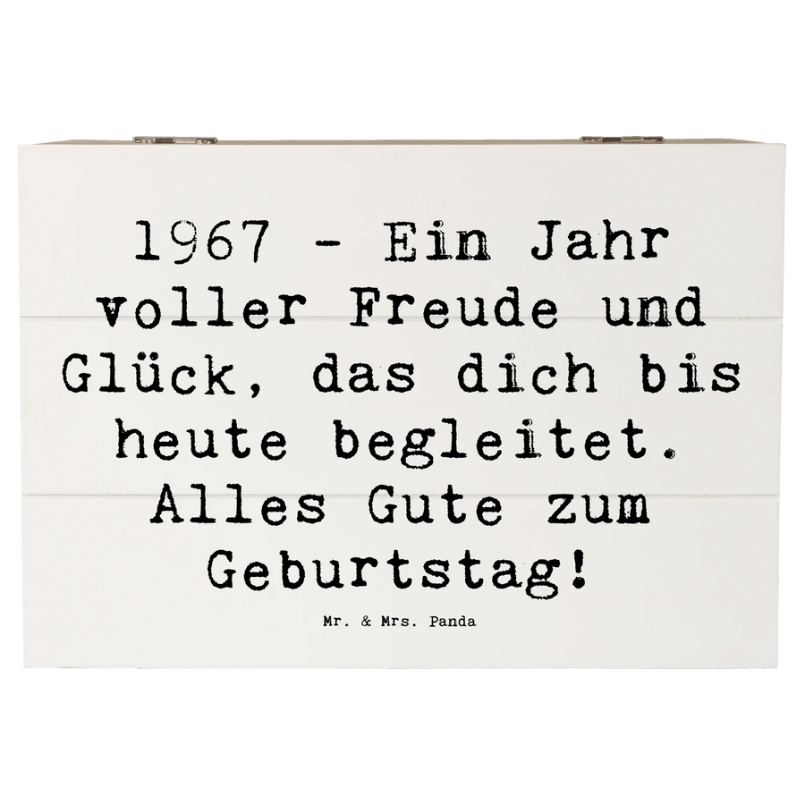 Die wunderschöne Holzkiste von Mr. & Mrs. Panda mit dem Motiv "1967 - Ein Jahr voller Freude und Glück, das dich bis heute begleitet. Alles Gute zum Geburtstag!" ist das perfekte Geschenk für jeden, der in diesem fantastischen Jahr das Licht der Welt erblickt hat.