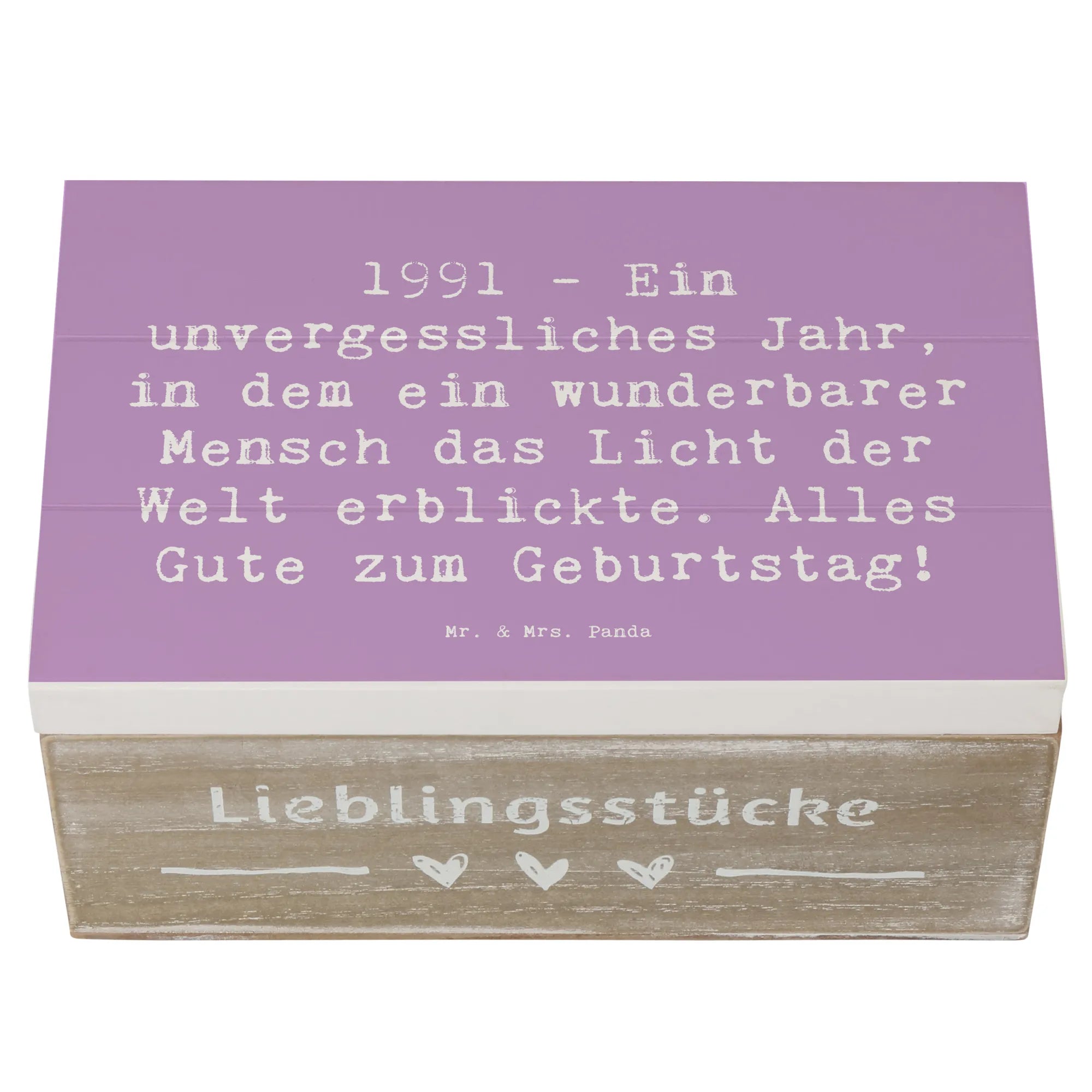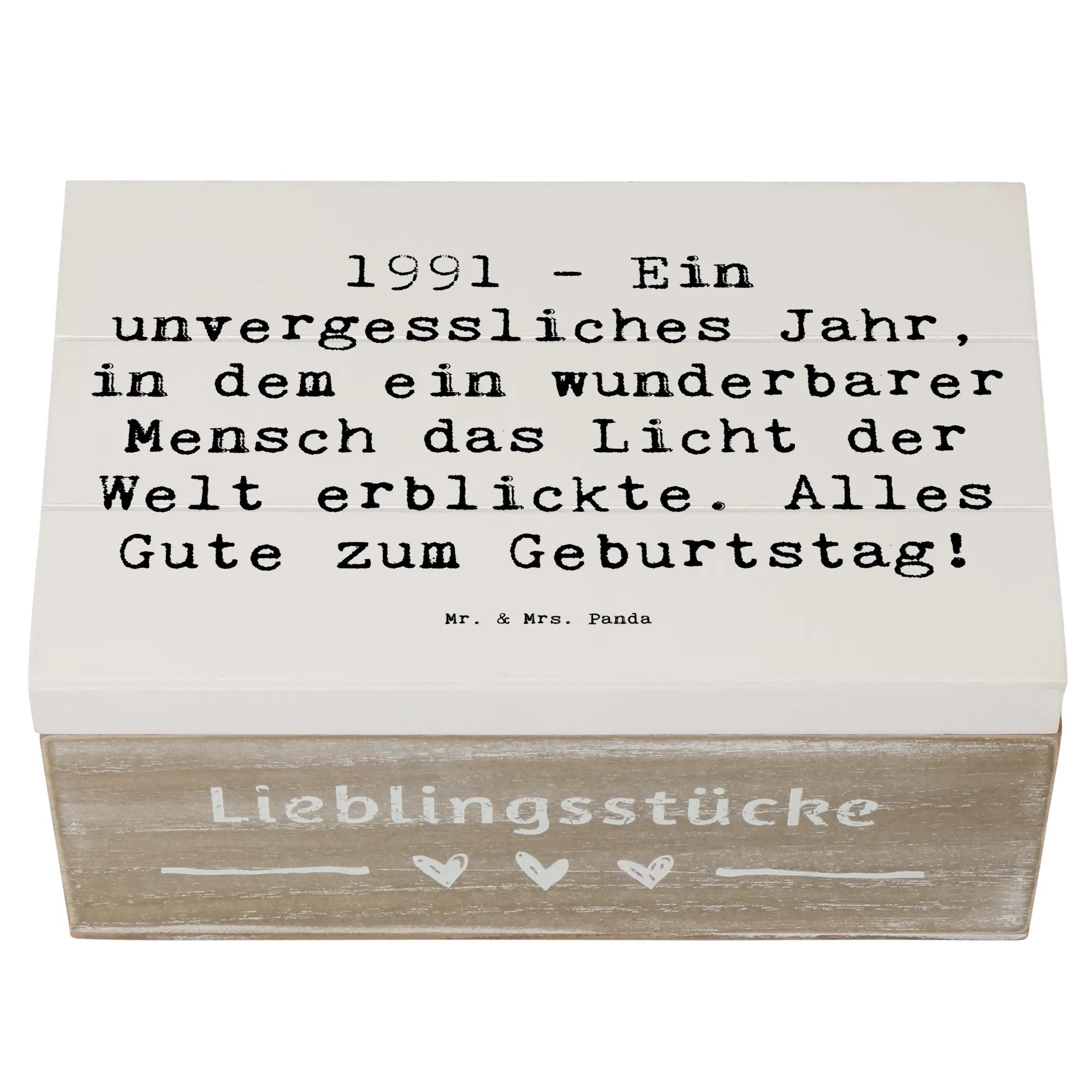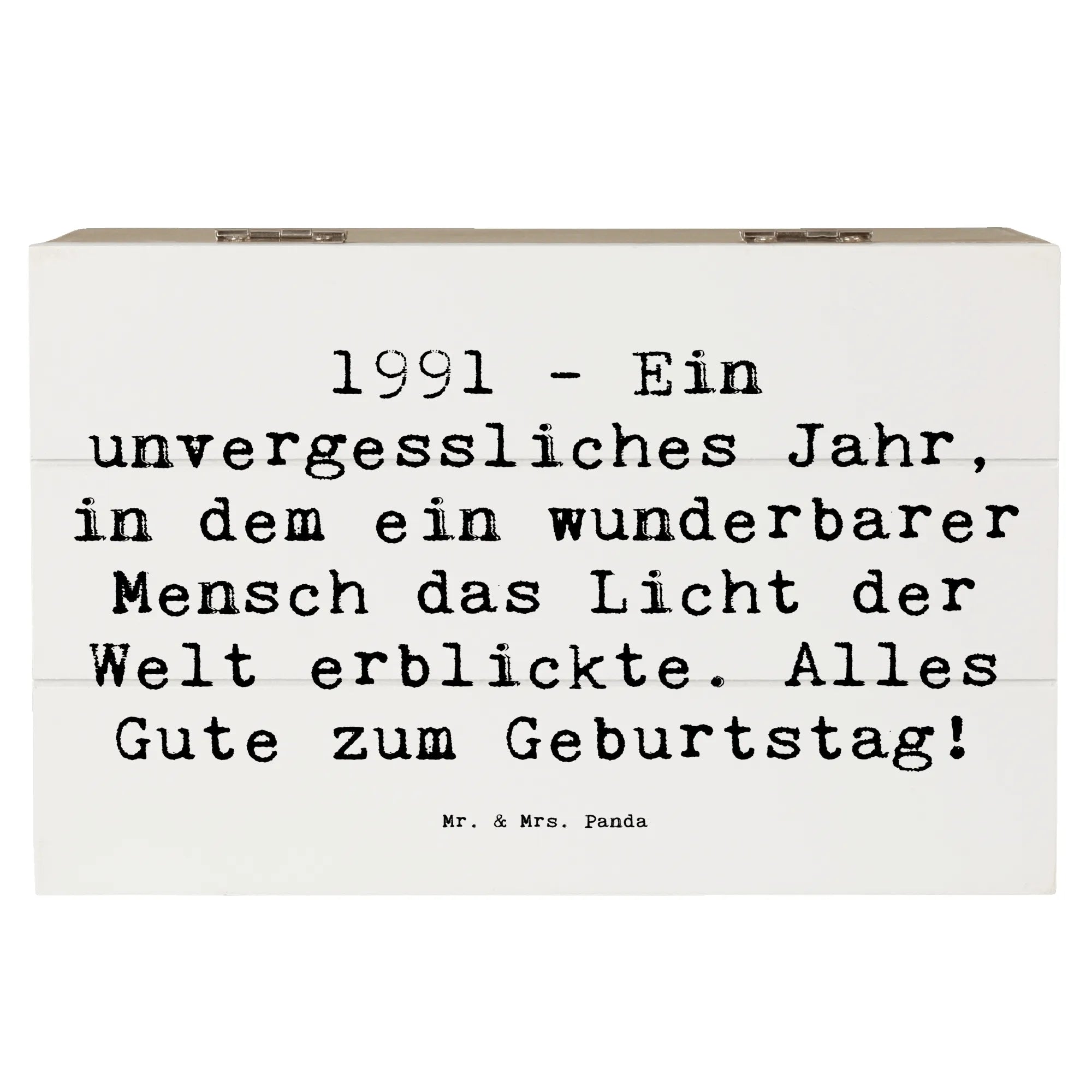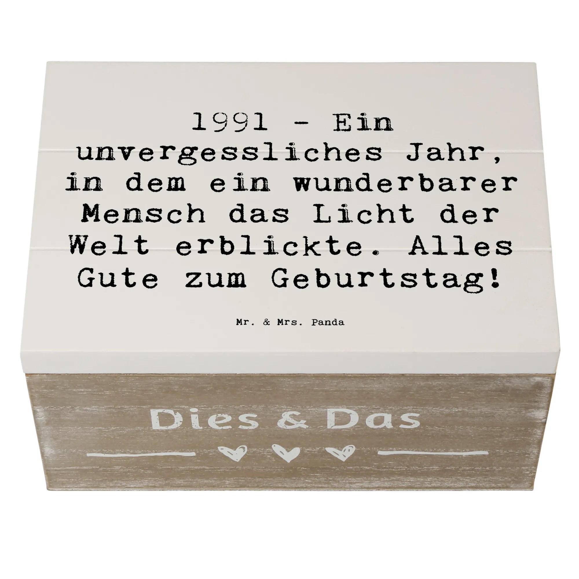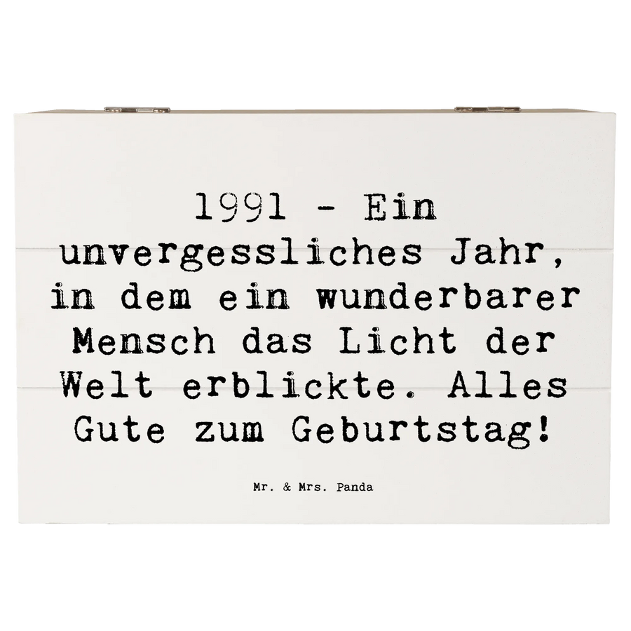 Holzkiste 1991 Geburtstag von Mr. & Mrs. Panda – die perfekte Aufbewahrungsbox für alle, die ein besonderes Geburtstagsgeschenk suchen. Diese Holzbox mit Deckel trägt den liebevollen Spruch: „1991 - Ein unvergessliches Jahr, in dem ein wunderbarer Mensch das Licht der Welt erblickte. Alles Gute zum Geburtstag!“. Sie ist ideal als Erinnerungskiste, Geschenkbox und dekorative Holztruhe.
