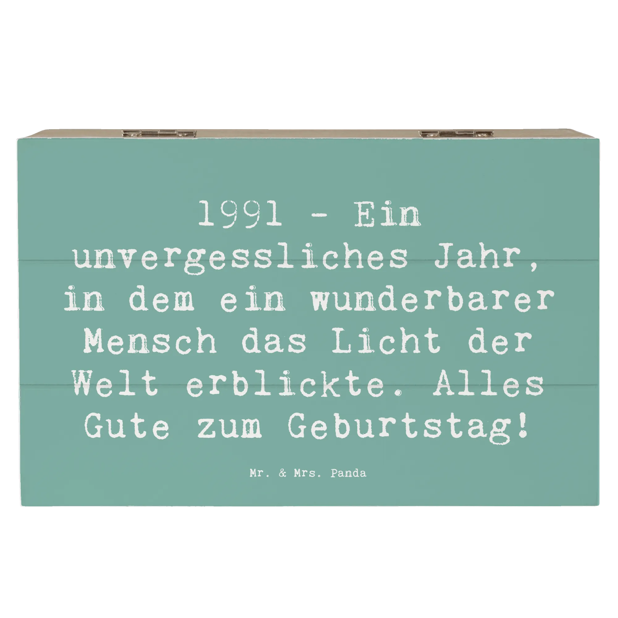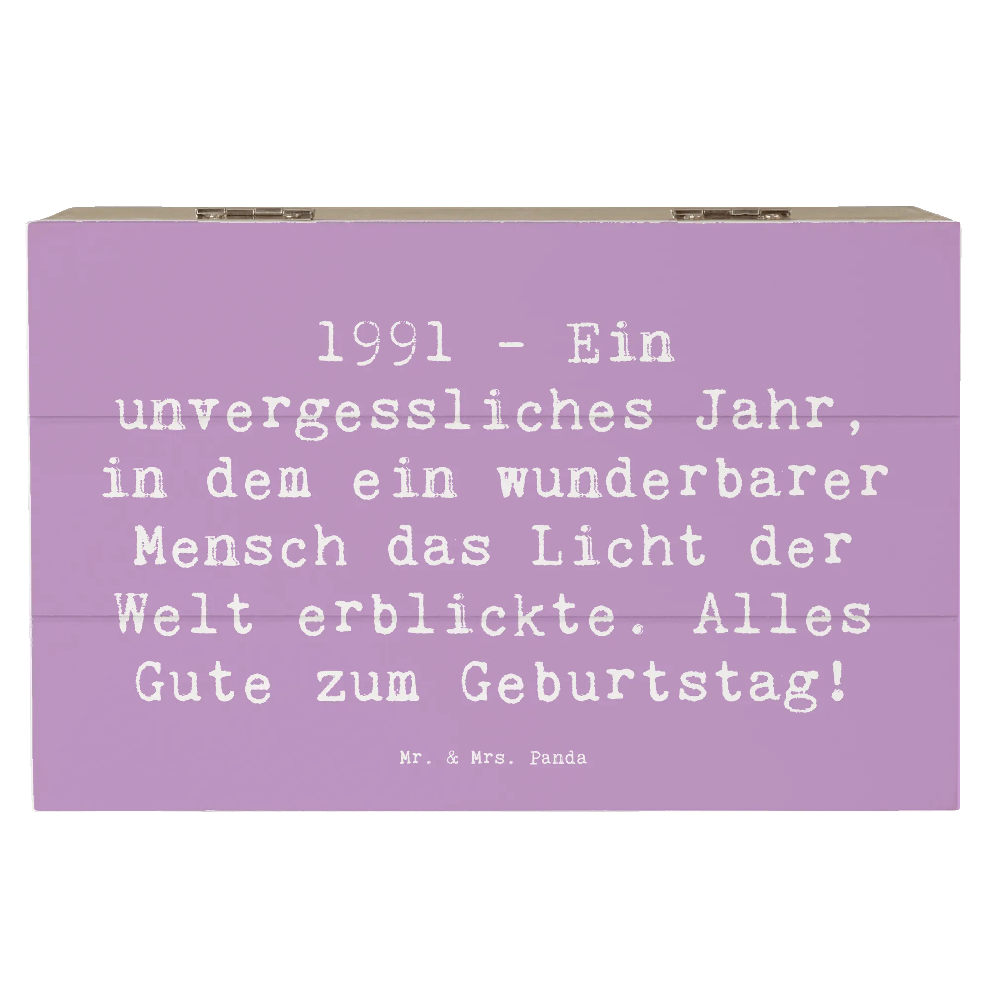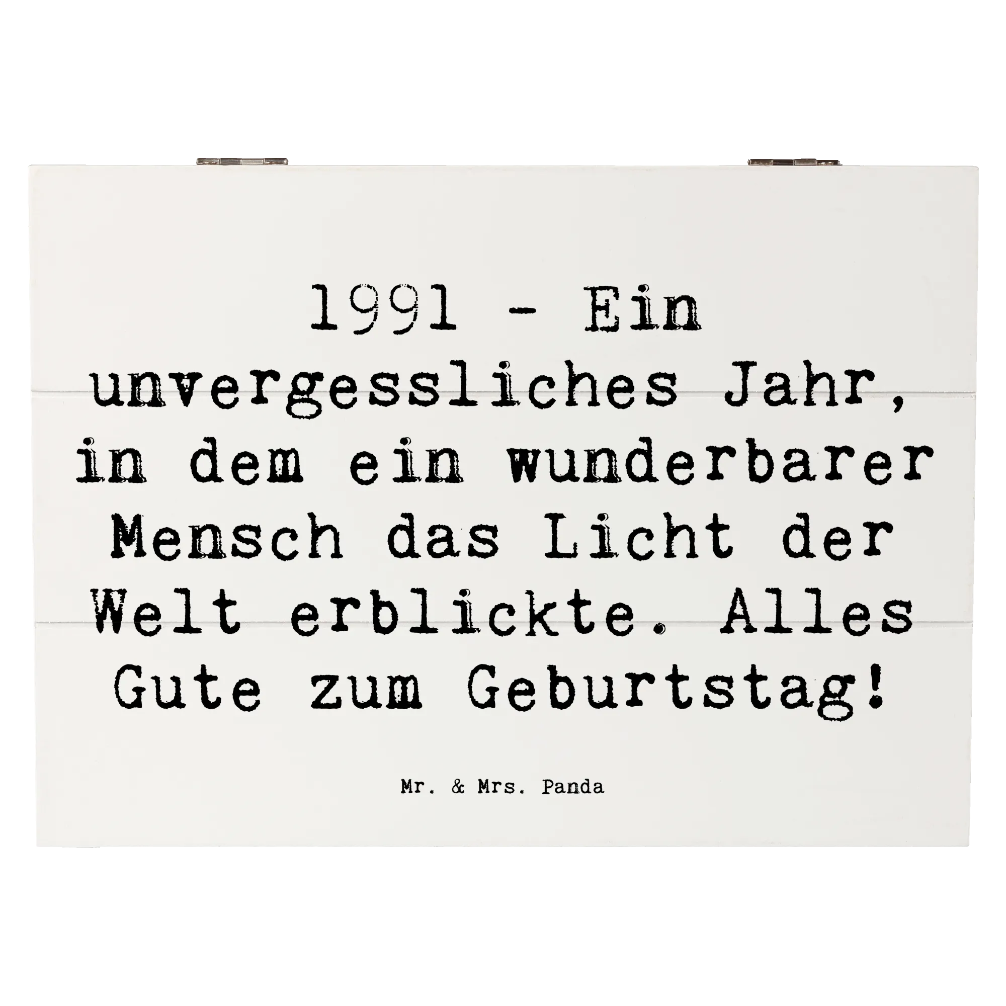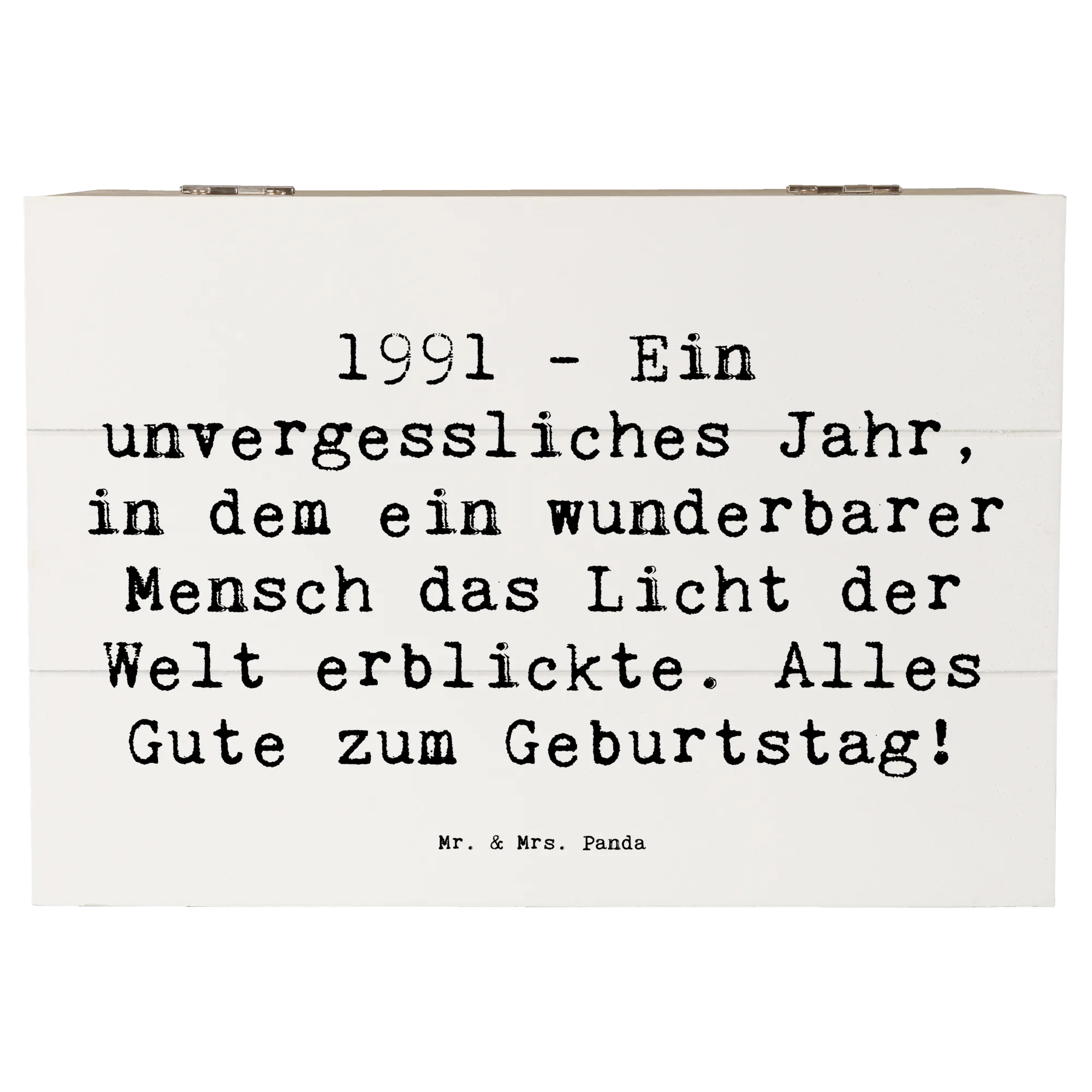 Holzkiste 1991 Geburtstag von Mr. & Mrs. Panda – die perfekte Aufbewahrungsbox für alle, die ein besonderes Geburtstagsgeschenk suchen. Diese Holzbox mit Deckel trägt den liebevollen Spruch: „1991 - Ein unvergessliches Jahr, in dem ein wunderbarer Mensch das Licht der Welt erblickte. Alles Gute zum Geburtstag!“. Sie ist ideal als Erinnerungskiste, Geschenkbox und dekorative Holztruhe.