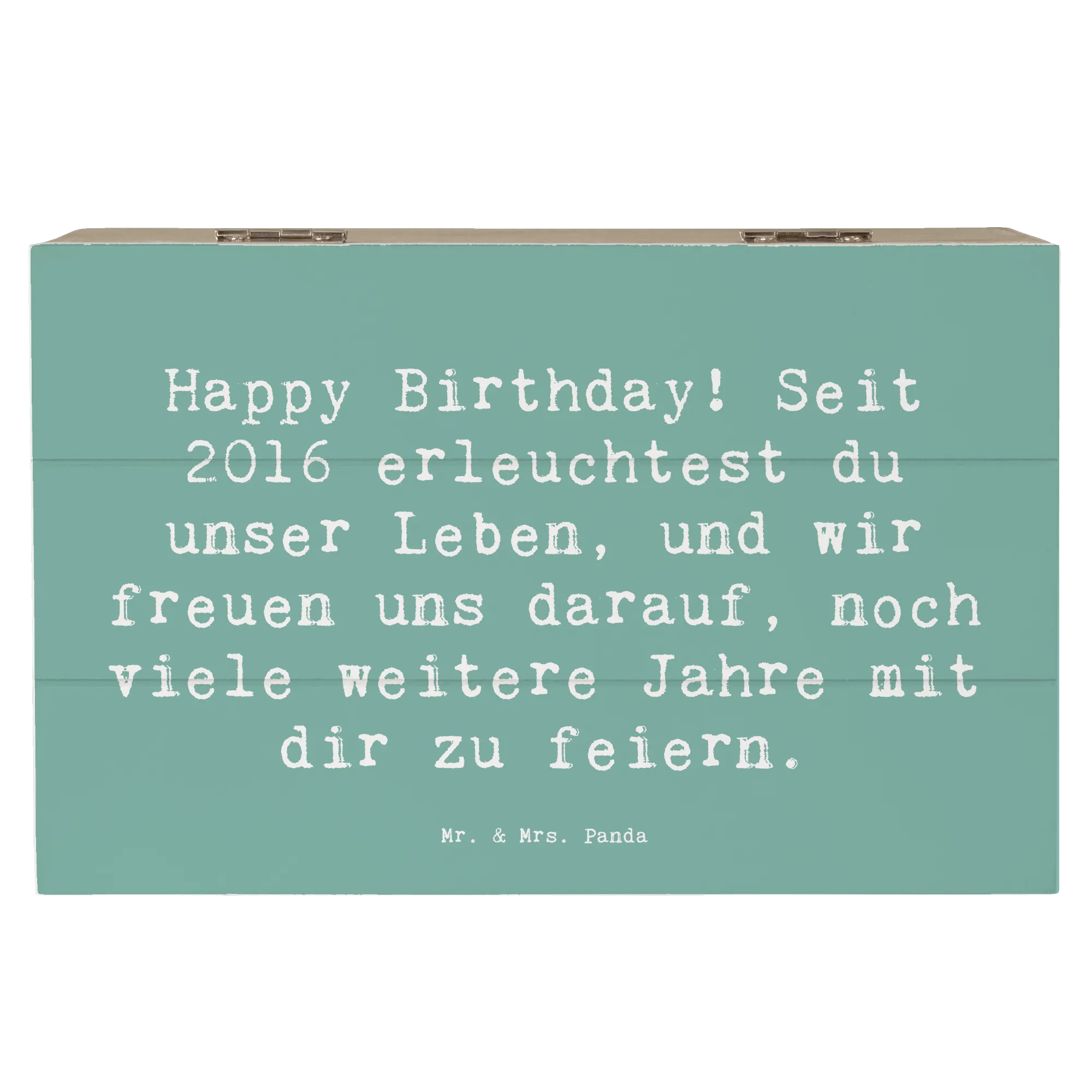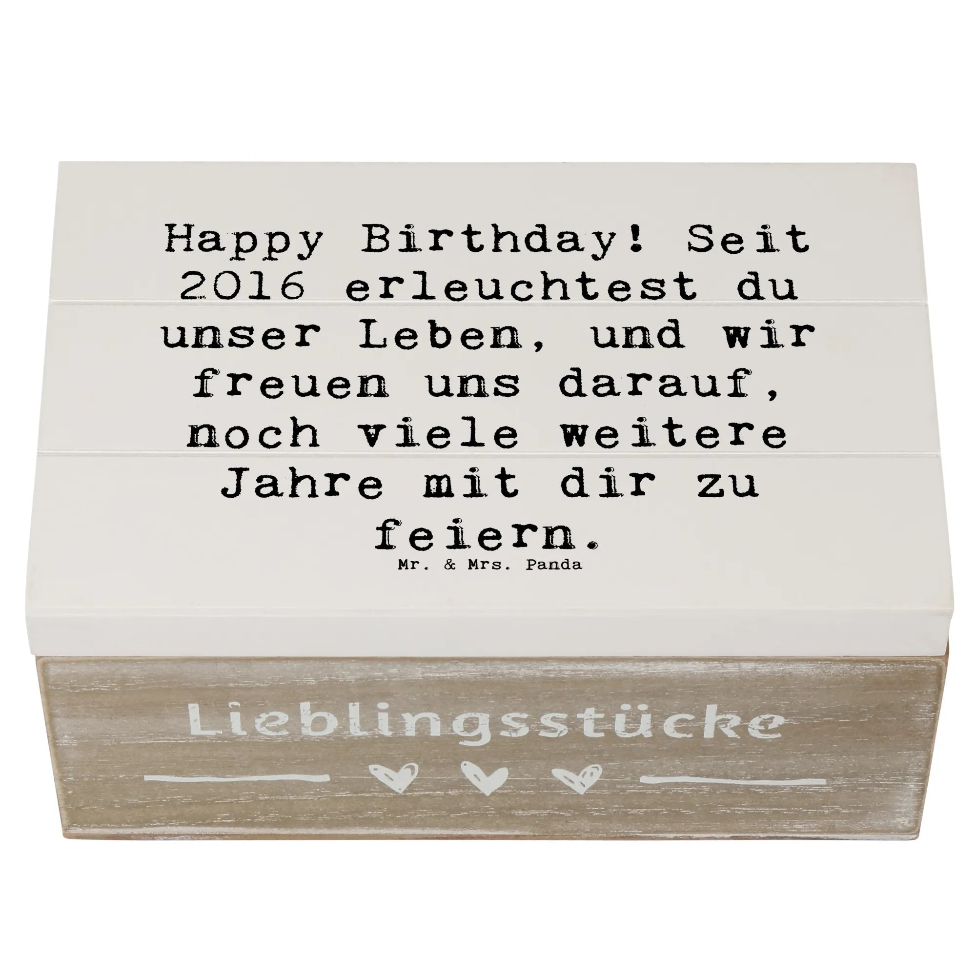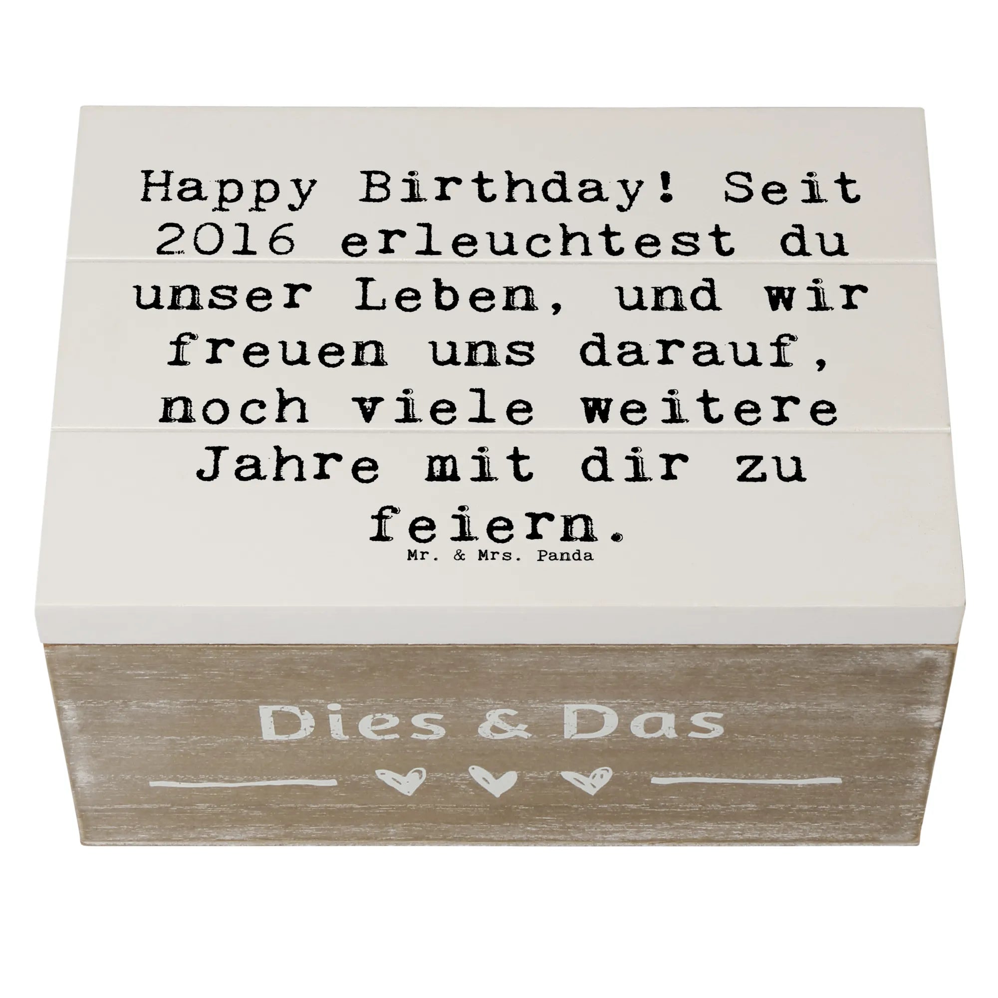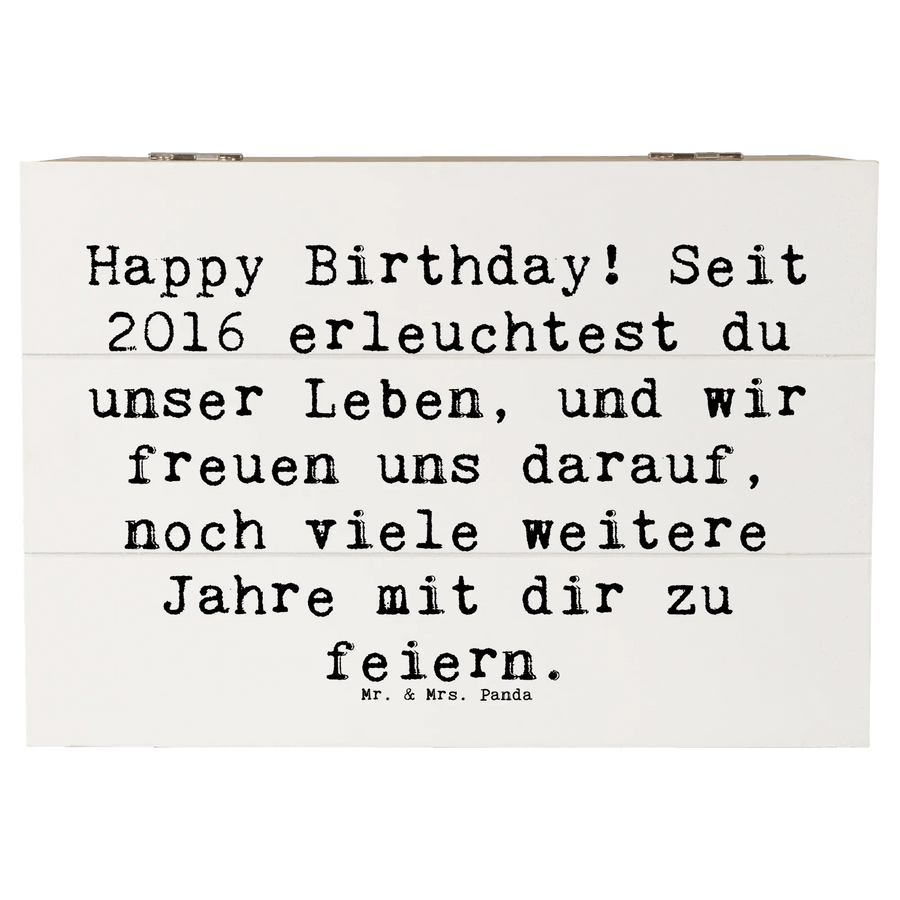 Diese zauberhafte Holzbox von Mr. & Mrs. Panda ist das ideale Geschenk für alle, die Erinnerungen liebevoll bewahren wollen. Auf dem Deckel steht der herzliche Spruch: „Happy Birthday! Seit 2016 erleuchtest du unser Leben, und wir freuen uns darauf, noch viele weitere Jahre mit dir zu feiern.“ – ein liebevoller Gruß, der als Erinnerungskiste fürs Geburtstagskind sofort ins Herz trifft.