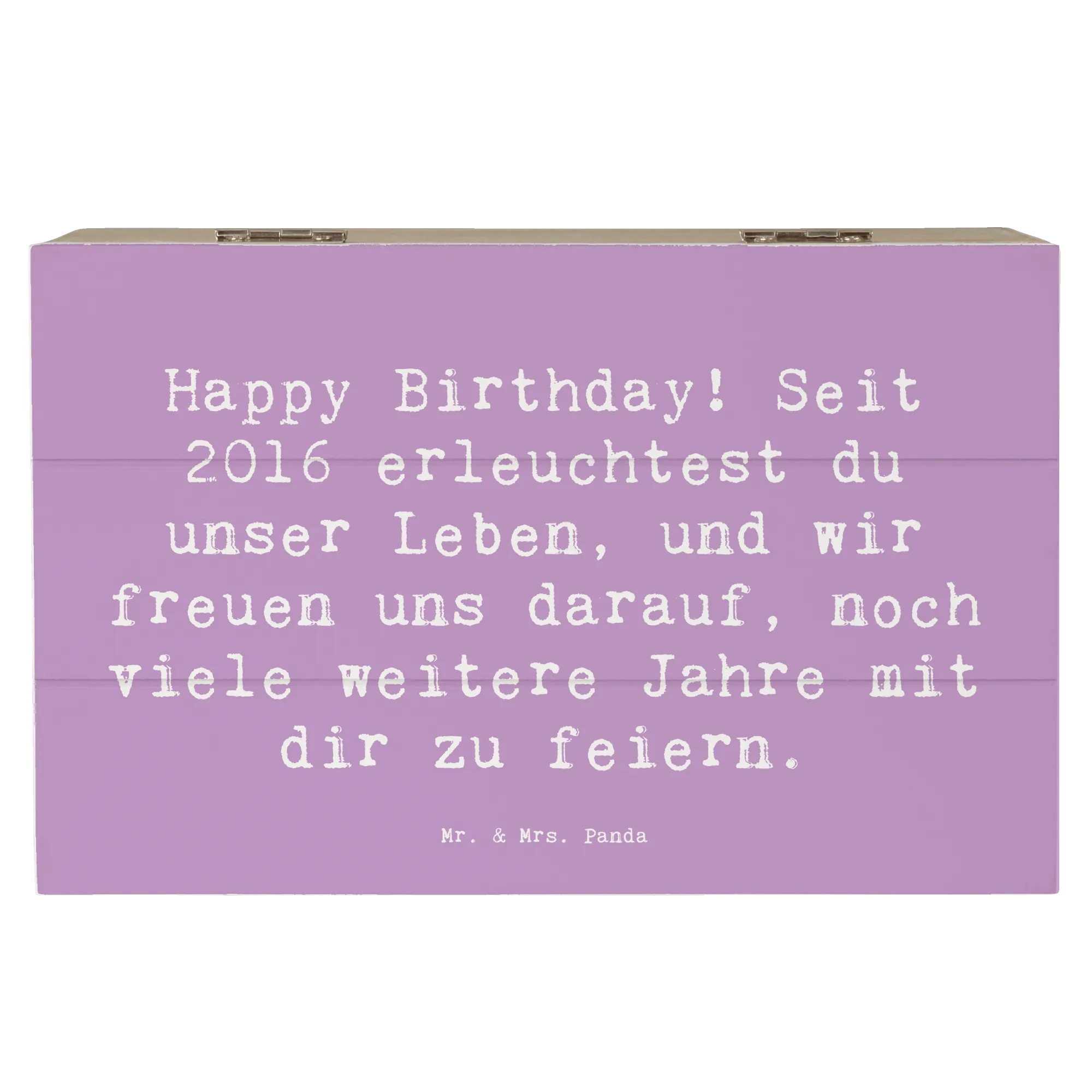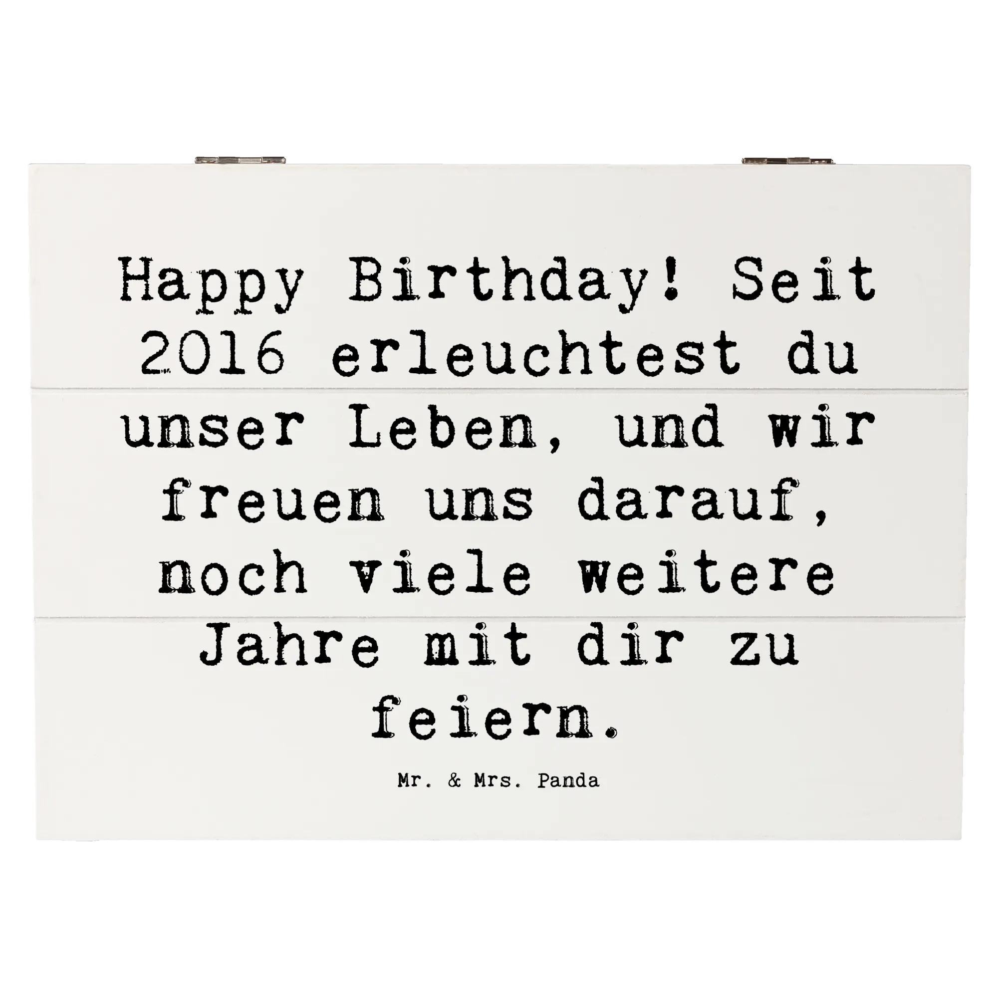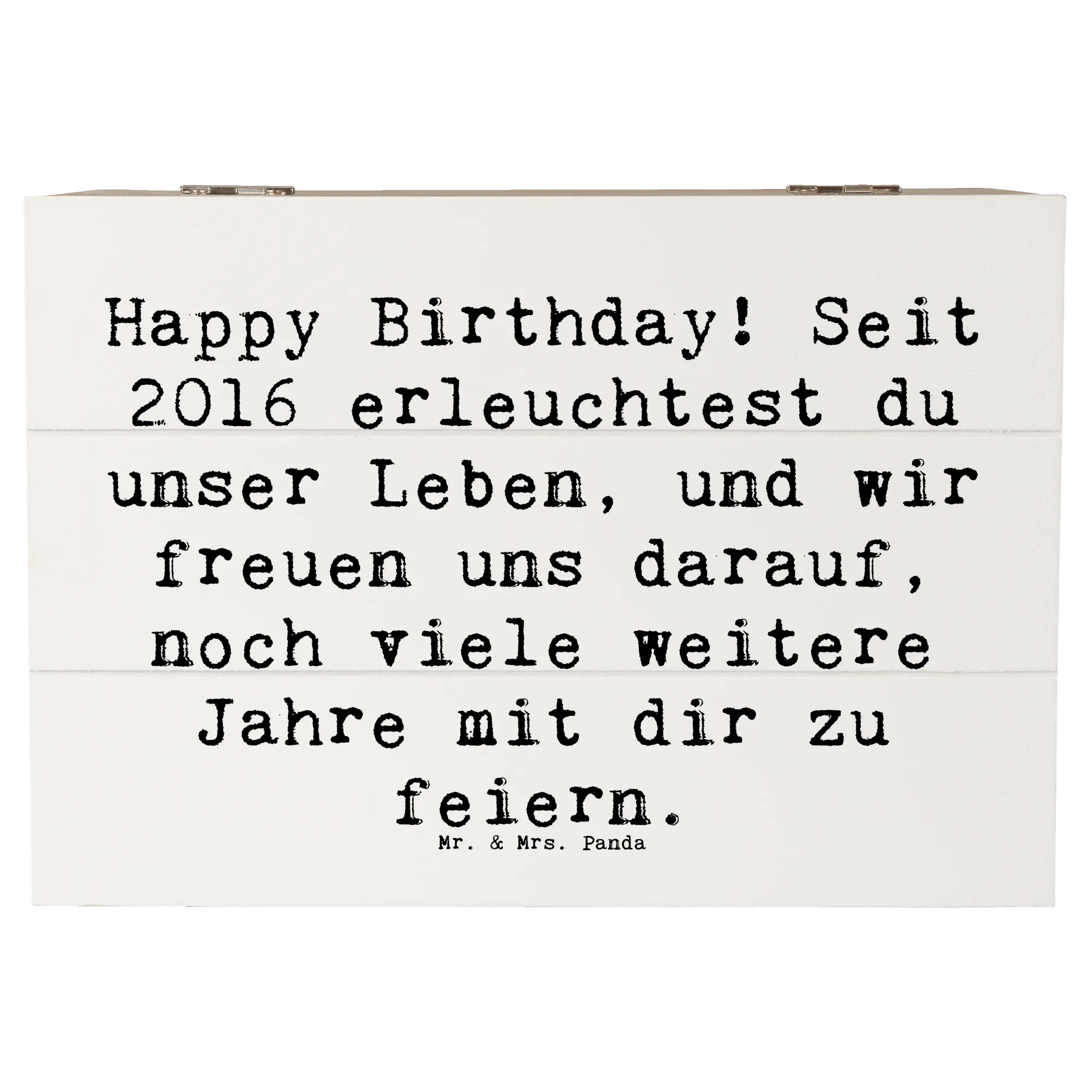 Diese zauberhafte Holzbox von Mr. & Mrs. Panda ist das ideale Geschenk für alle, die Erinnerungen liebevoll bewahren wollen. Auf dem Deckel steht der herzliche Spruch: „Happy Birthday! Seit 2016 erleuchtest du unser Leben, und wir freuen uns darauf, noch viele weitere Jahre mit dir zu feiern.“ – ein liebevoller Gruß, der als Erinnerungskiste fürs Geburtstagskind sofort ins Herz trifft.