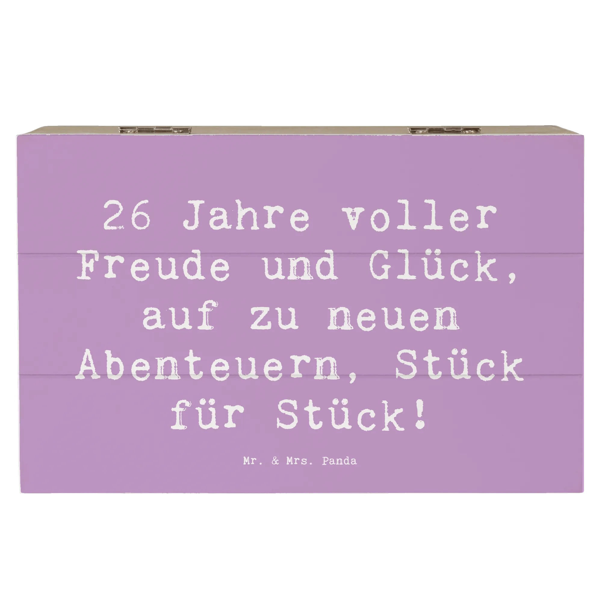 Die Holzkiste von Mr. & Mrs. Panda ist der perfekte Begleiter für den 26. Geburtstag! Mit dem zauberhaften Spruch "26 Jahre voller Freude und Glück, auf zu neuen Abenteuern, Stück für Stück!" wird diese wunderschöne Erinnerungskiste zu einem ganz besonderen Geschenk.