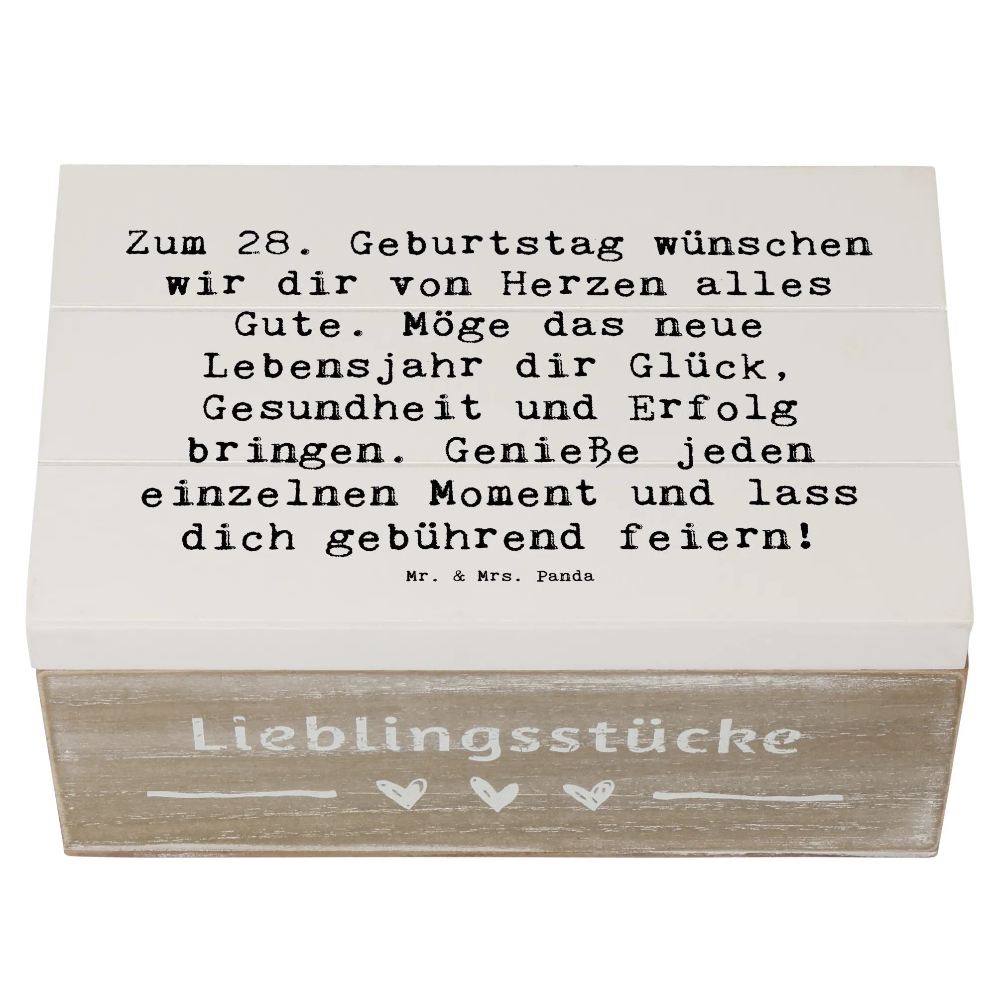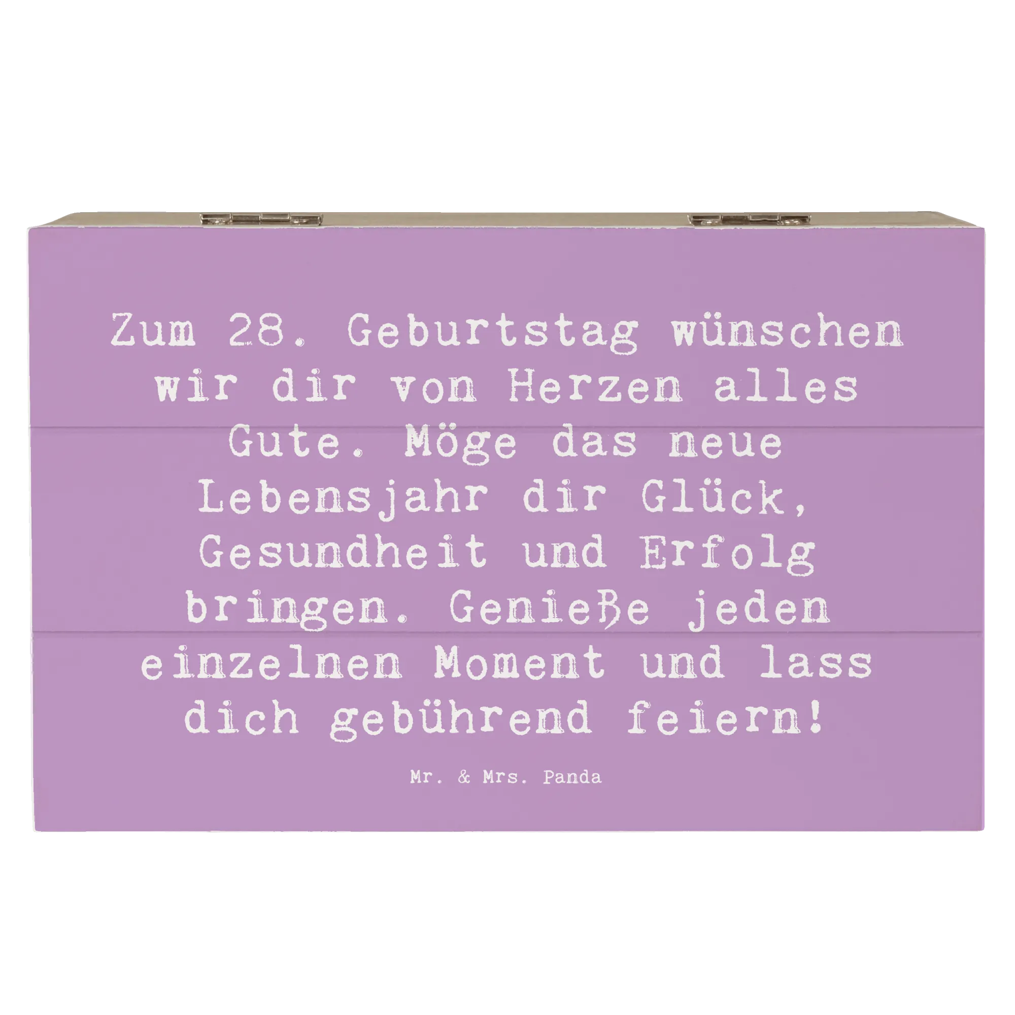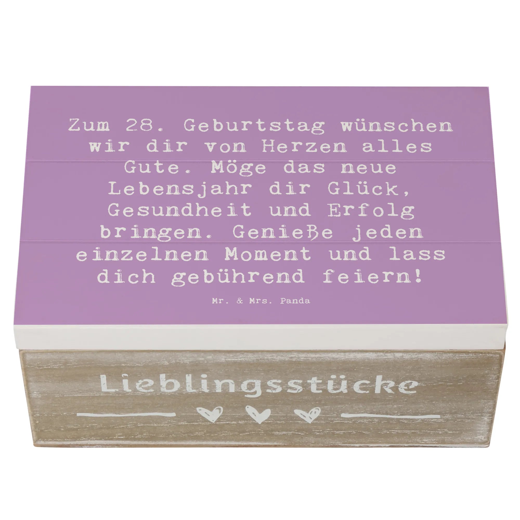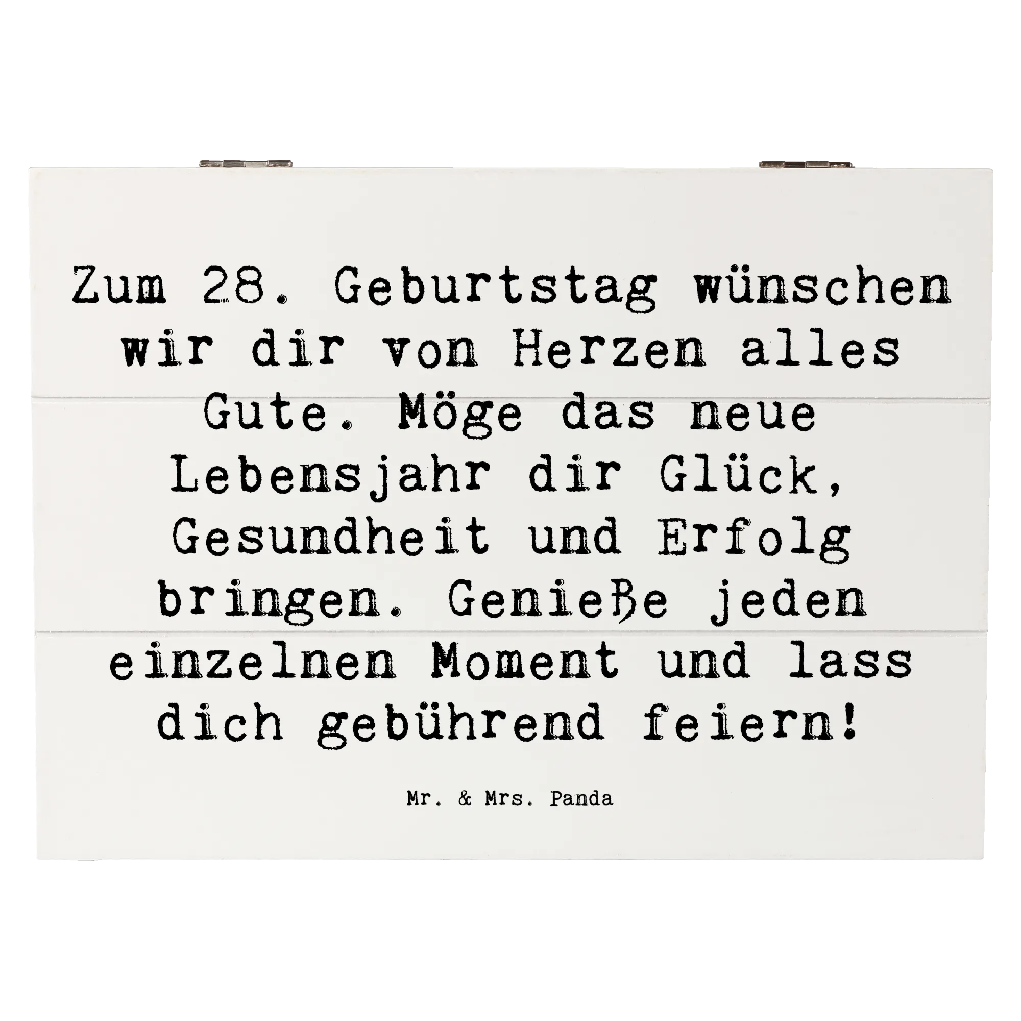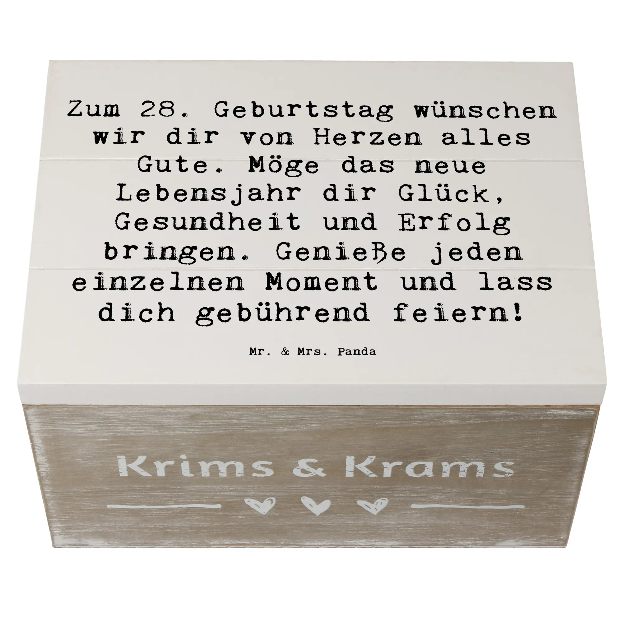 Du suchst nach dem perfekten Geschenk zum 28. Geburtstag? Dann ist diese wunderschöne Holzkiste von Mr. & Mrs. Panda genau das Richtige! Die Erinnerungskiste ist nicht nur ein stilvoller Aufbewahrungsort für all die kleinen Schätze, die man im Leben ansammelt, sondern auch eine liebevolle Geste, die Freude bereitet. Mit dem liebevollen Spruch "Zum 28. Geburtstag wünschen wir dir von Herzen alles Gute. Möge das neue Lebensjahr dir Glück, Gesundheit und Erfolg bringen. Genieße jeden einzelnen Moment und lass dich gebührend feiern!" wird der besondere Tag unvergesslich gemacht.
