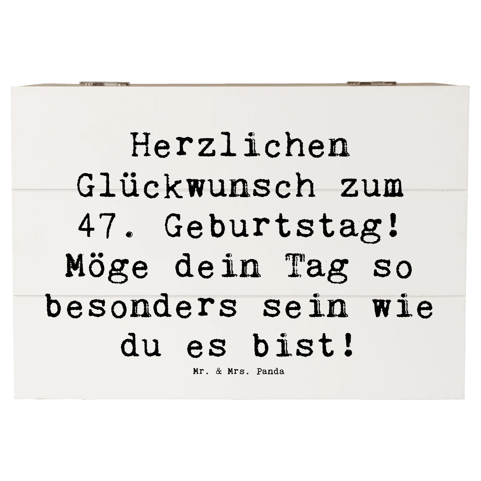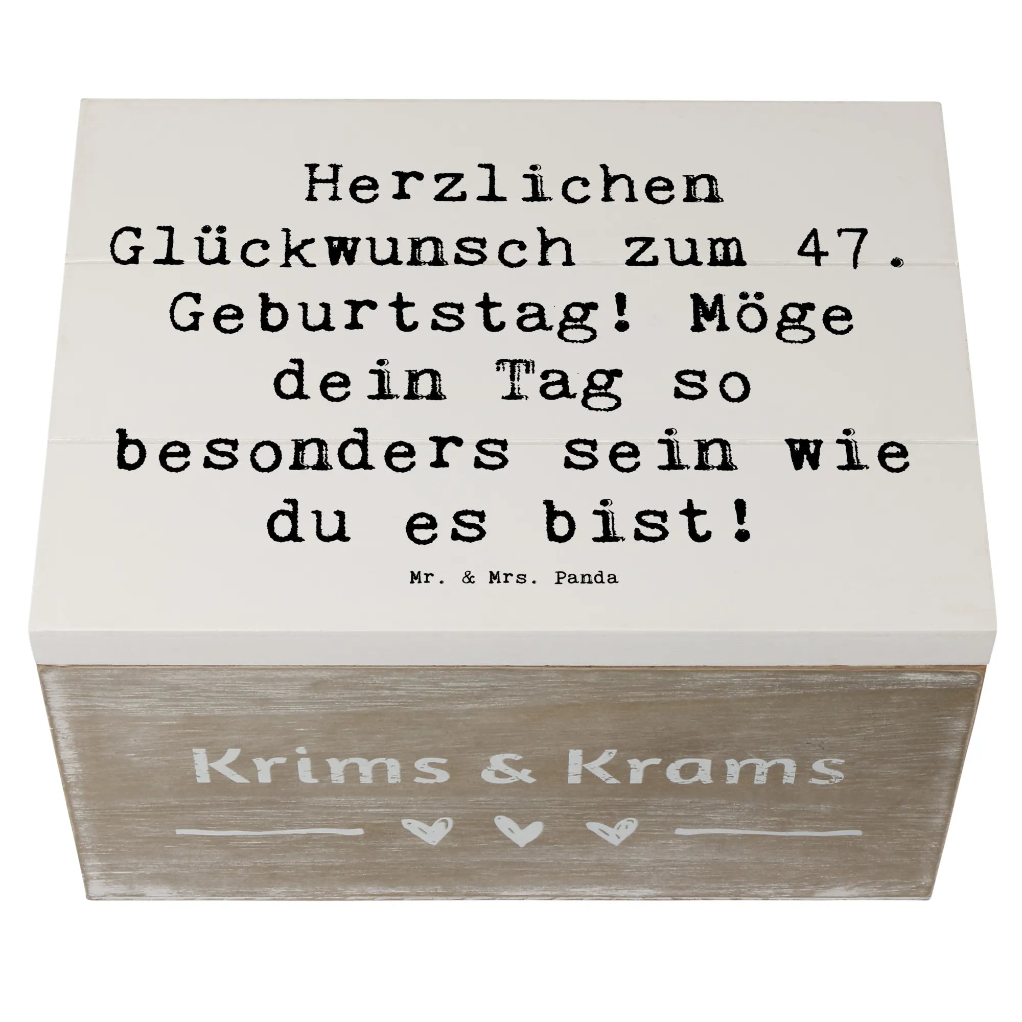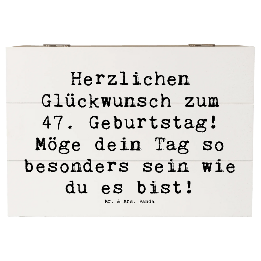 Wenn du auf der Suche nach dem perfekten Geschenk zum 47. Geburtstag bist, dann ist die wunderschöne Holzkiste von Mr. & Mrs. Panda genau das richtige! Mit ihrem liebevollen Design und dem herzlichen Spruch "Herzlichen Glückwunsch zum 47. Geburtstag! Möge dein Tag so besonders sein wie du es bist!" wird dieses Geschenk garantiert zum Hingucker.
