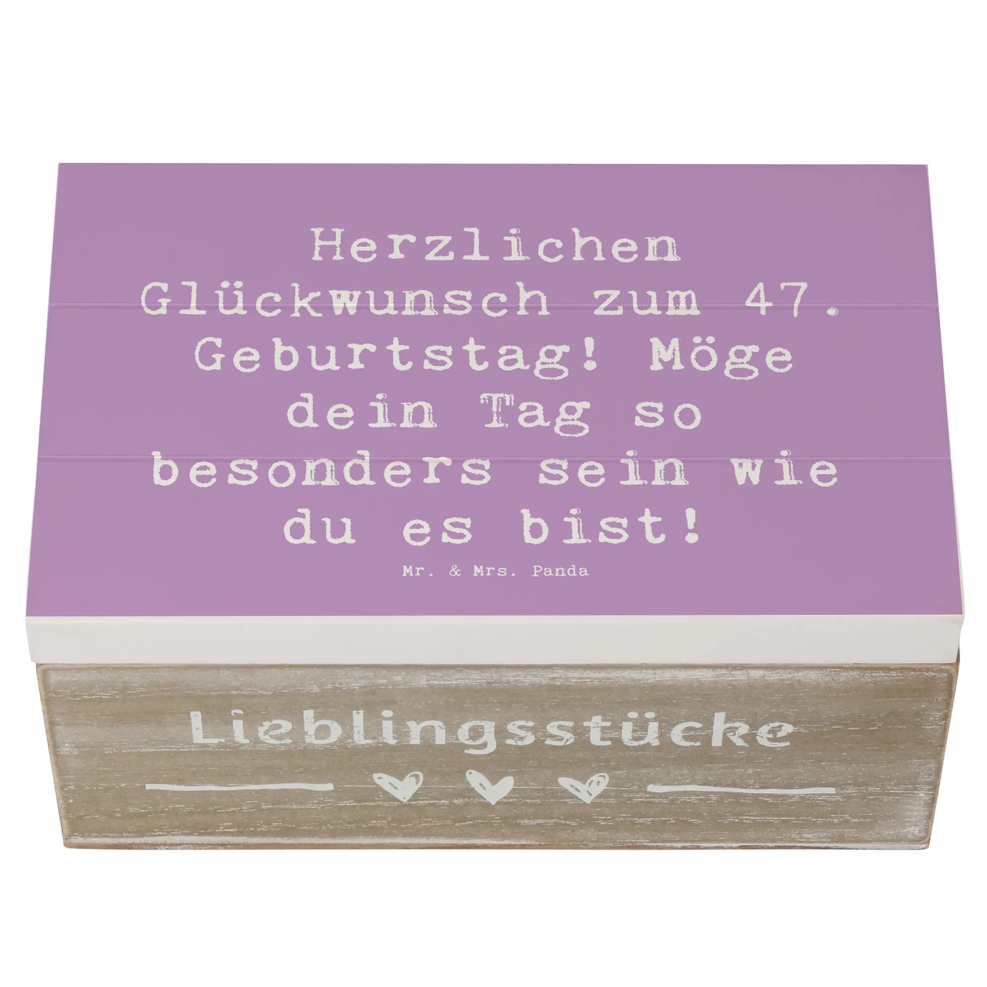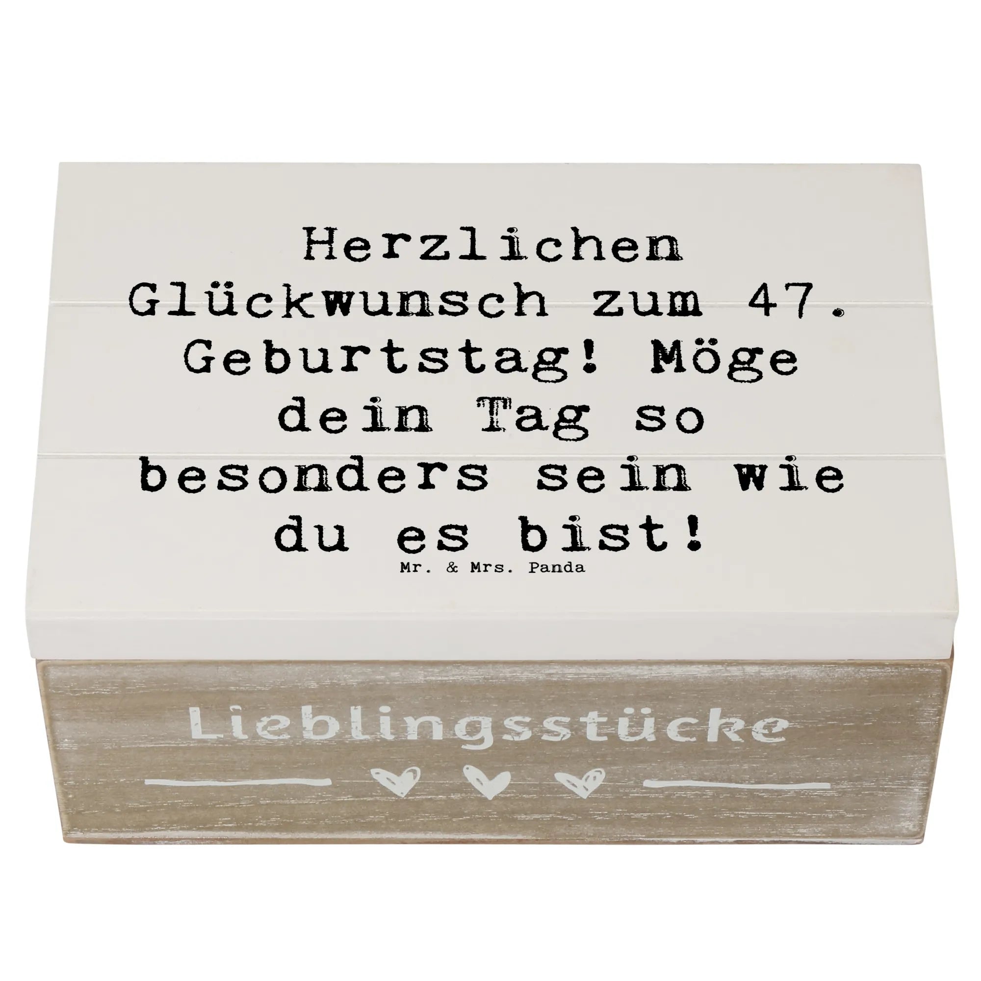 Entdecke die wunderschöne Holzkiste "Herzlichen Glückwunsch zum 47. Geburtstag! Möge dein Tag so besonders sein wie du es bist!" von Mr. & Mrs. Panda. Diese zauberhafte Erinnerungskiste ist ein absolut ideales Geschenk für alle, die ihren besonderen Tag gebührend feiern möchten! Sie wurde speziell für den 47. Geburtstag entworfen und bietet nicht nur einen Platz für wundervolle Schätze, sondern auch einen liebevollen Spruch, der Wärme und Freude verbreitet.