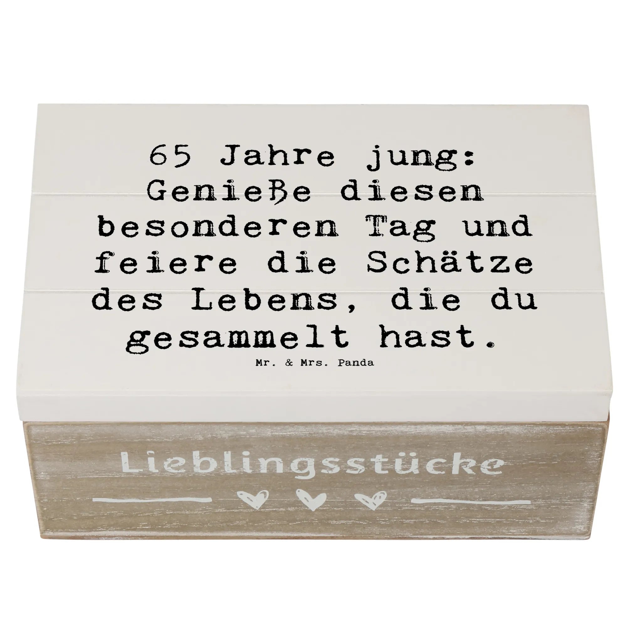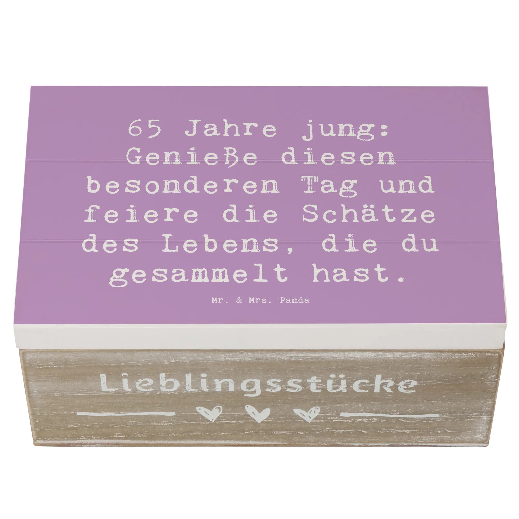 Die wunderschöne Holzkiste von Mr. & Mrs. Panda mit dem aufgedruckten Slogan "65 Jahre jung: Genieße diesen besonderen Tag und feiere die Schätze des Lebens, die du gesammelt hast." ist das ideale Geschenk für alle, die ihren 65. Geburtstag gebührend zelebrieren möchten. Diese liebevoll gestaltete Erinnerungskiste bietet nicht nur Platz für Erinnerungsstücke und Schätze, sondern ist auch ein wunderbares Deko-Element.