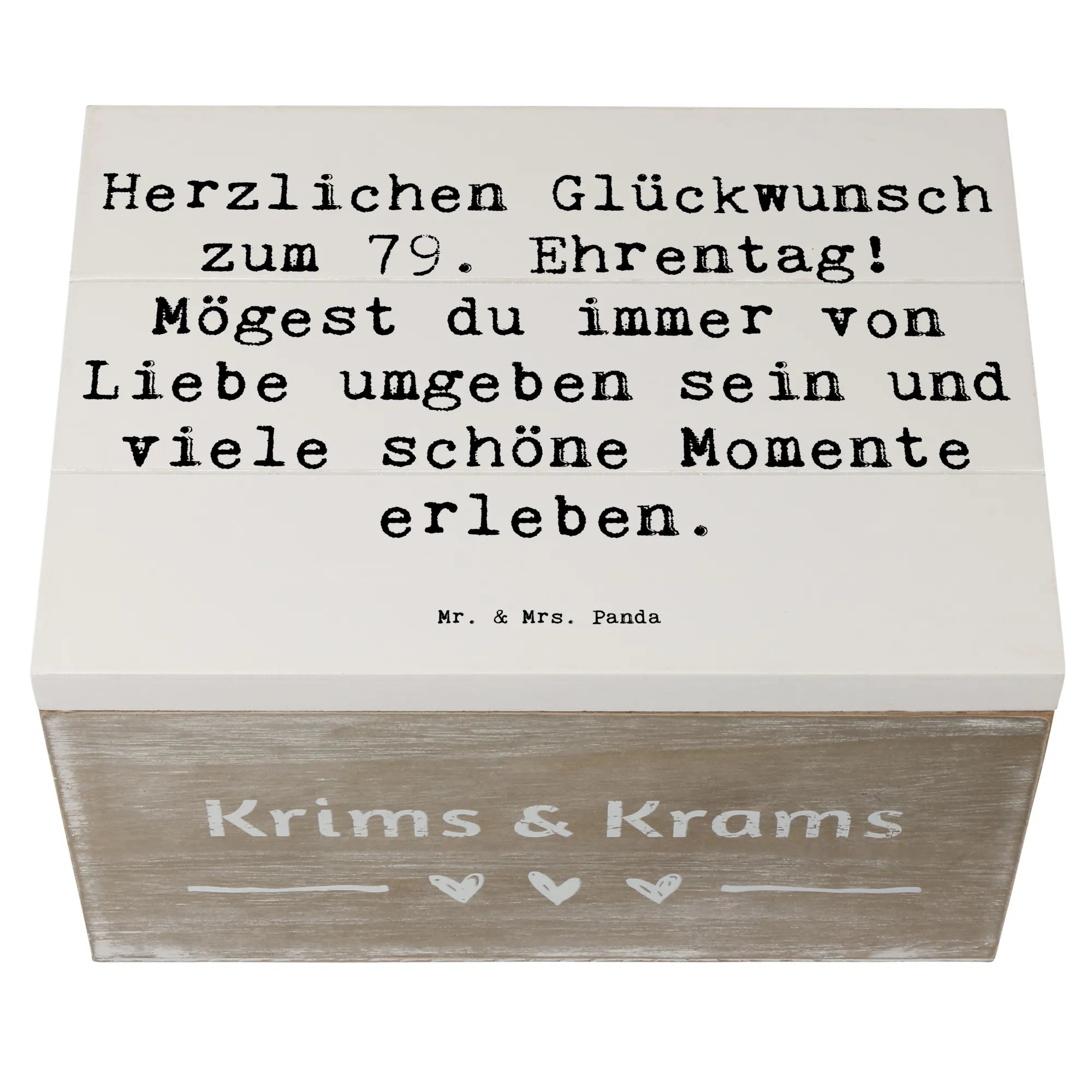 Die wunderschöne Holzkiste von Mr. & Mrs. Panda ist ein absolutes Muss für jeden, der den 79. Geburtstag gebührend feiern möchte! Diese besondere Erinnerungskiste, bedruckt mit dem liebevollen Slogan "Herzlichen Glückwunsch zum 79. Ehrentag! Mögest du immer von Liebe umgeben sein und viele schöne Momente erleben.", ist der perfekte Aufbewahrungsort für all deine wertvollen Schätze – sei es ein Foto, eine Erinnerungsnotiz oder kleine Geschenke.