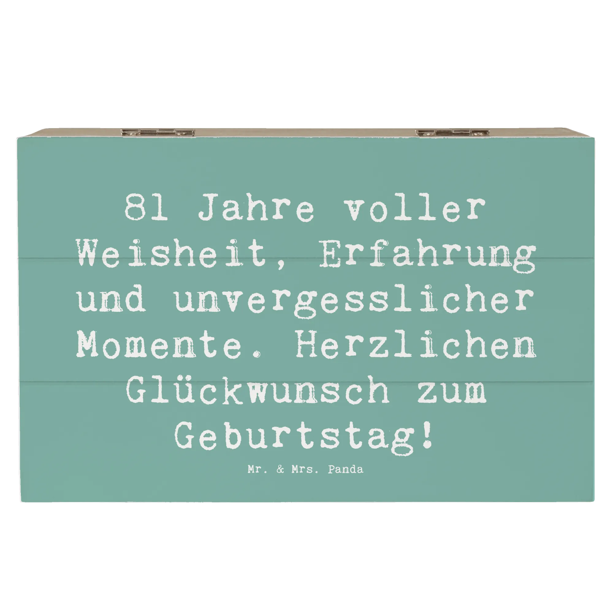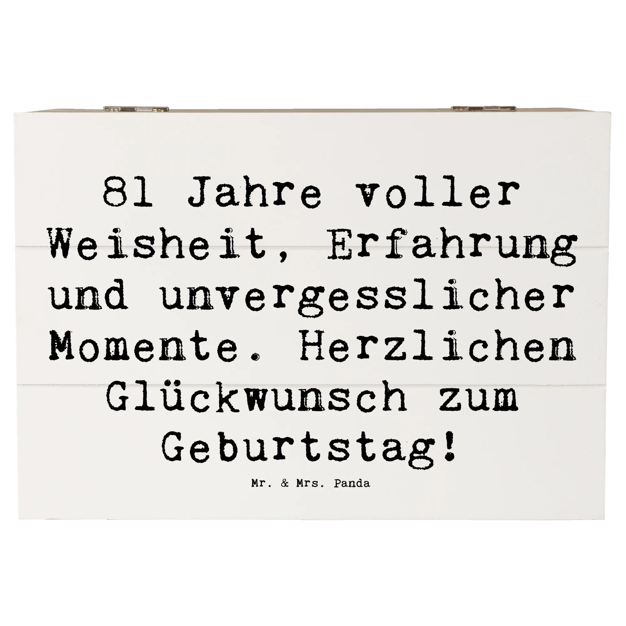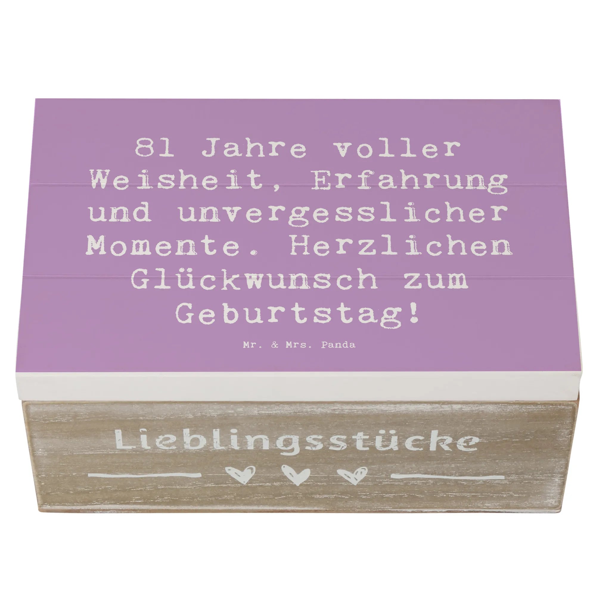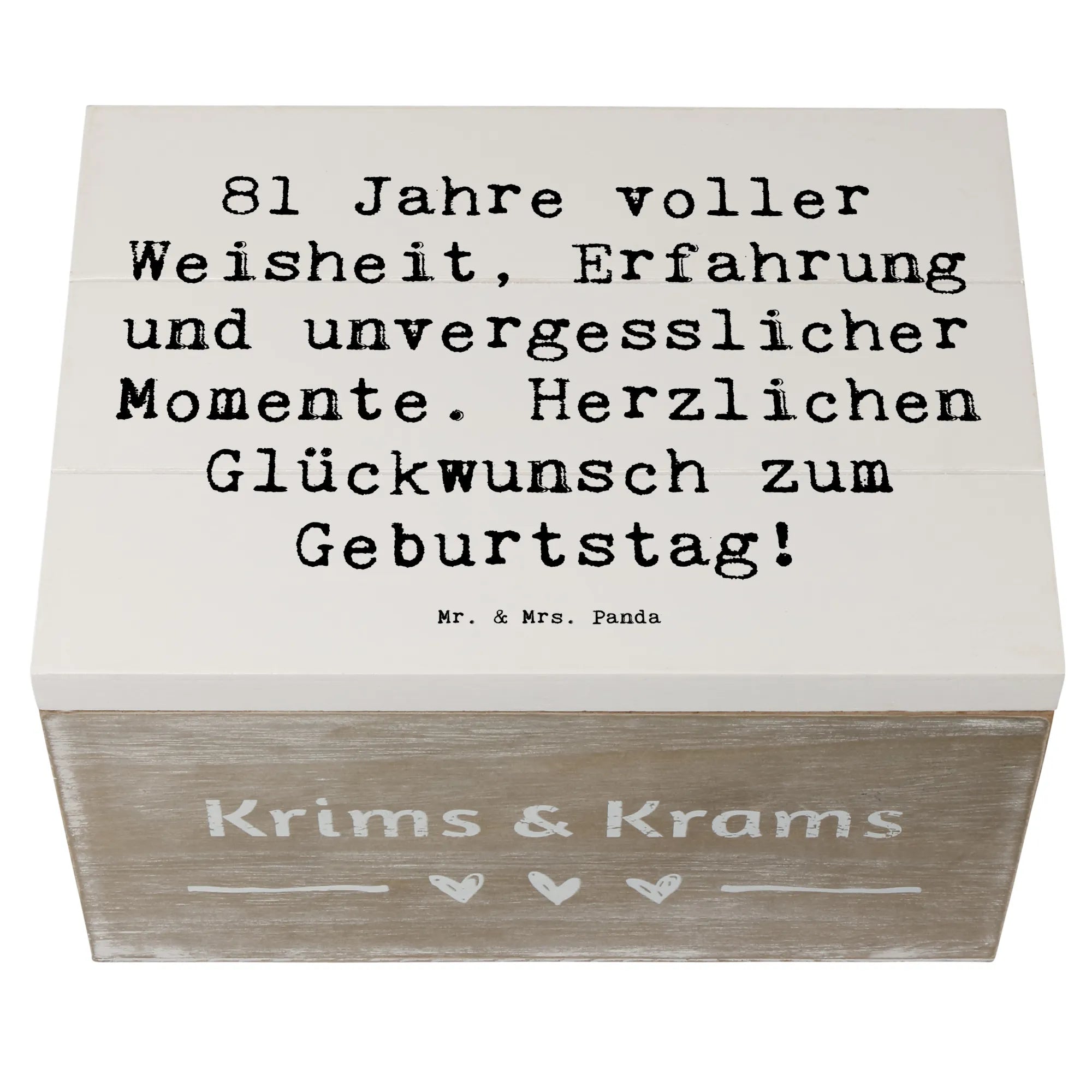 Die Holzkiste ist bedruckt mit dem Motto "81 Jahre voller Weisheit, Erfahrung und unvergesslicher Momente. Herzlichen Glückwunsch zum Geburtstag!" - ein perfekter Spruch, um die Lebensreise zu feiern und Erinnerungen wachzuhalten.