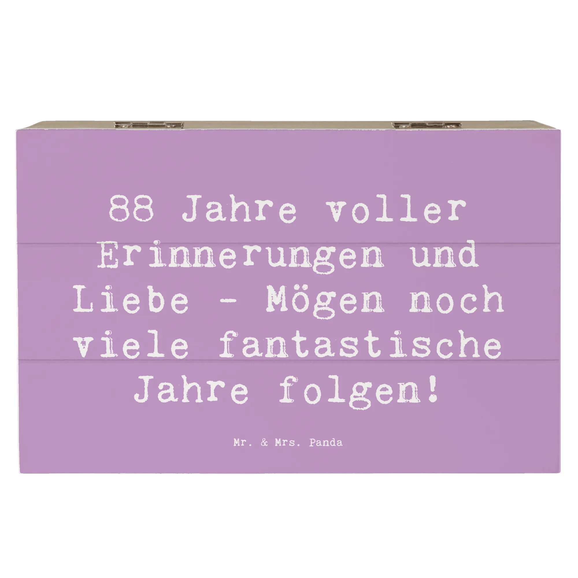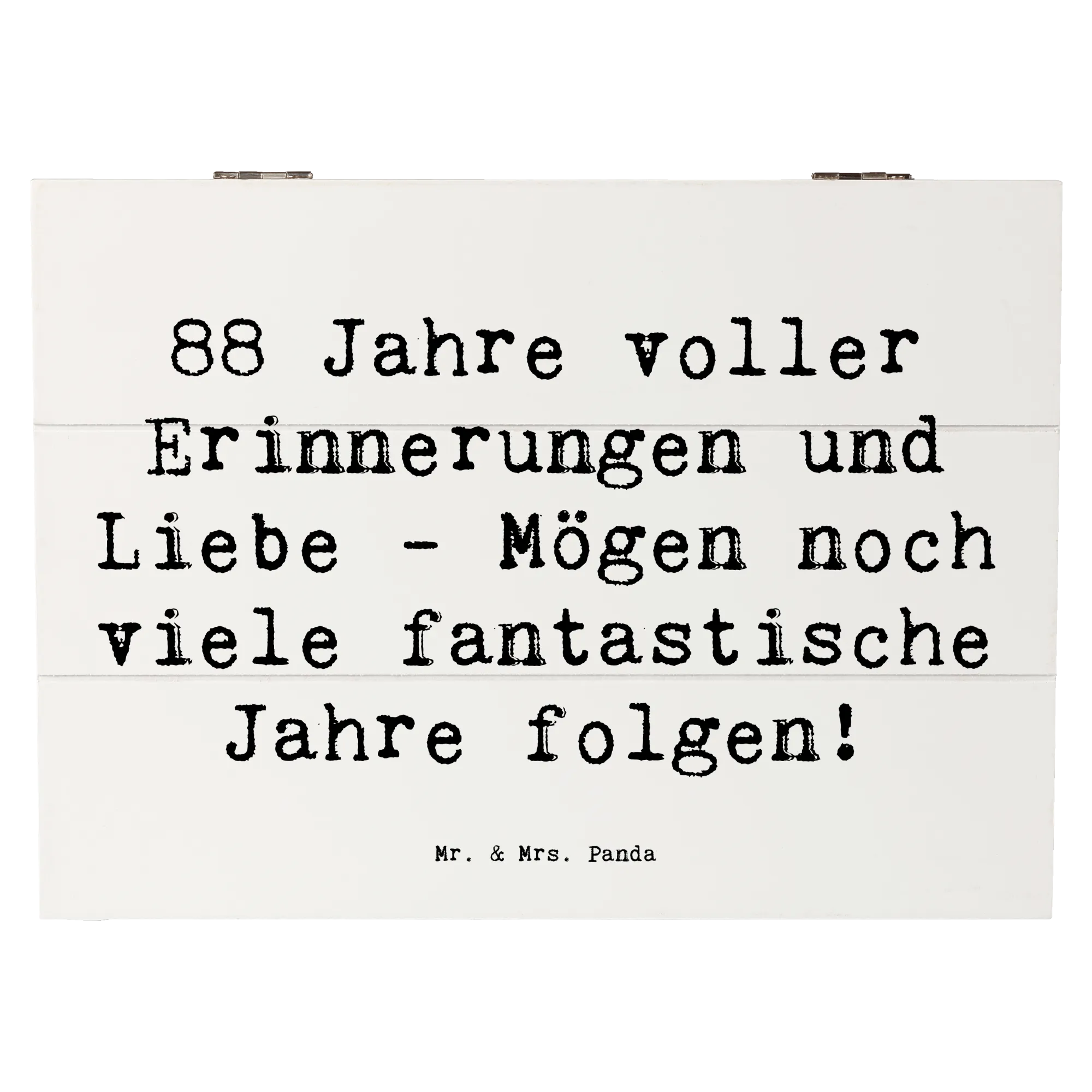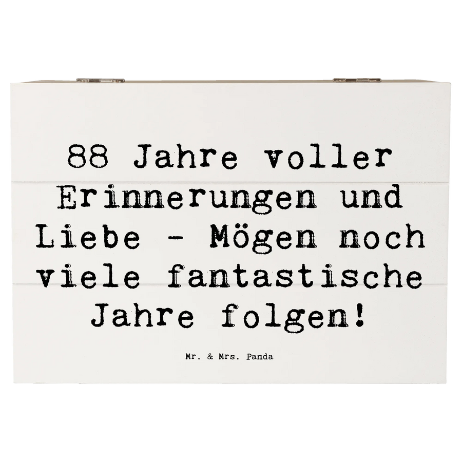 Feierliche Anlässe brauchen besondere Geschenke, und unsere wunderschöne Holzkiste zum 88. Geburtstag von Mr. & Mrs. Panda ist das perfekte Präsent für diesen ganz besonderen Tag! Mit dem liebevollen Slogan "88 Jahre voller Erinnerungen und Liebe - Mögen noch viele fantastische Jahre folgen!" wird diese Kiste zum idealen Aufbewahrungsort für die wertvollsten Schätze und Erinnerungen. Egal, ob es sich um Fotos, kleine Andenken oder bedeutende Erinnerungsstücke handelt – diese Kiste bietet den perfekten Platz, um alles zu bewahren.