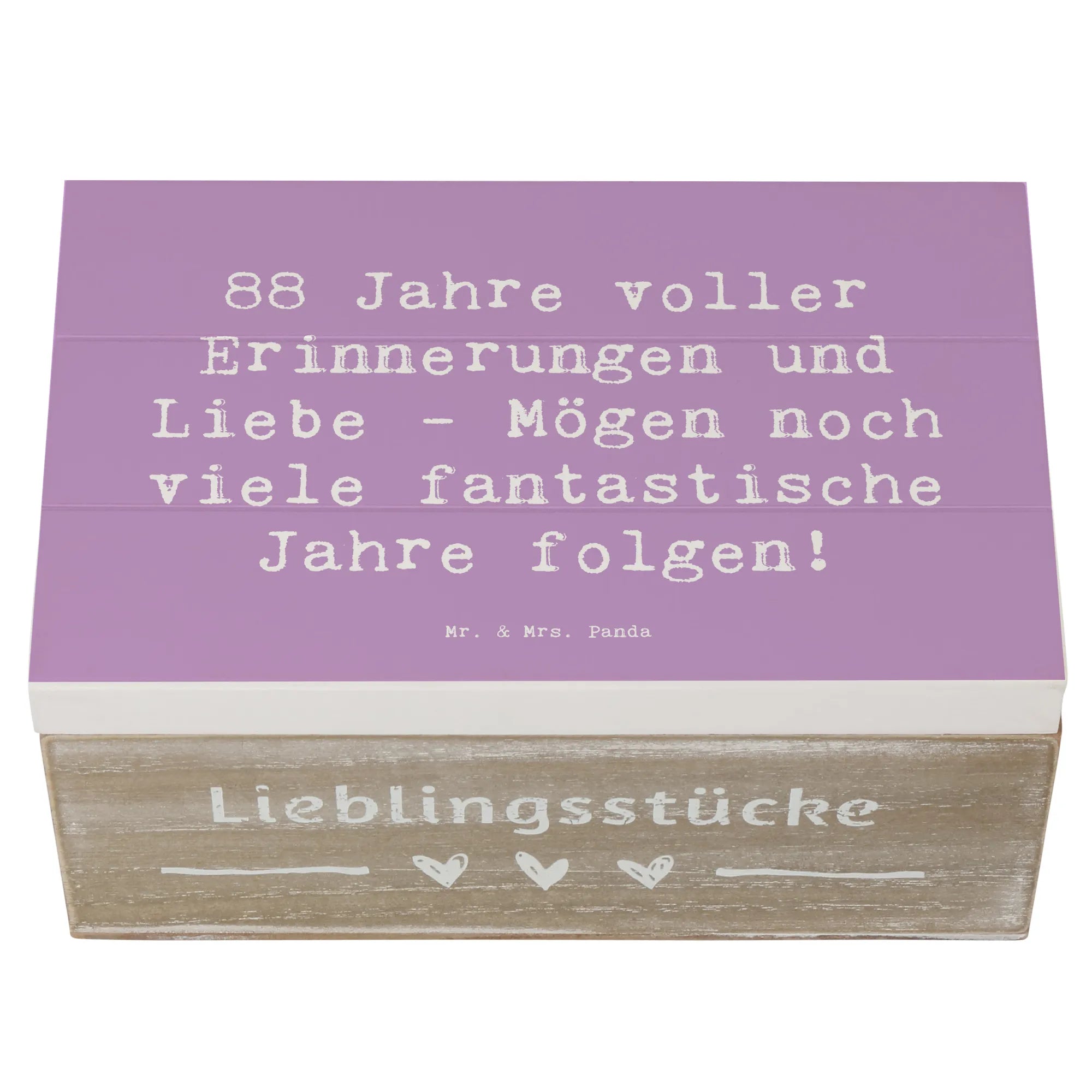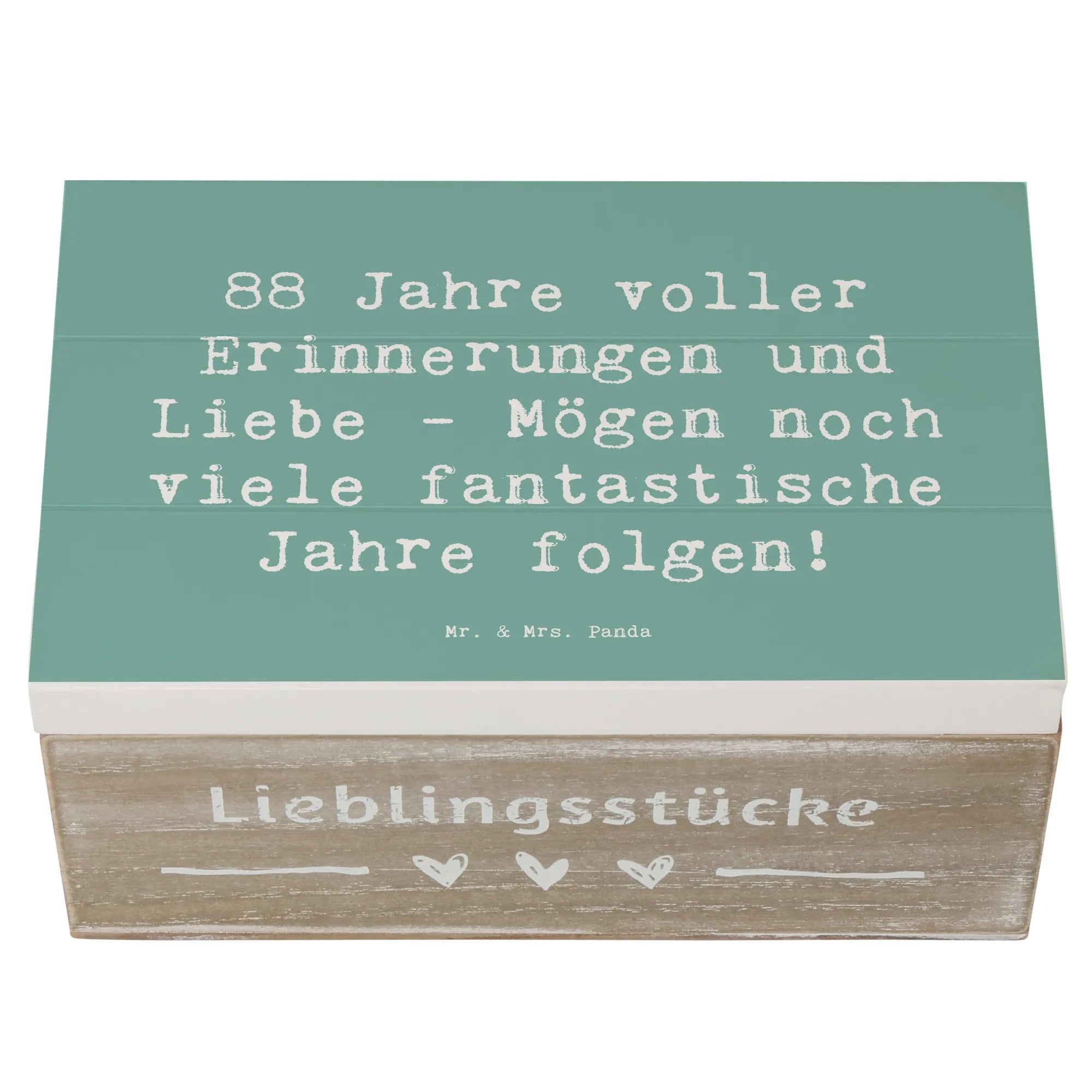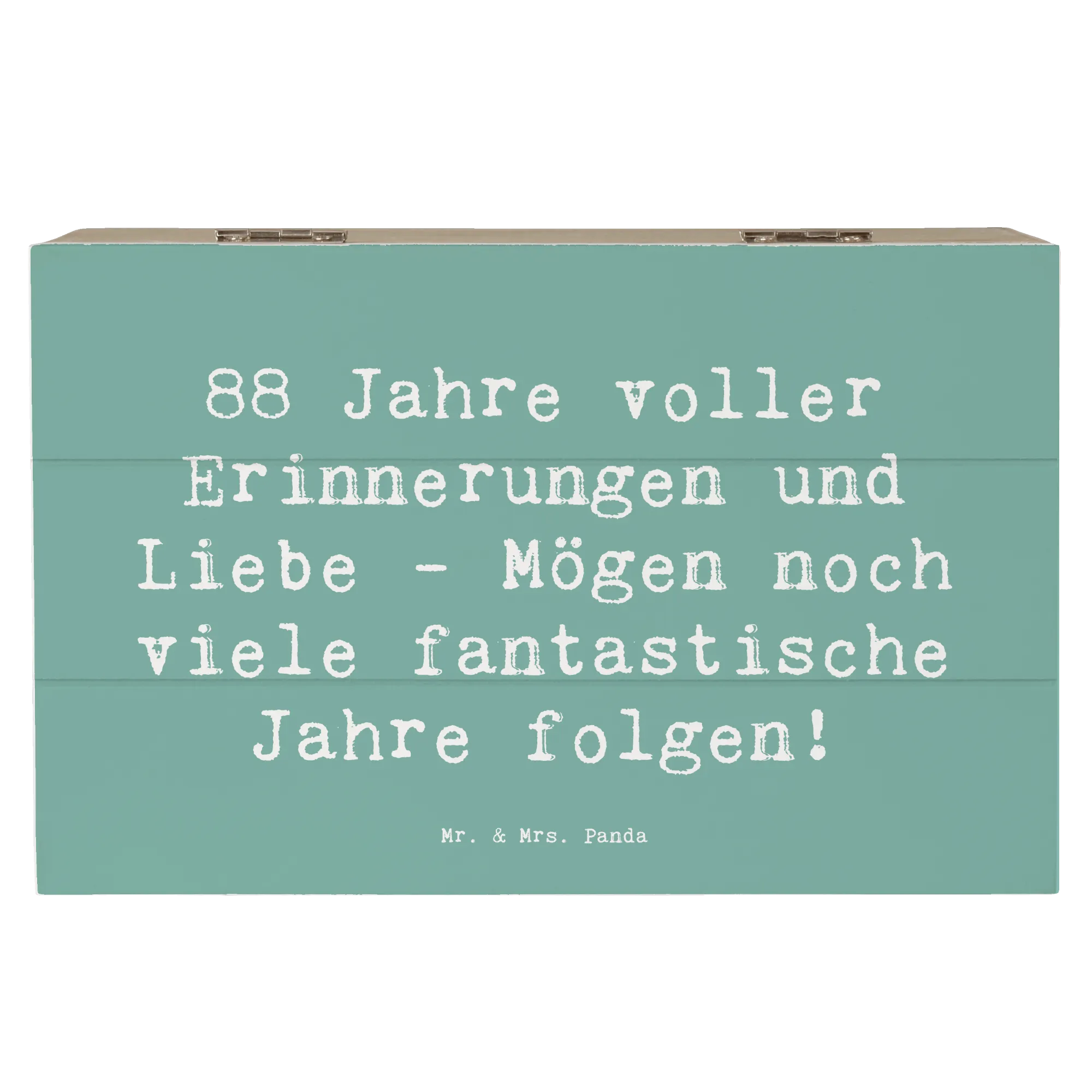 Feierliche Anlässe brauchen besondere Geschenke, und unsere wunderschöne Holzkiste zum 88. Geburtstag von Mr. & Mrs. Panda ist das perfekte Präsent für diesen ganz besonderen Tag! Mit dem liebevollen Slogan "88 Jahre voller Erinnerungen und Liebe - Mögen noch viele fantastische Jahre folgen!" wird diese Kiste zum idealen Aufbewahrungsort für die wertvollsten Schätze und Erinnerungen. Egal, ob es sich um Fotos, kleine Andenken oder bedeutende Erinnerungsstücke handelt – diese Kiste bietet den perfekten Platz, um alles zu bewahren.