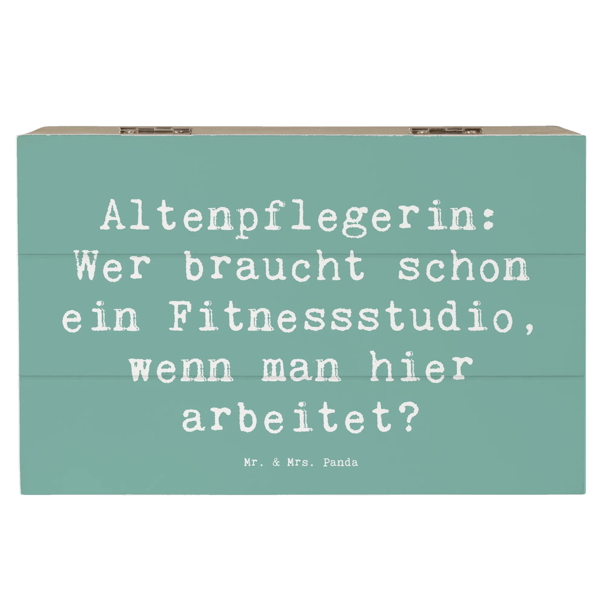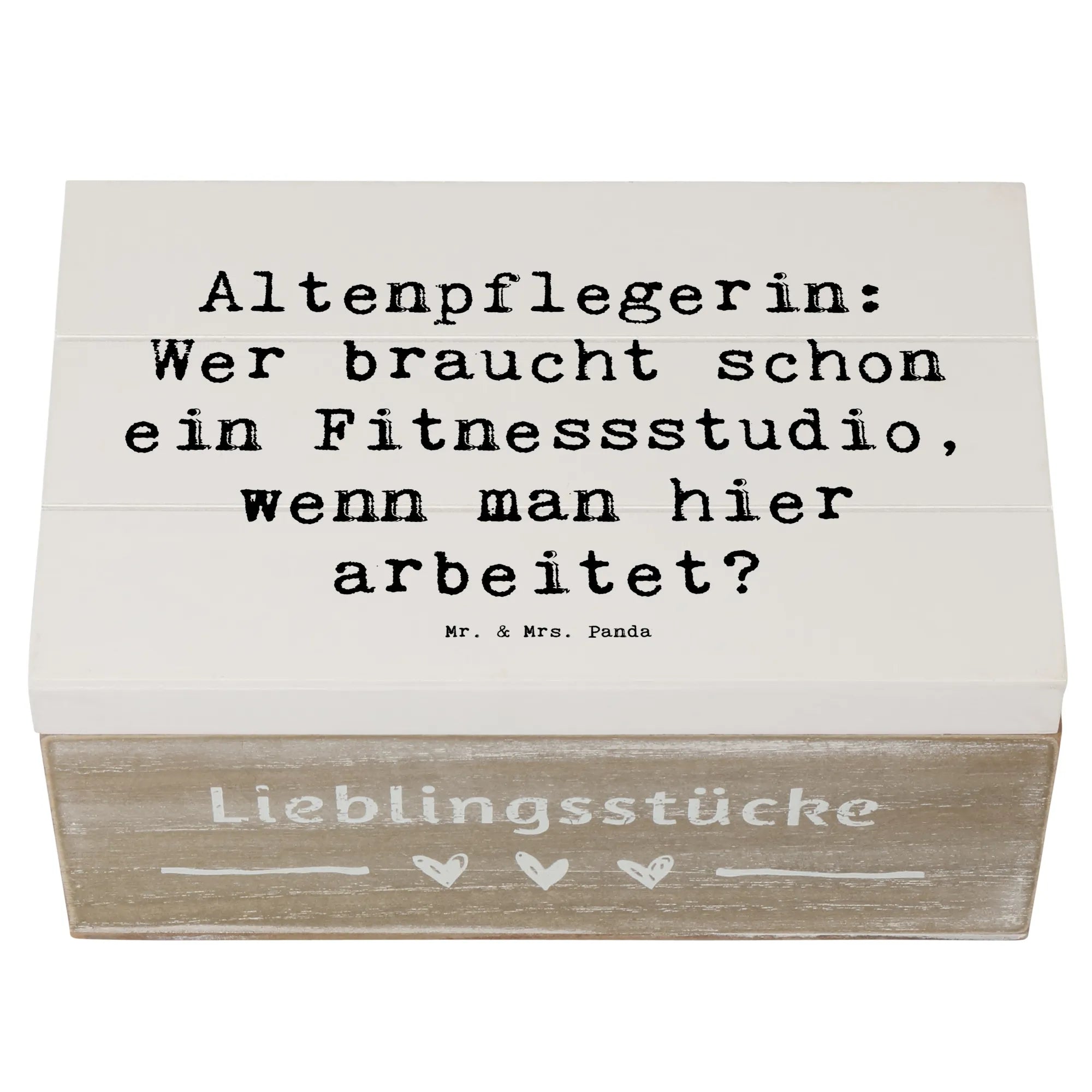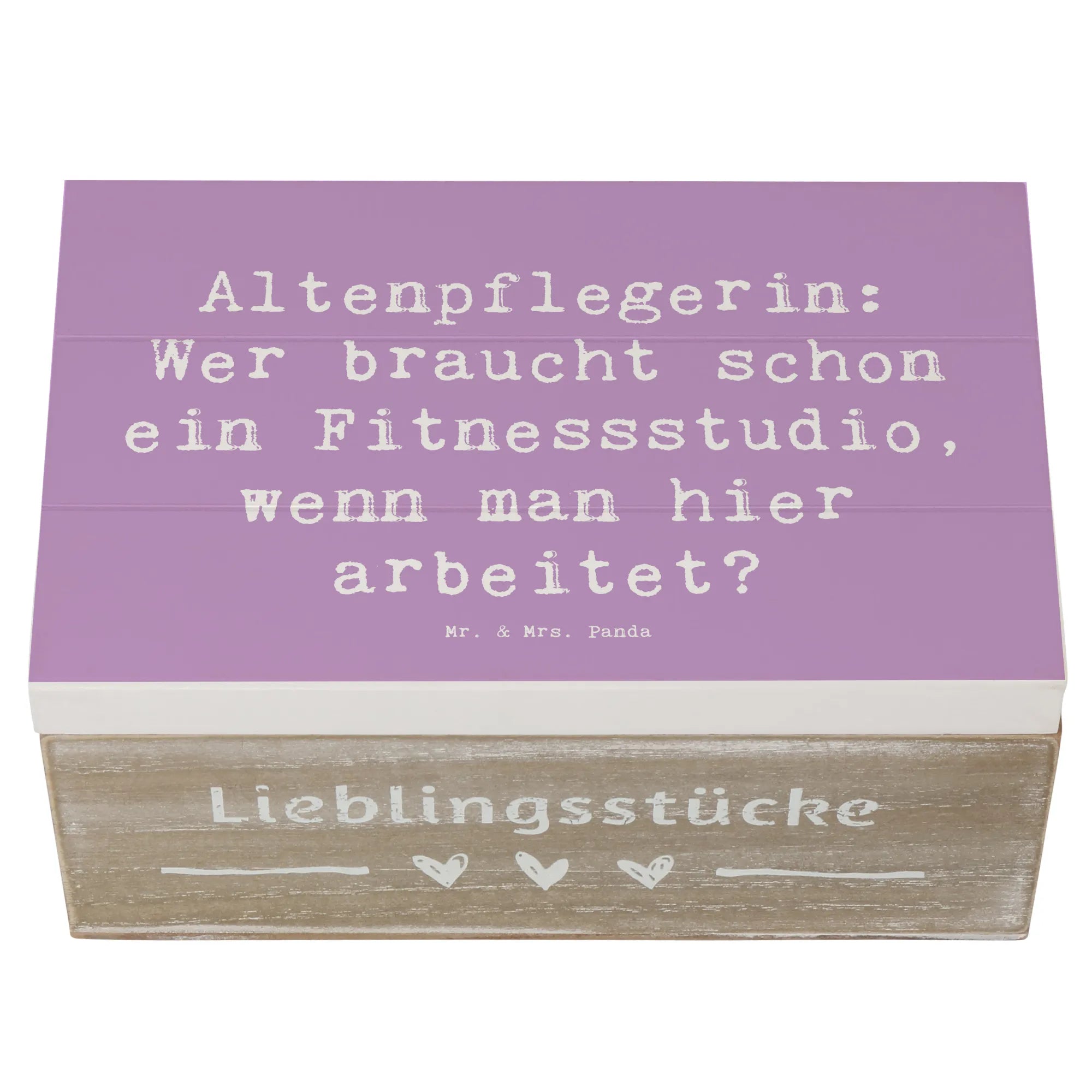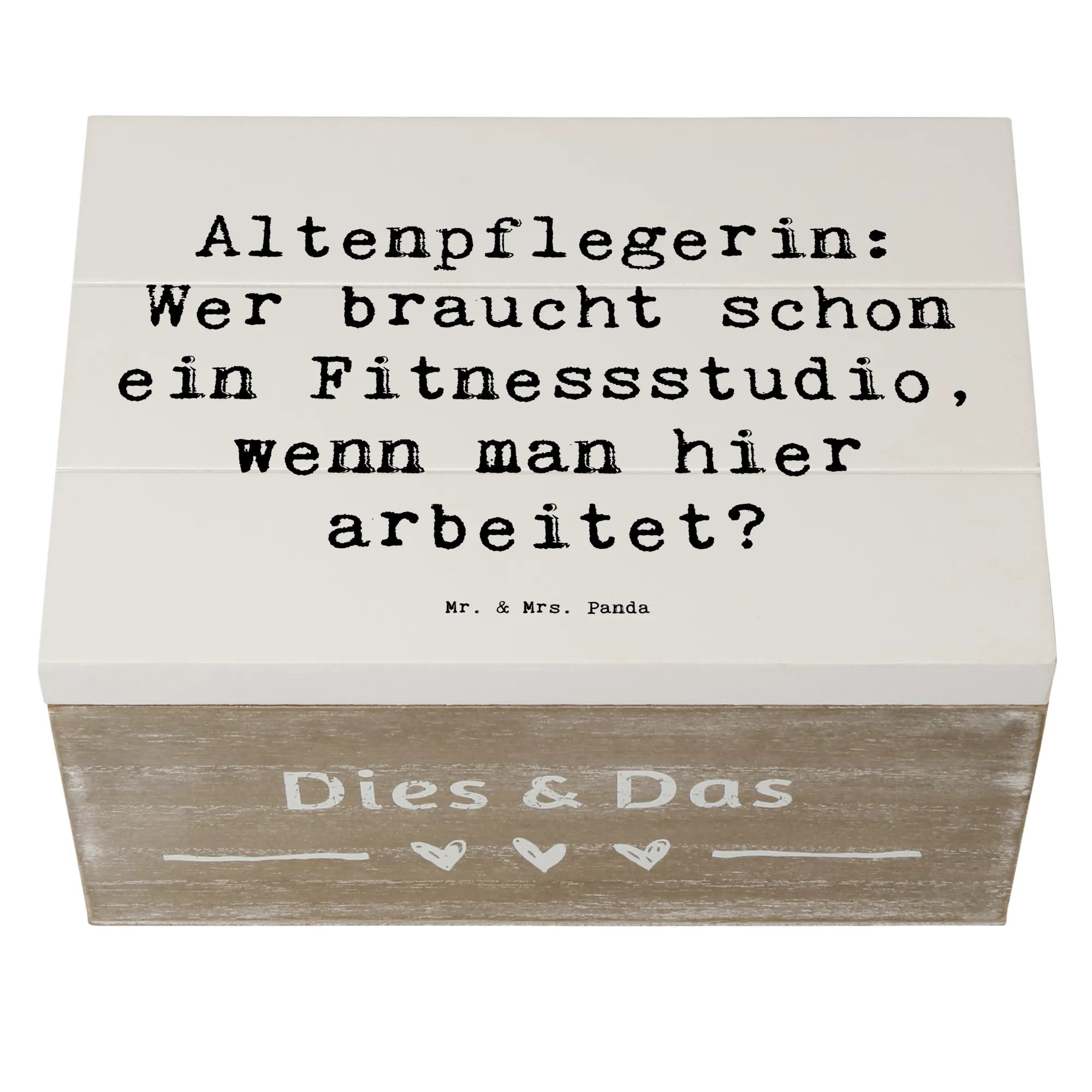 Die wunderschöne Holzkiste von Mr. & Mrs. Panda mit dem Motto 'Altenpflegerin: Wer braucht schon ein Fitnessstudio, wenn man hier arbeitet?' ist nicht nur ein stilvoller Aufbewahrungsort, sondern auch ein liebevolles Geschenk für alle, die im Pflegeberuf tätig sind.