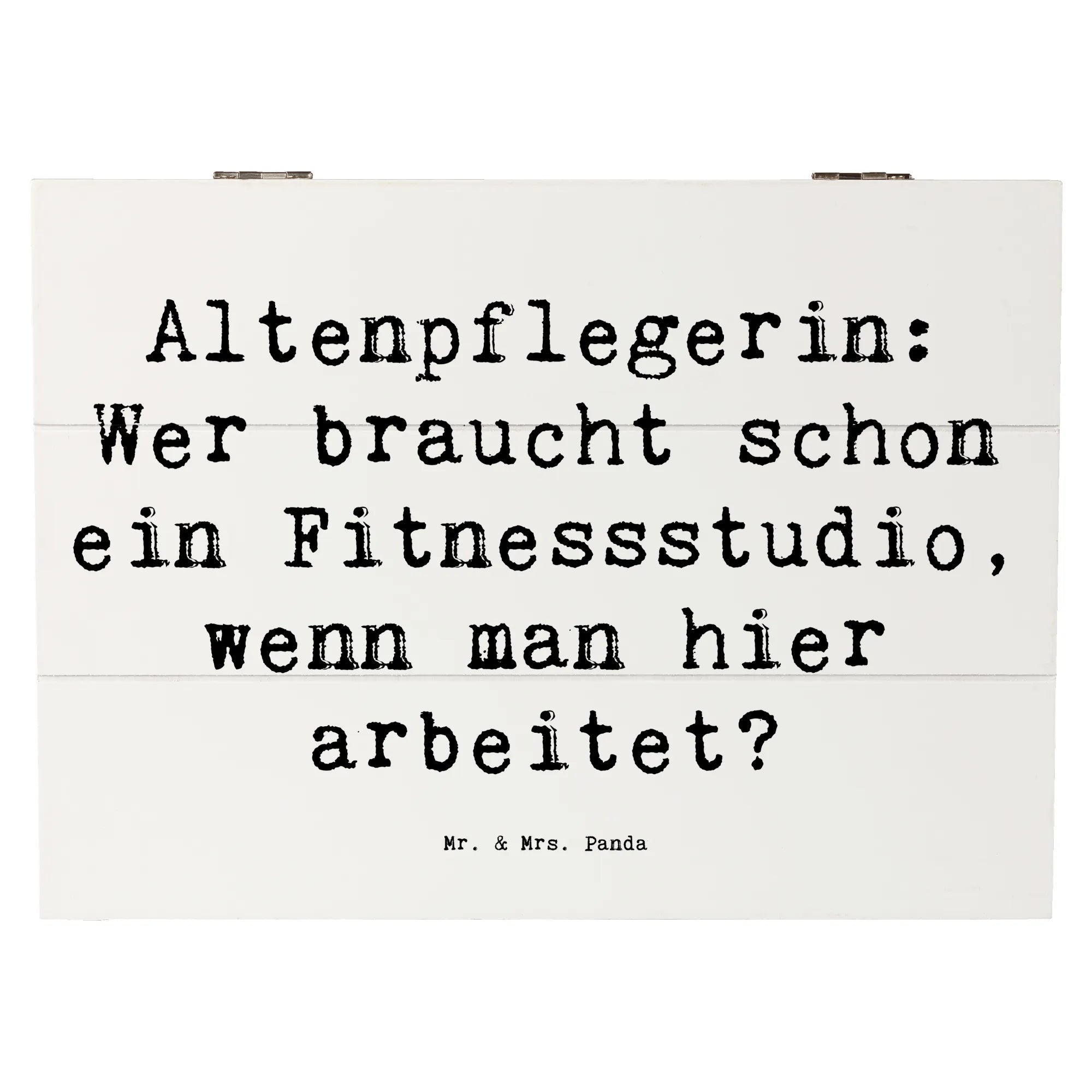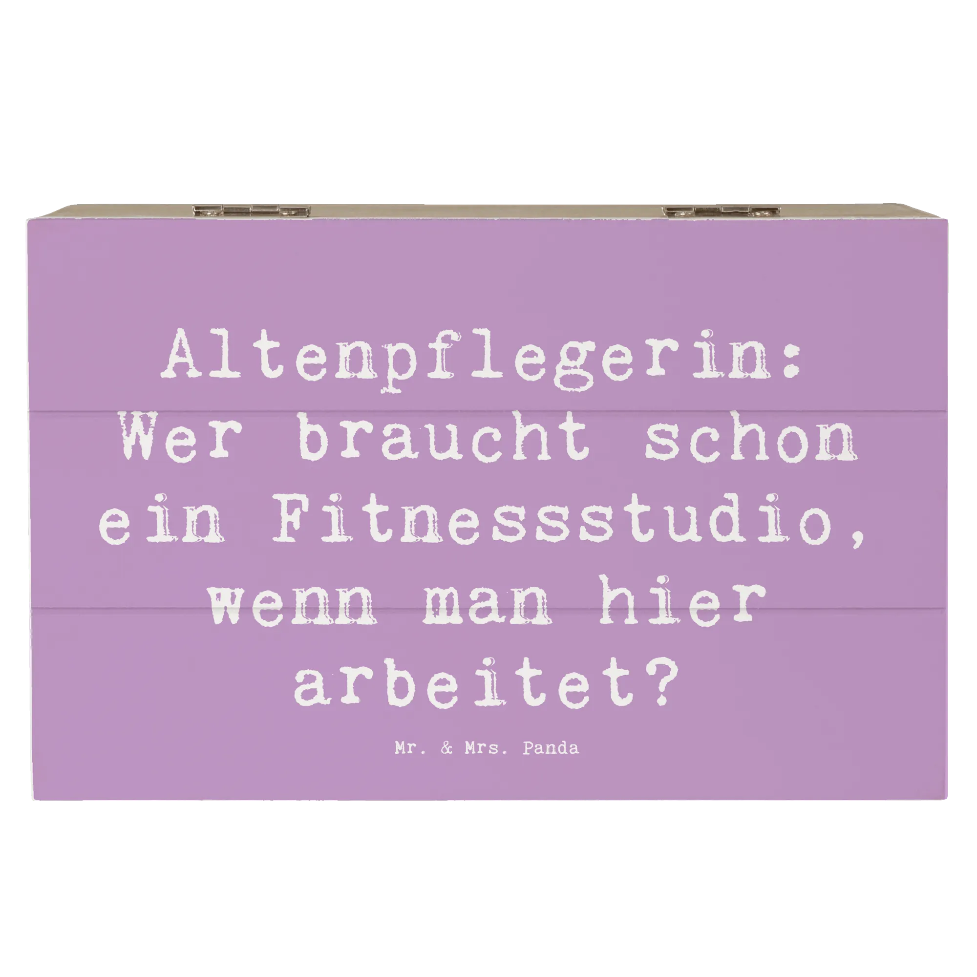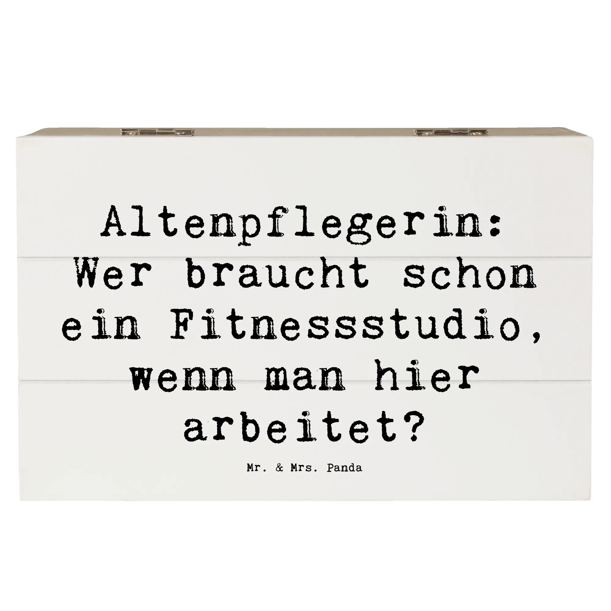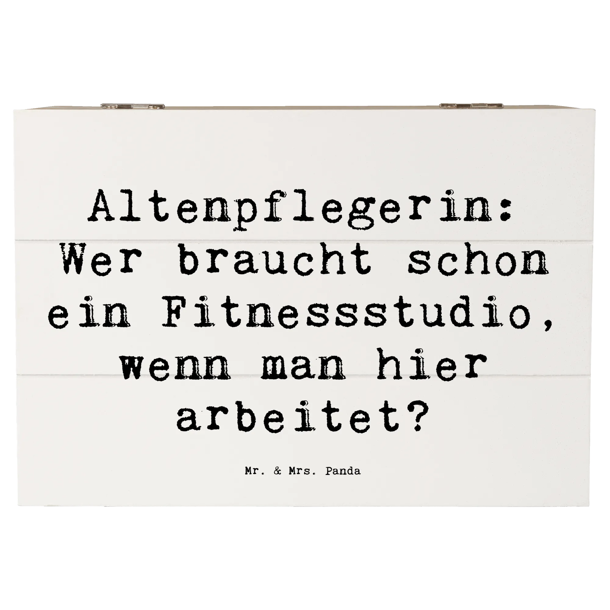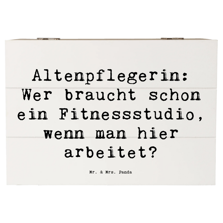 Die wunderschöne Holzkiste von Mr. & Mrs. Panda mit dem Motto 'Altenpflegerin: Wer braucht schon ein Fitnessstudio, wenn man hier arbeitet?' ist nicht nur ein stilvoller Aufbewahrungsort, sondern auch ein liebevolles Geschenk für alle, die im Pflegeberuf tätig sind.