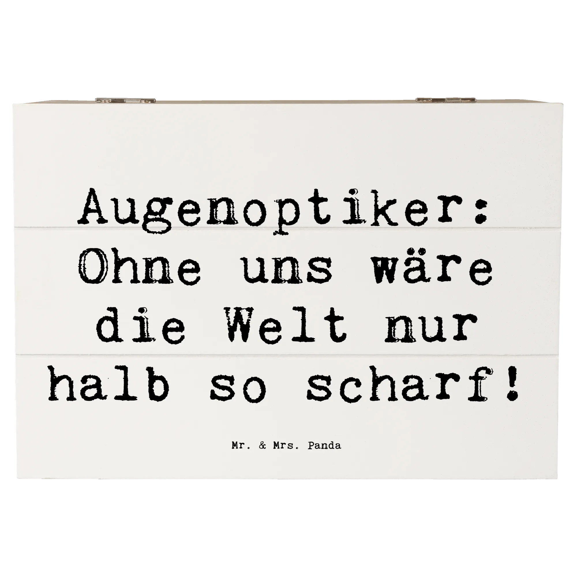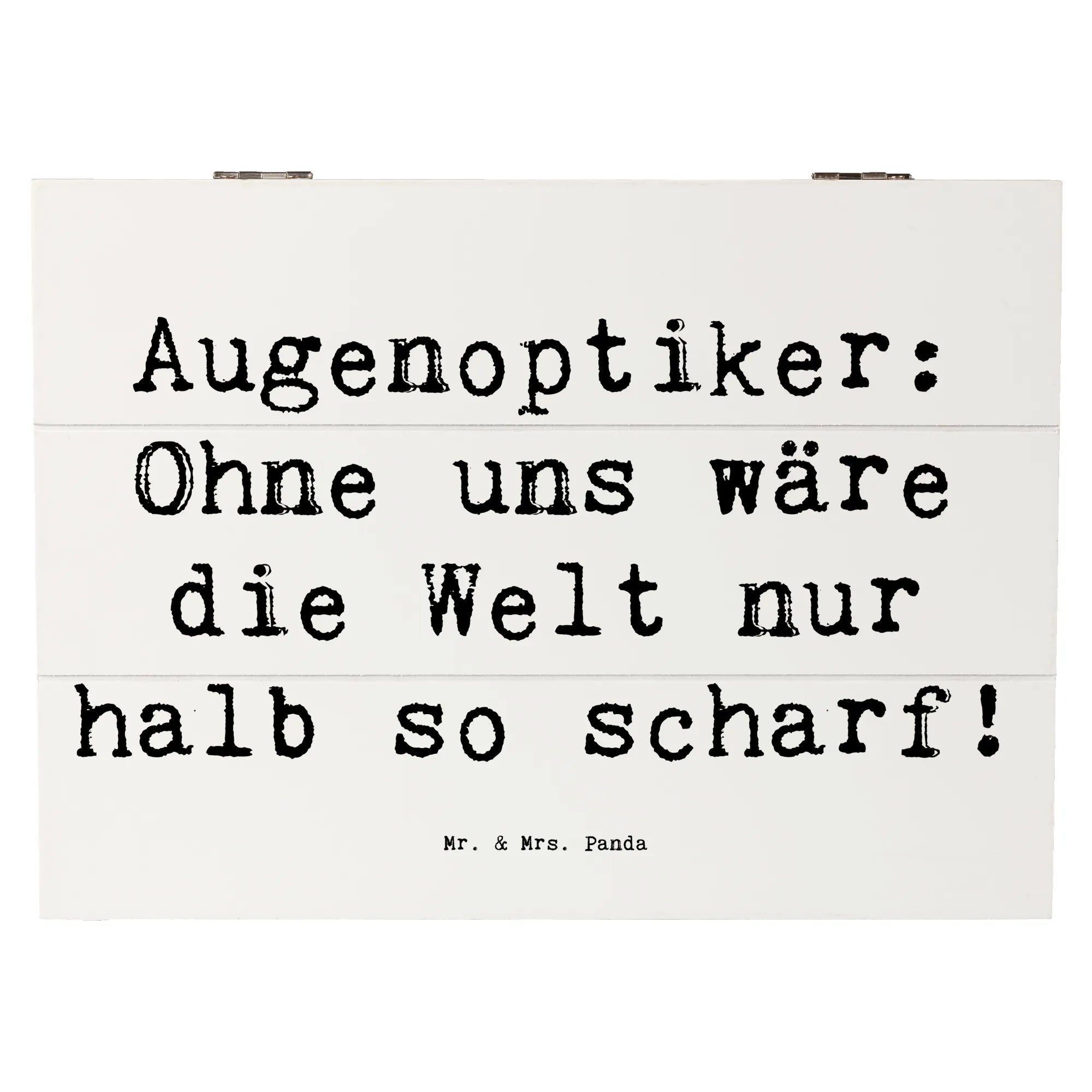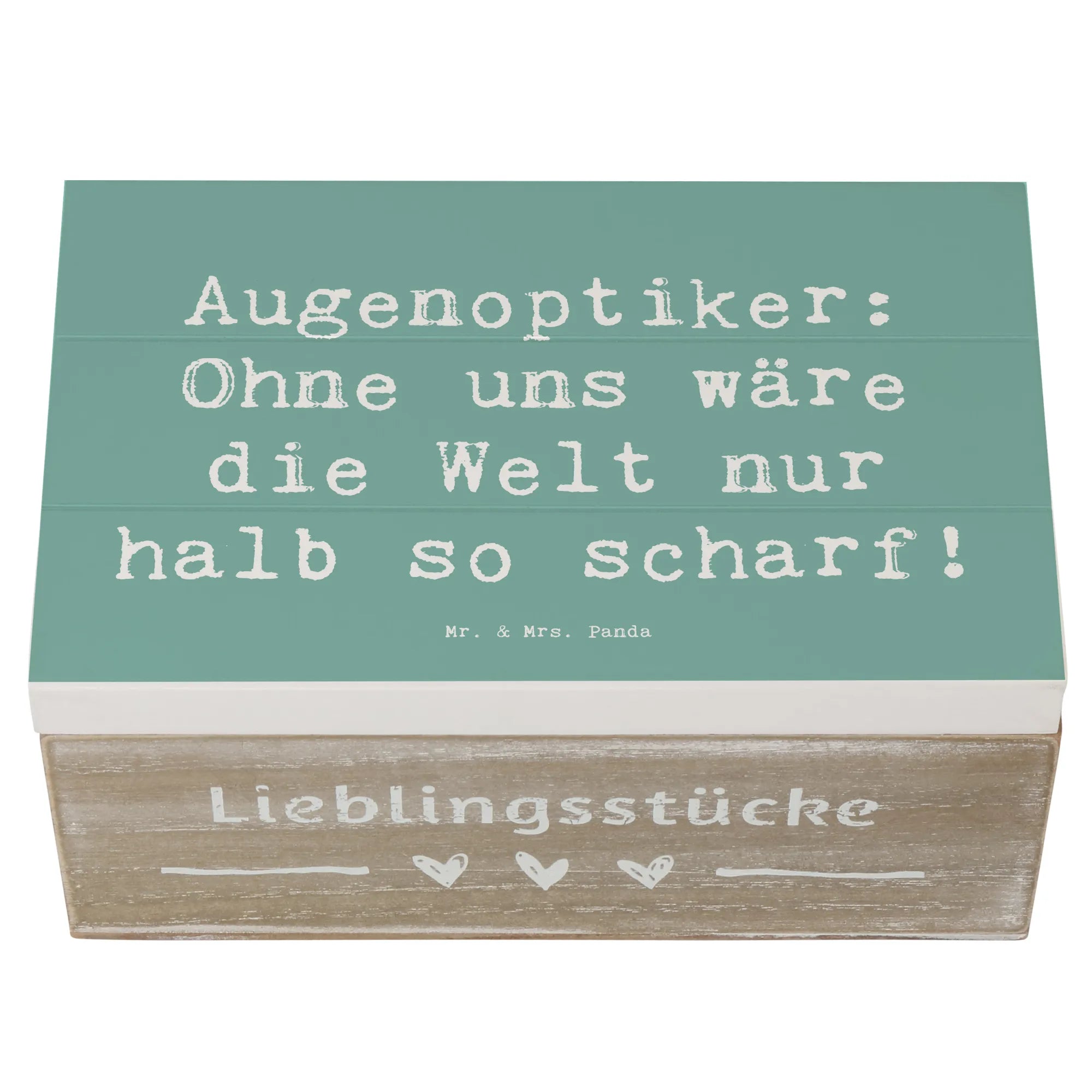 Entdecke unsere wunderschöne Holzkiste mit dem einzigartigen Motiv "Augenoptiker: Ohne uns wäre die Welt nur halb so scharf!" von Mr. & Mrs. Panda. Diese bezaubernde Erinnerungskiste ist der perfekte Ort, um all die besonderen Schätze des Lebens aufzubewahren. Egal ob es sich um Fotos von besonderen Anlässen, kleine Erinnerungsstücke aus der Kindheit oder bedeutende Geschenke handelt, in dieser Aufbewahrungsbox finden alle wertvollen Erinnerungen ihren Platz.