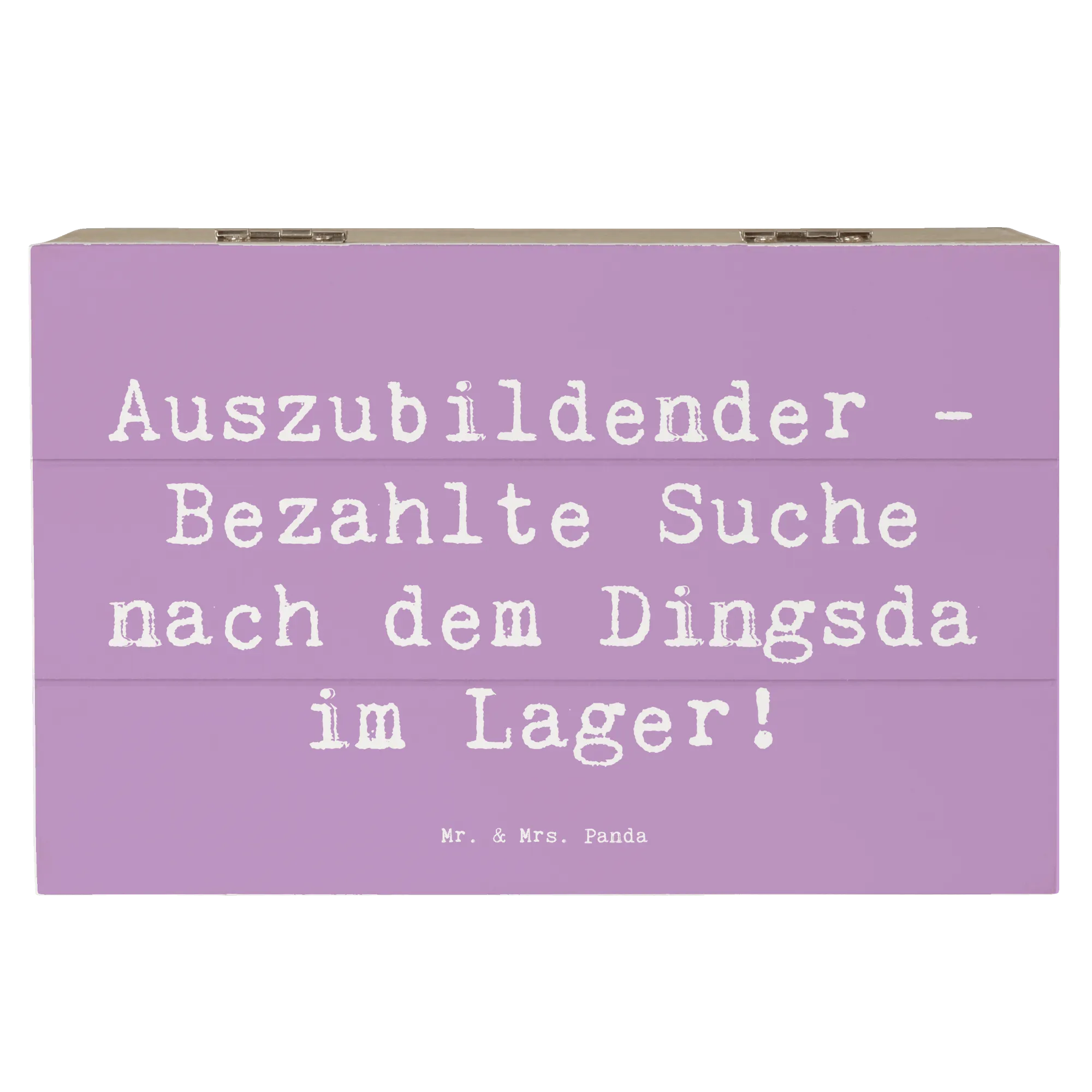 Liebevoll, praktisch und mit einem Schmunzeln: Unsere Holzkiste „Auszubildender“ aus der Berufe-Kollektion von Mr. & Mrs. Panda ist das perfekte Geschenk zum Ausbildungsstart, zur bestandenen Prüfung oder einfach als kleine Aufmerksamkeit für Kollegen. Auf der Vorderseite steht der witzige Spruch „Auszubildender - Bezahlte Suche nach dem Dingsda im Lager!“, ergänzt durch handgezeichnete Aquarell-Illustrationen von Mrs. Panda vor einem zarten Lavendeltraum-Hintergrund.