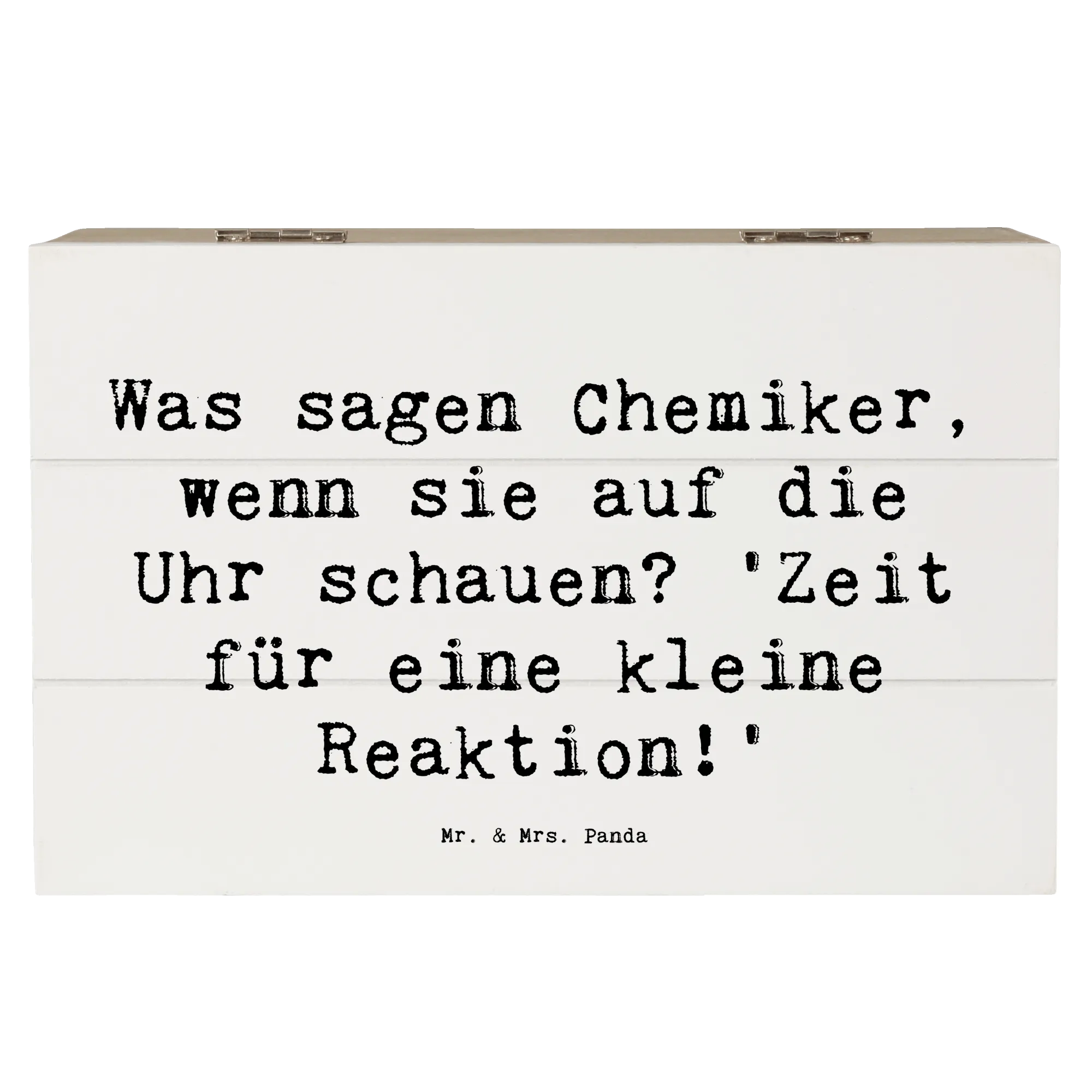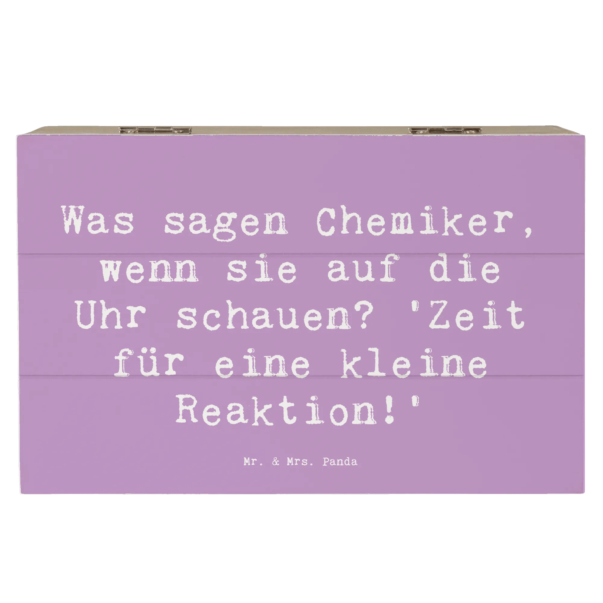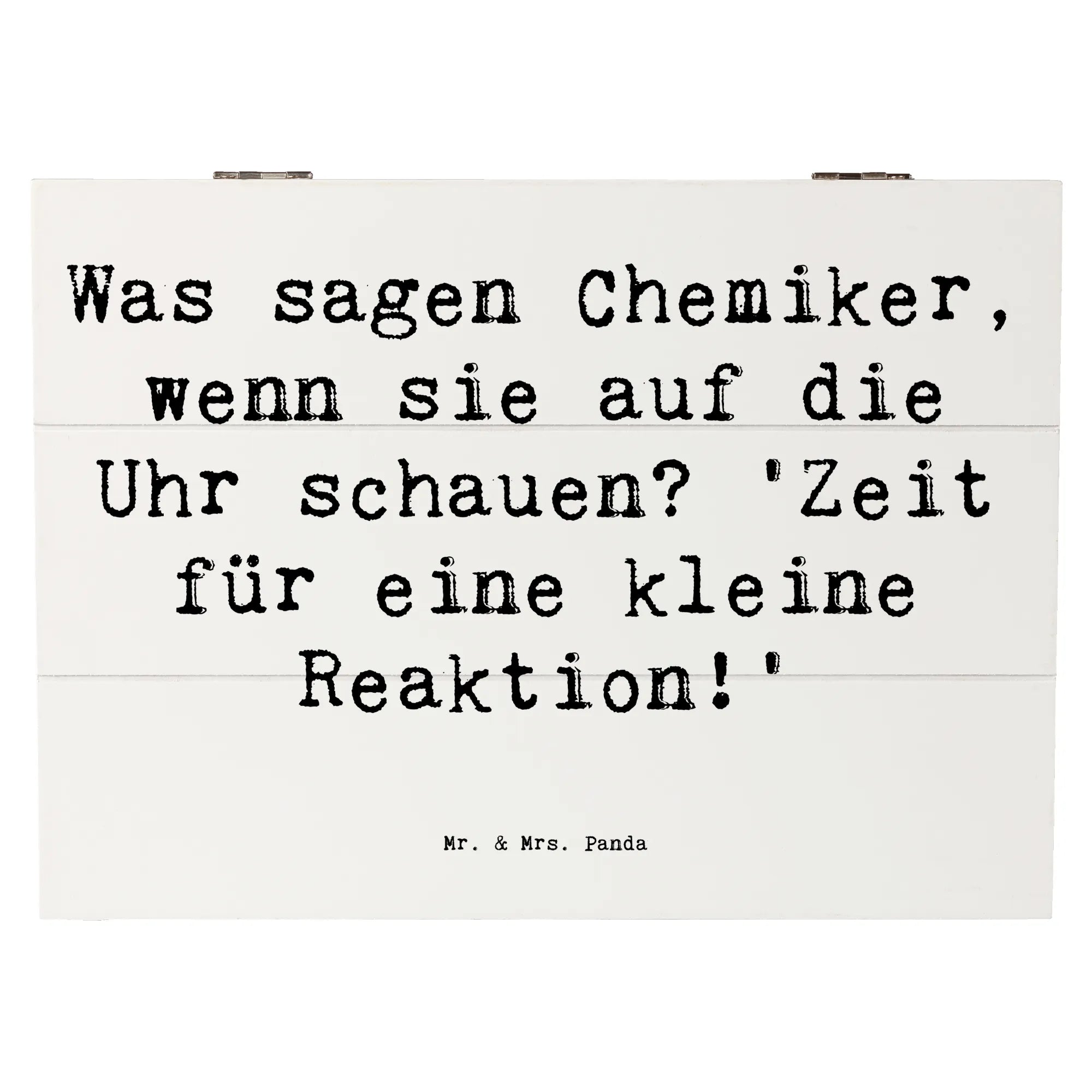Die wunderschöne Holzkiste von Mr. & Mrs. Panda ist das perfekte Geschenk für Chemiker und all diejenigen, die diesen faszinierenden Beruf lieben. Mit liebevoll handgezeichneten Motiven und dem humorvollen Spruch „Was sagen Chemiker, wenn sie auf die Uhr schauen? 'Zeit für eine kleine Reaktion!'“ wird diese Kiste zum idealen Aufbewahrungsort für persönliche Schätze, Erinnerungsstücke oder wichtige Dokumente.