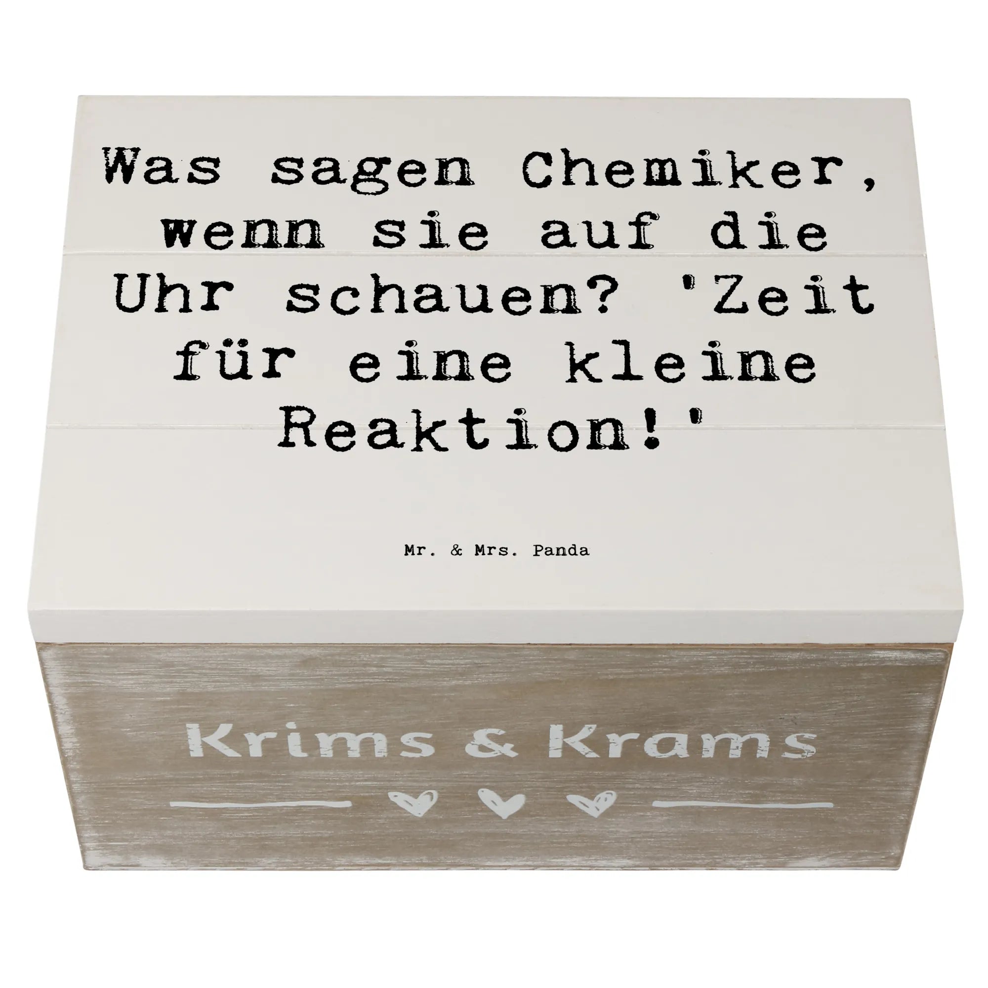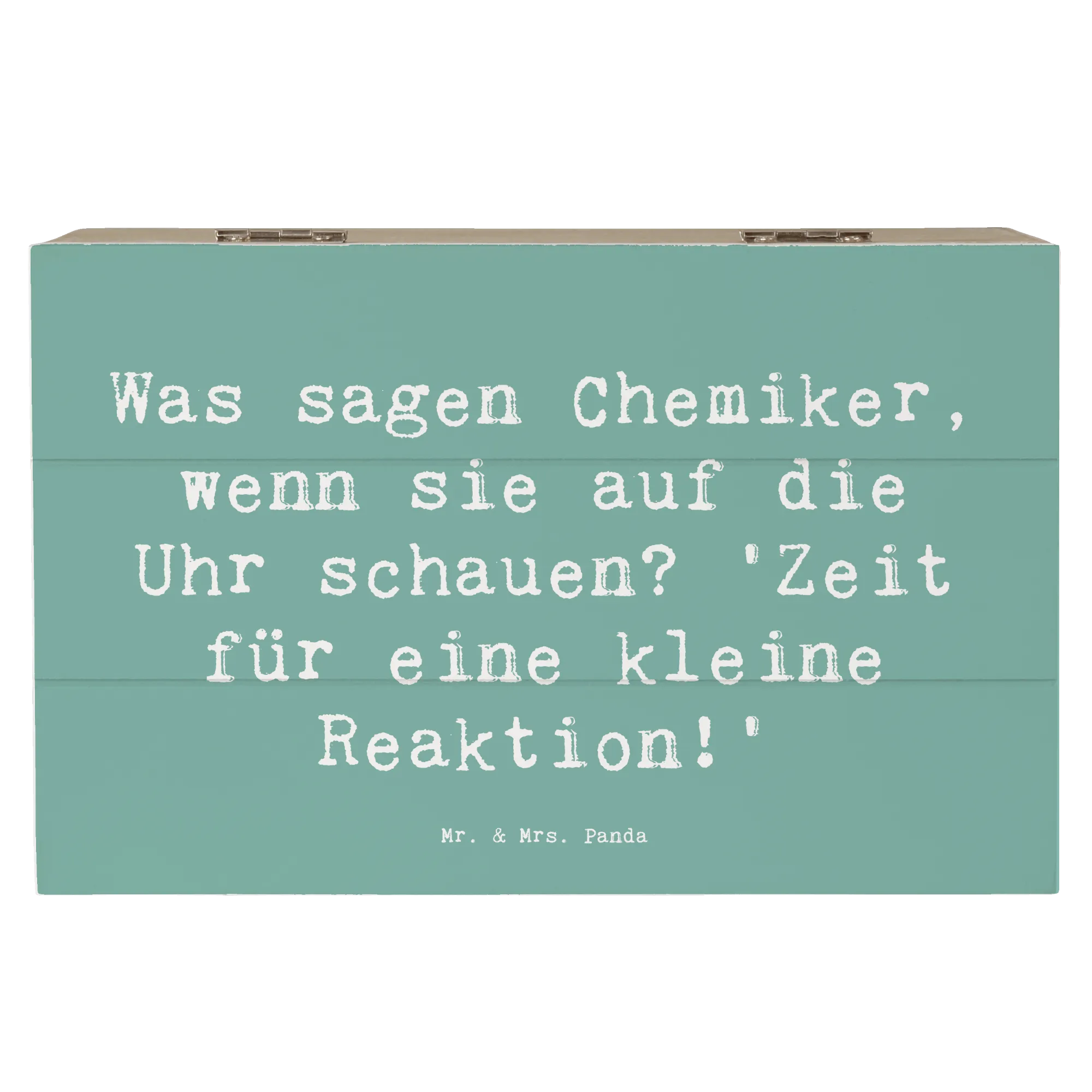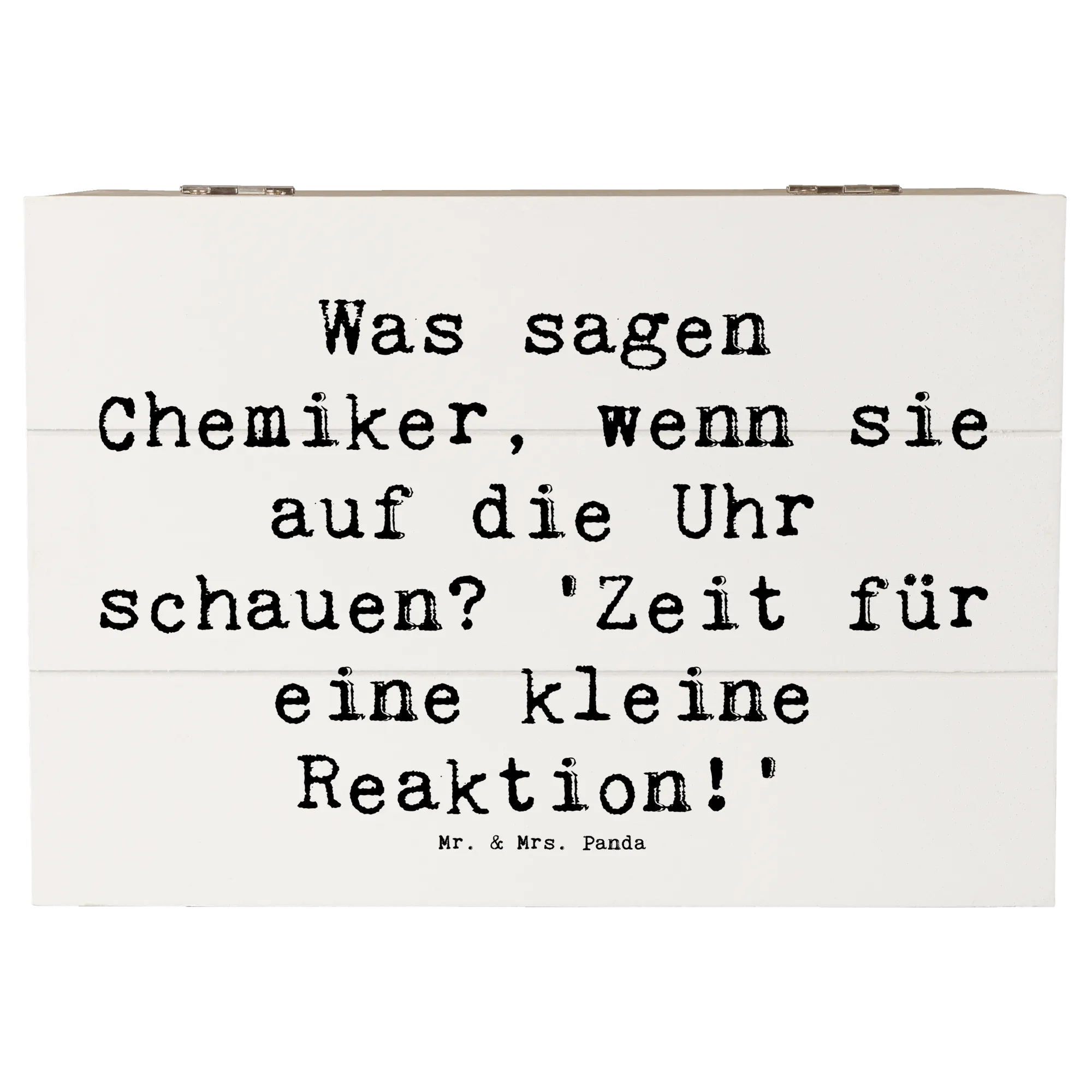 Die wunderschöne Holzkiste von Mr. & Mrs. Panda ist das perfekte Geschenk für Chemiker und all diejenigen, die diesen faszinierenden Beruf lieben. Mit liebevoll handgezeichneten Motiven und dem humorvollen Spruch „Was sagen Chemiker, wenn sie auf die Uhr schauen? 'Zeit für eine kleine Reaktion!'“ wird diese Kiste zum idealen Aufbewahrungsort für persönliche Schätze, Erinnerungsstücke oder wichtige Dokumente.