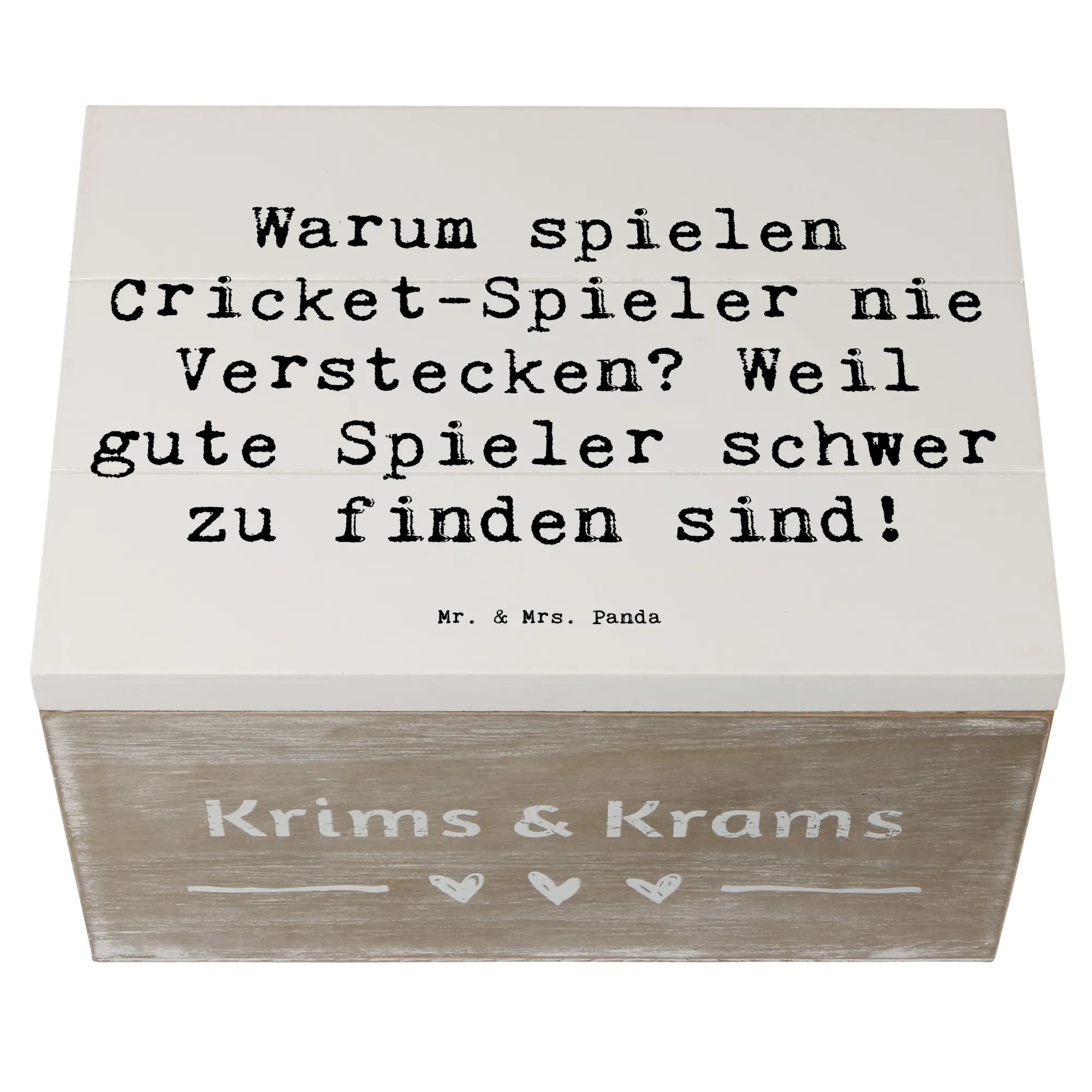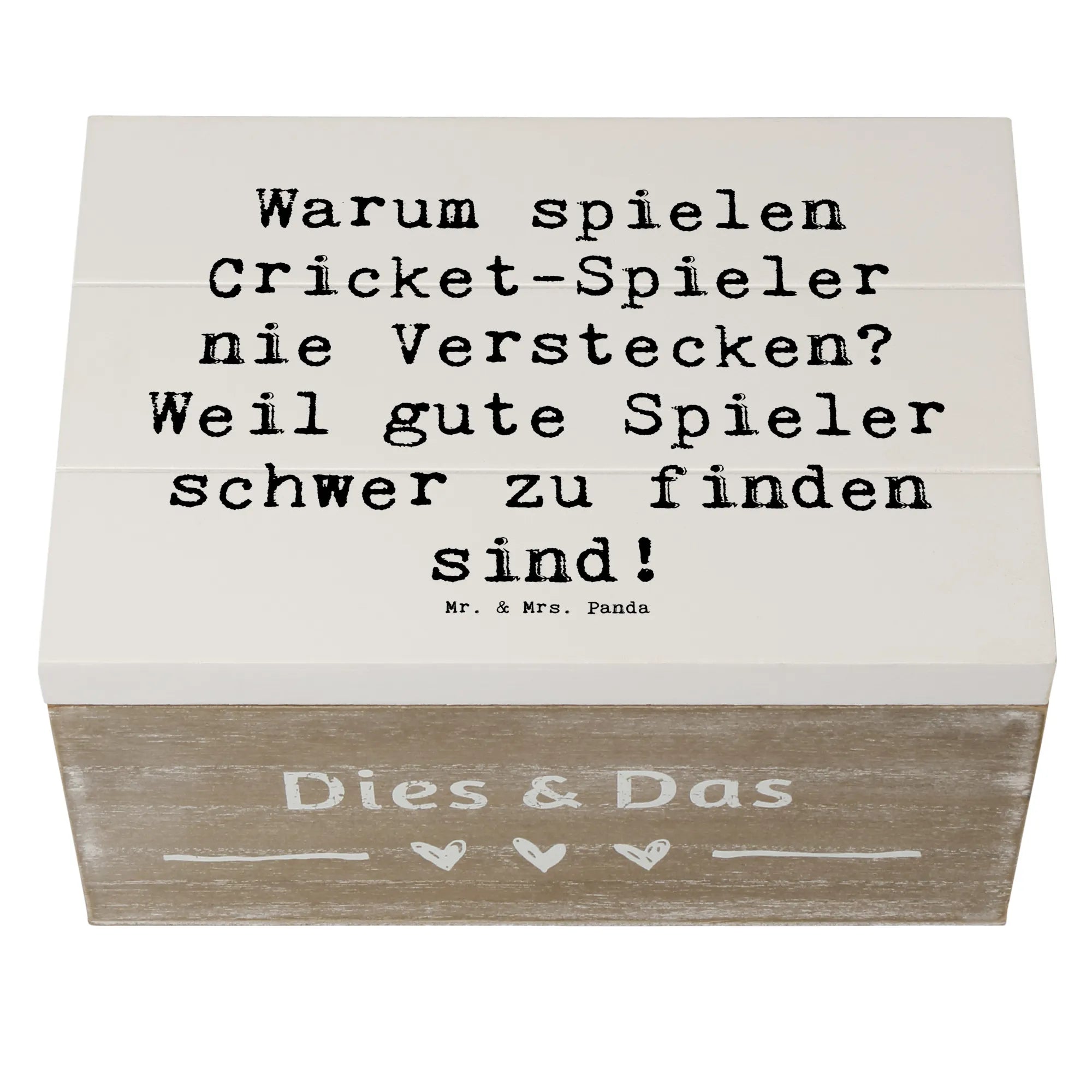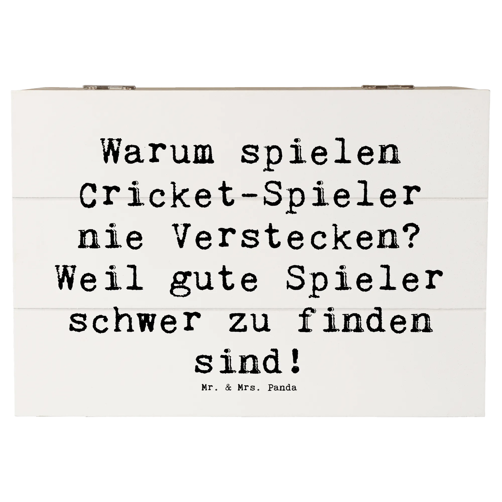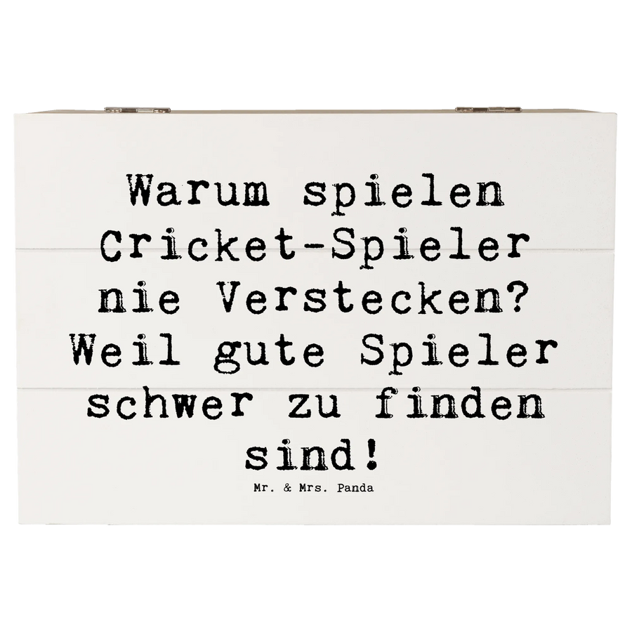 Perfekt für Cricket-Fans: Diese liebevoll gestaltete Holzkiste von Mr. & Mrs. Panda aus der Kollektion Sportarten verbindet Funktionalität, Humor und Design. Bedruckt mit dem Spruch „Warum spielen Cricket-Spieler nie Verstecken? Weil gute Spieler schwer zu finden sind!“ ist diese Holzbox ein tolles Geschenk für Spieler, Trainer, Teams und Fans.