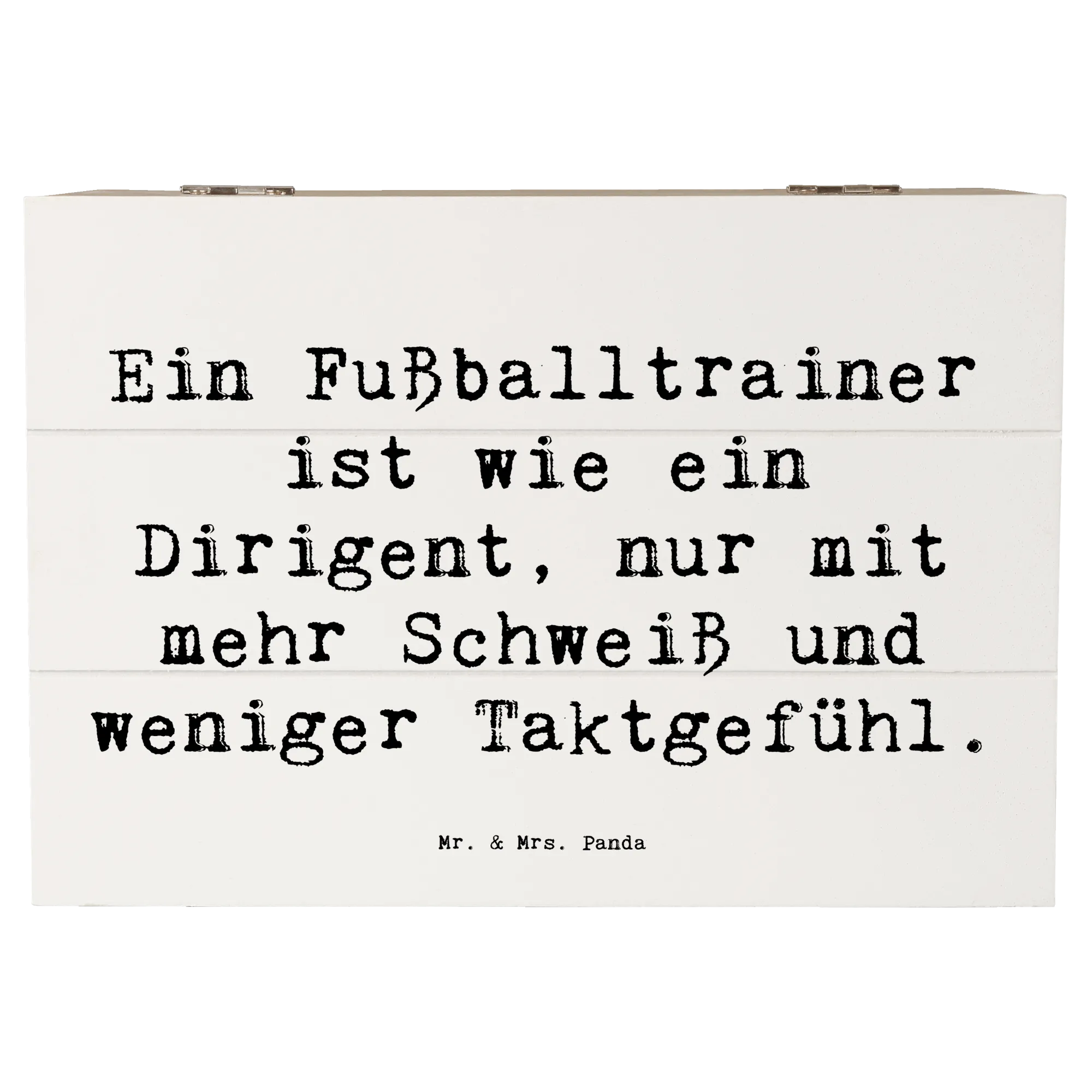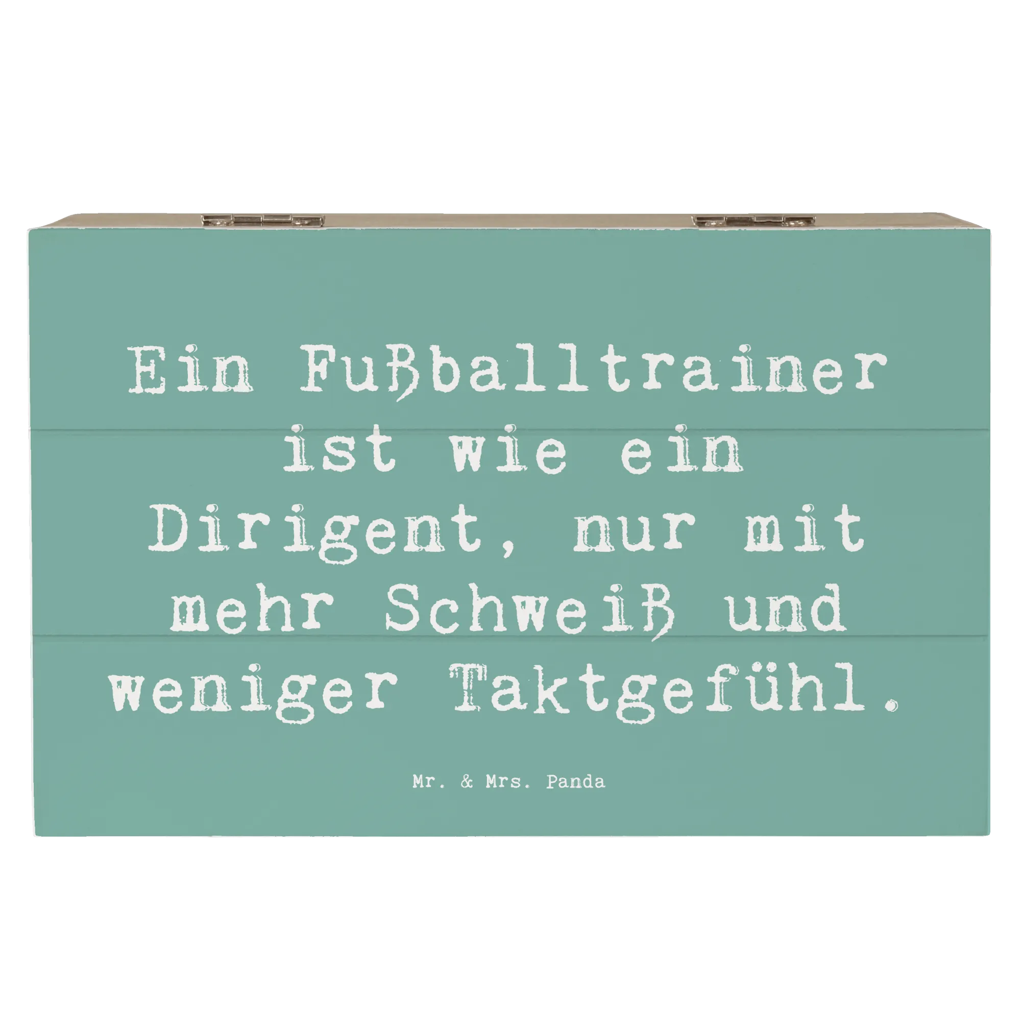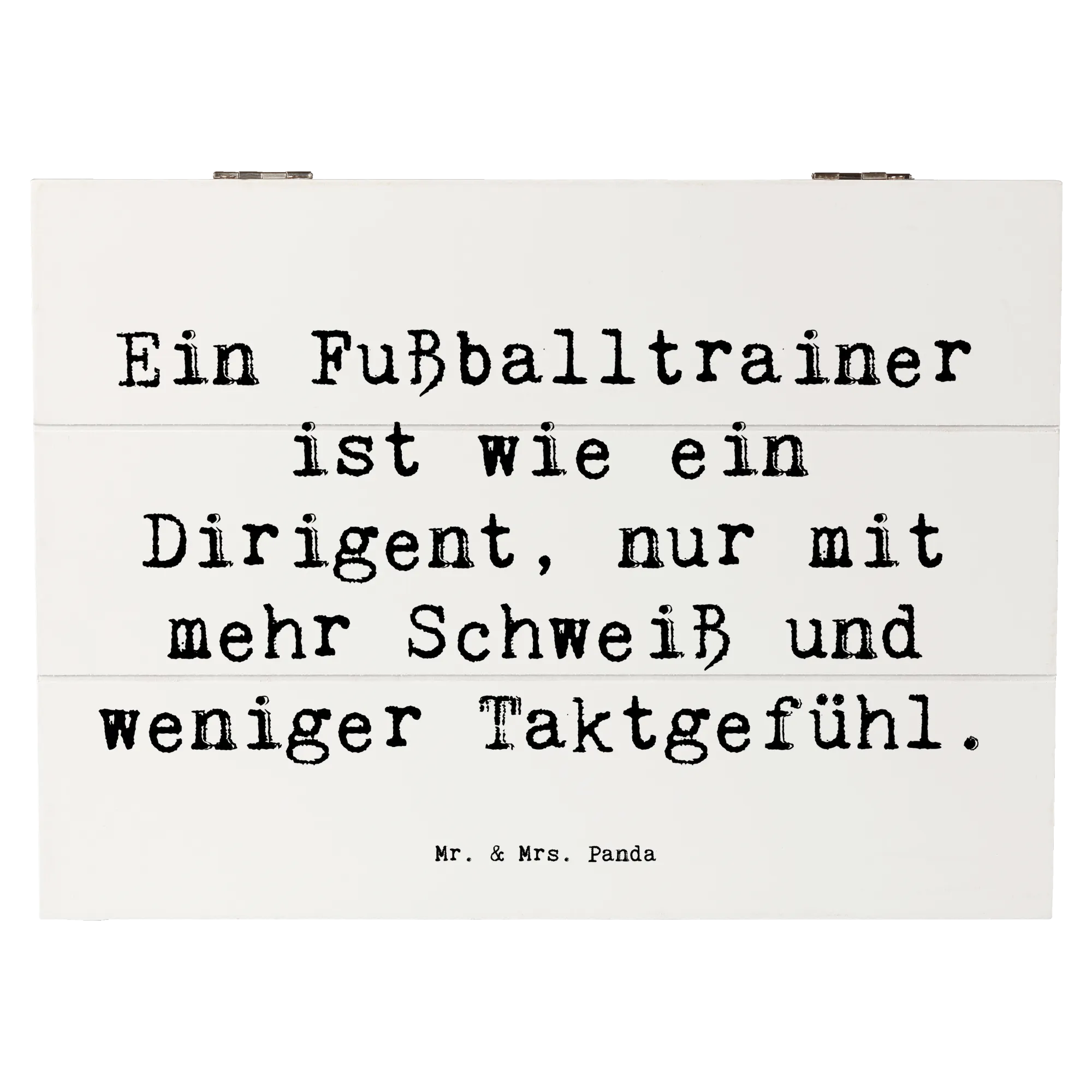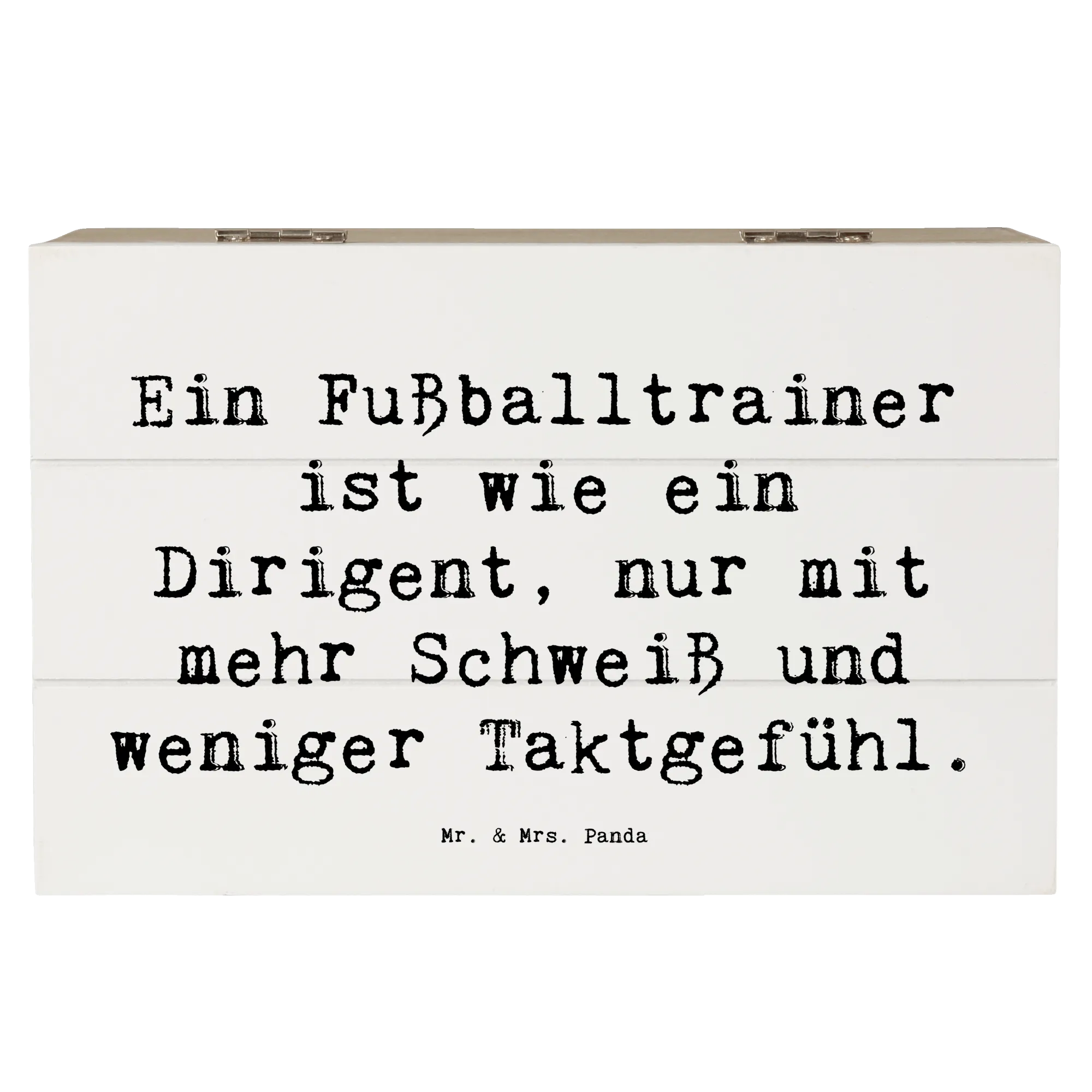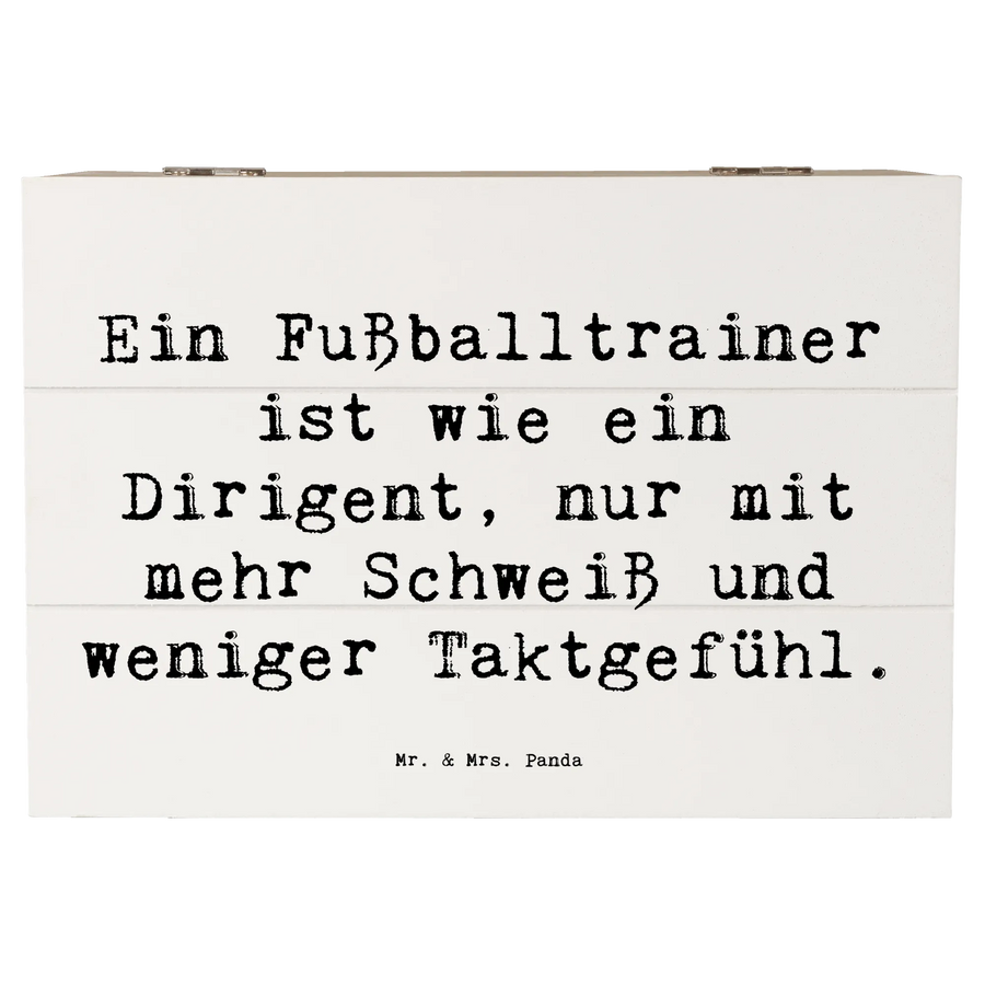 Suchst du nach dem perfekten Geschenk für einen leidenschaftlichen Fußballtrainer? Dann ist unsere wunderschöne Holzkiste von Mr. & Mrs. Panda genau das Richtige! Diese besondere Kiste ist nicht nur eine praktische Aufbewahrungsbox für all die tollen Erinnerungen, sondern auch ein tolles Accessoire, das die professionelle Leidenschaft eines Fußballtrainers zelebriert. Mit dem humorvollen Spruch Ein Fußballtrainer ist wie ein Dirigent, nur mit mehr Schweiß und weniger Taktgefühl auf der Vorderseite wird jeder Trainer schmunzeln. Egal ob zur Geburtstagsfeier, zum Jubiläum oder einfach nur als liebevolle Geste zwischendurch – diese Holzkiste ist vielseitig einsetzbar und kommt immer gut an.