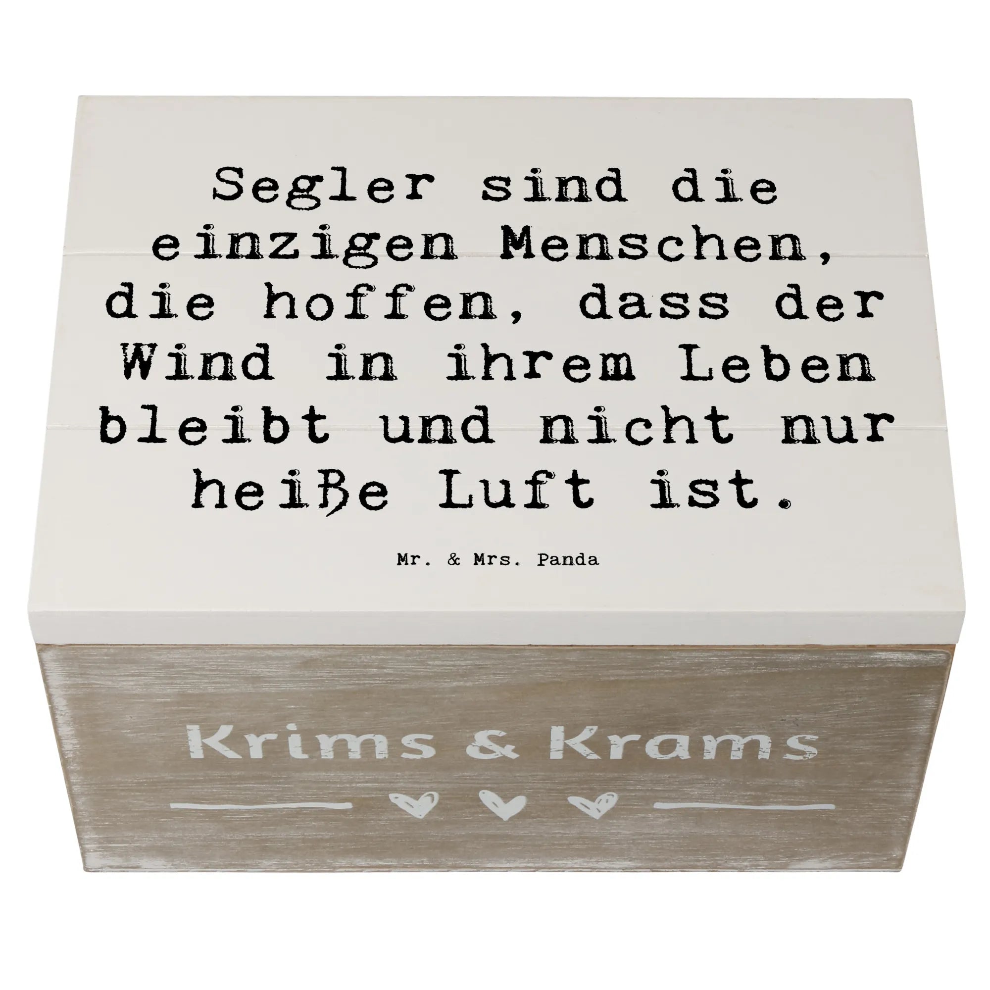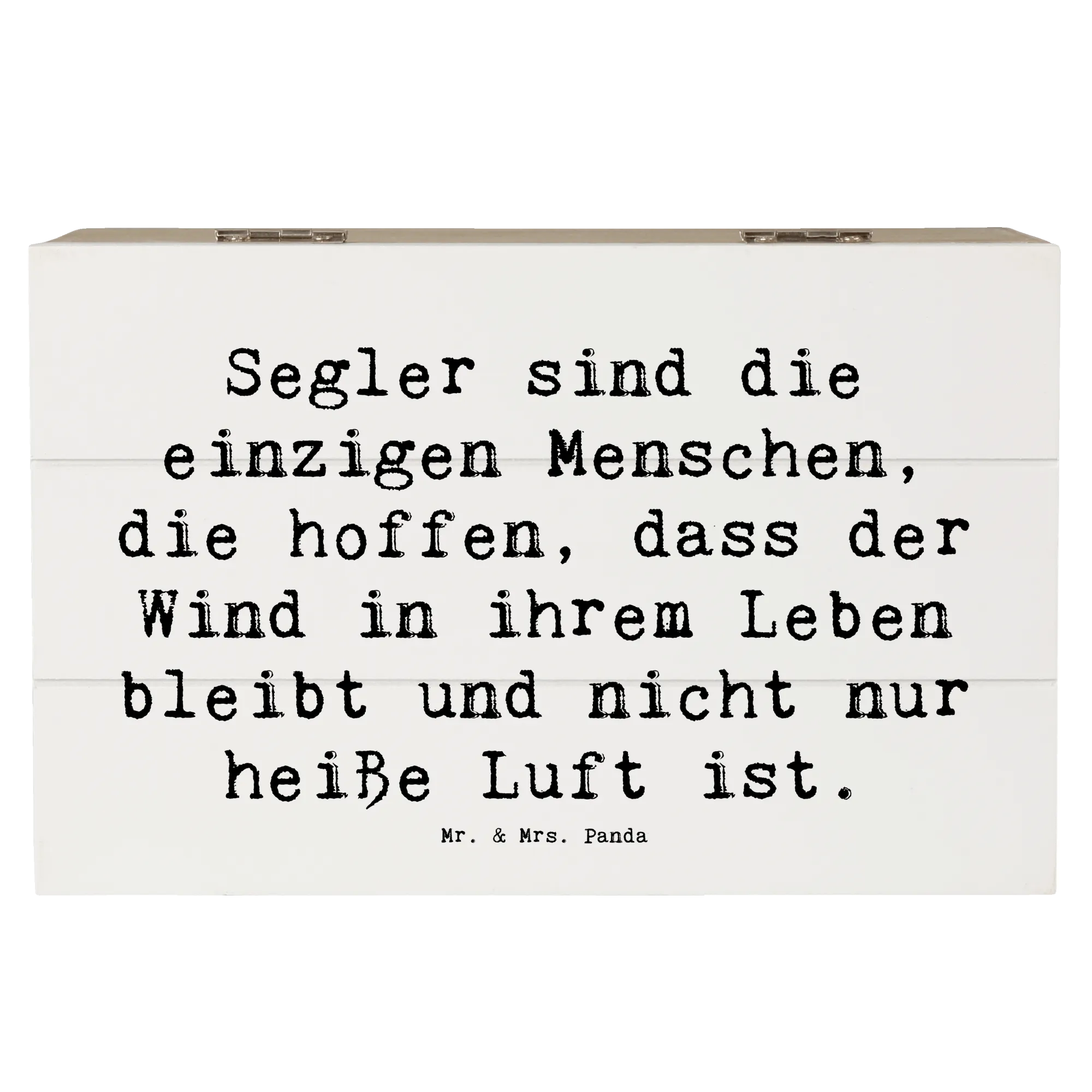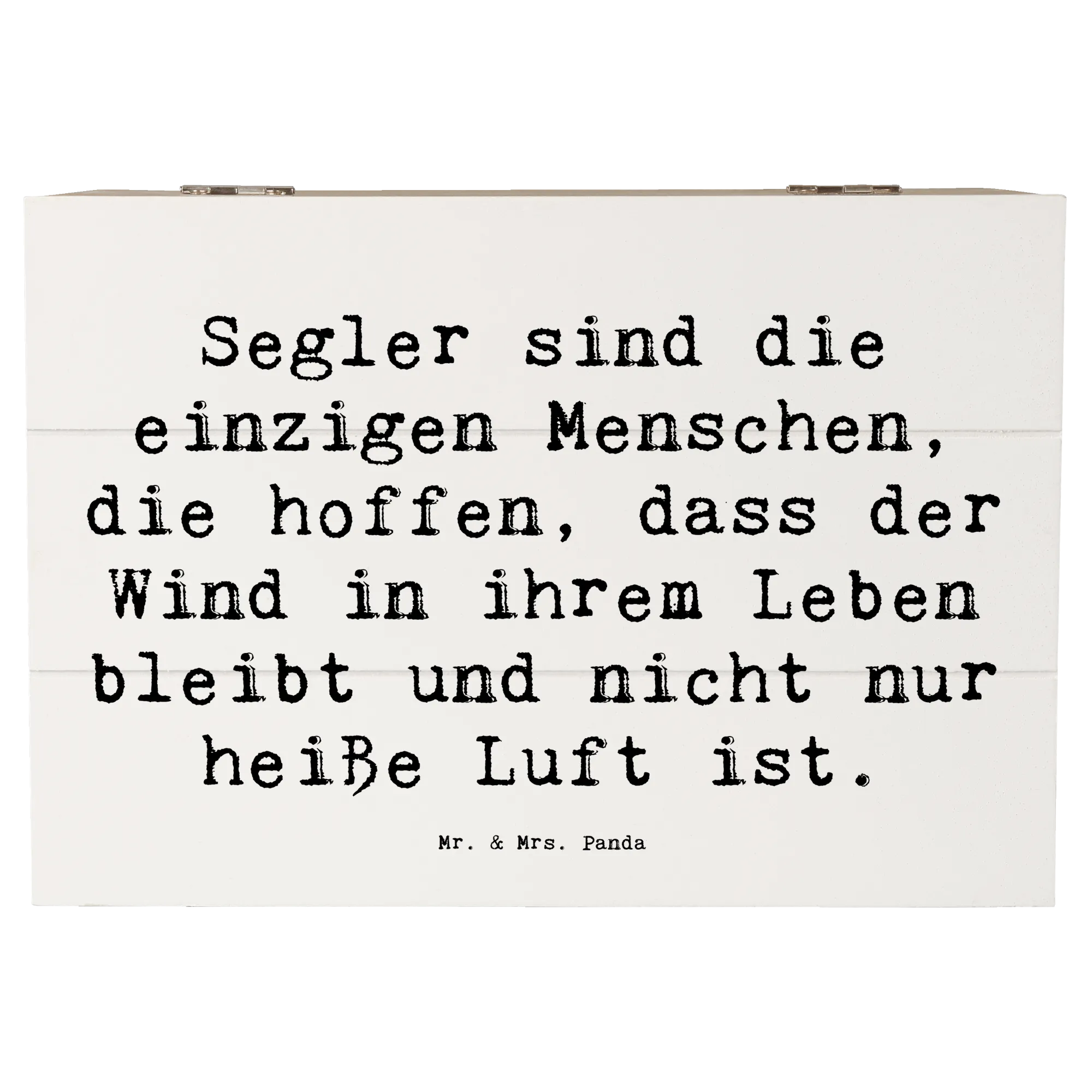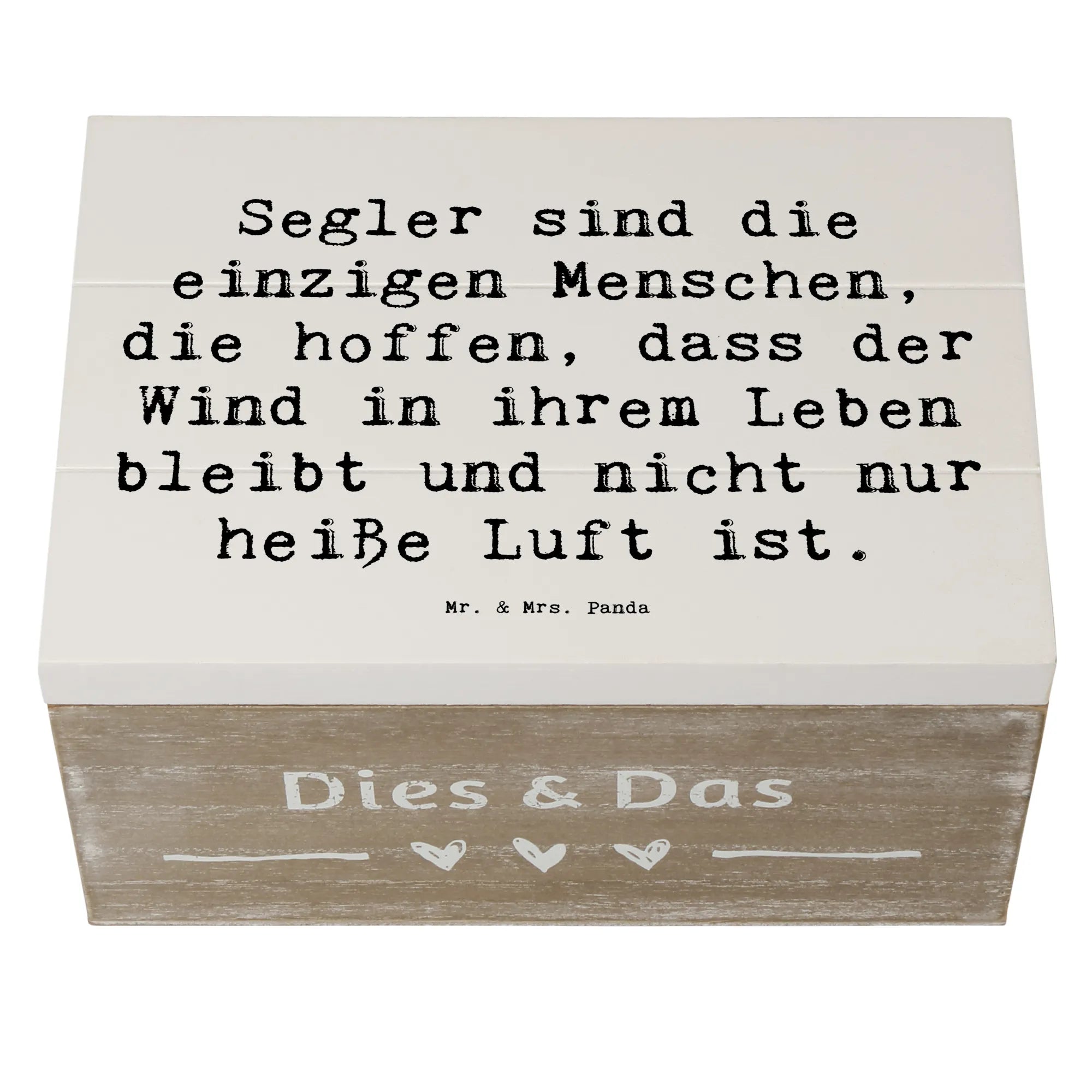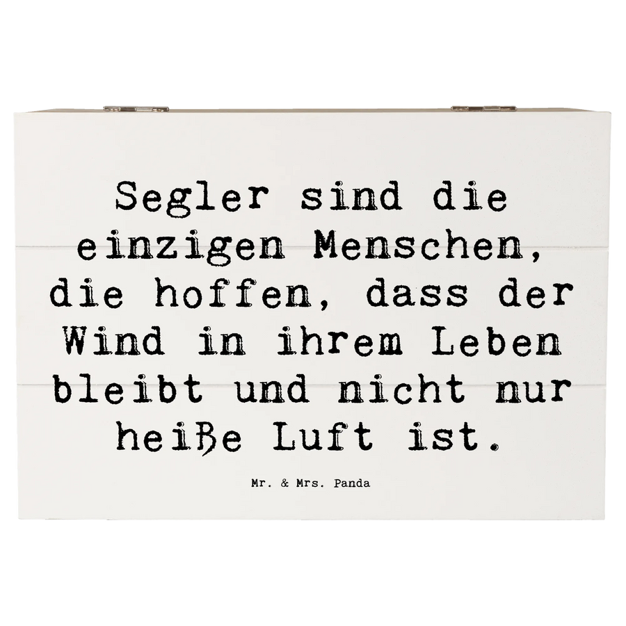 Eine wunderschöne Holzkiste von Mr. & Mrs. Panda, bedruckt mit dem liebevollen Segel-Motiv und dem spruchstarken Slogan „Segler sind die einzigen Menschen, die hoffen, dass der Wind in ihrem Leben bleibt und nicht nur heiße Luft ist.“ Diese Aufbewahrungsbox Holz ist das ideale Geschenk für alle, die das Meer, den Wind und das Freiheitsgefühl auf dem Wasser lieben.
