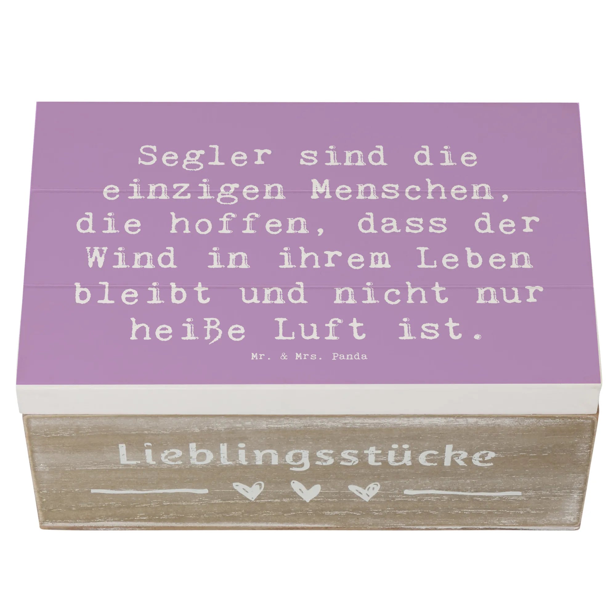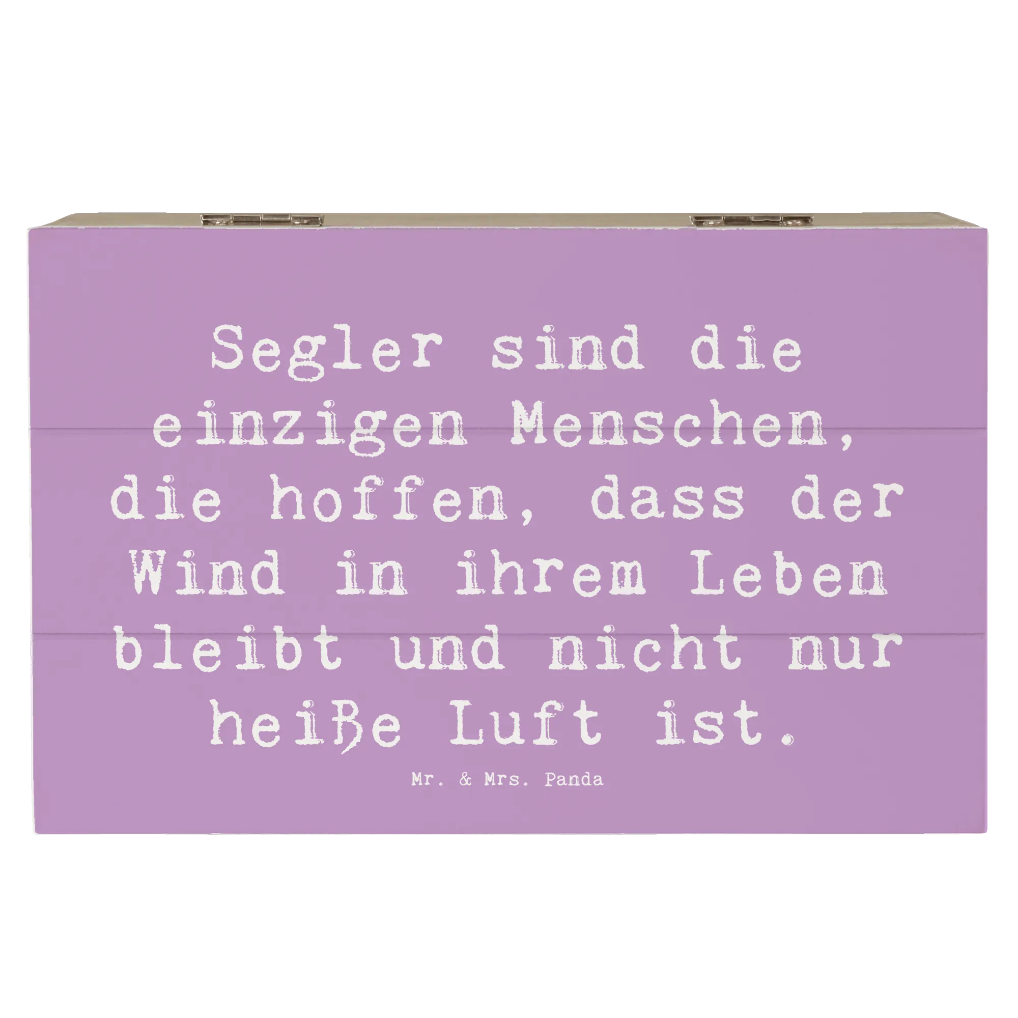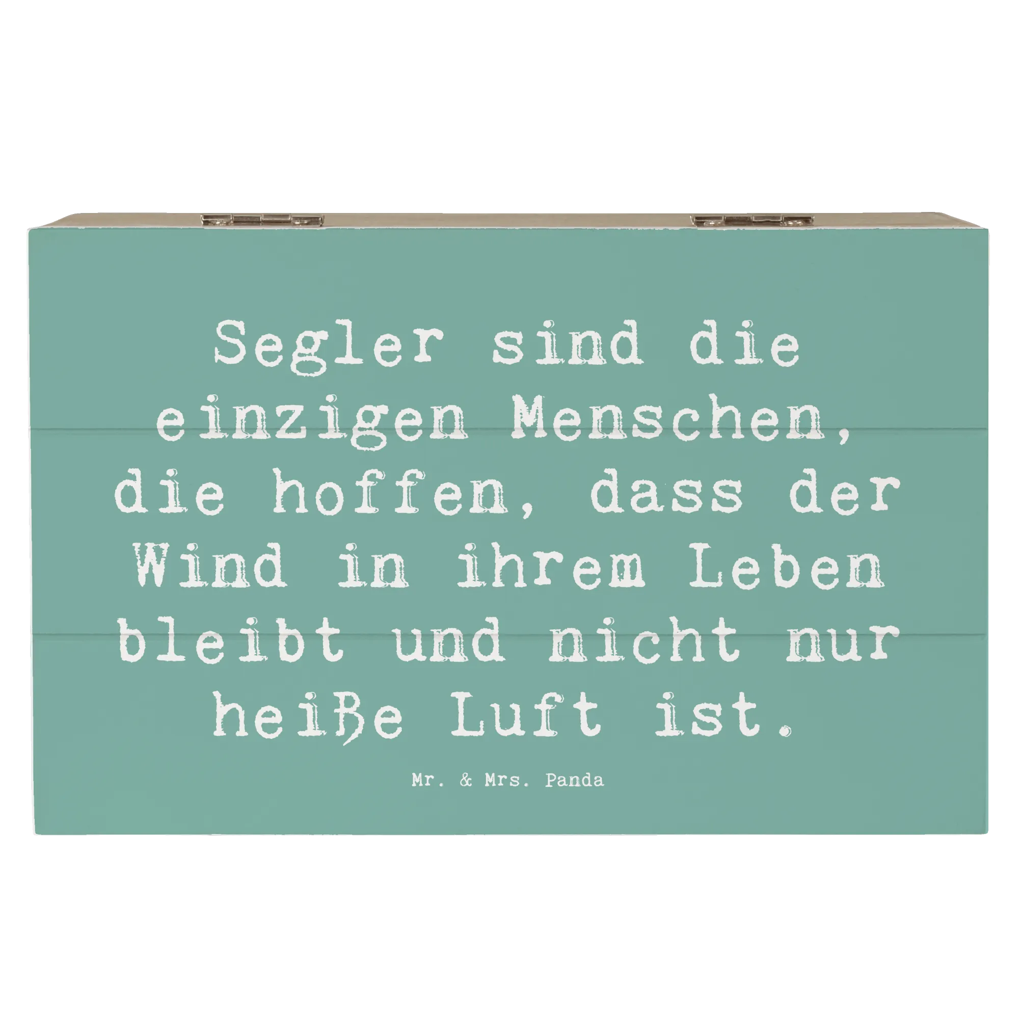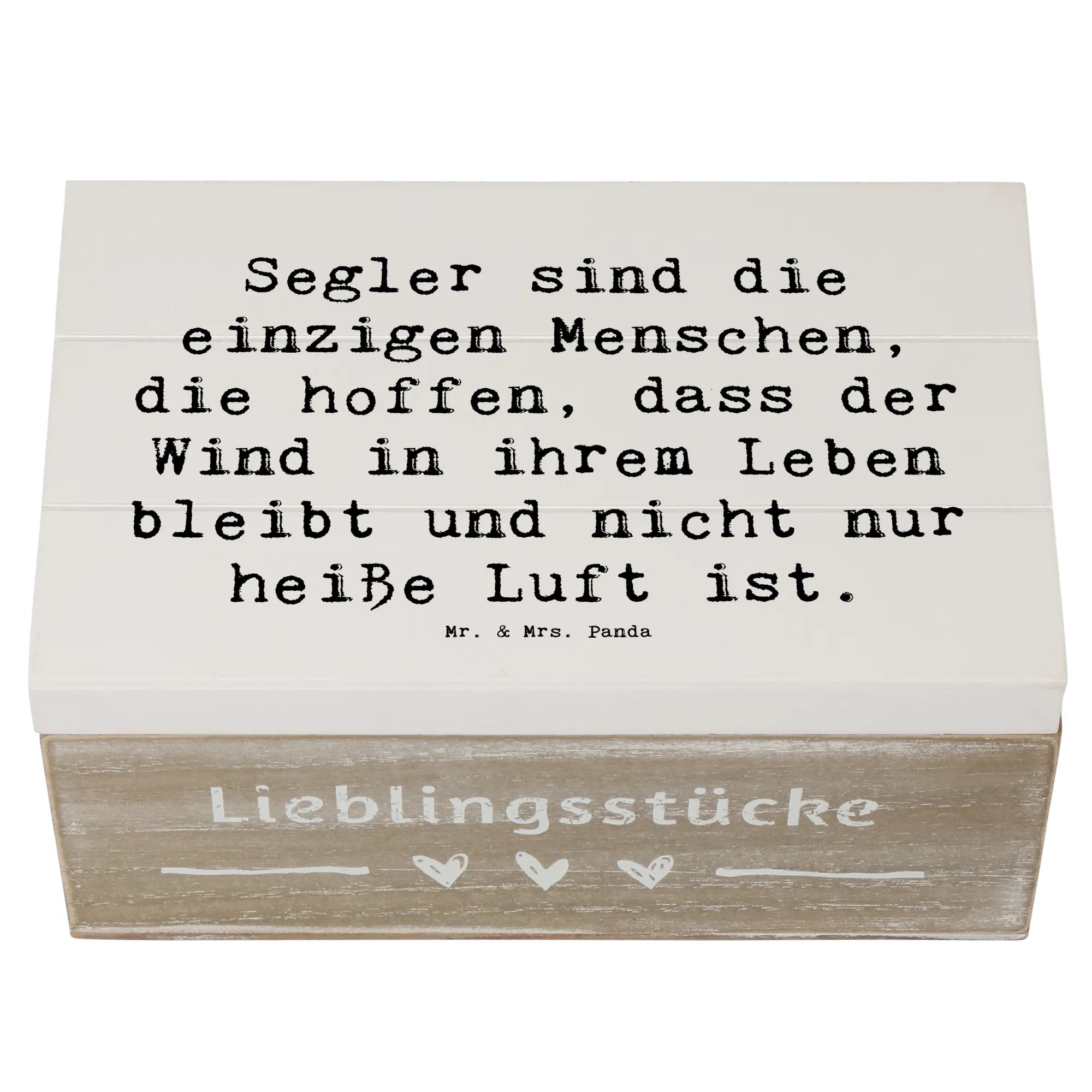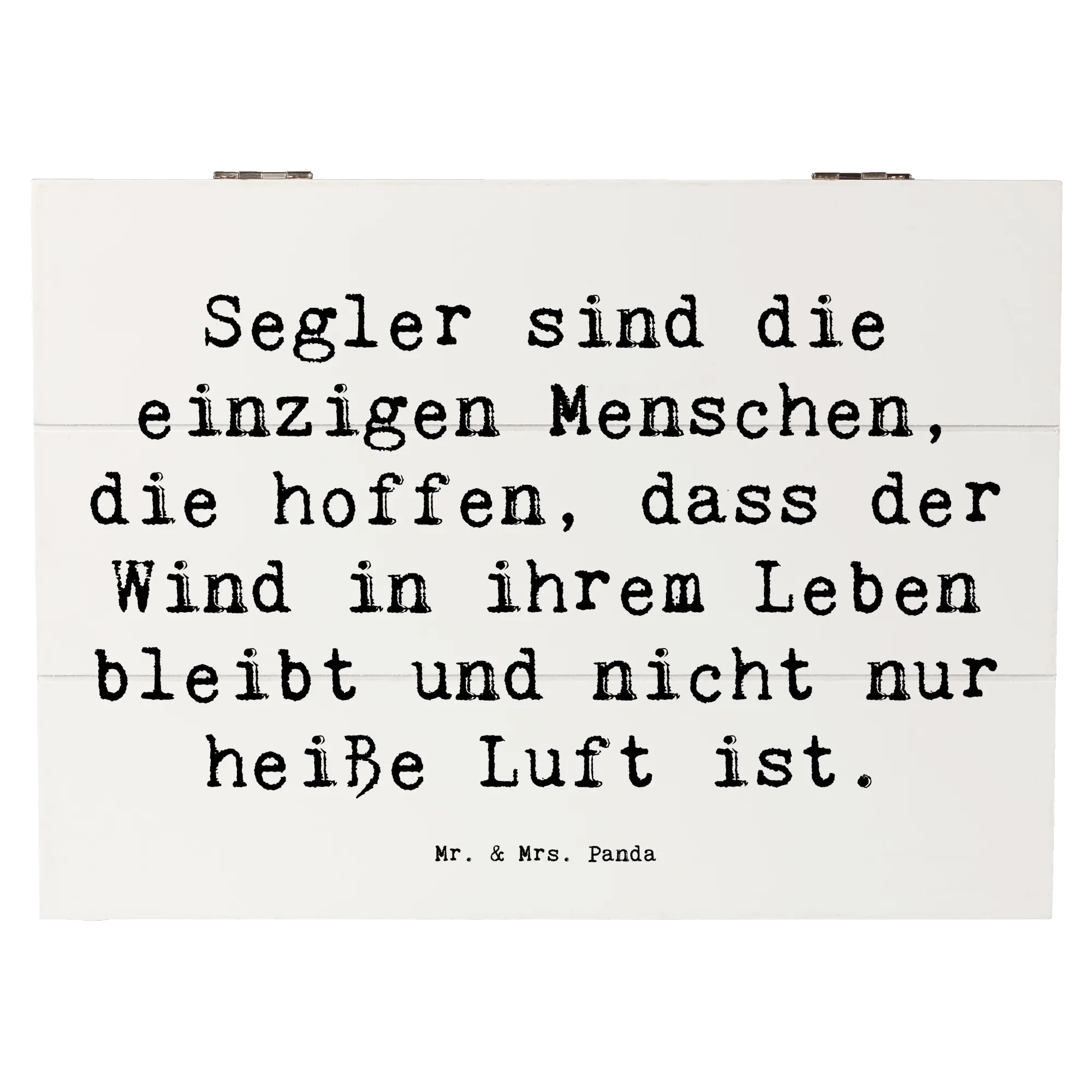 Eine wunderschöne Holzkiste von Mr. & Mrs. Panda, bedruckt mit dem liebevollen Segel-Motiv und dem spruchstarken Slogan „Segler sind die einzigen Menschen, die hoffen, dass der Wind in ihrem Leben bleibt und nicht nur heiße Luft ist.“ Diese Aufbewahrungsbox Holz ist das ideale Geschenk für alle, die das Meer, den Wind und das Freiheitsgefühl auf dem Wasser lieben.
