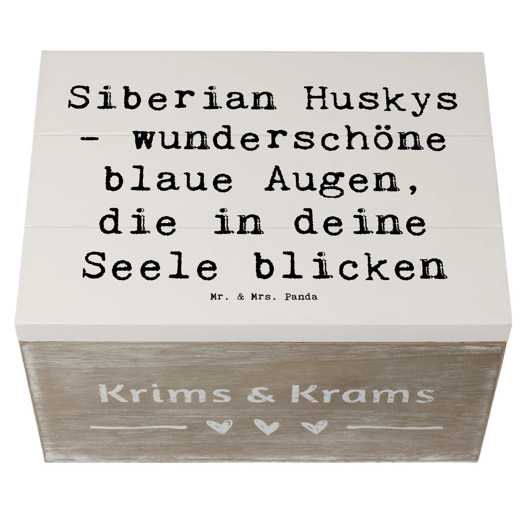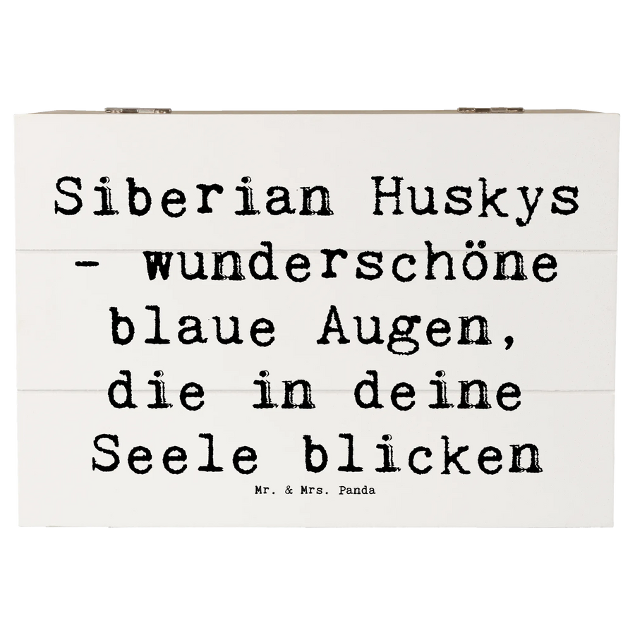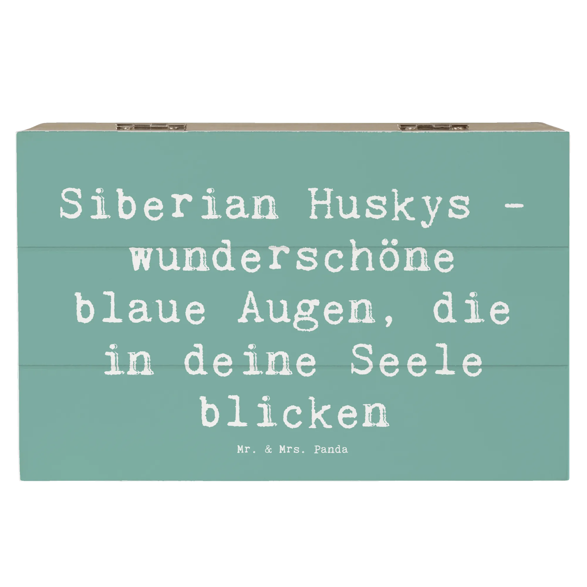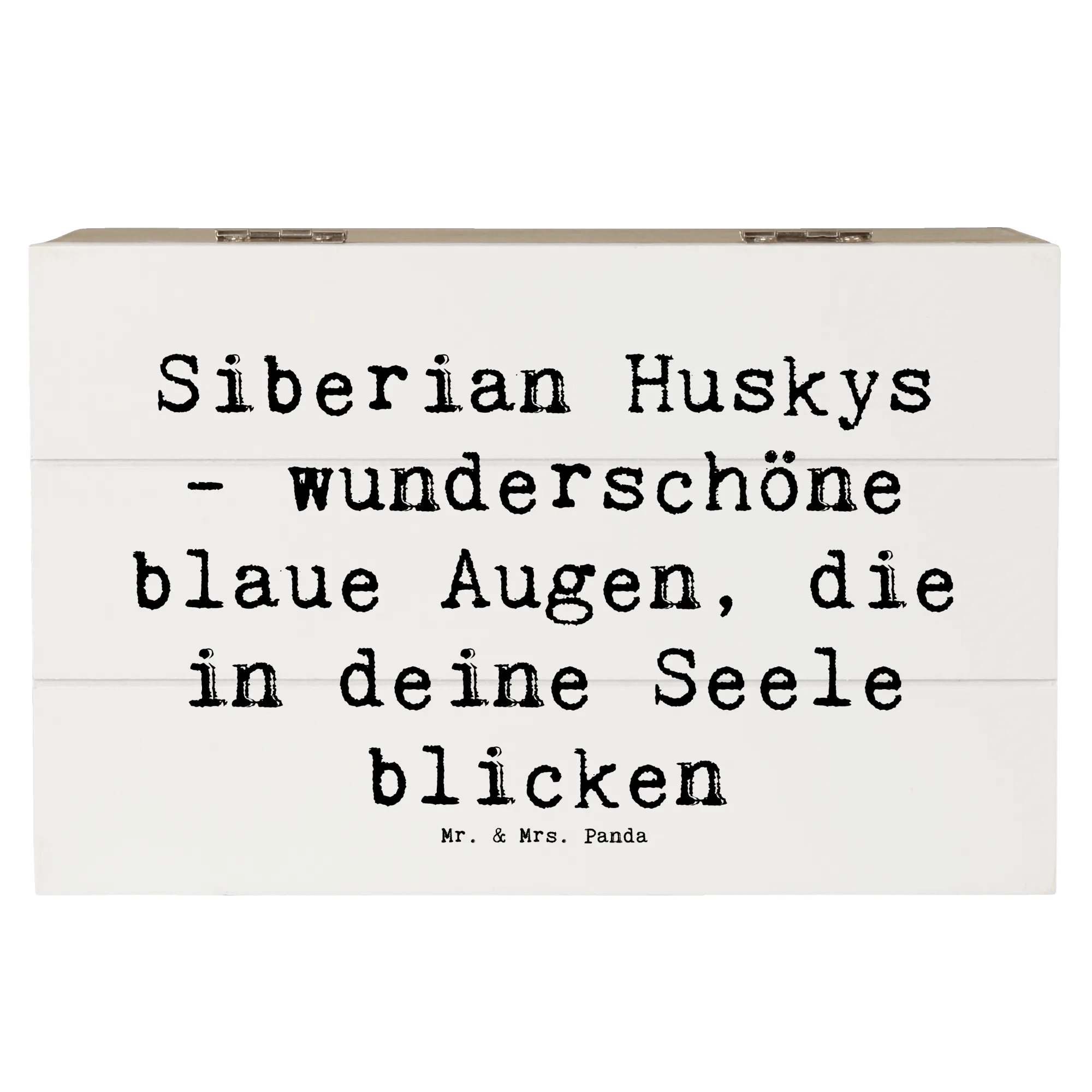 Ein ganz besonderer Charme liegt in dem süßen Spruch, der auf der Kiste steht: "Siberian Huskys - wunderschöne blaue Augen, die in deine Seele blicken". Das spricht das Herz eines jeden Hundeliebhabers an und macht die Kiste zu einem einzigartigen Geschenk für Geburtstage, Weihnachten oder einfach nur um jemandem eine Freude zu machen.