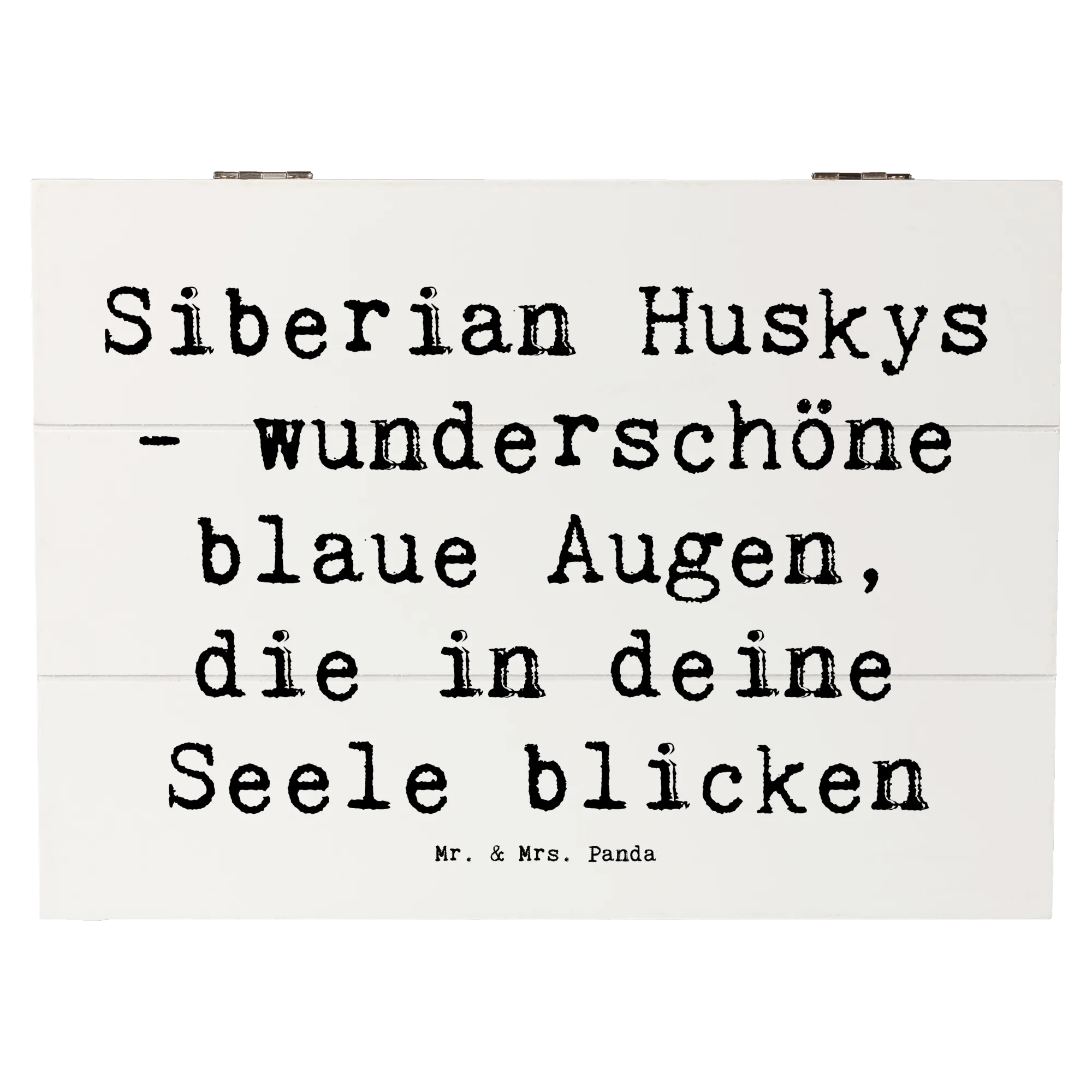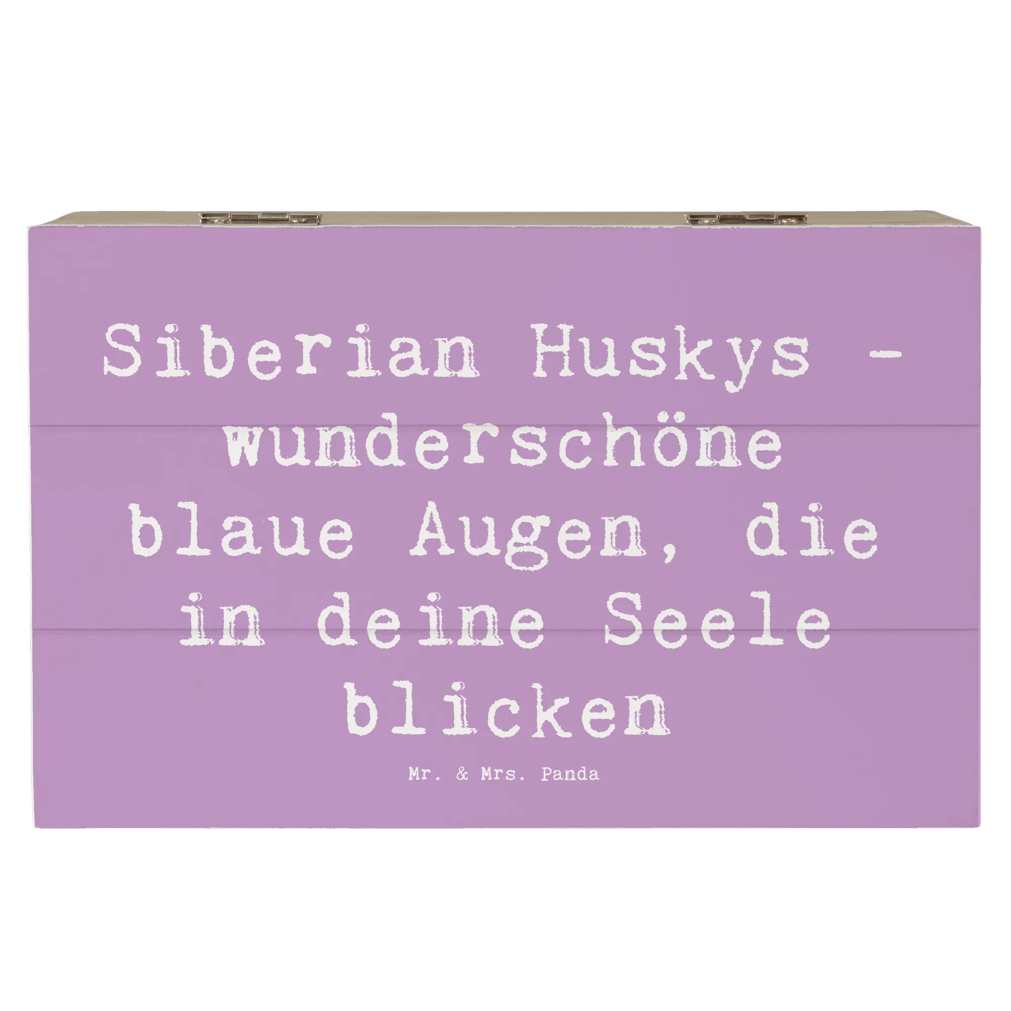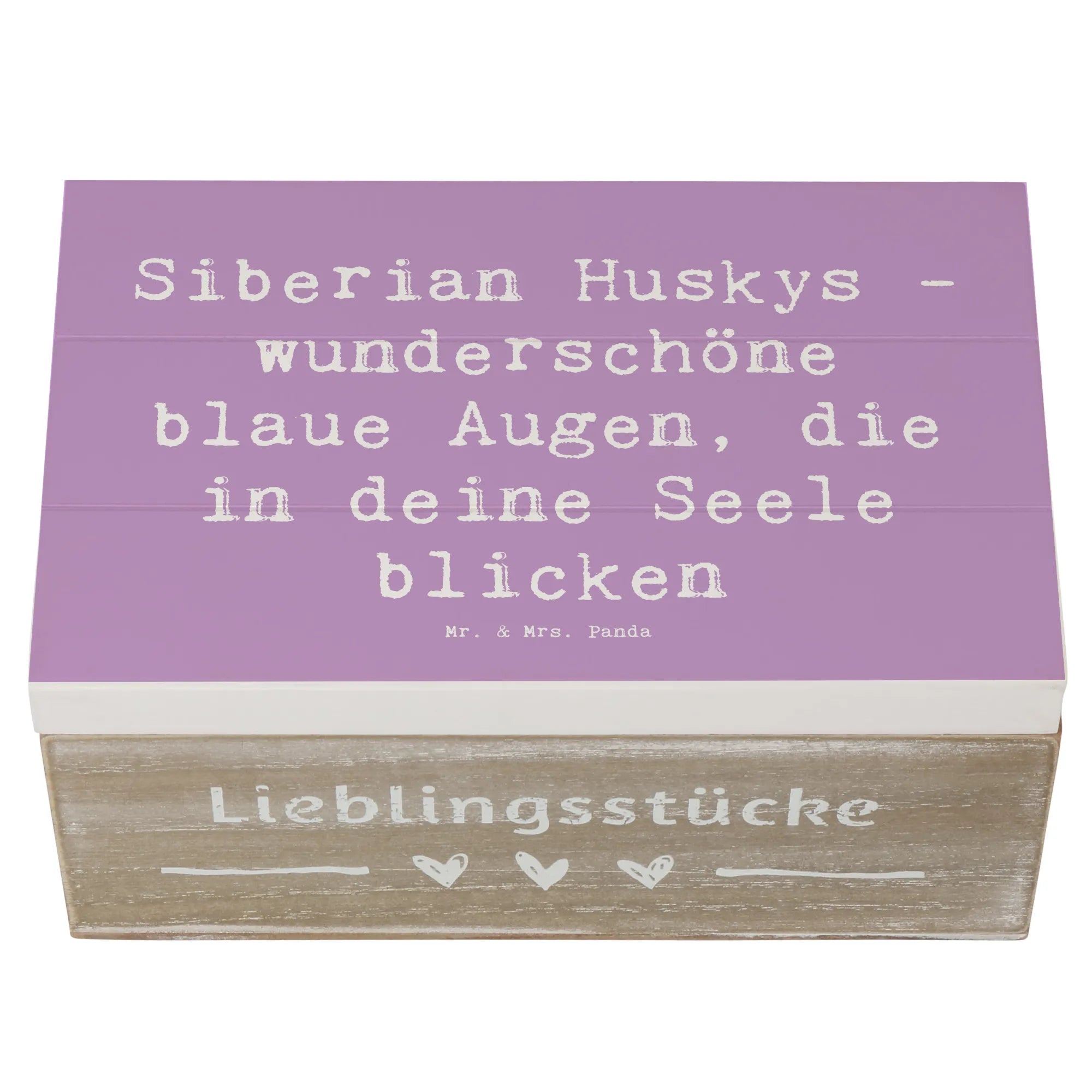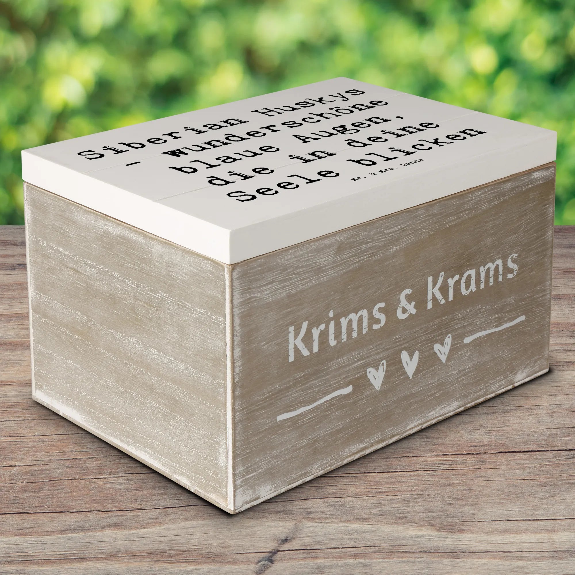 Ein ganz besonderer Charme liegt in dem süßen Spruch, der auf der Kiste steht: "Siberian Huskys - wunderschöne blaue Augen, die in deine Seele blicken". Das spricht das Herz eines jeden Hundeliebhabers an und macht die Kiste zu einem einzigartigen Geschenk für Geburtstage, Weihnachten oder einfach nur um jemandem eine Freude zu machen.