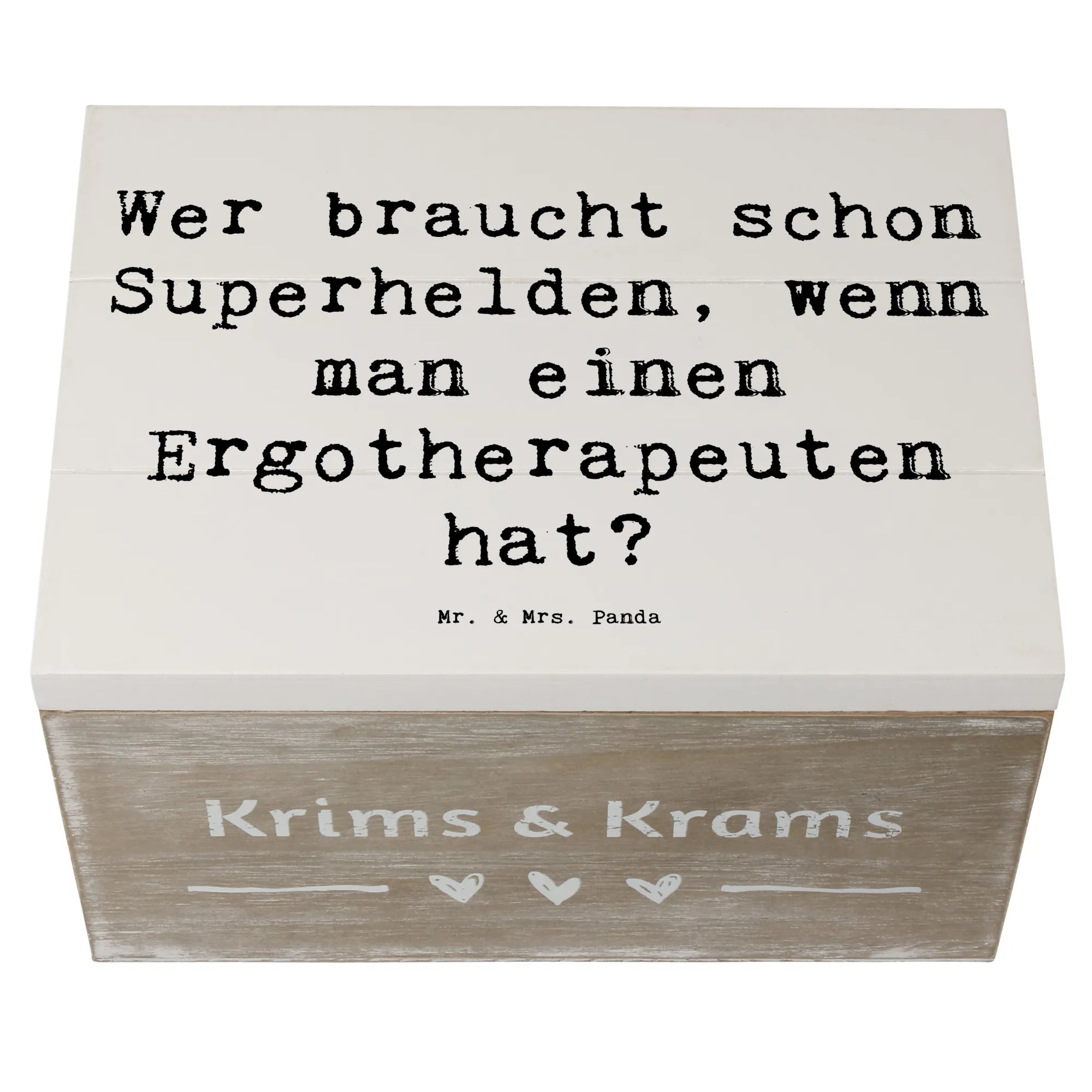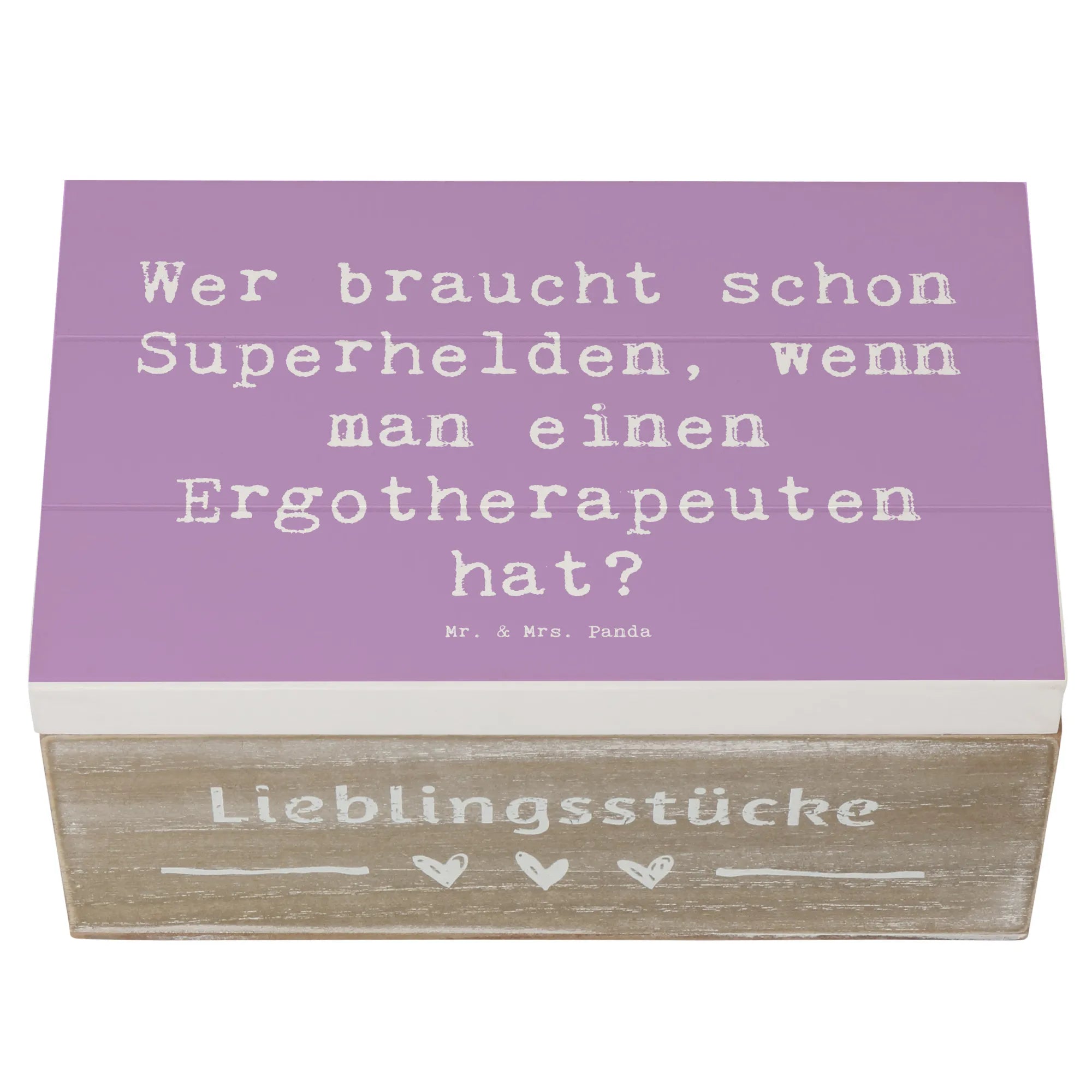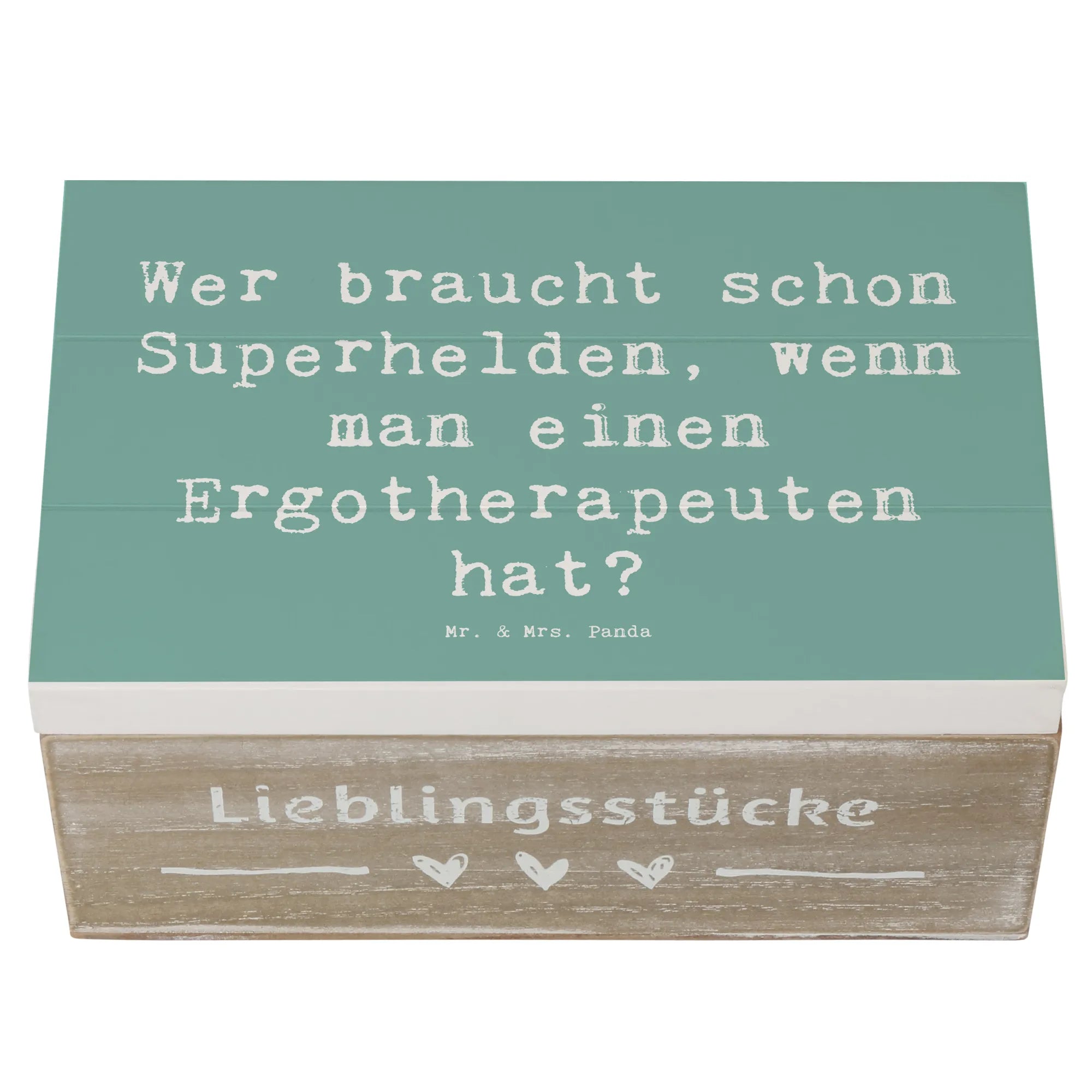 Die Holzkiste besteht aus hochwertiger, wasserabweisender Premium Hartfaser, die für ihre Langlebigkeit bekannt ist. Verliebe Dich in die Designs von Mr. & Mrs. Panda, die liebevoll von Hand gezeichnet wurden. Mit dem Spruch 'Wer braucht schon Superhelden, wenn man einen Ergotherapeuten hat?' zaubert diese Kiste ein Lächeln auf die Gesichter Deiner Lieben.