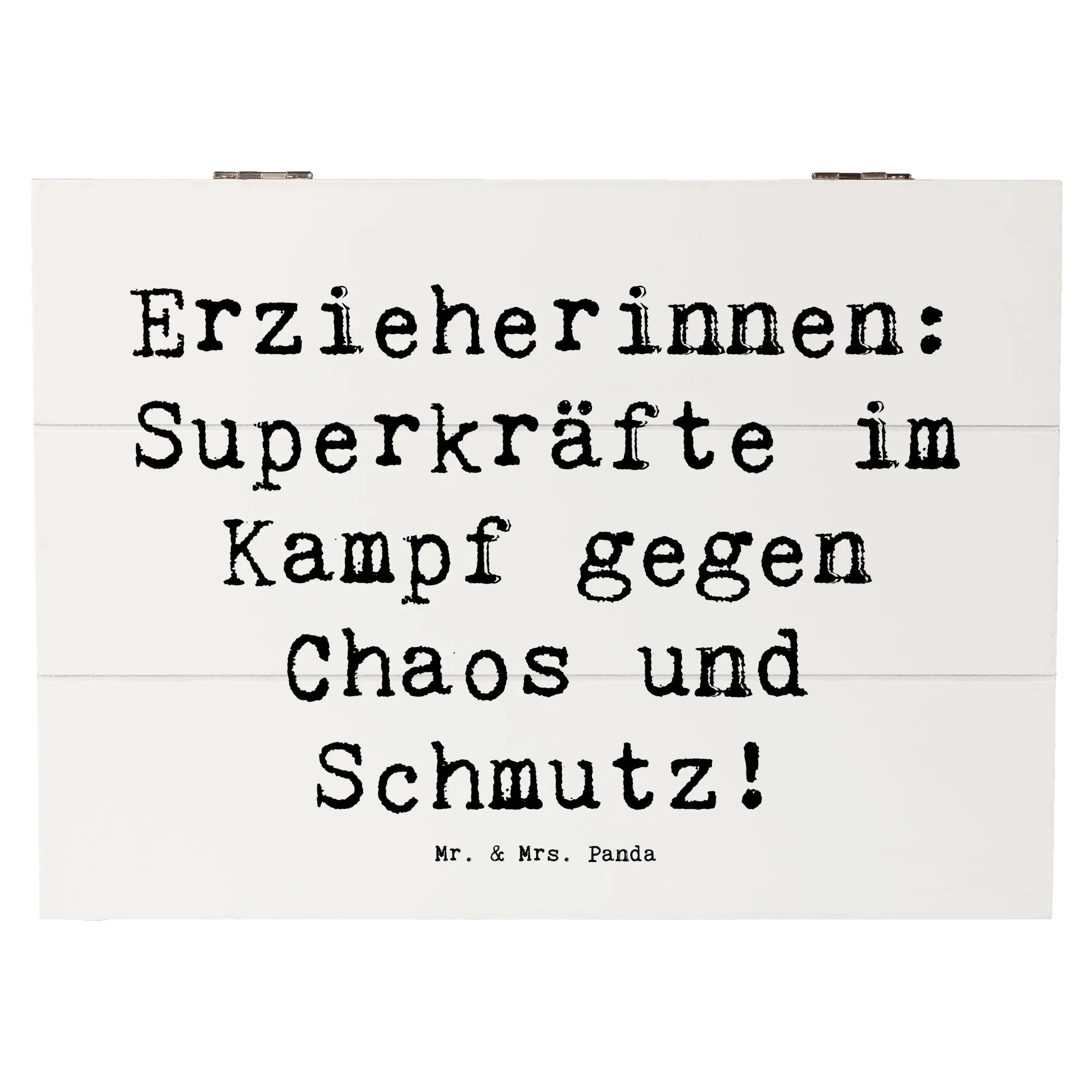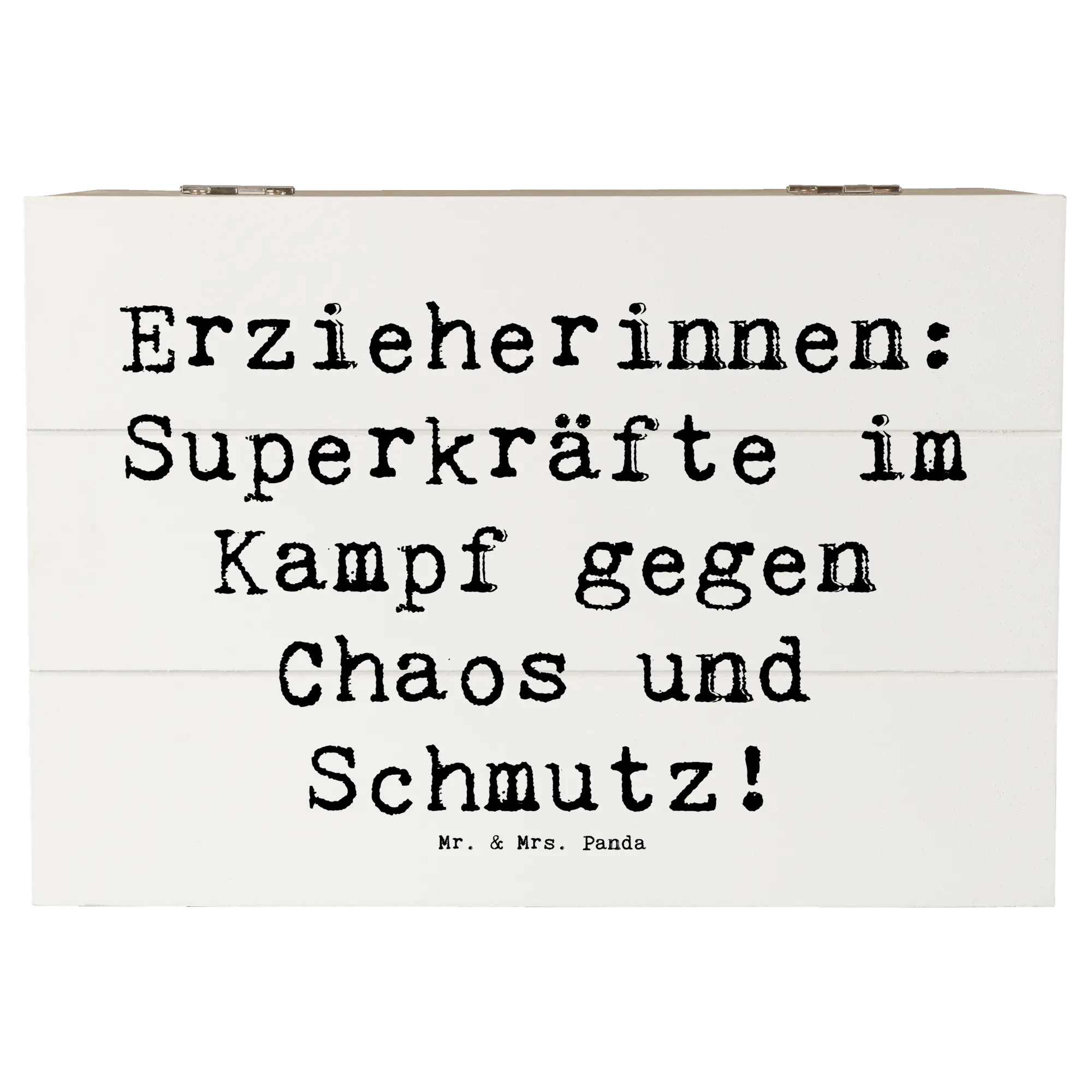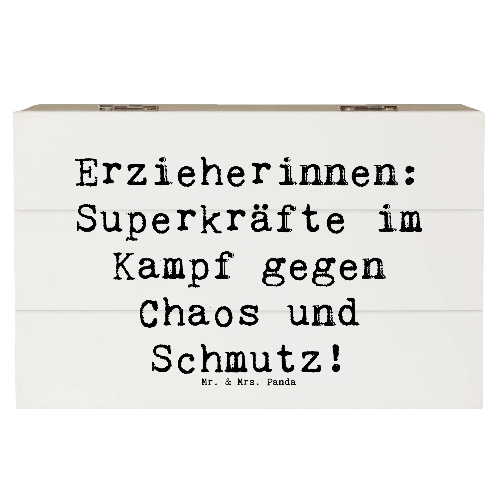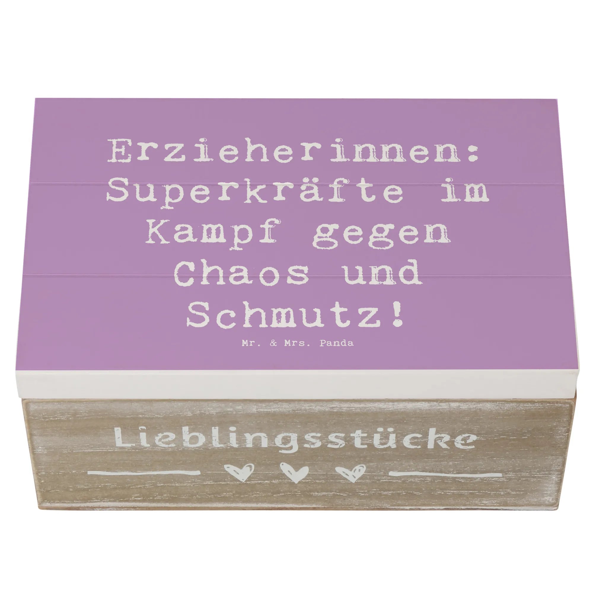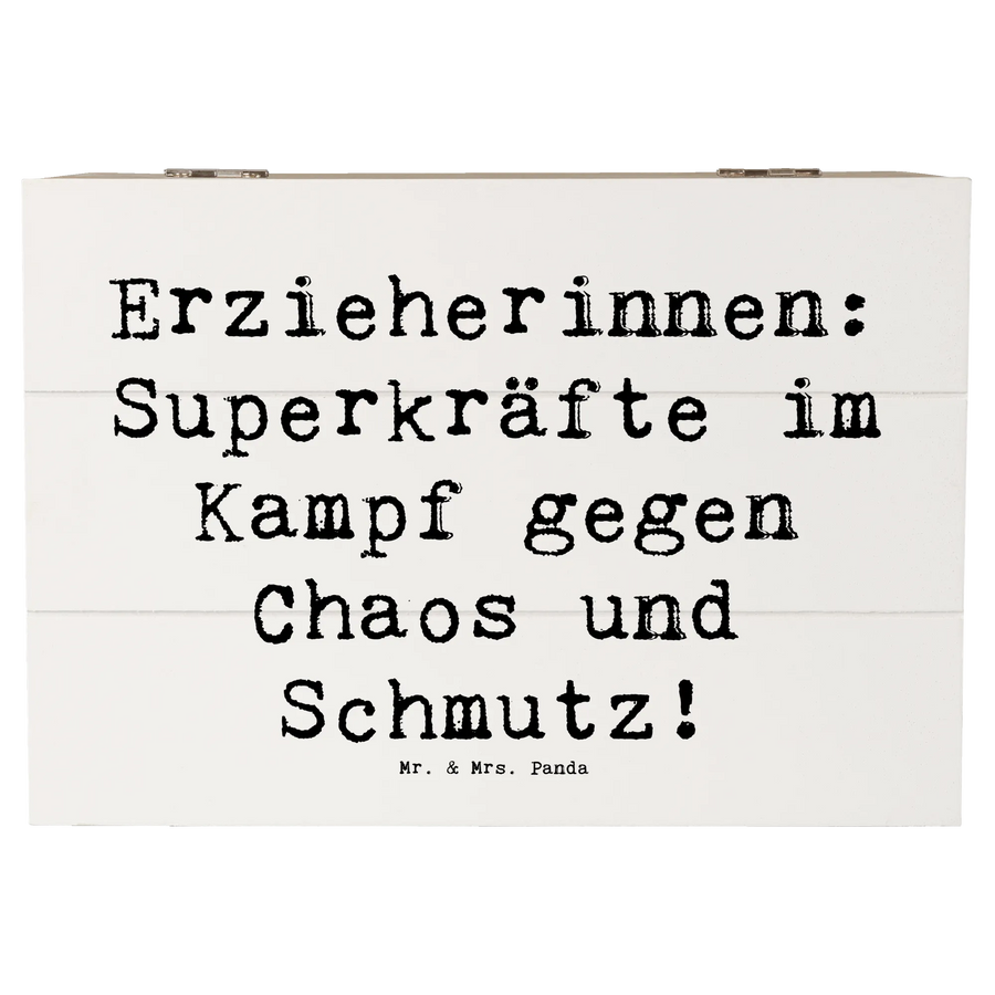 Die Holzkiste von Mr. & Mrs. Panda mit dem liebevollen Motiv 'Erzieherin: Superkräfte im Kampf gegen Chaos und Schmutz!' ist das perfekte Geschenk für alle Erzieherinnen.