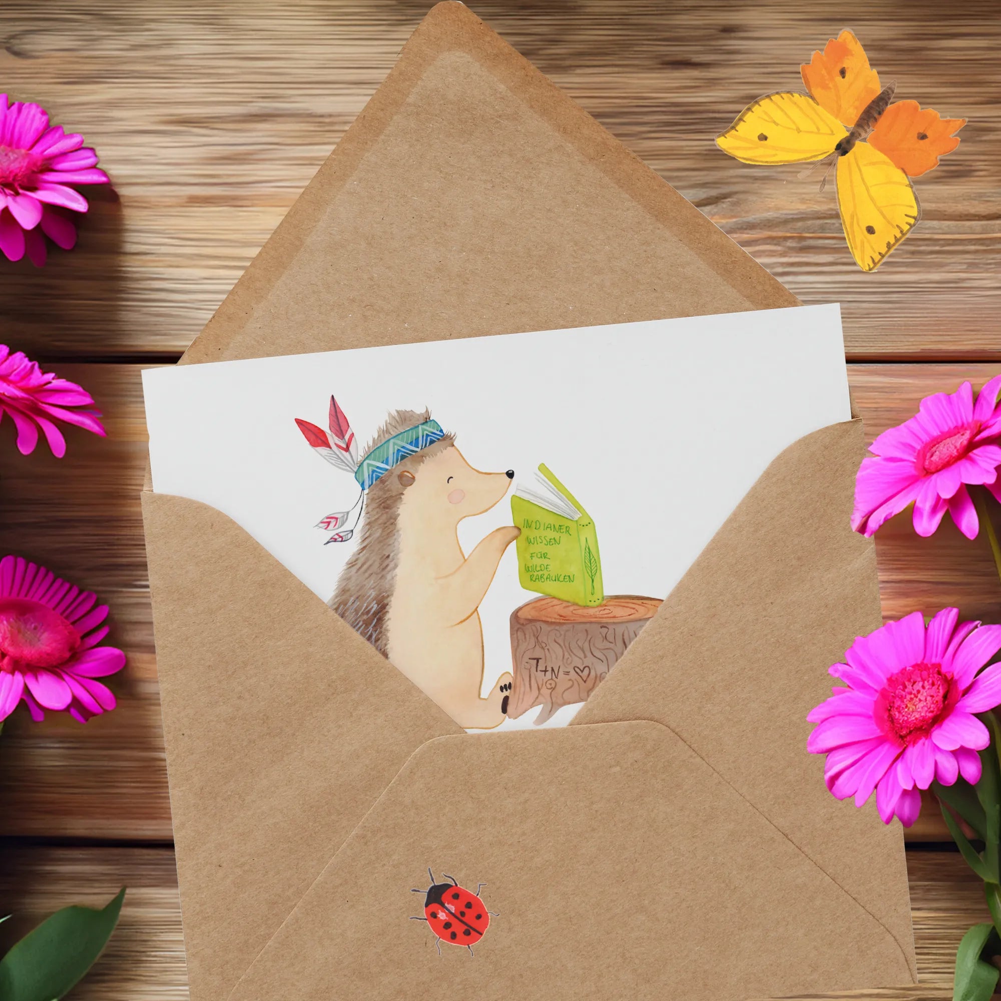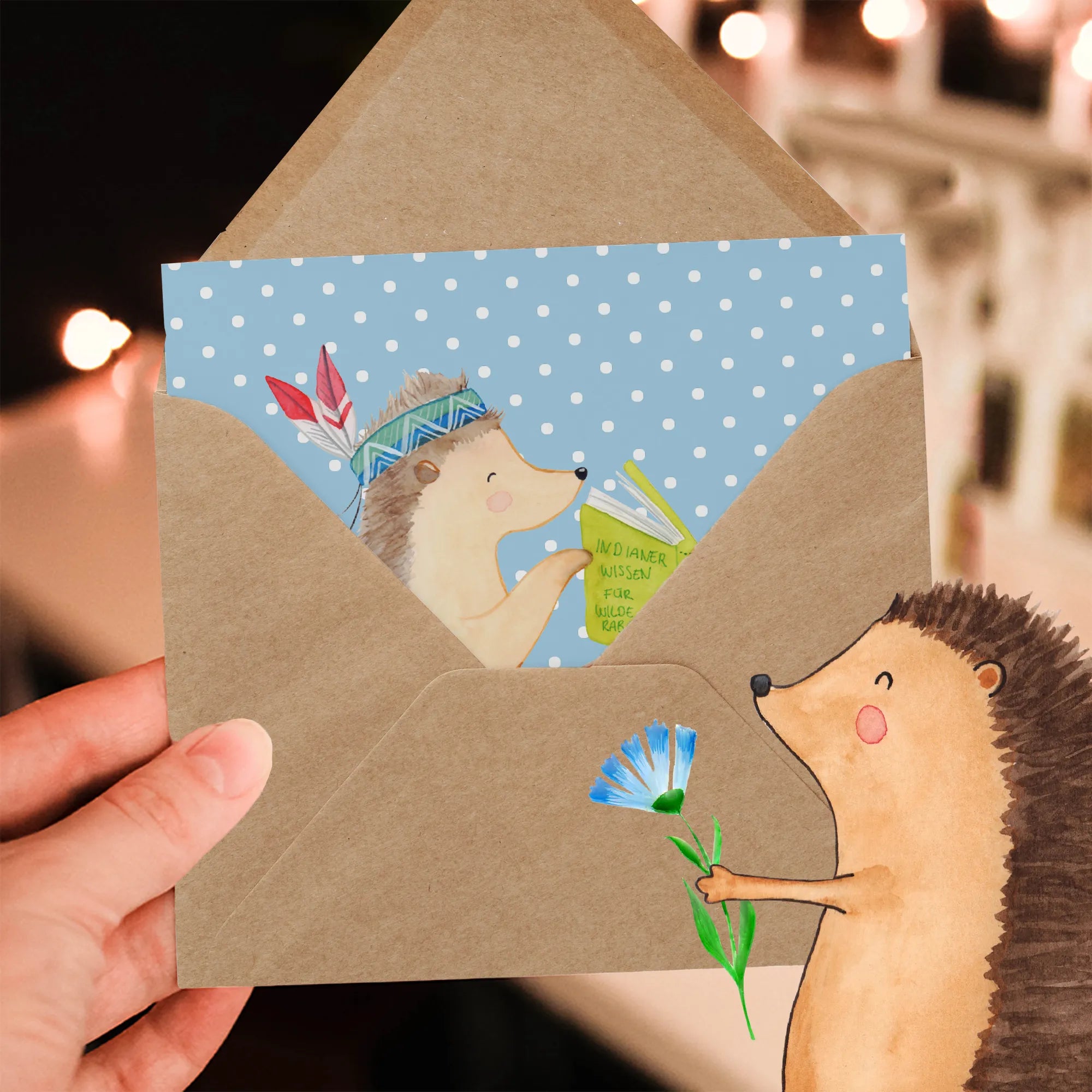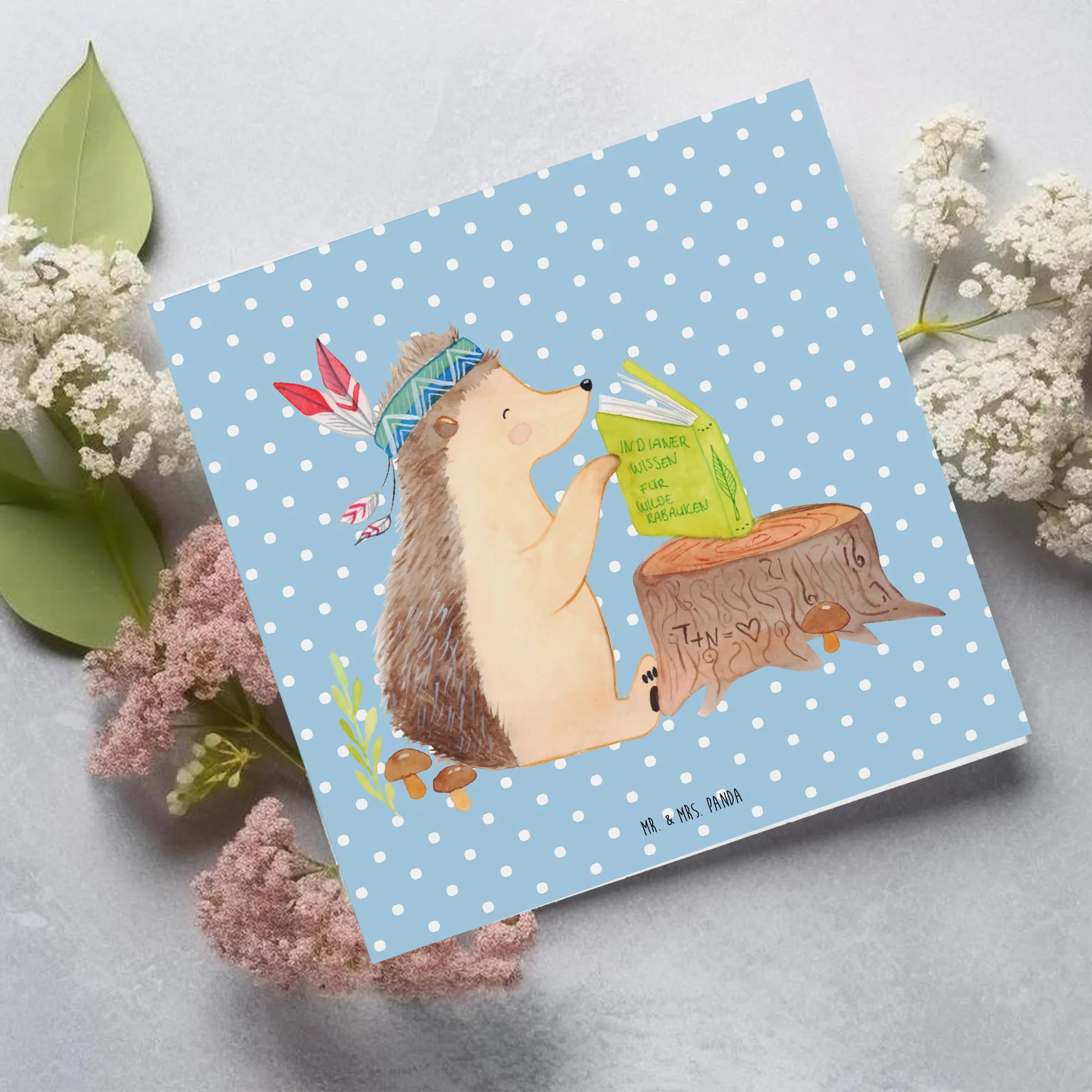 Karta Deluxe jeż Ozdoba z piór - z napisem - Pastelowy niebieski