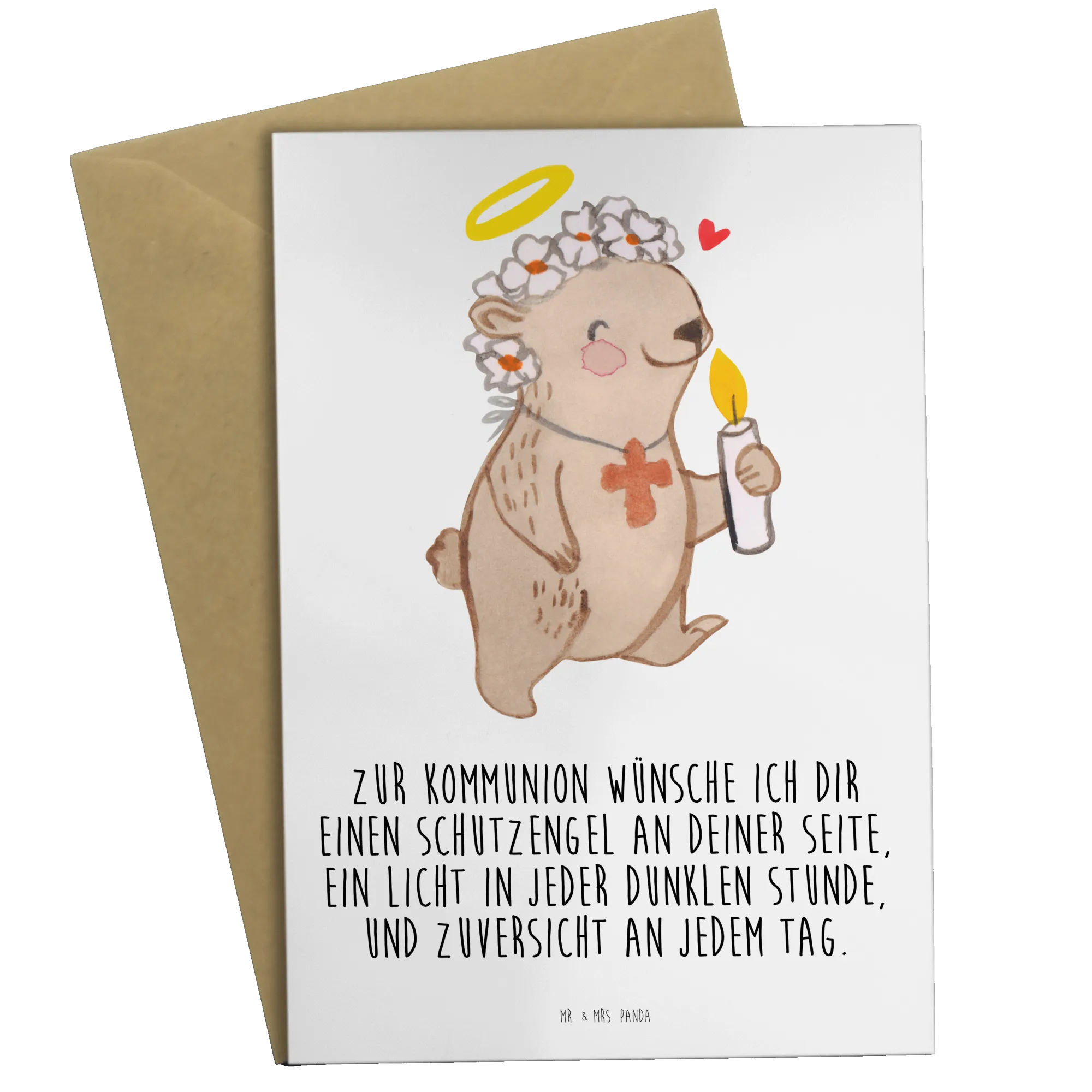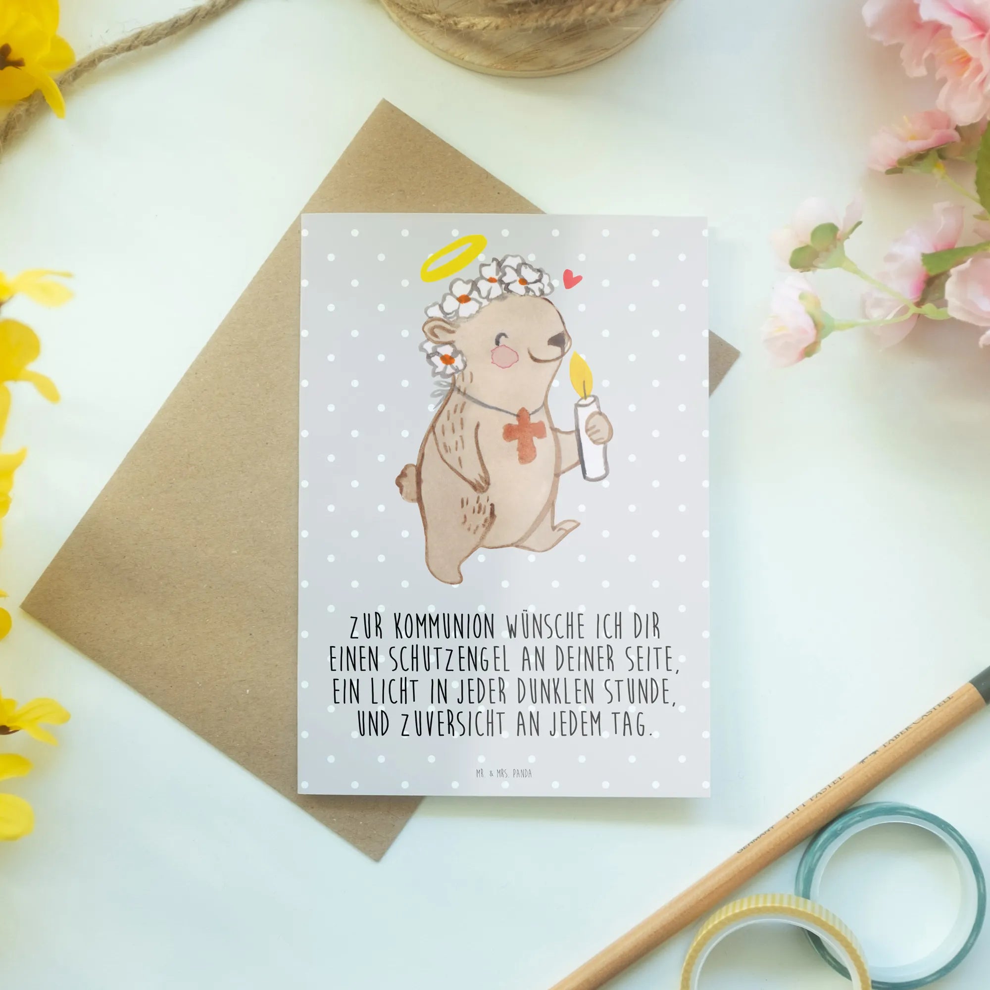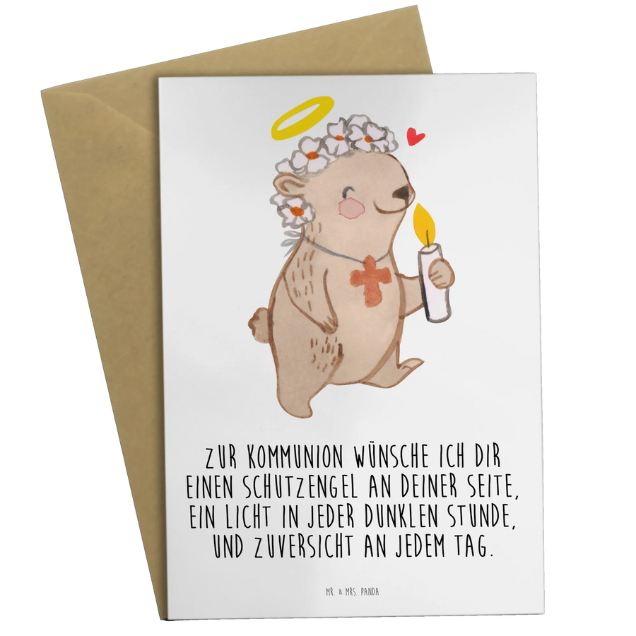 Die Grußkarte "Bär Kommunion Mädchen" von Mr. & Mrs. Panda ist das perfekte Geschenk für die Kommunion! 🎉 Sie begeistert durch ihr liebevolles Design und den herzlichen Spruch. Der süße Bär mit den Blumen auf dem Kopf und der Kerze in der Hand vermittelt ein Gefühl von Schutz und Geborgenheit, was an einem so besonderen Tag wie der Kommunion von großer Bedeutung ist.