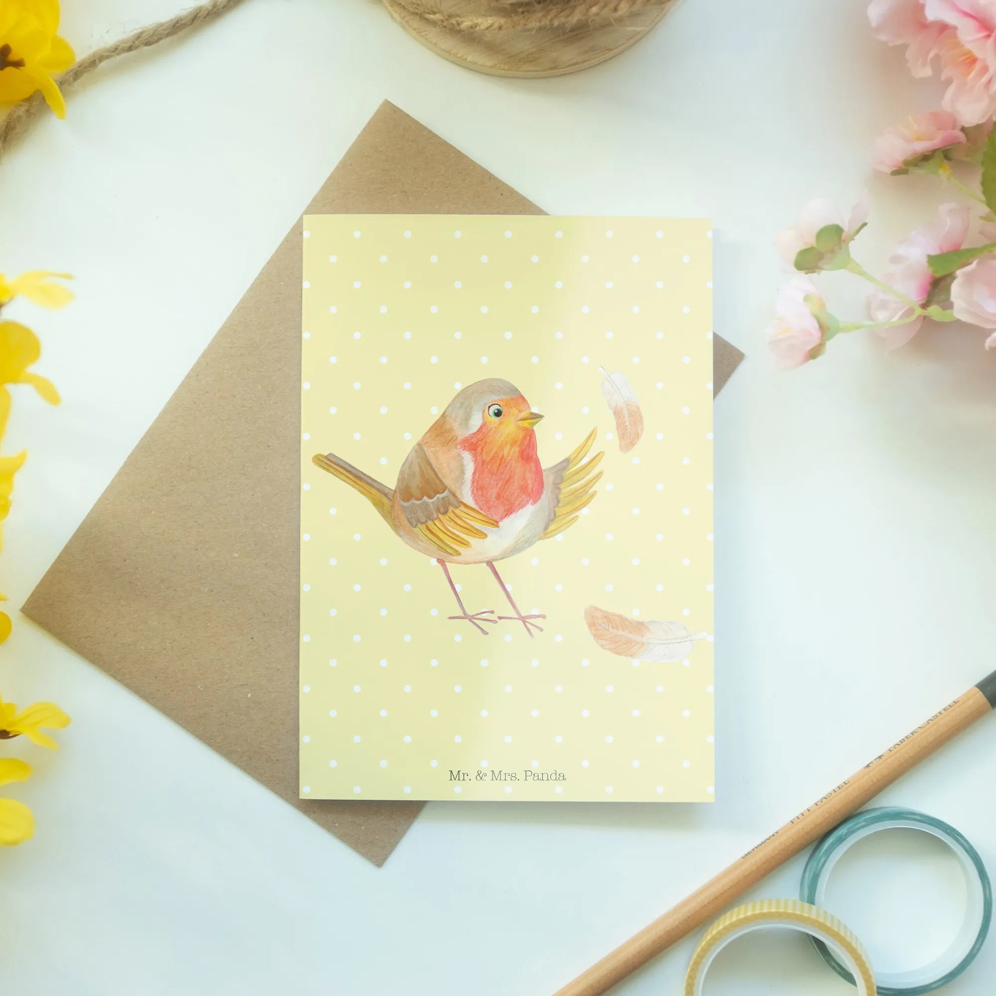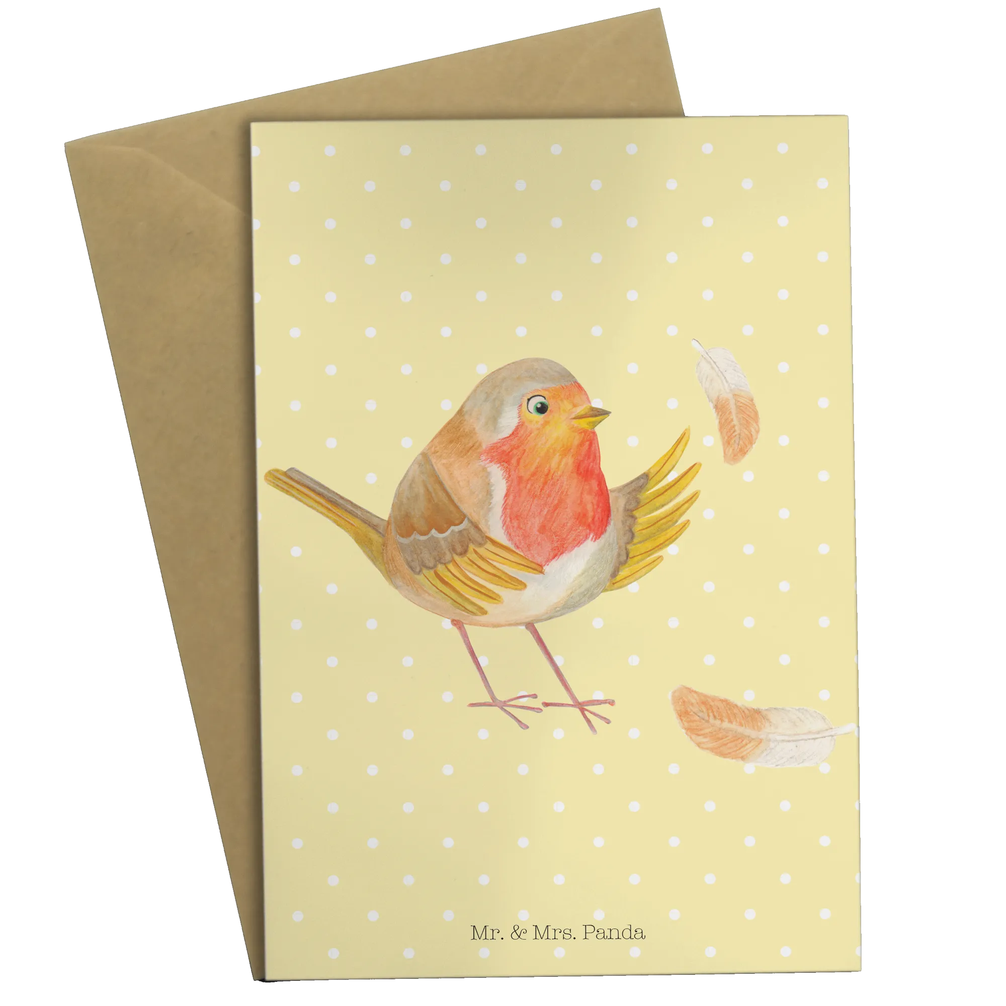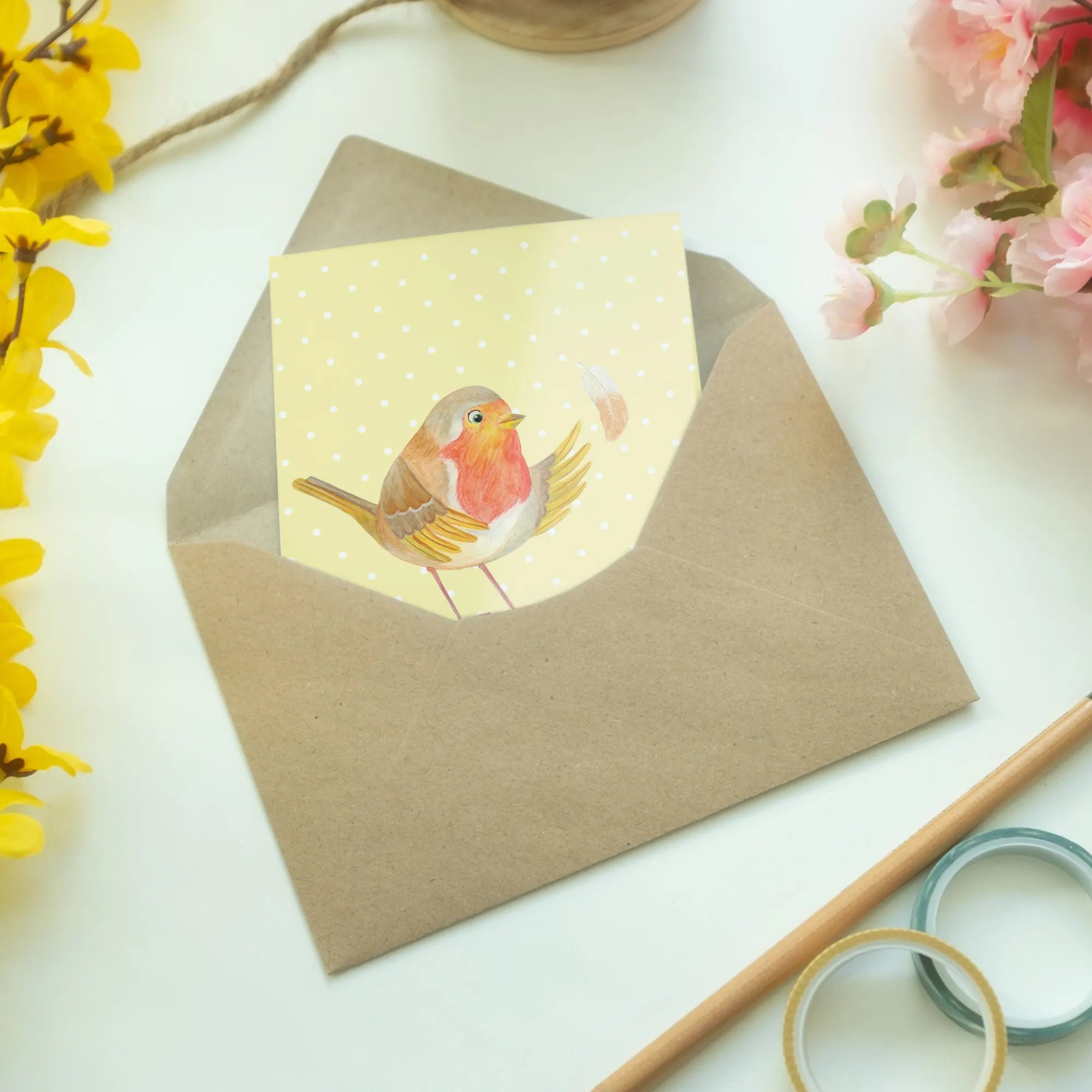 Kartka okolicznościowa rudzik Pióra - z napisem - Pastelowy żółty