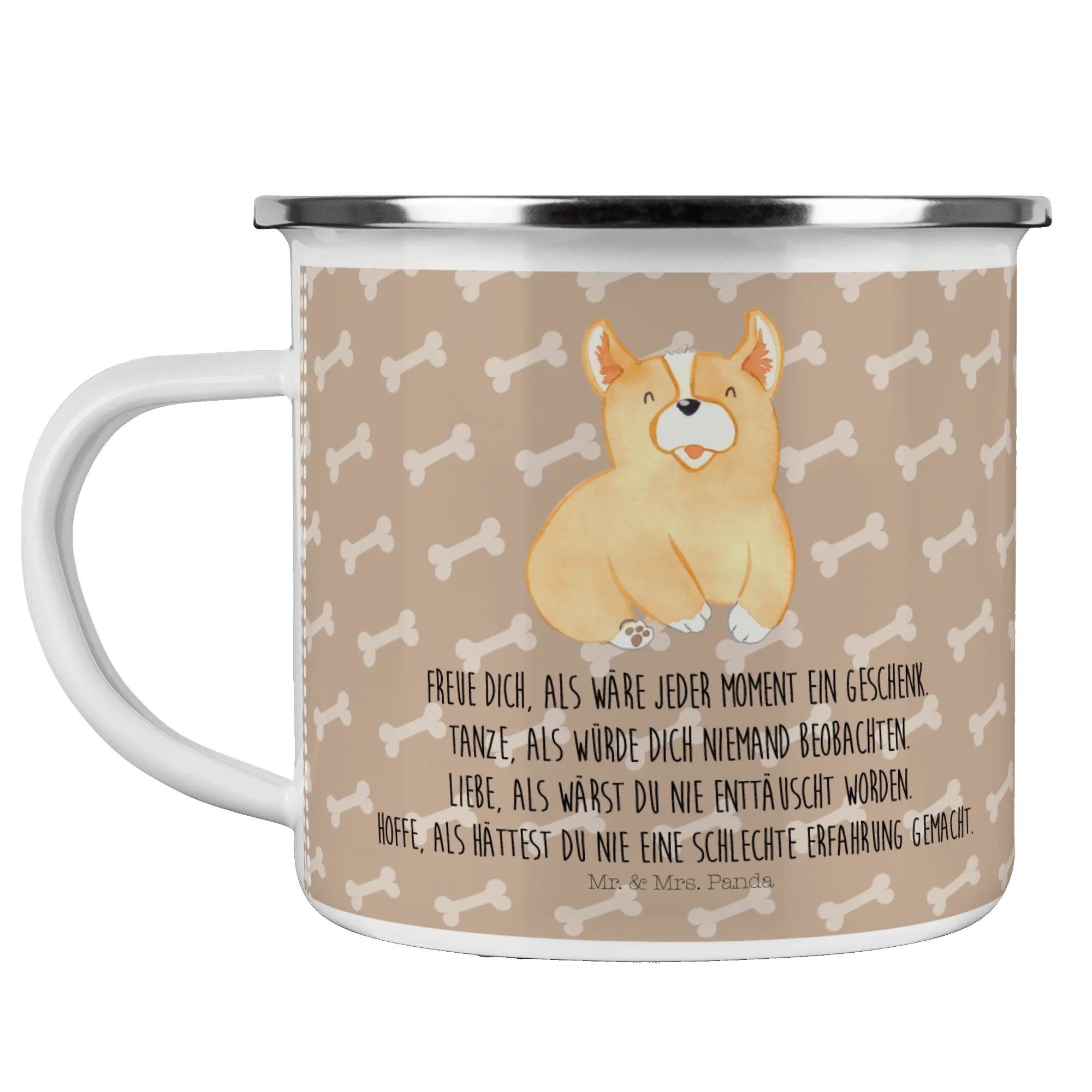 Kempingowy kubek emaliowany Corgi - z napisem - biały